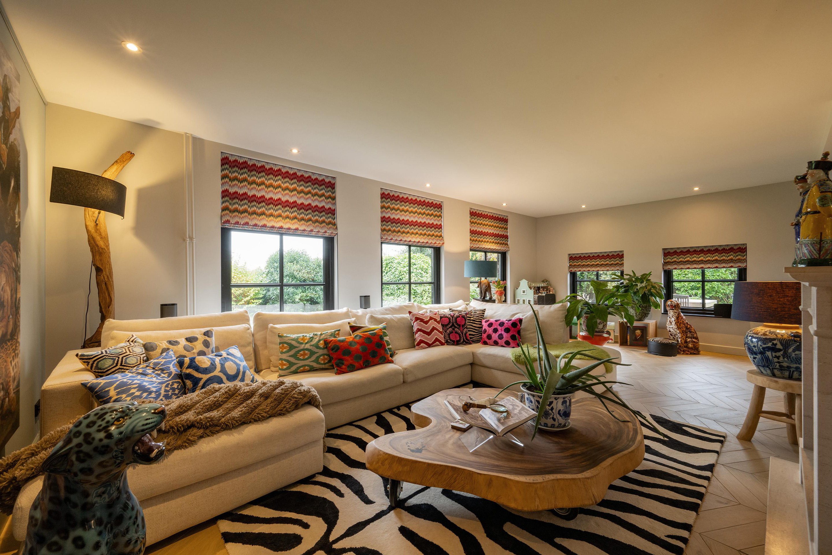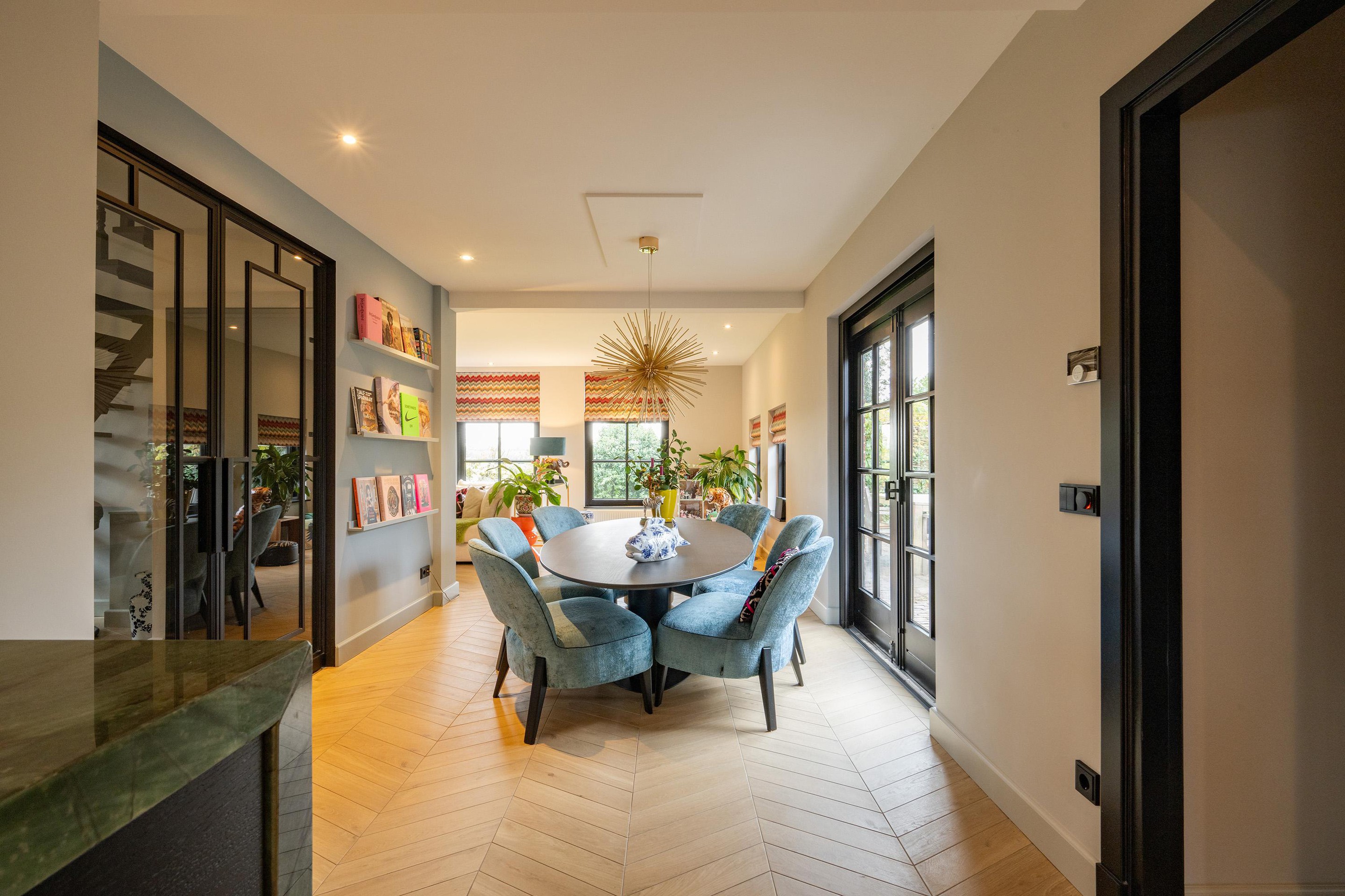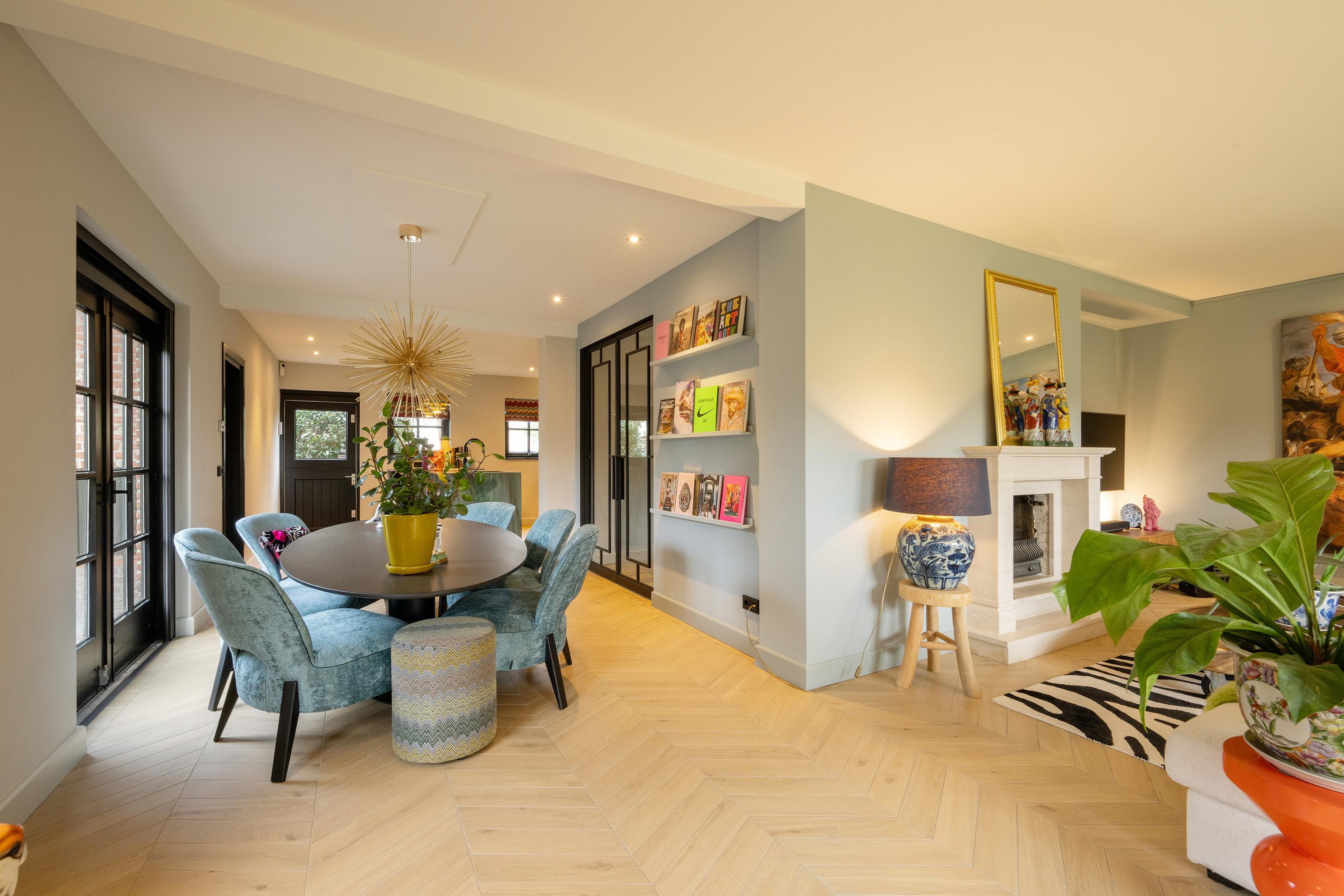 De woonkamer is royaal, licht en sfeervol met veel glas en dubbele deuren. De zithoek is intiem met de gashaard en het zicht op de tuin en de achtergelegen landerijen (waar je soms zelfs herten kunt zien lopen). Aan de westkant vind je de eethoek met openslaande deuren naar het terras met de oude klinkertjes.