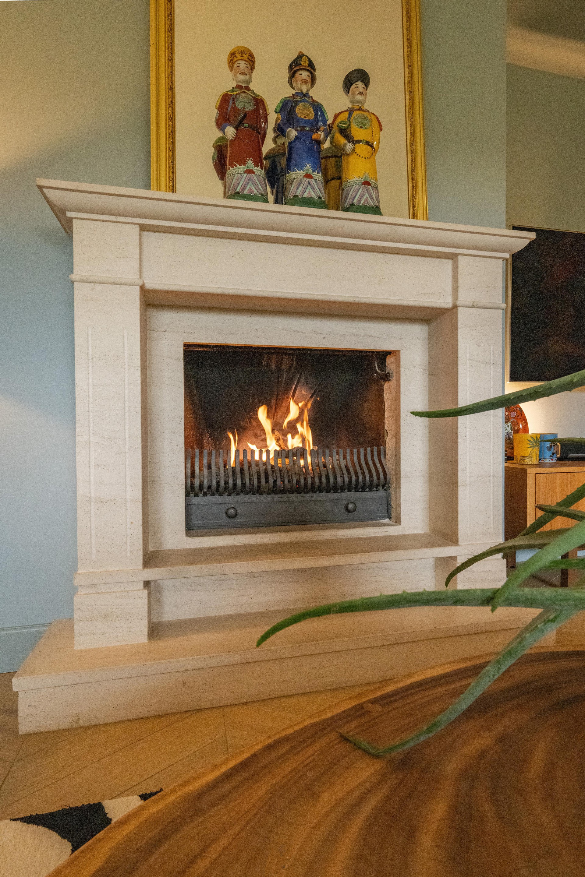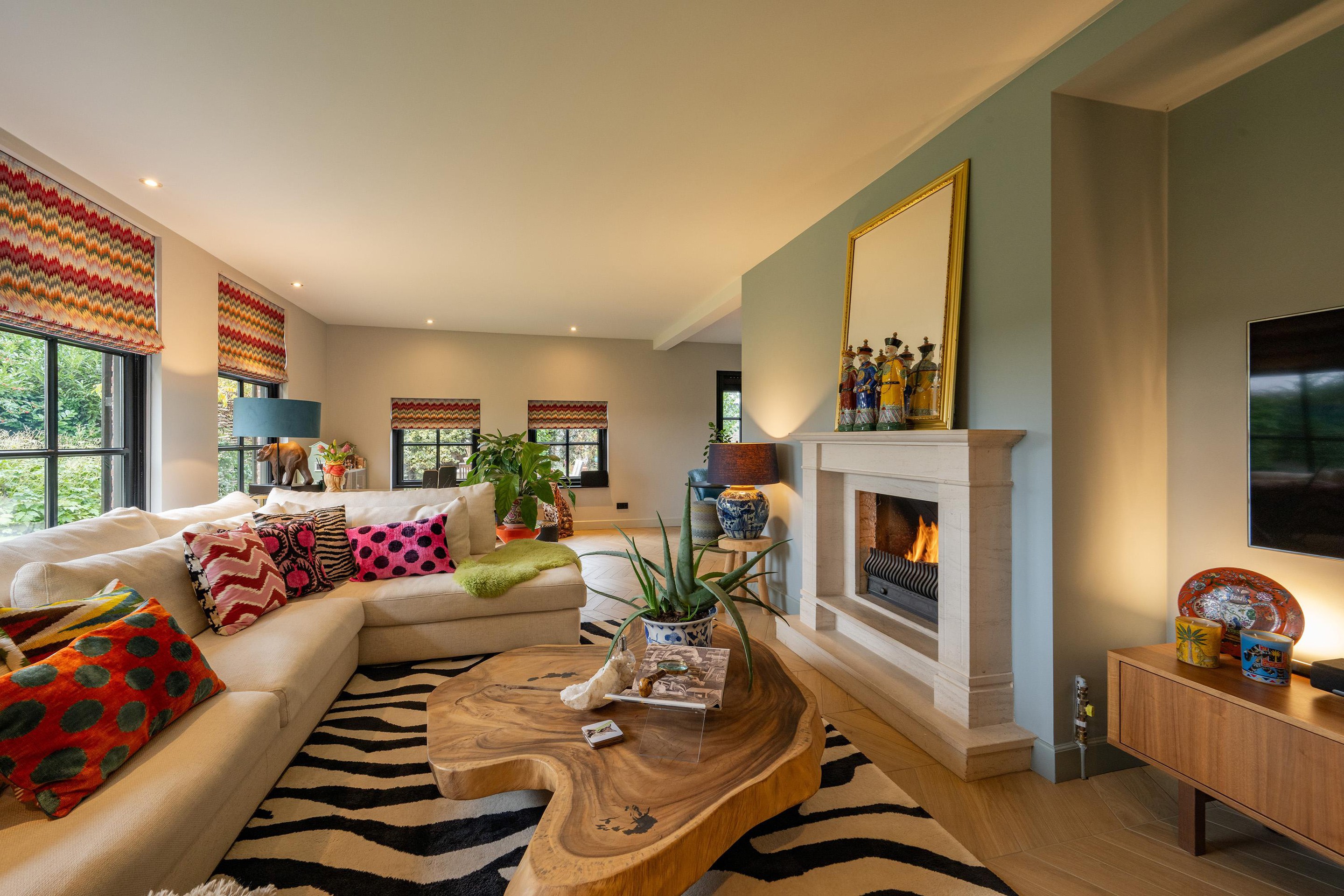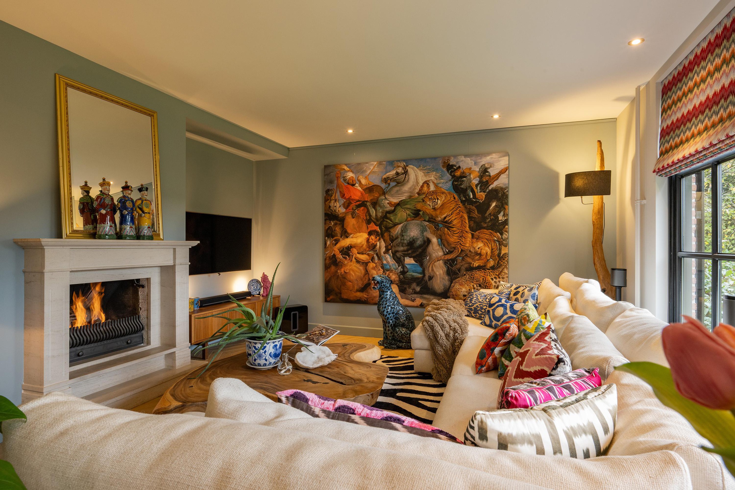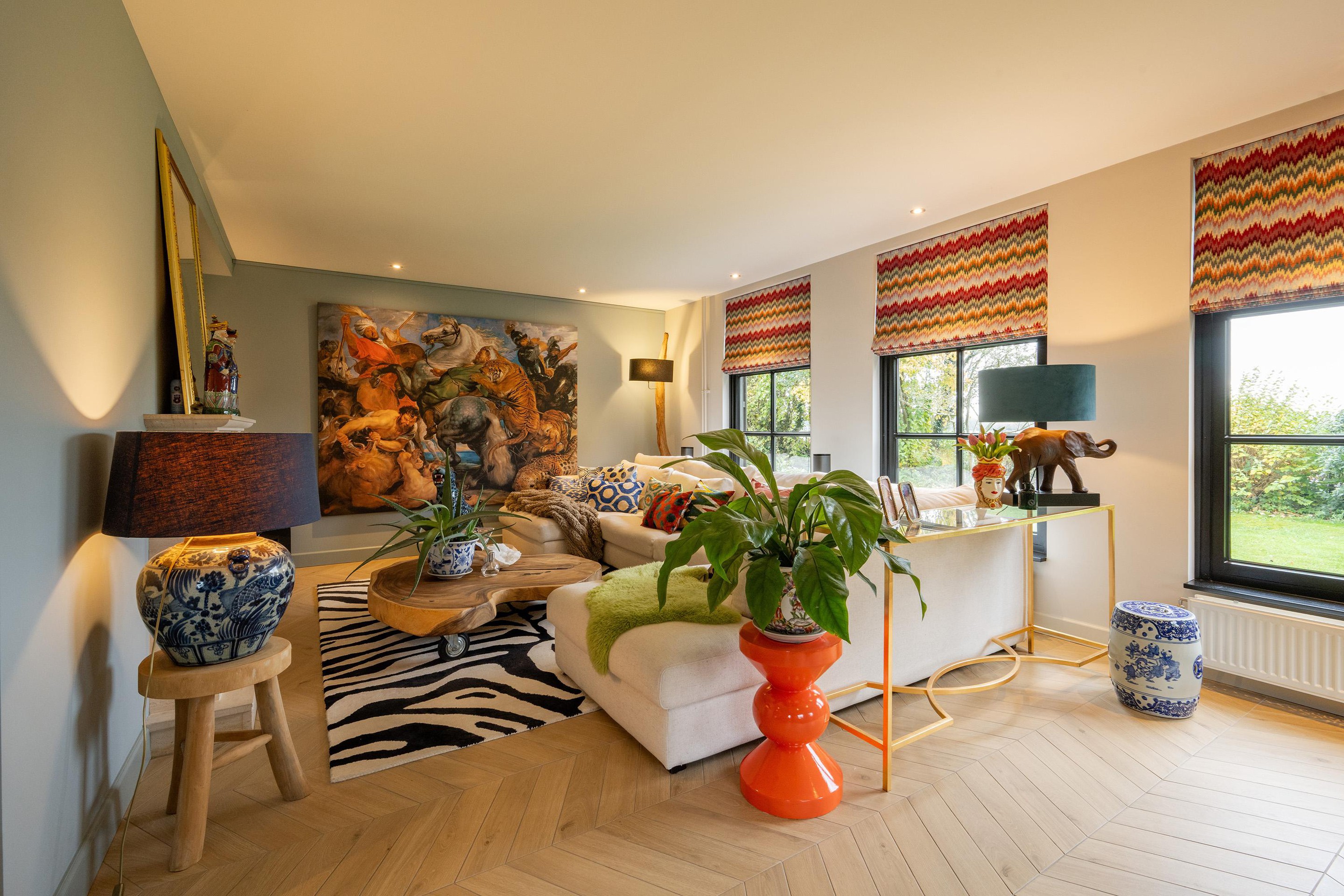 De woonkamer is royaal, licht en sfeervol met veel glas en dubbele deuren. De zithoek is intiem met de gashaard en het zicht op de tuin en de achtergelegen landerijen (waar je soms zelfs herten kunt zien lopen). Aan de westkant vind je de eethoek met openslaande deuren naar het terras met de oude klinkertjes.