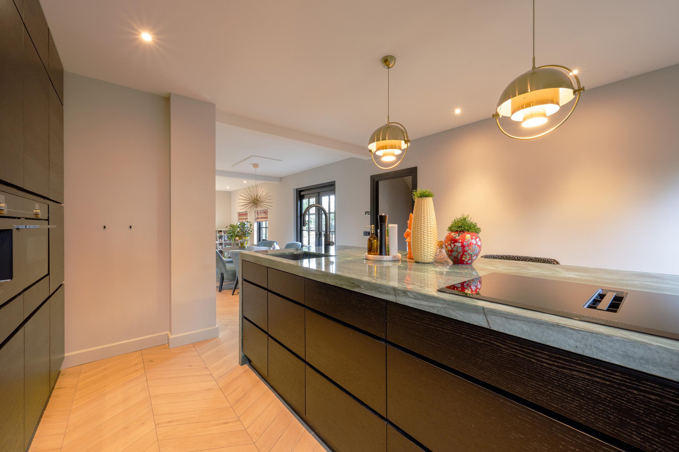 De keuken (2022) is luxe, modern en heeft een groot kook- spoeleiland, uitgevoerd in kwartsiet. We treffen er hoogwaardige inbouwapparatuur aan, zoals koelkast, vriezer, inductiekookplaat met geïntegreerde afzuiging, Quooker met gekoeld en bruisend water functie, oven, stoomoven en een koffiemachine. Vanuit de keuken bereik je de handige kelder - perfect voor opslag van mooie wijnen, voorraad of keukenbenodigdheden. Ook treffen we hier de witgoedaansluitingen aan.