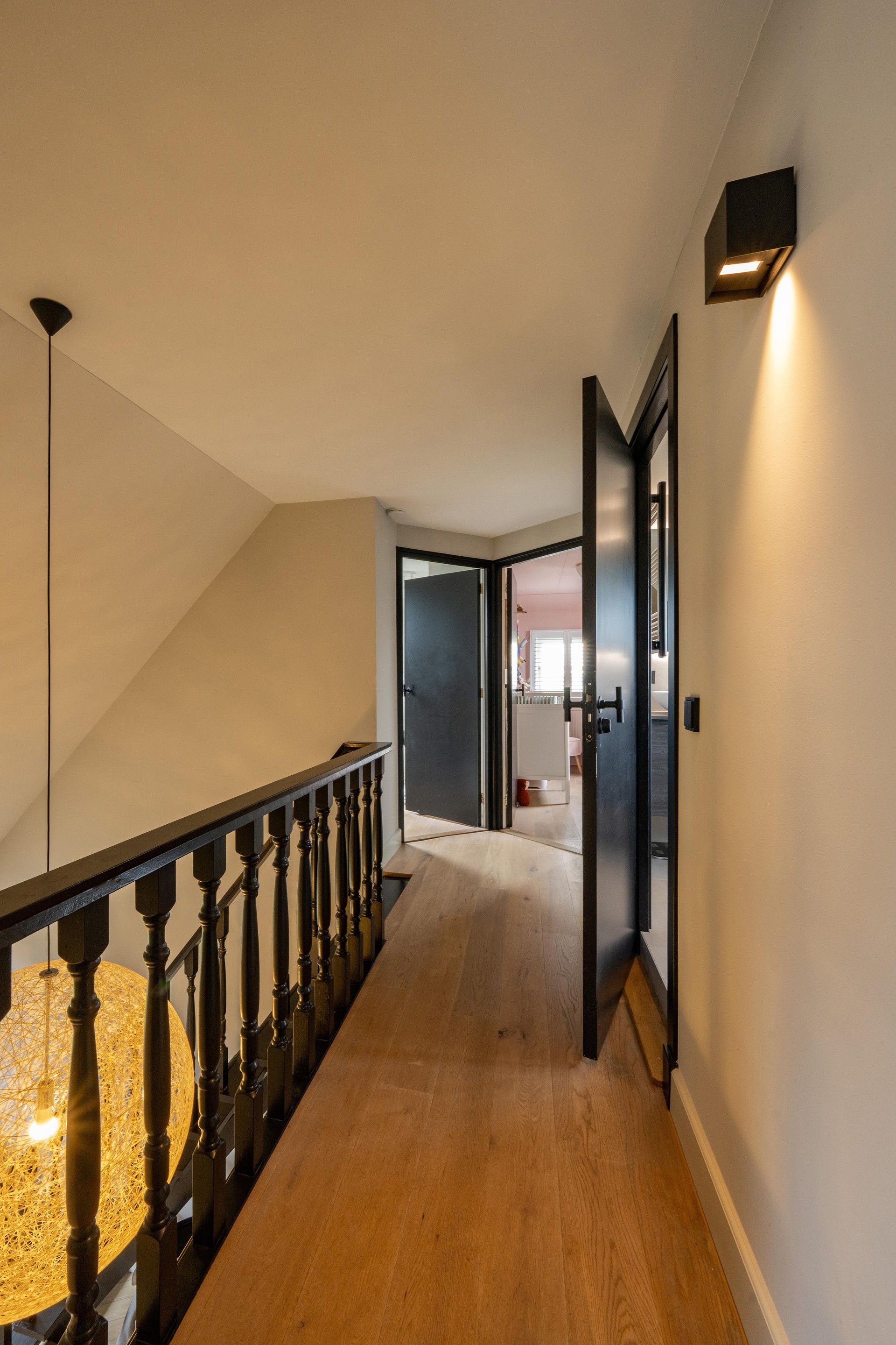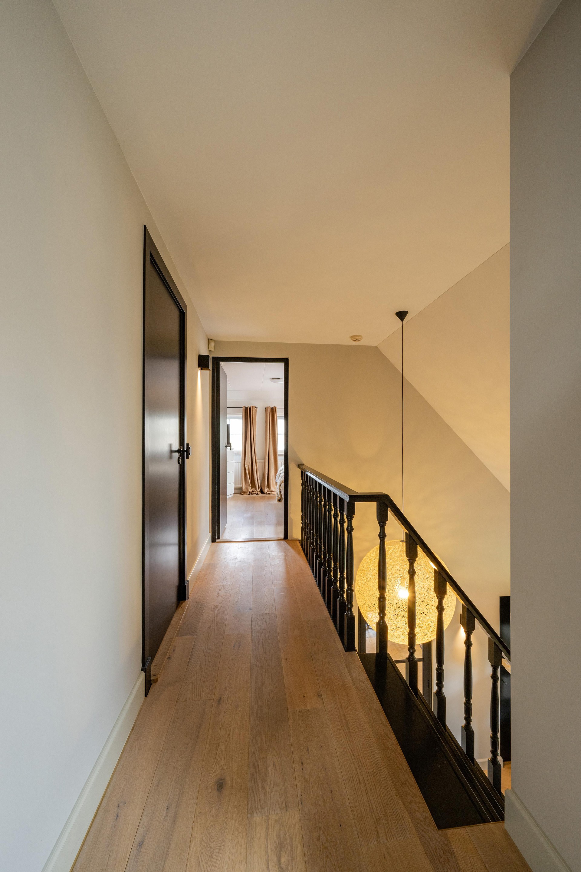 Eerste verdieping Ook deze verdieping is stijlvol afgewerkt met eiken vloerdelen en biedt drie slaapkamers die via de overloop (met zicht op de entree/hal) zijn te bereiken.