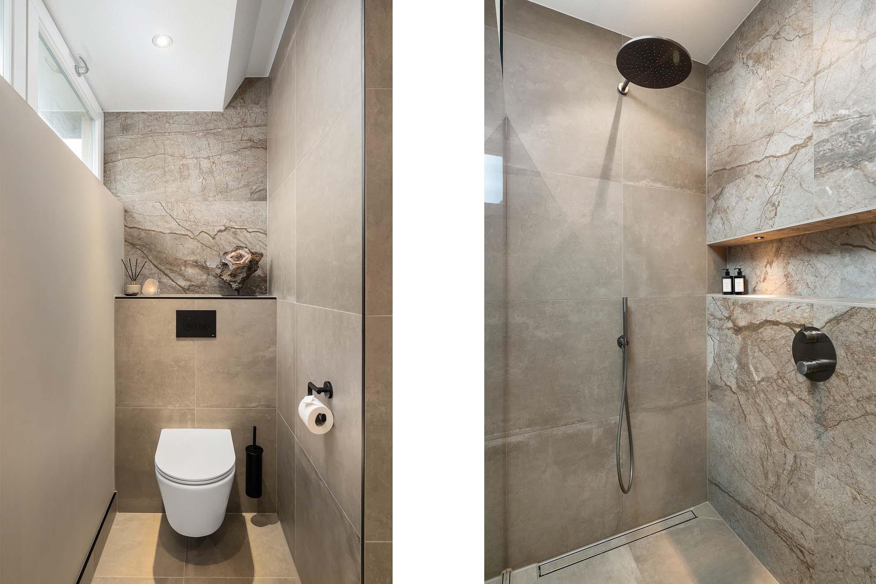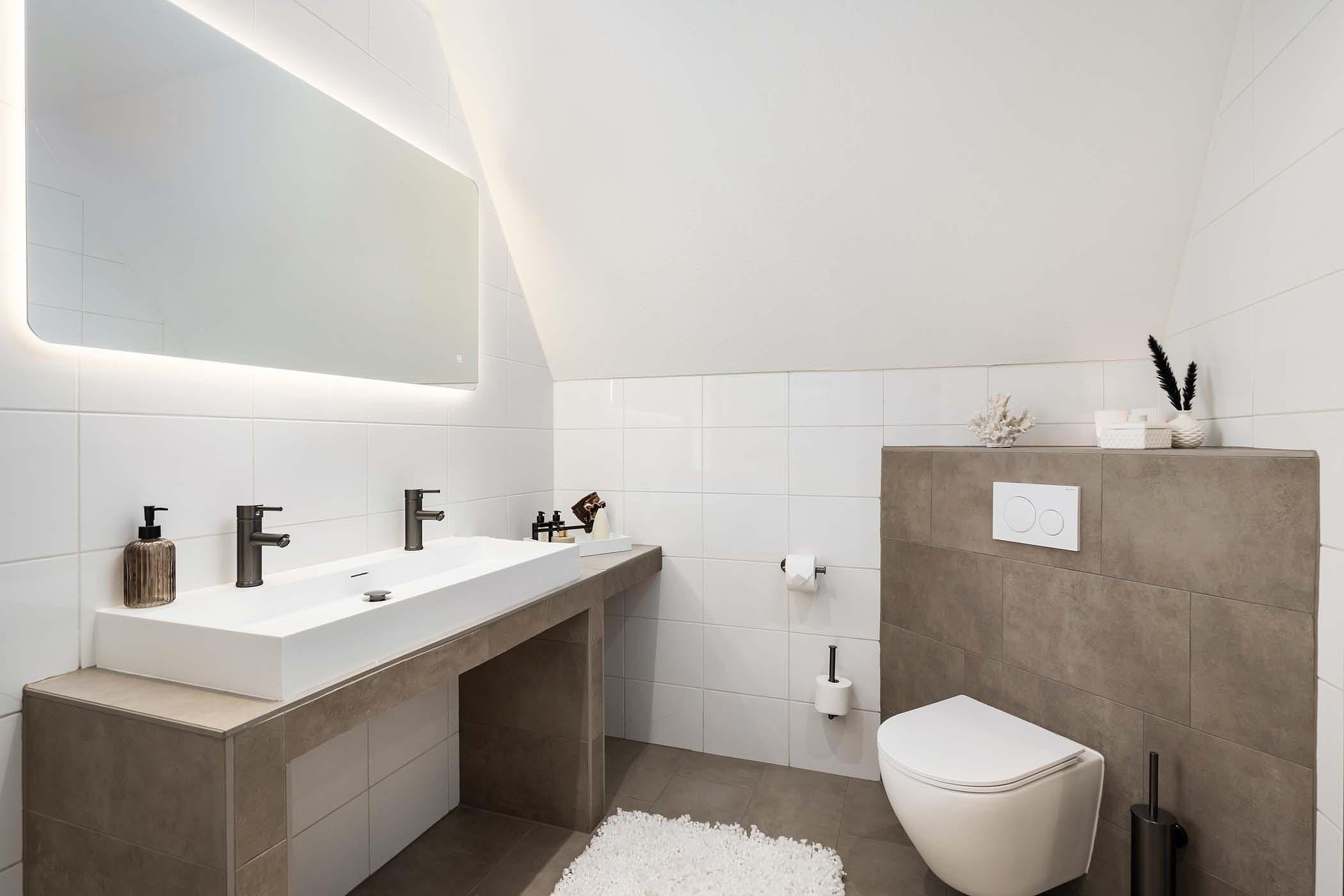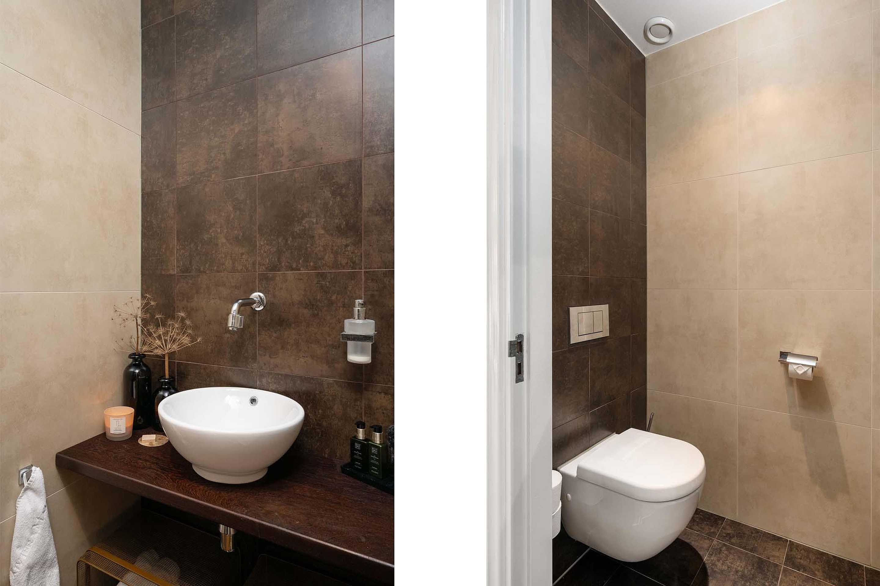 Binnenkomst is meteen bijzonder: de grote hal met vide en de elegante trap vormen het hart van de woning en geven direct een gevoel van luxe en ruimte. Vanuit de hal heb je toegang tot het toilet, de meterkast, de trapopgang, de lift en de verschillende leefruimtes. Het toilet is zeer ruim en voorzien van een hangend toilet en wastafel meubel met waskom.