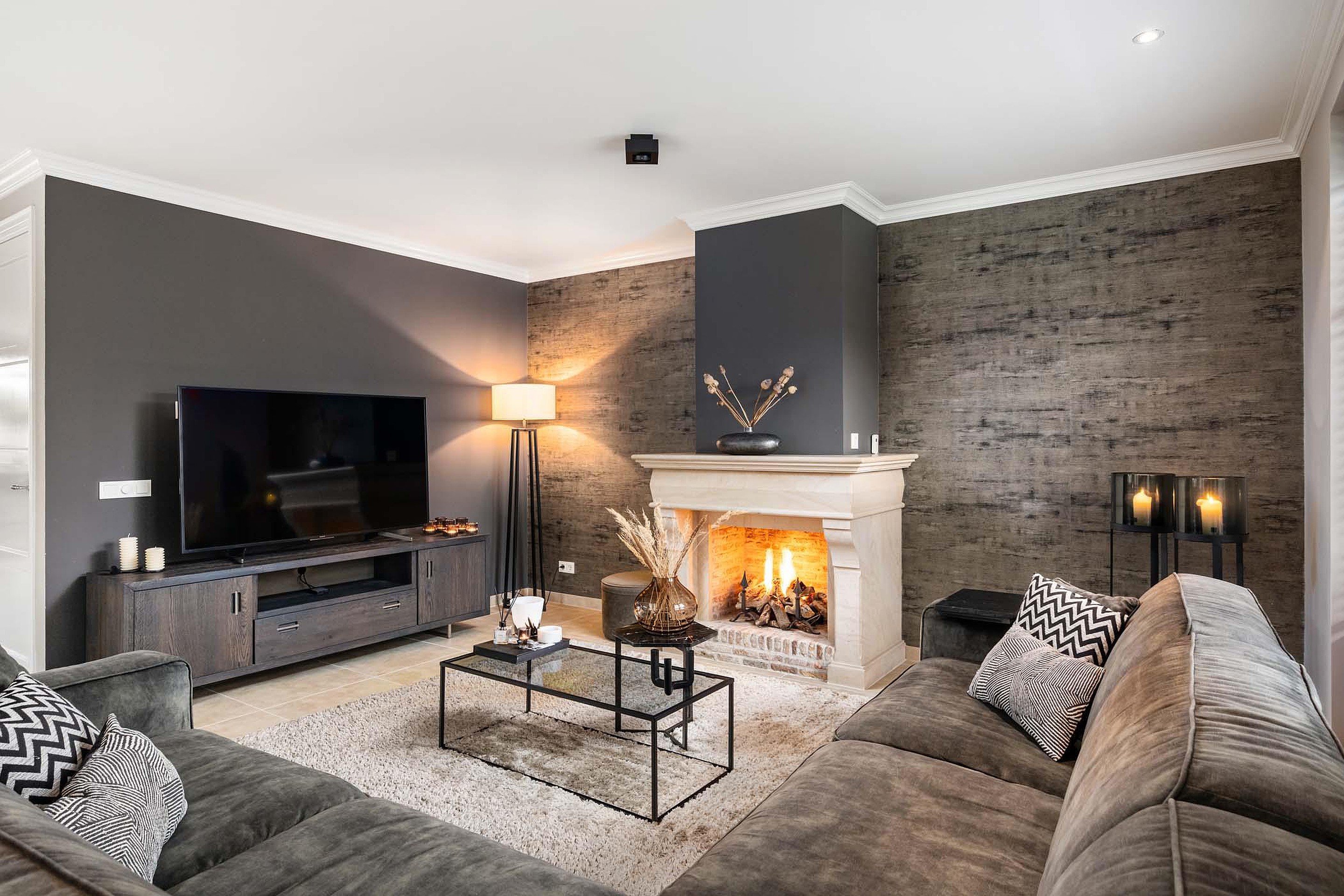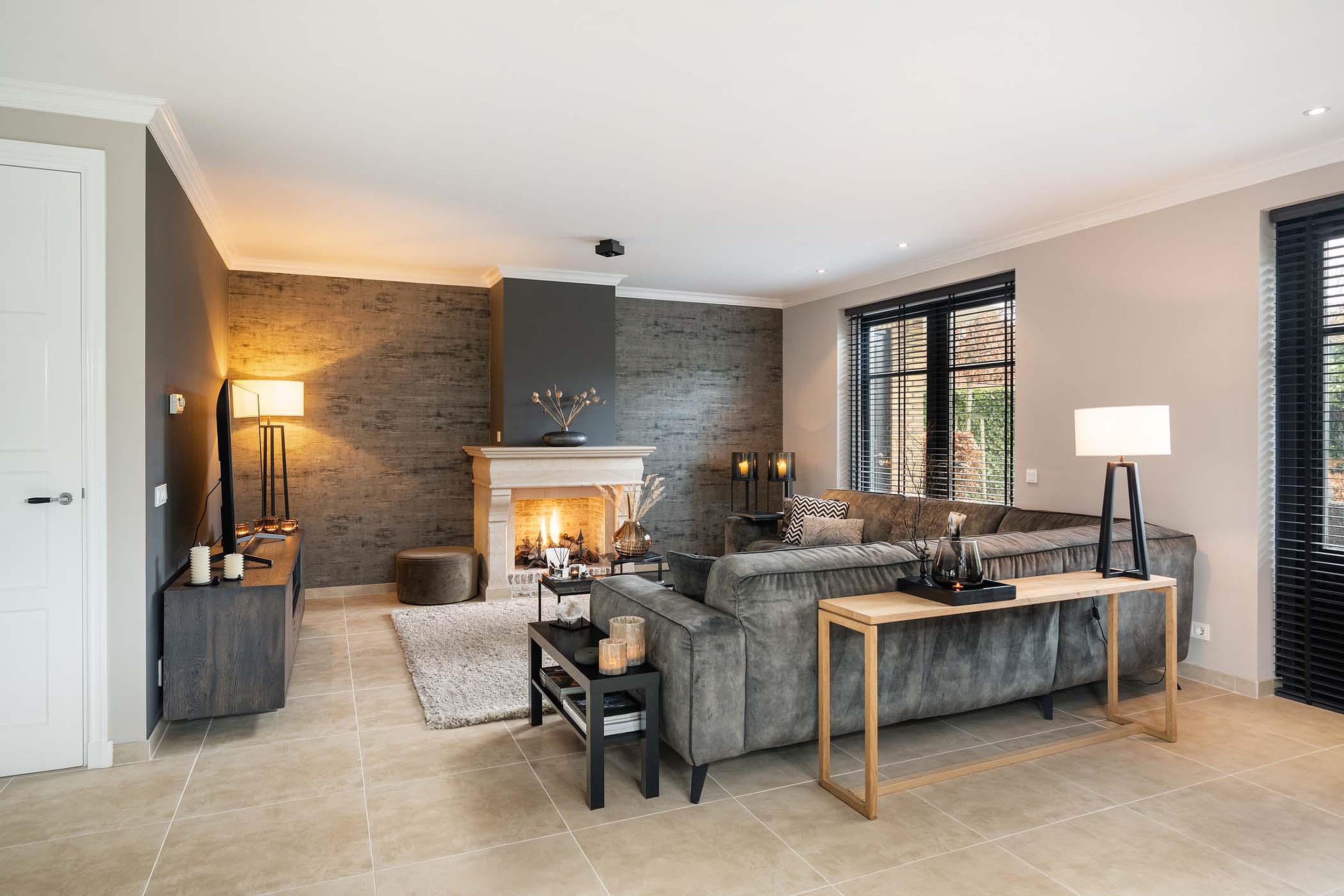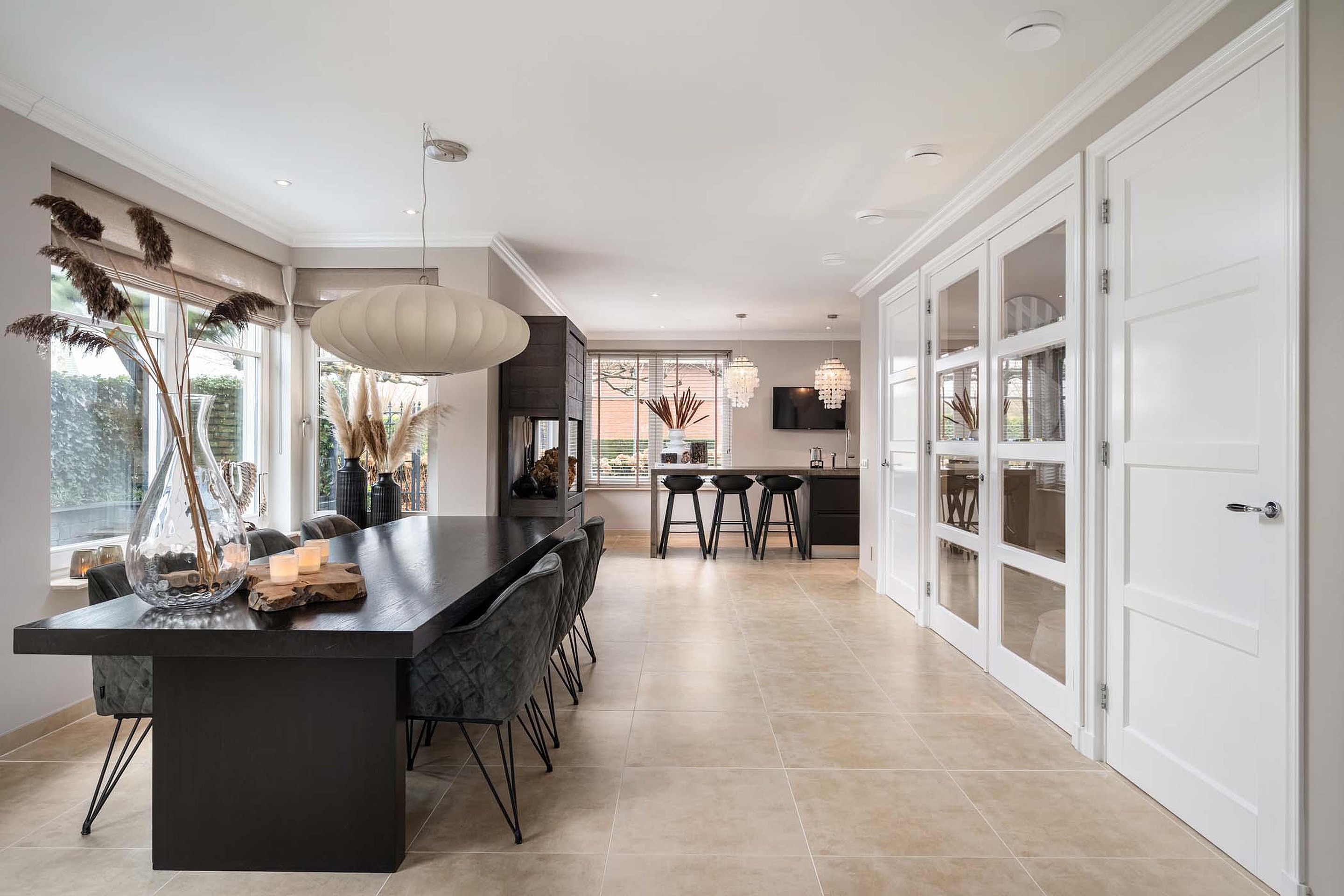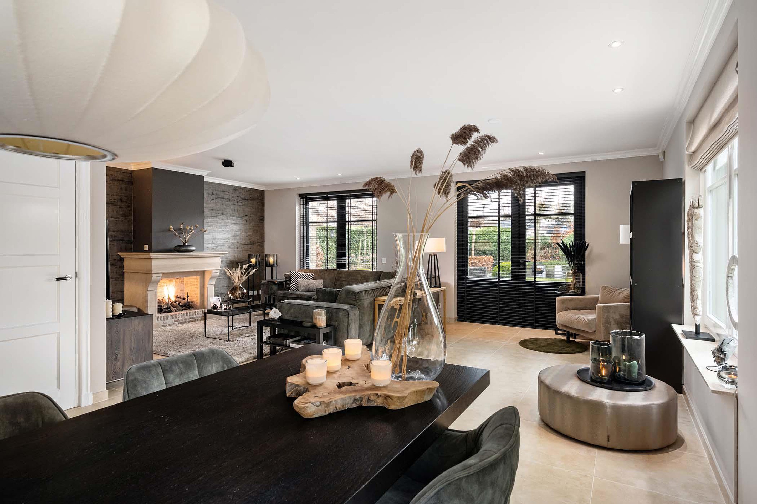 De woonkamer is royaal opgezet en heerlijk licht dankzij de grote raampartijen rondom. De dubbele openslaande deuren naar de tuin zorgen voor een mooie verbinding tussen binnen en buiten. De ruimte voelt open, comfortabel en stijlvol aan en vormt het hart van de woning.
