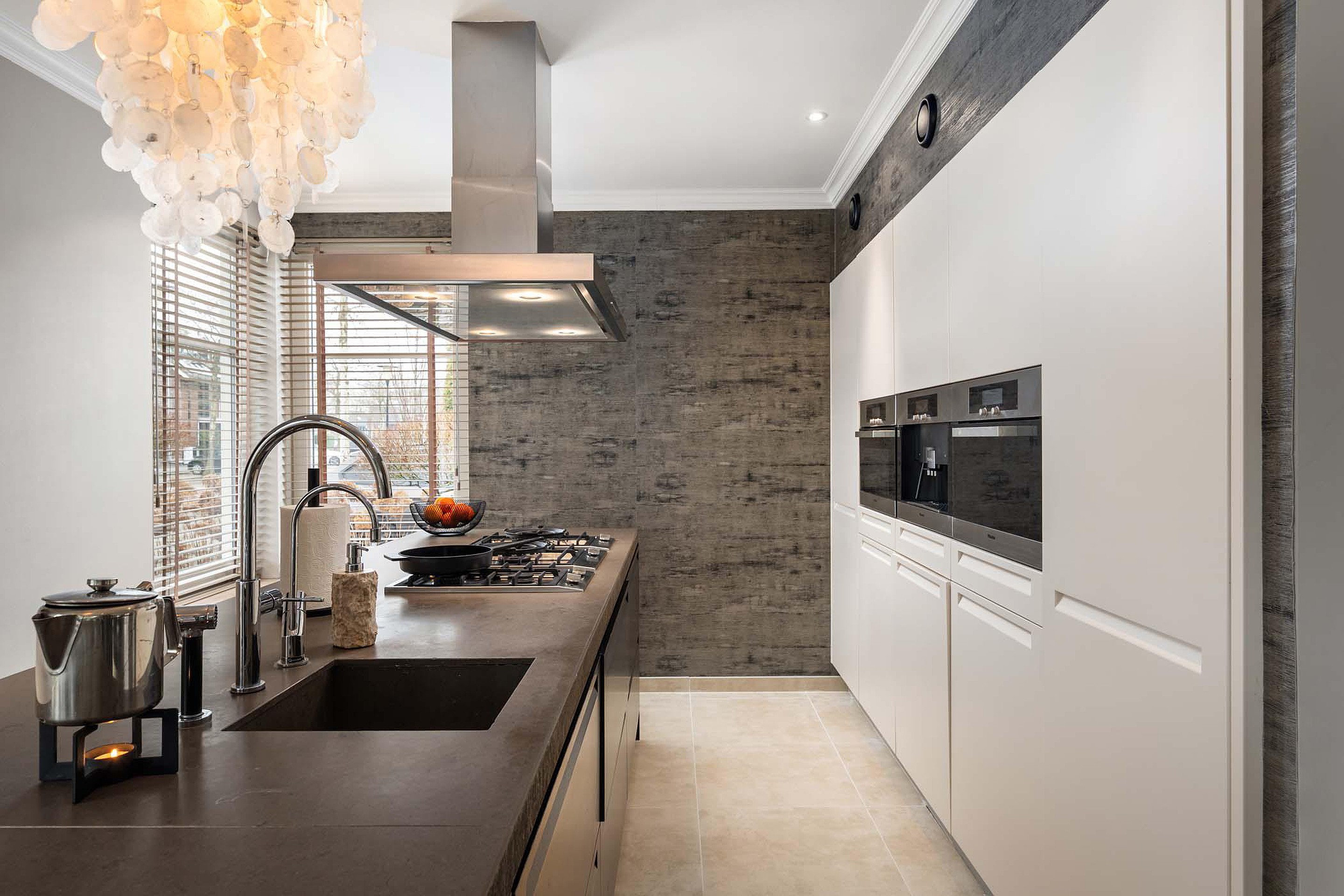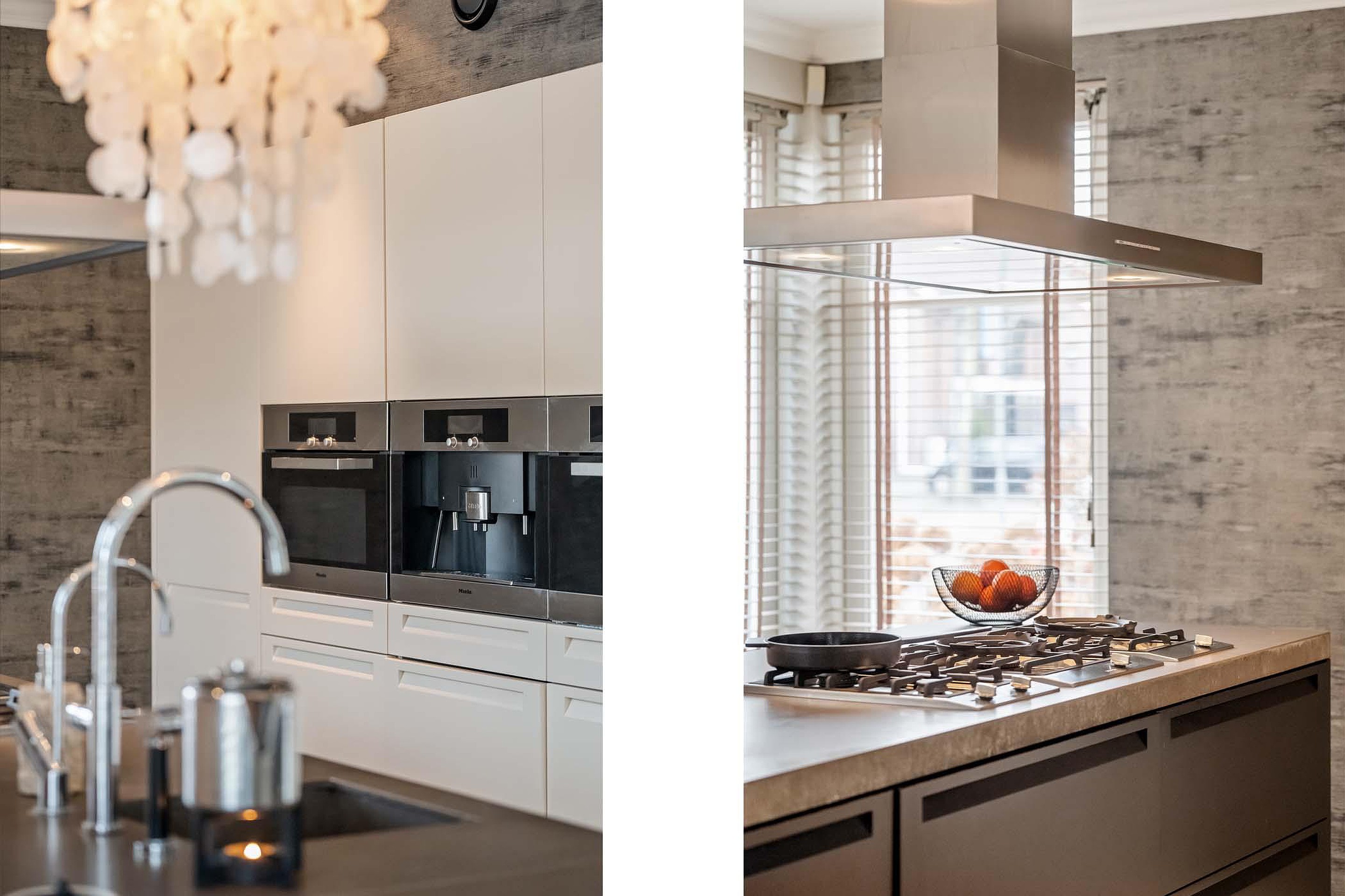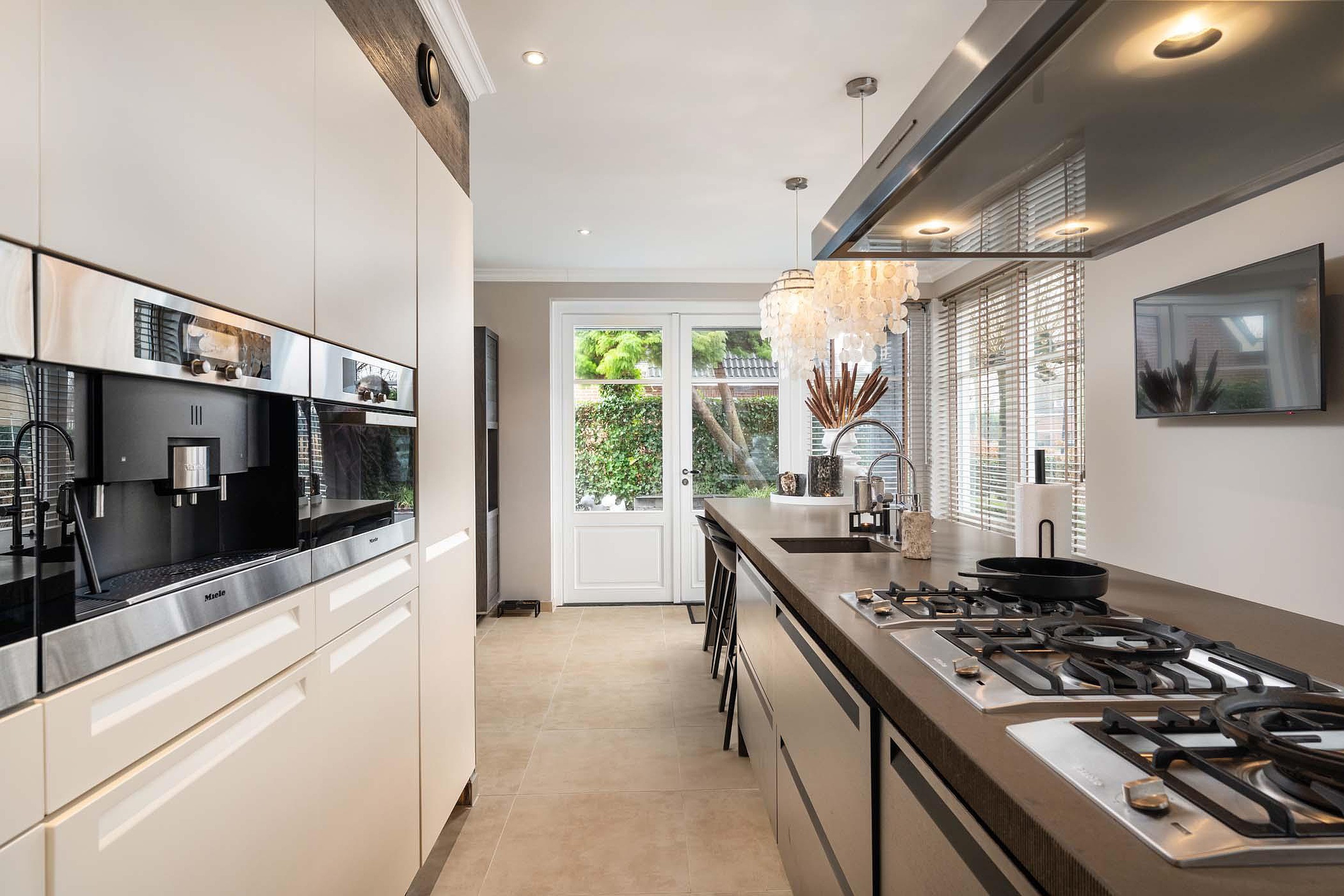 De keuken en leefruimte sluiten mooi op elkaar aan, waardoor een fijne leefomgeving ontstaat waar wonen, koken en samen zijn perfect samenkomen. De keuken is opgesteld in een hoge kastenwand en een eiland en is voorzien van kwaliteit inbouwapparatuur.