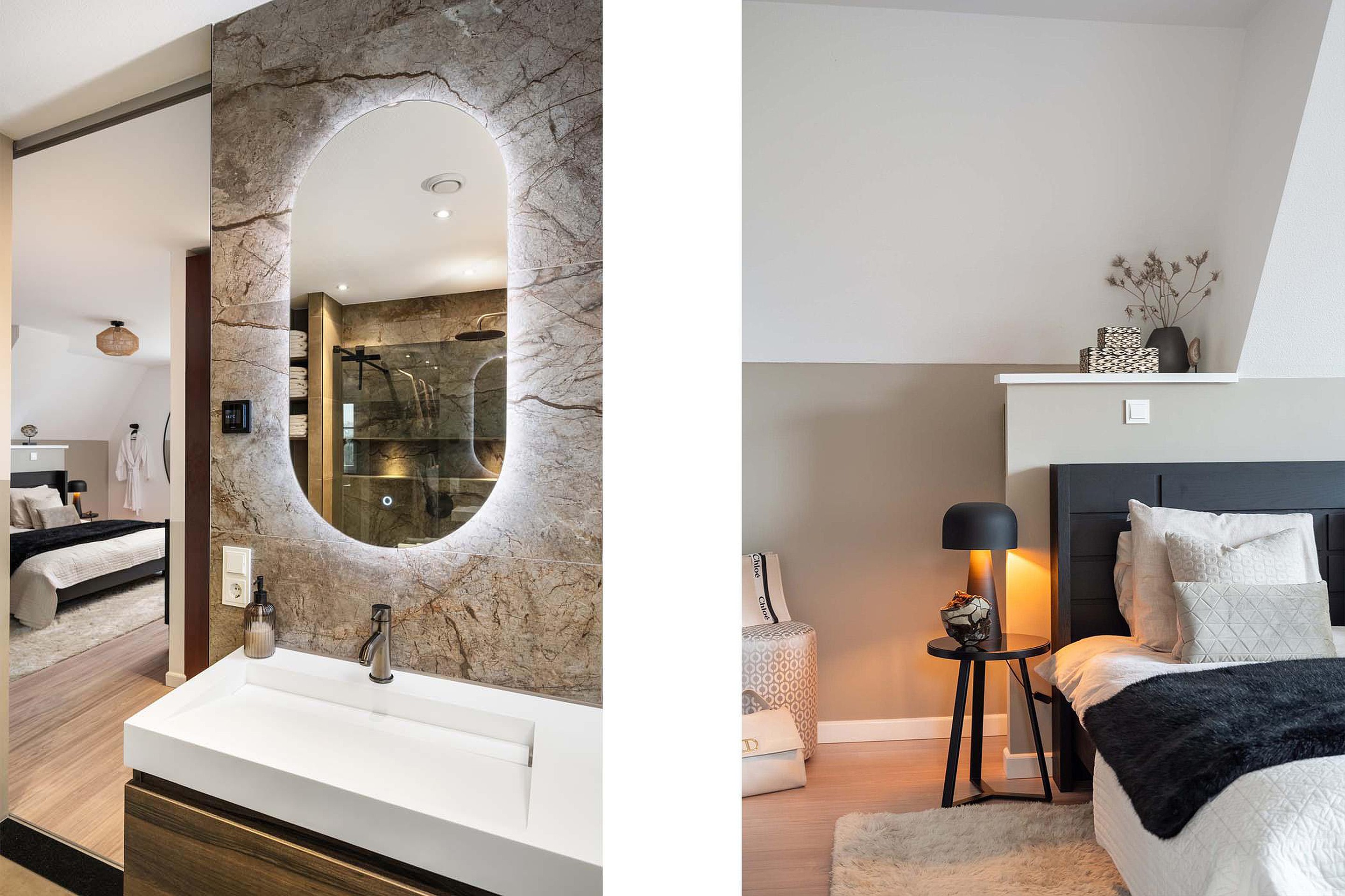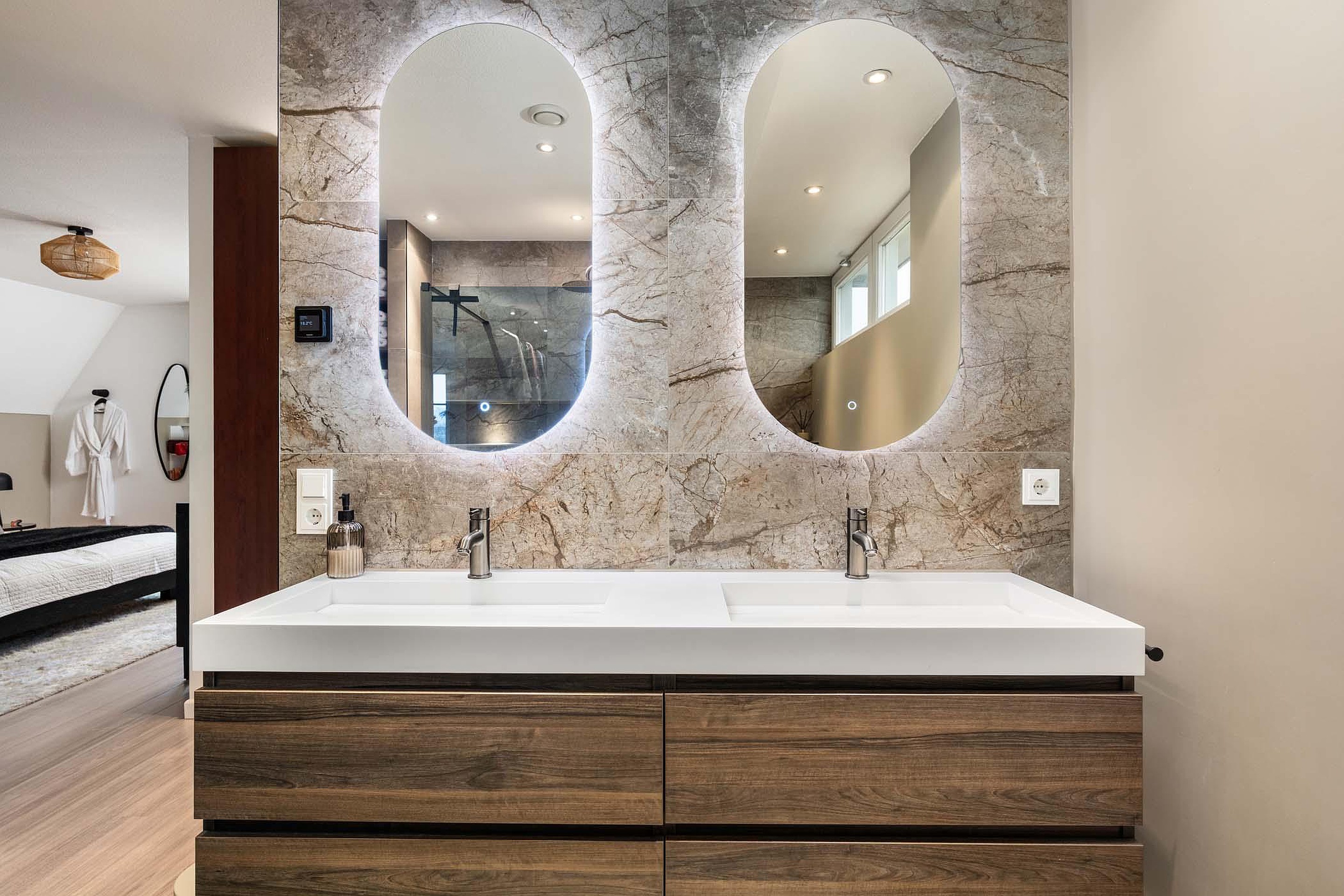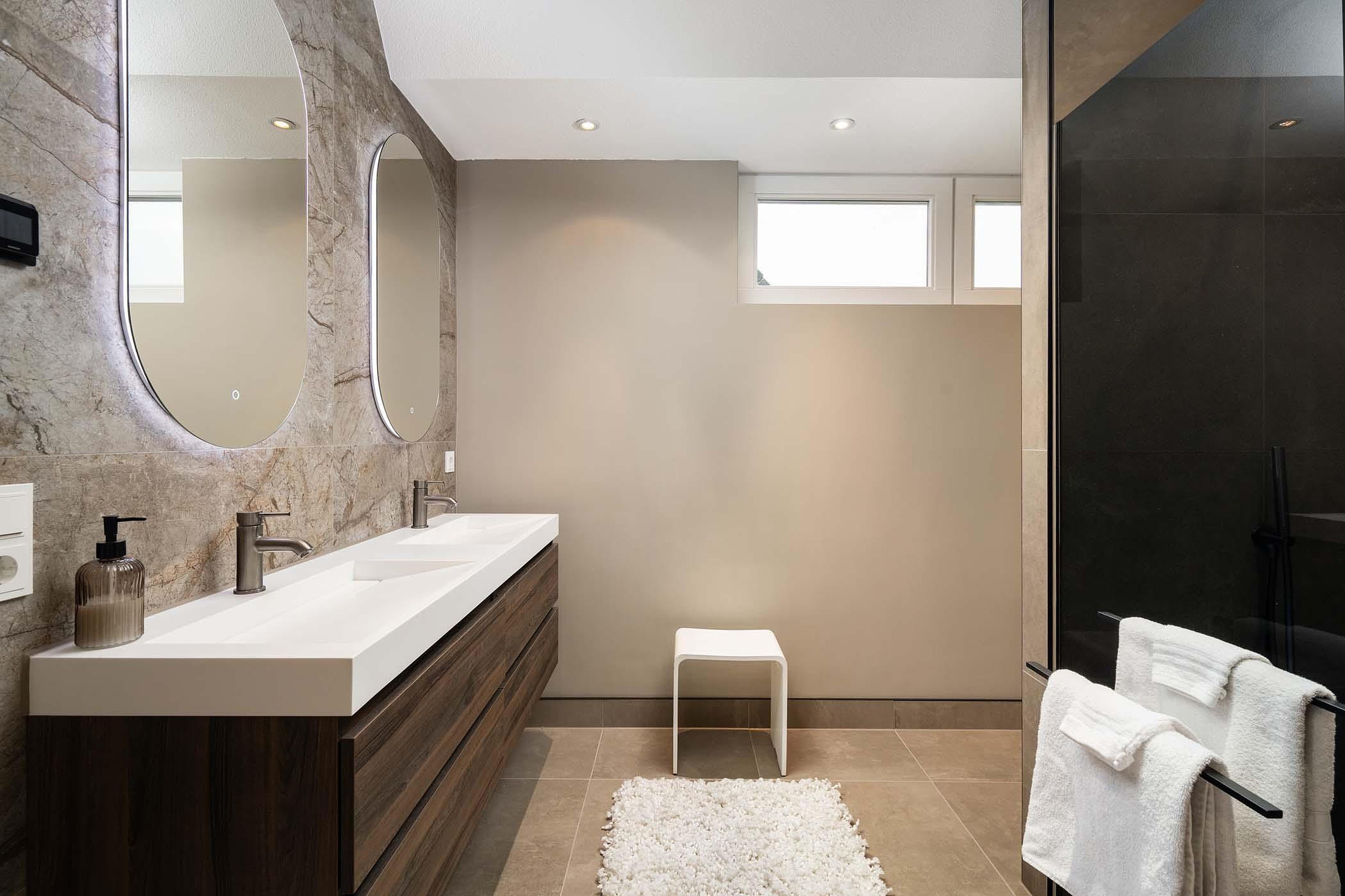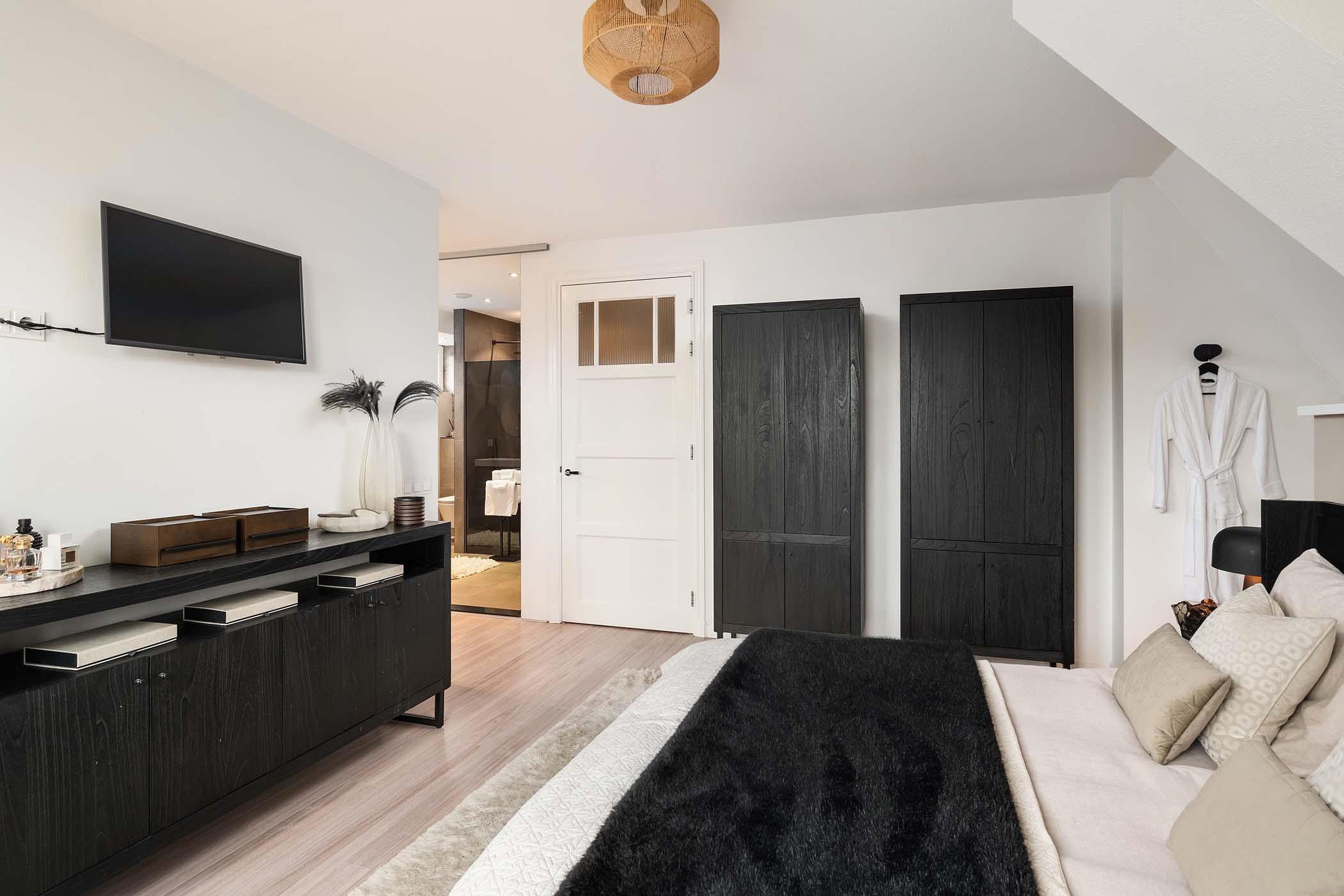De master bedroom is een echte luxe suite. Deze ruime slaapkamer beschikt over een royale inloopkast en een stijlvolle nieuwe badkamer en suite met hoogwaardige afwerking. De badkamer in voorzien van een inloopdouche met verlichte nis, een dubbele wastafel van solid surface met meubel, spiegels met verlichting en verwarming, een toilet en elektrische vloerverwarming. De hotel chique uitstraling past perfect bij het luxe gevoel van deze master bedroom.