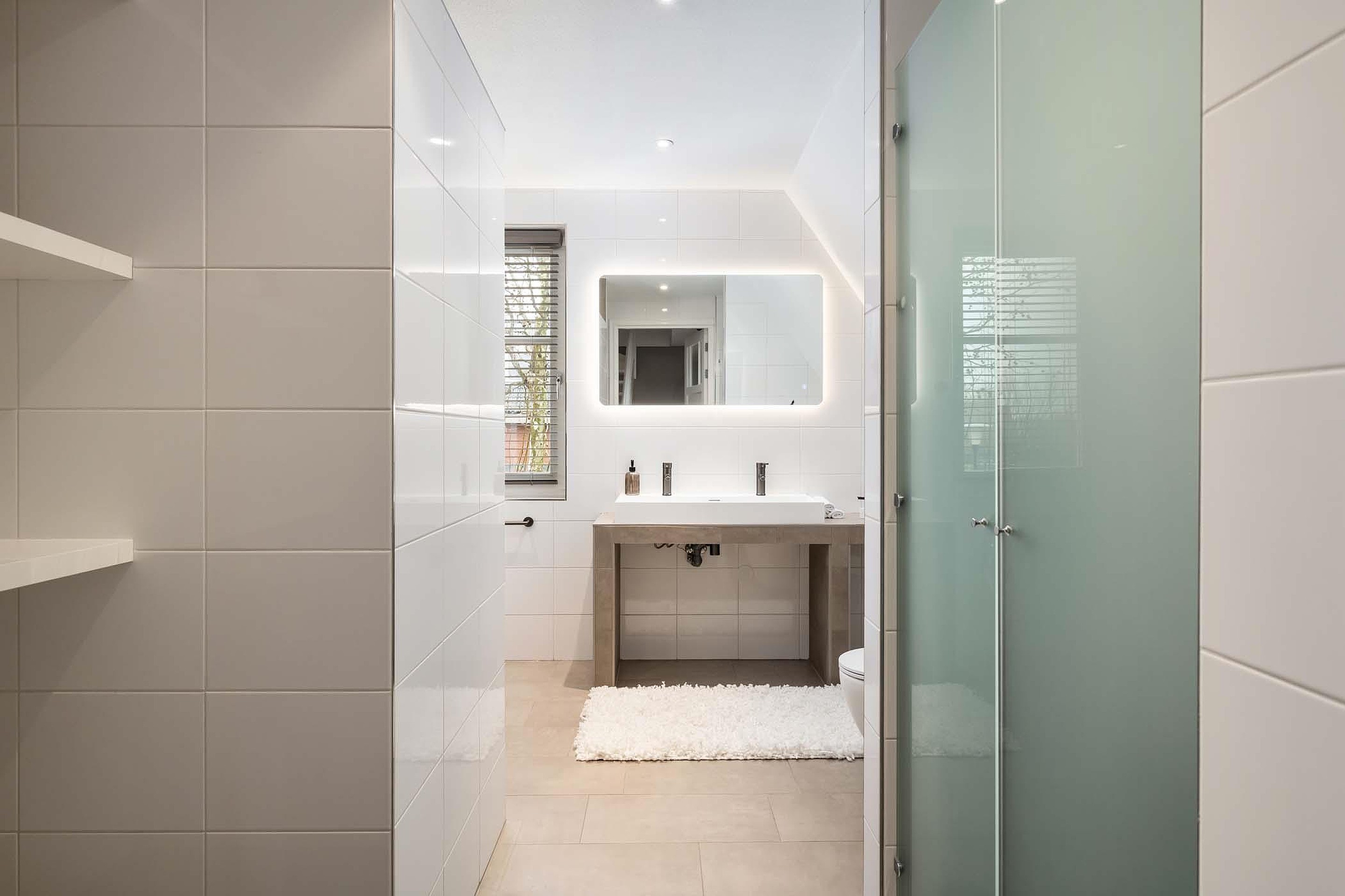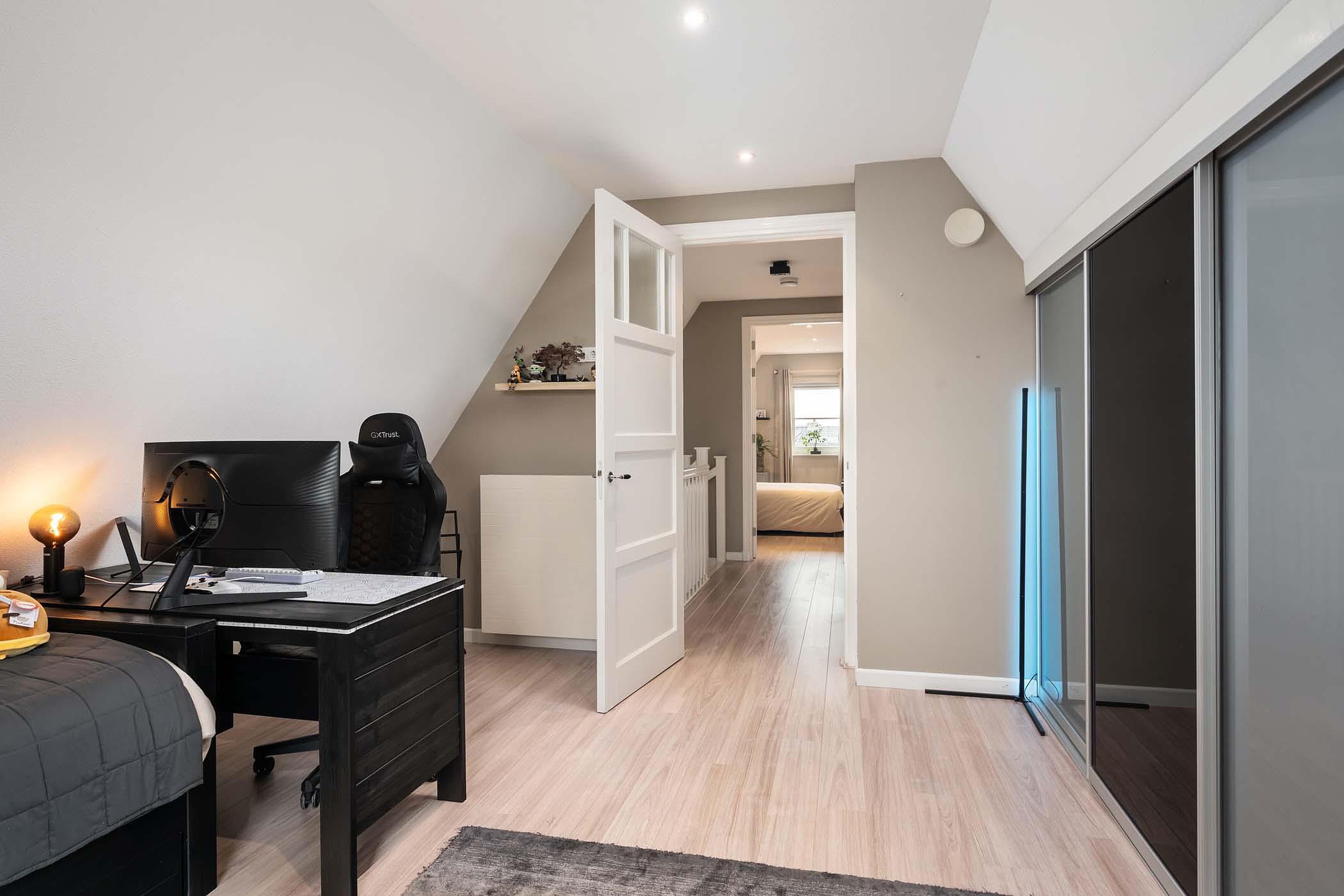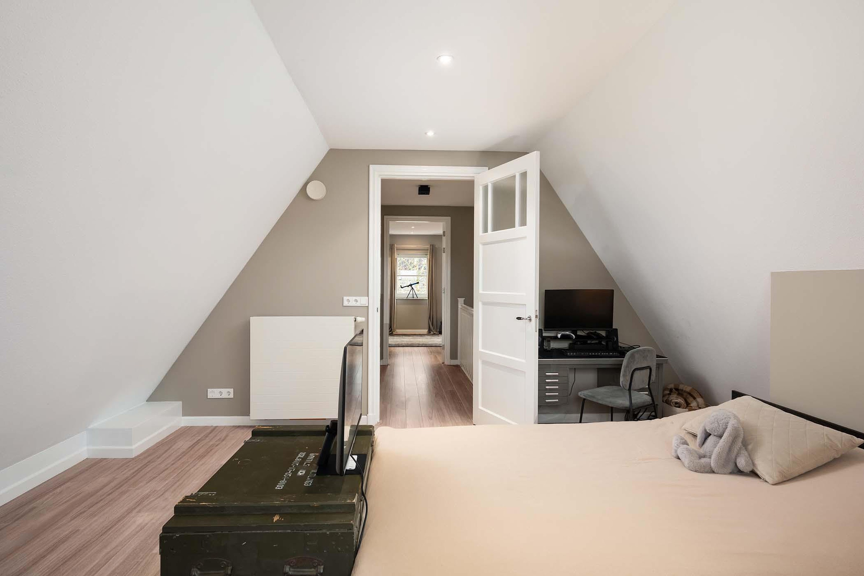 Daarnaast is er nog een ruime slaapkamer aanwezig op deze verdieping en een tweede badkamer. Deze badkamer is modern en strak afgewerkt en voorzien van een inloopdouche, dubbele wastafel van solid surface, een toilet en elektrische vloerverwarming. Op de zeer ruime en charmante overloop met vide is ook nog plek om bijvoorbeeld een gezellige werkplek te creëren.
