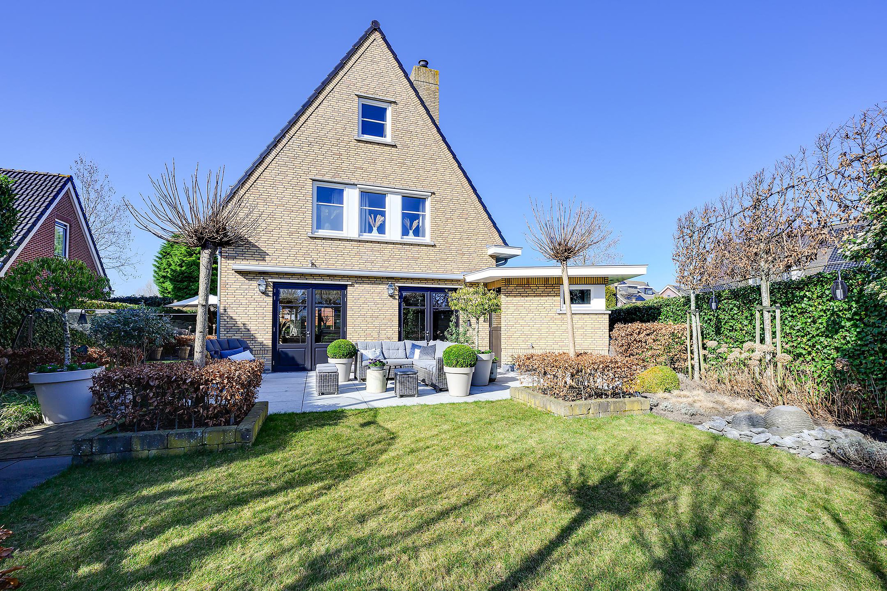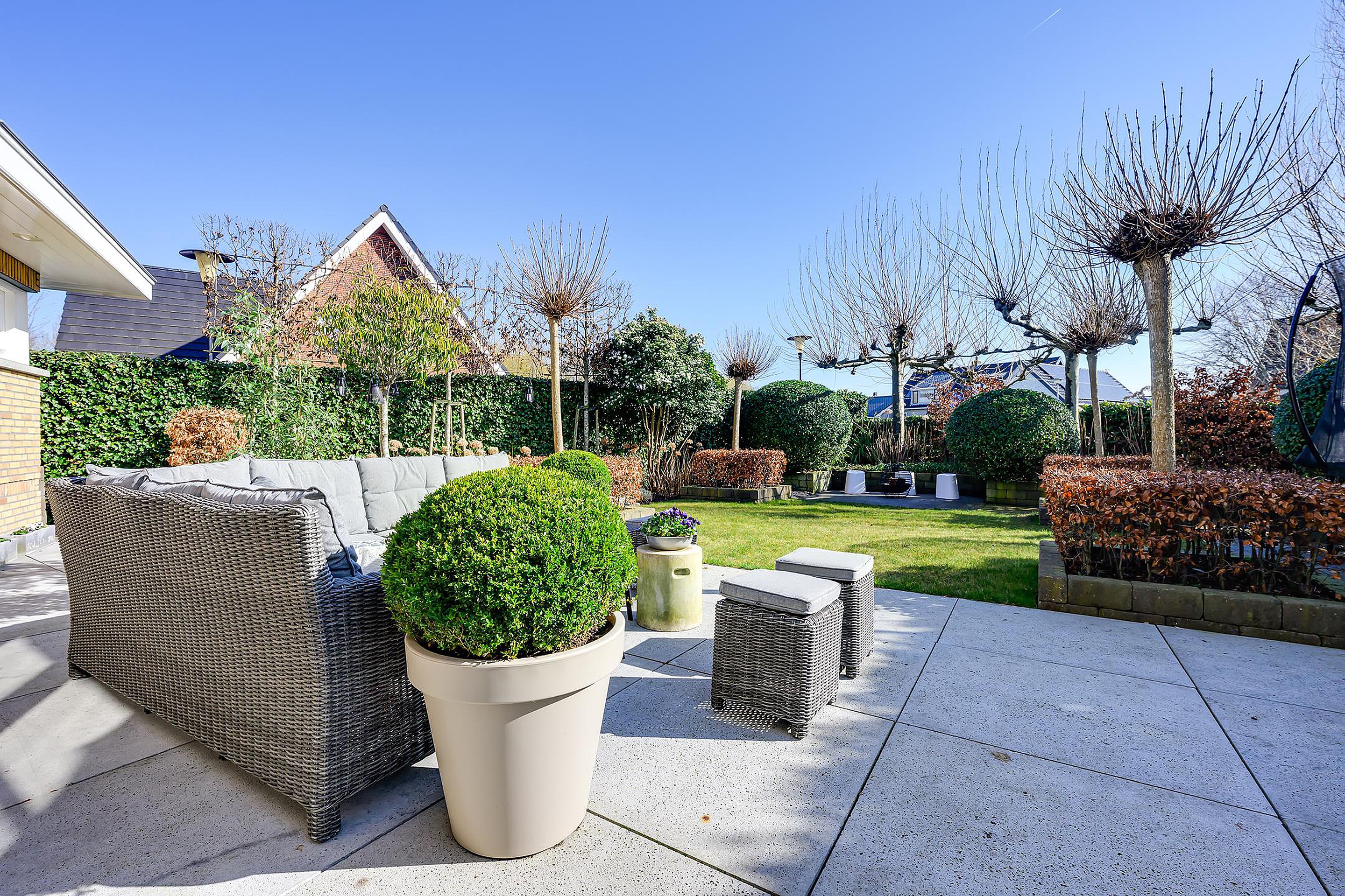 Vanuit de woonkamer en keuken heb je middels openslaande deuren toegang tot de prachtig aangelegde tuin. De tuin is speels aangelegd met maar liefst vier terrassen, zodat je op ieder moment van de dag een plekje in de zon kunt vinden. Begin je ochtend met een ontbijtje op het terras op het oosten, geniet van een lunch op één van de terrassen op het zuidwesten en sluit de dag af met een gezellige barbecue op het terras op het westen. Er zijn 3 buitenkranen en meerdere elektra punten in de voor- en achtertuin aanwezig. In de tuin is er een onderheid terras van 50m2 met kruipruimte en aanwezige voorziening voor eventuele uitbouw.