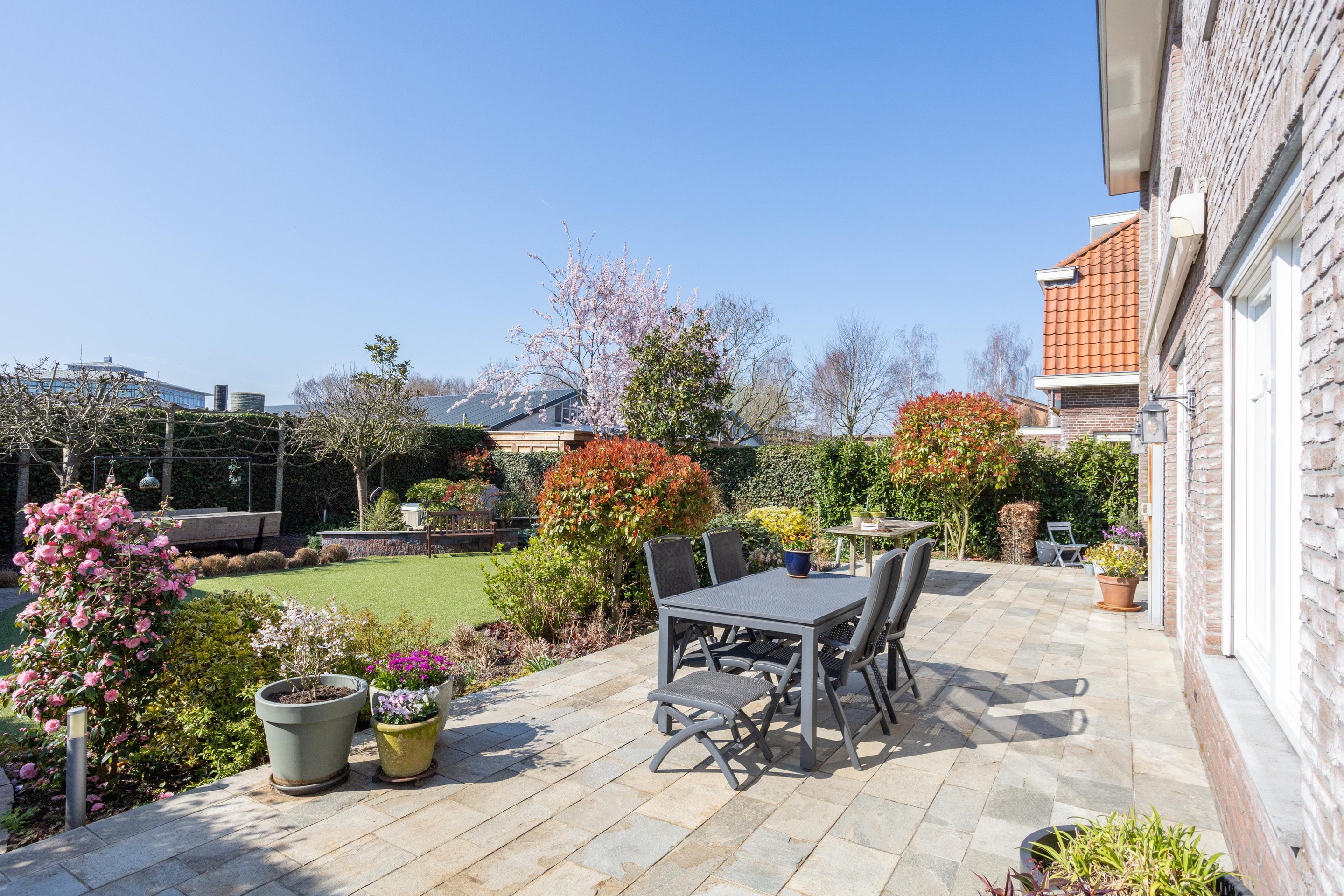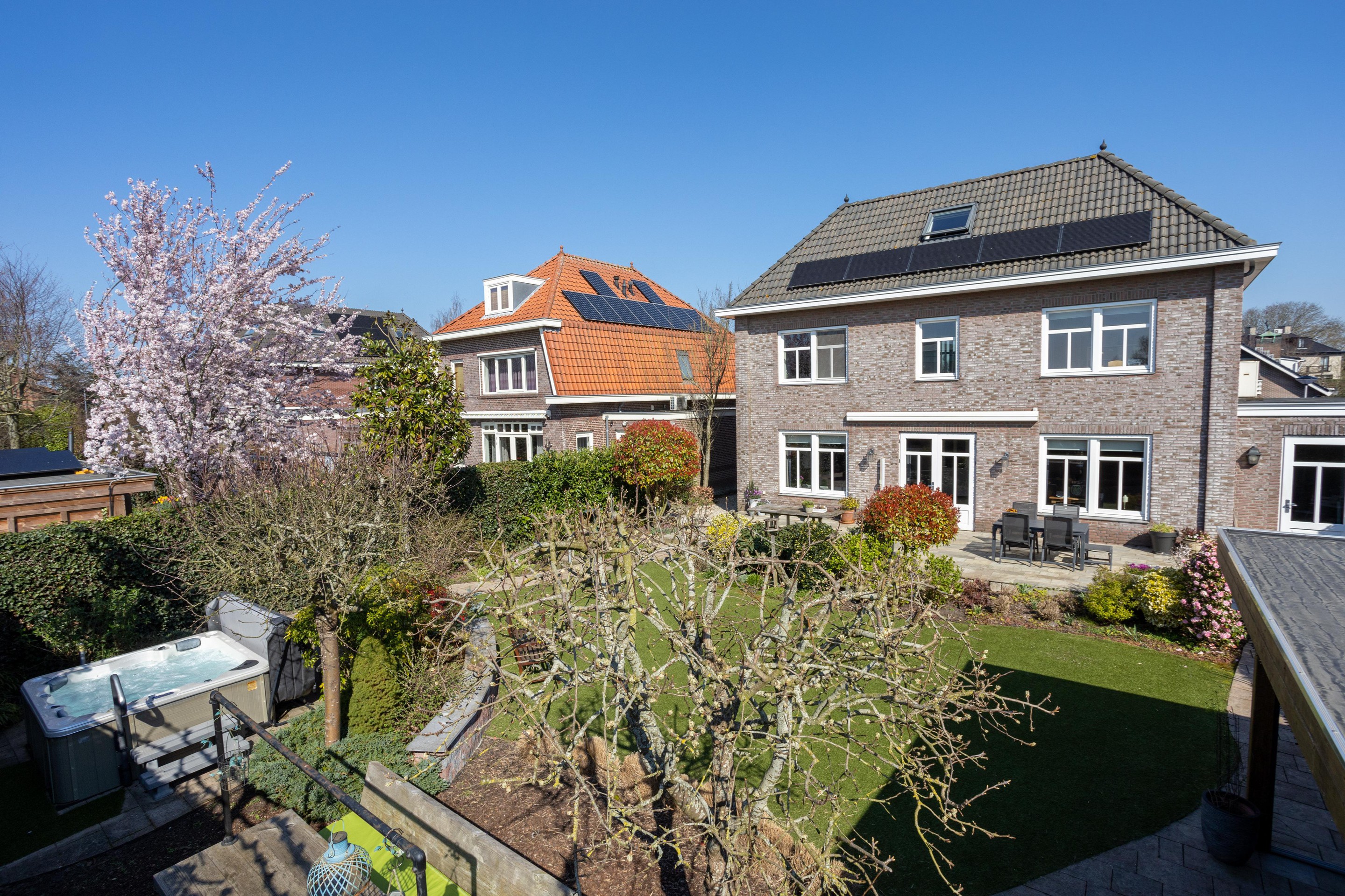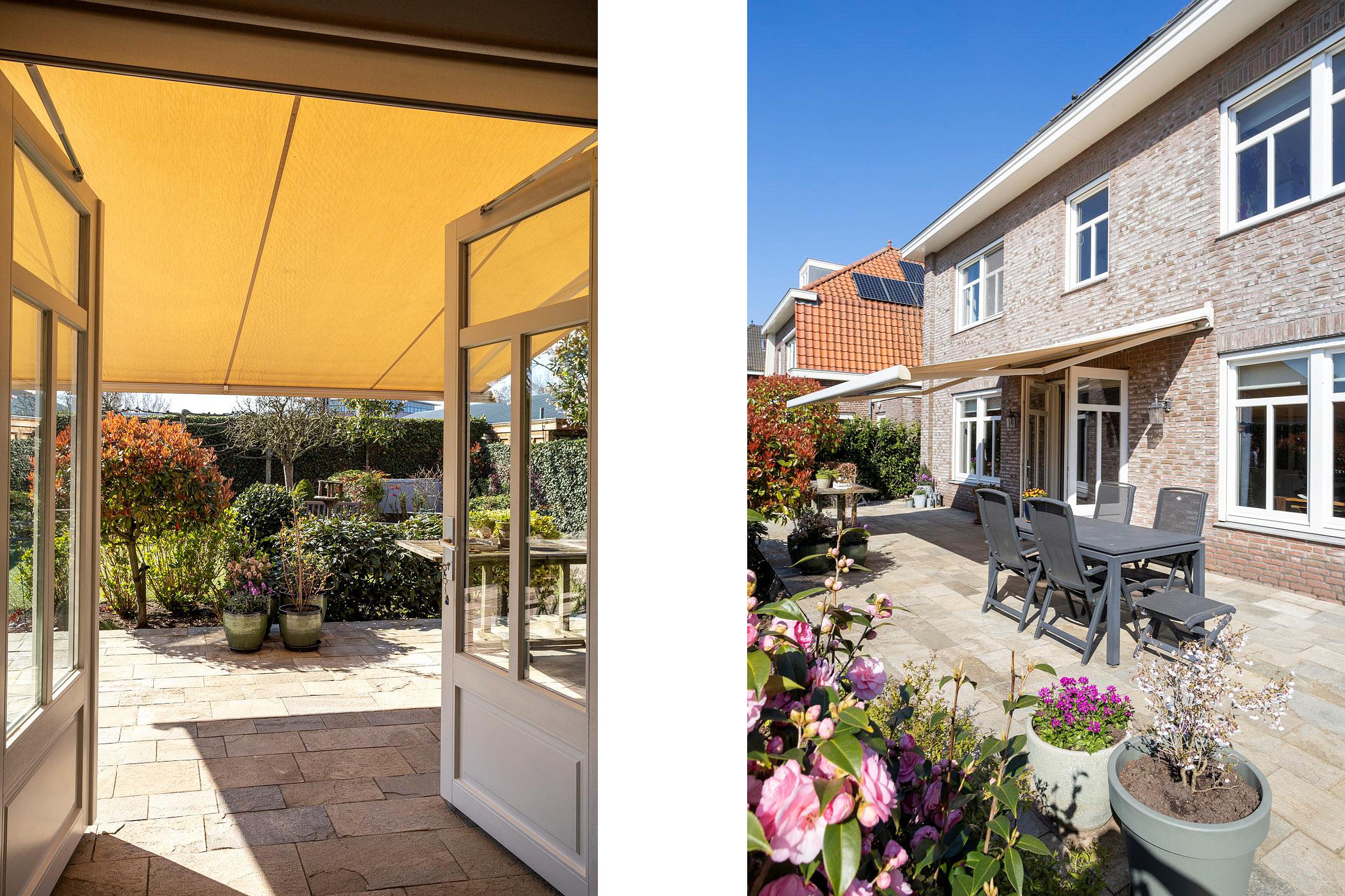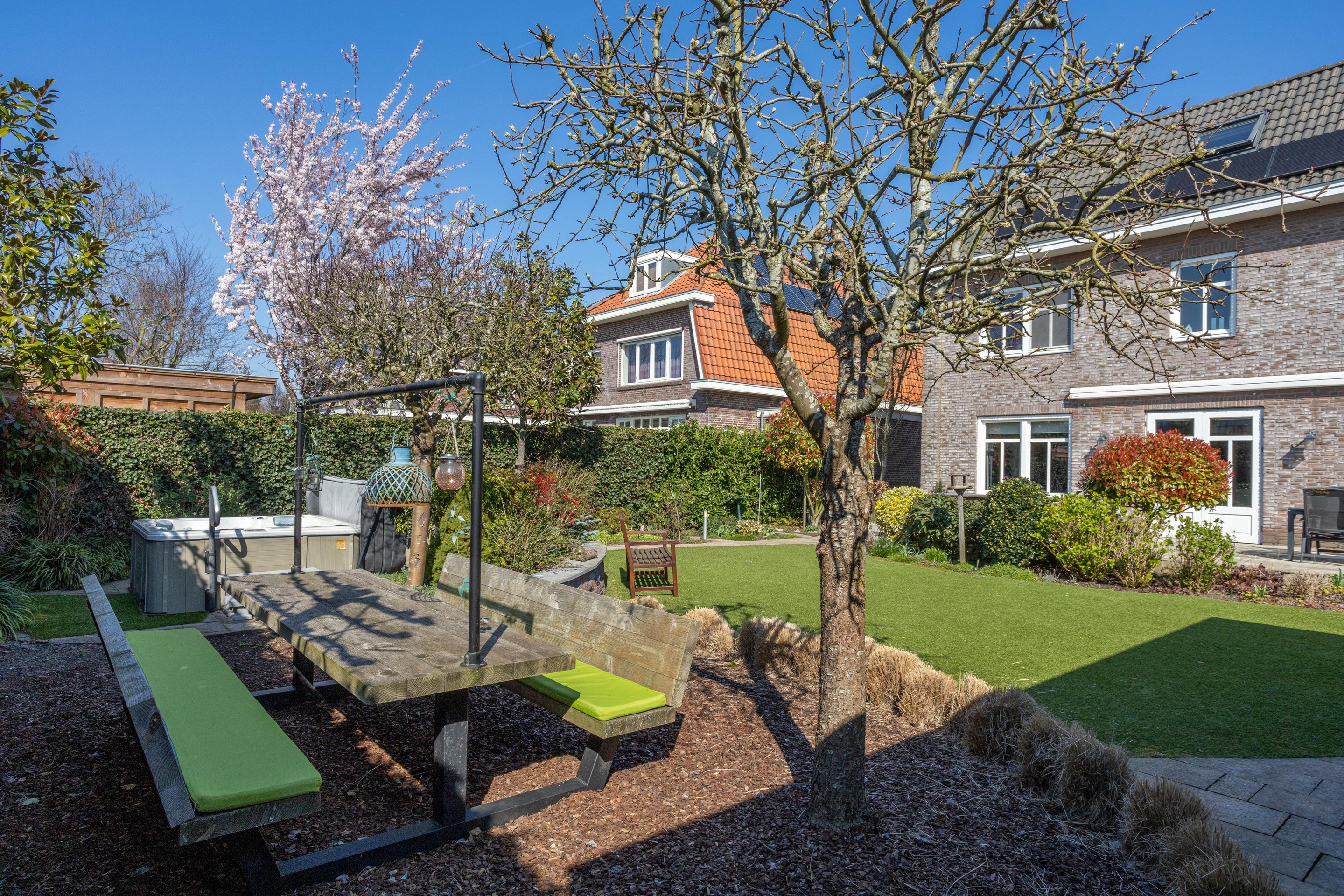 Naast de royale en ruime voortuin is er een is er een mooi aangelegde achtertuin met een overkapping. Heerlijk vrij en zonnig gelegen (zuiden). Er zijn meerdere terrassen aanwezig, u kunt kiezen voor zon en schaduw en gebruik maken van een beschermend liggend jacuzzi.