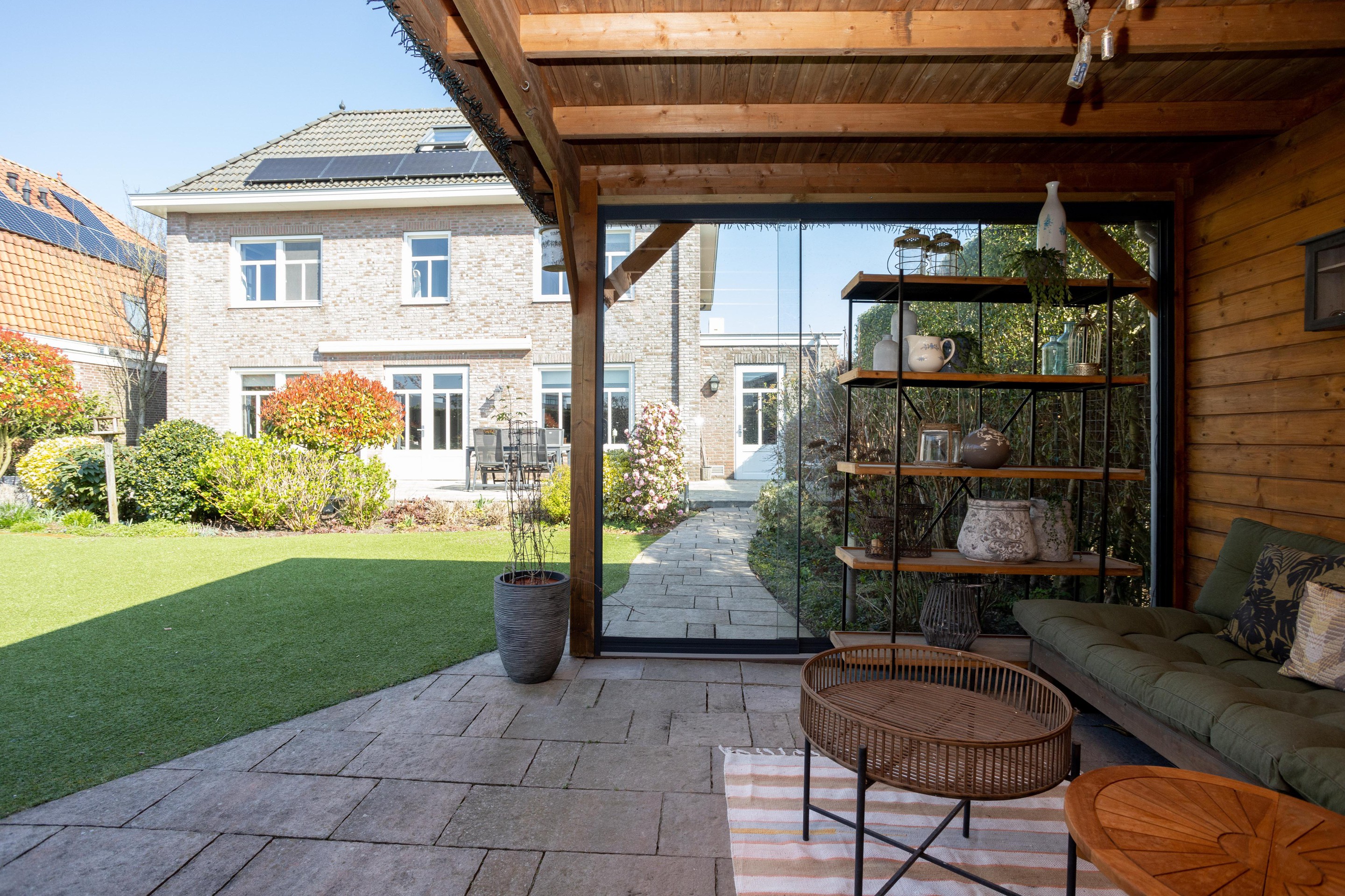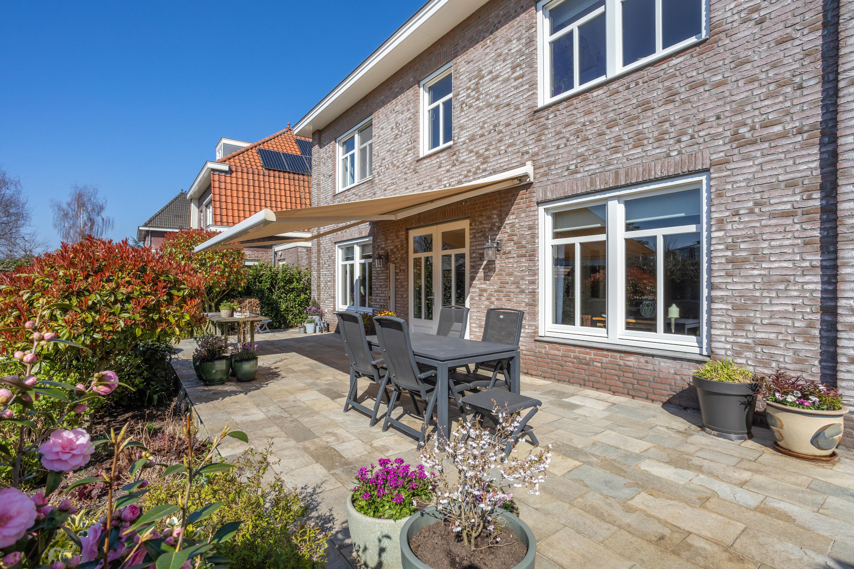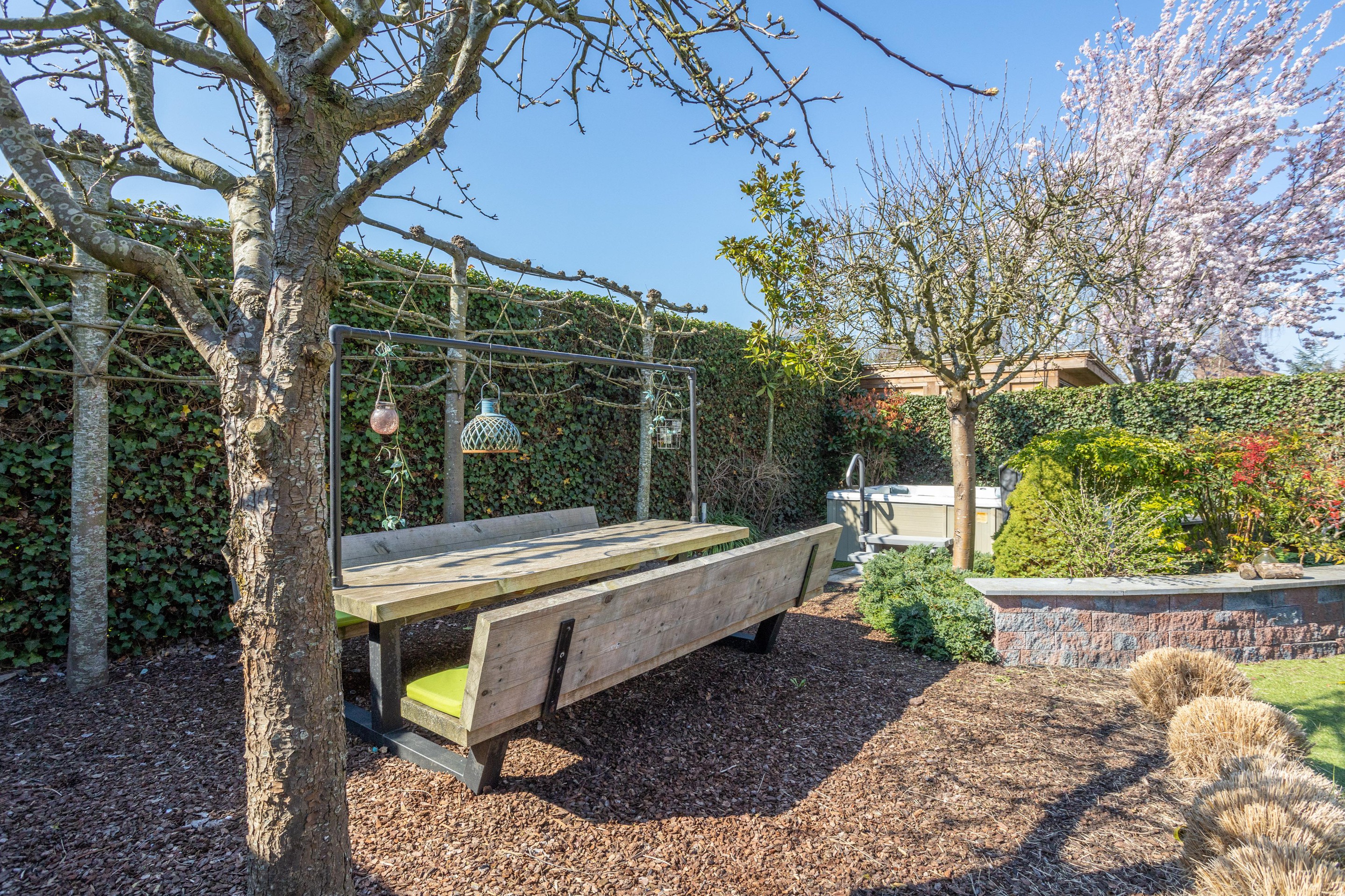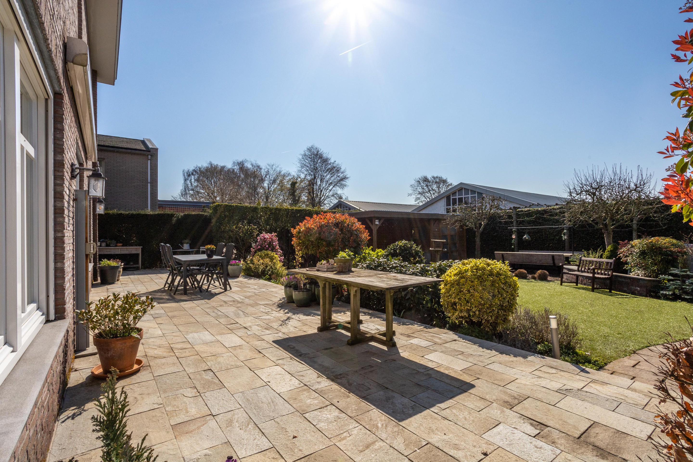 Naast de royale en ruime voortuin is er een is er een mooi aangelegde achtertuin met een overkapping. Heerlijk vrij en zonnig gelegen (zuiden). Er zijn meerdere terrassen aanwezig, u kunt kiezen voor zon en schaduw en gebruik maken van een beschermend liggend jacuzzi.