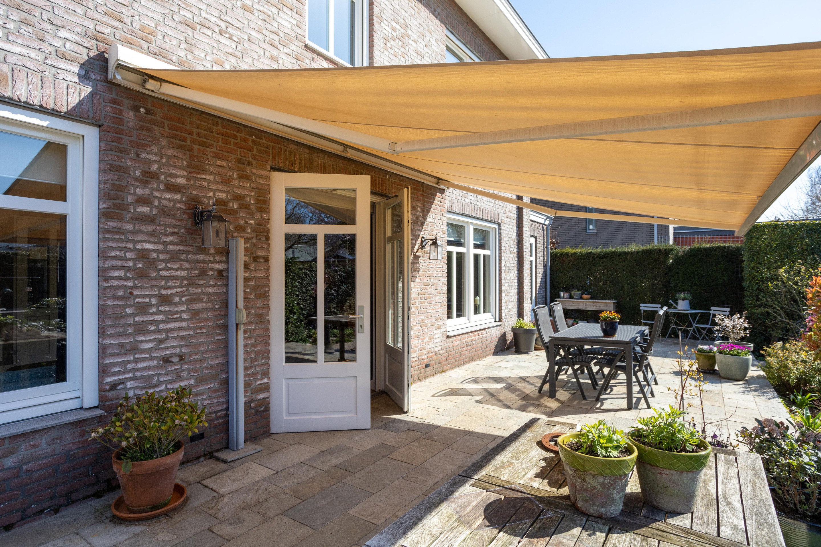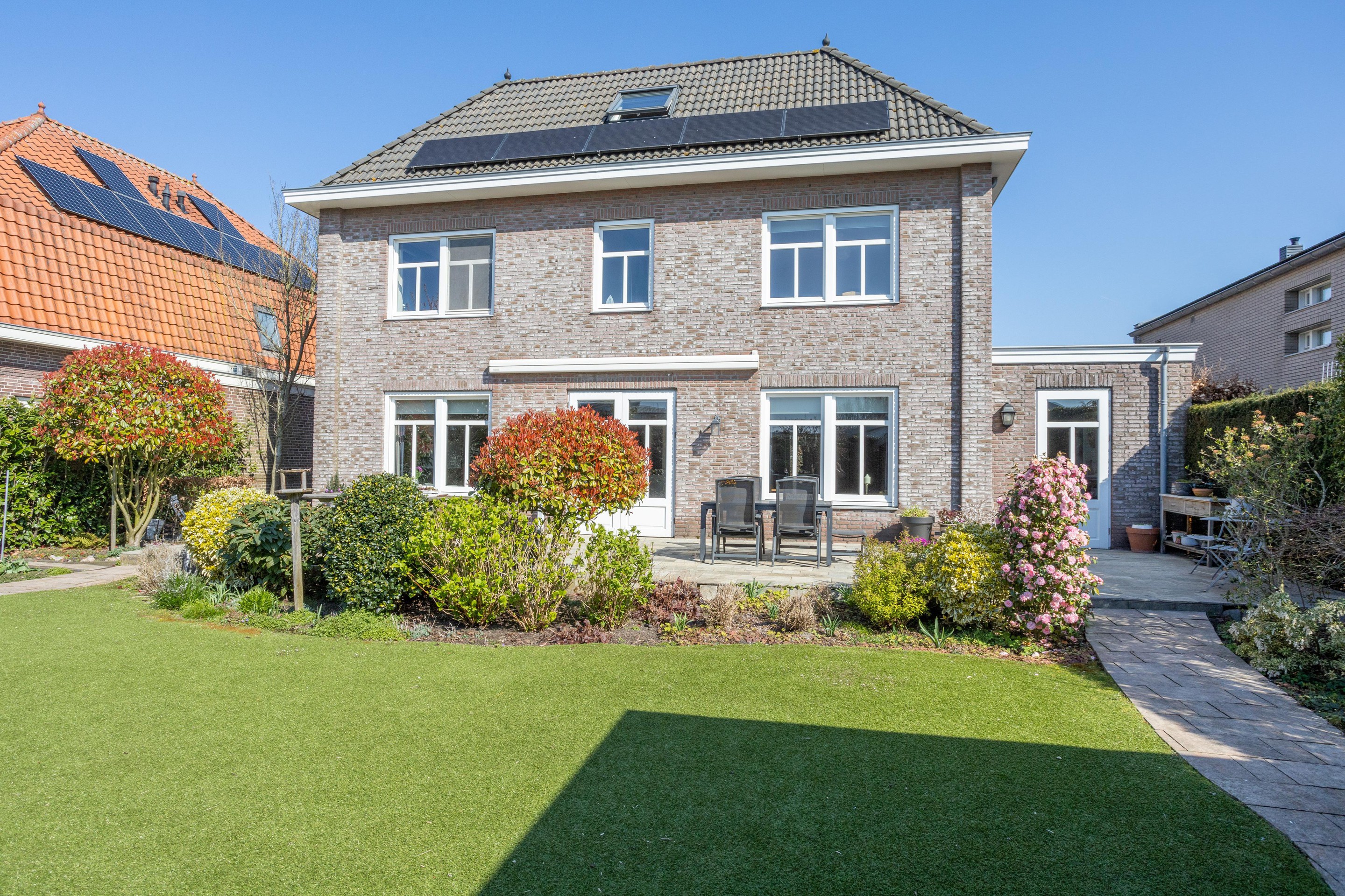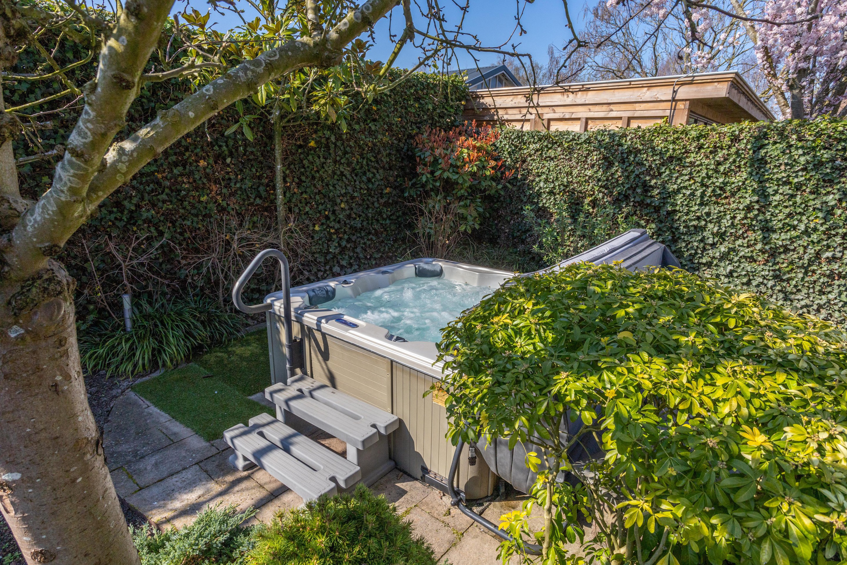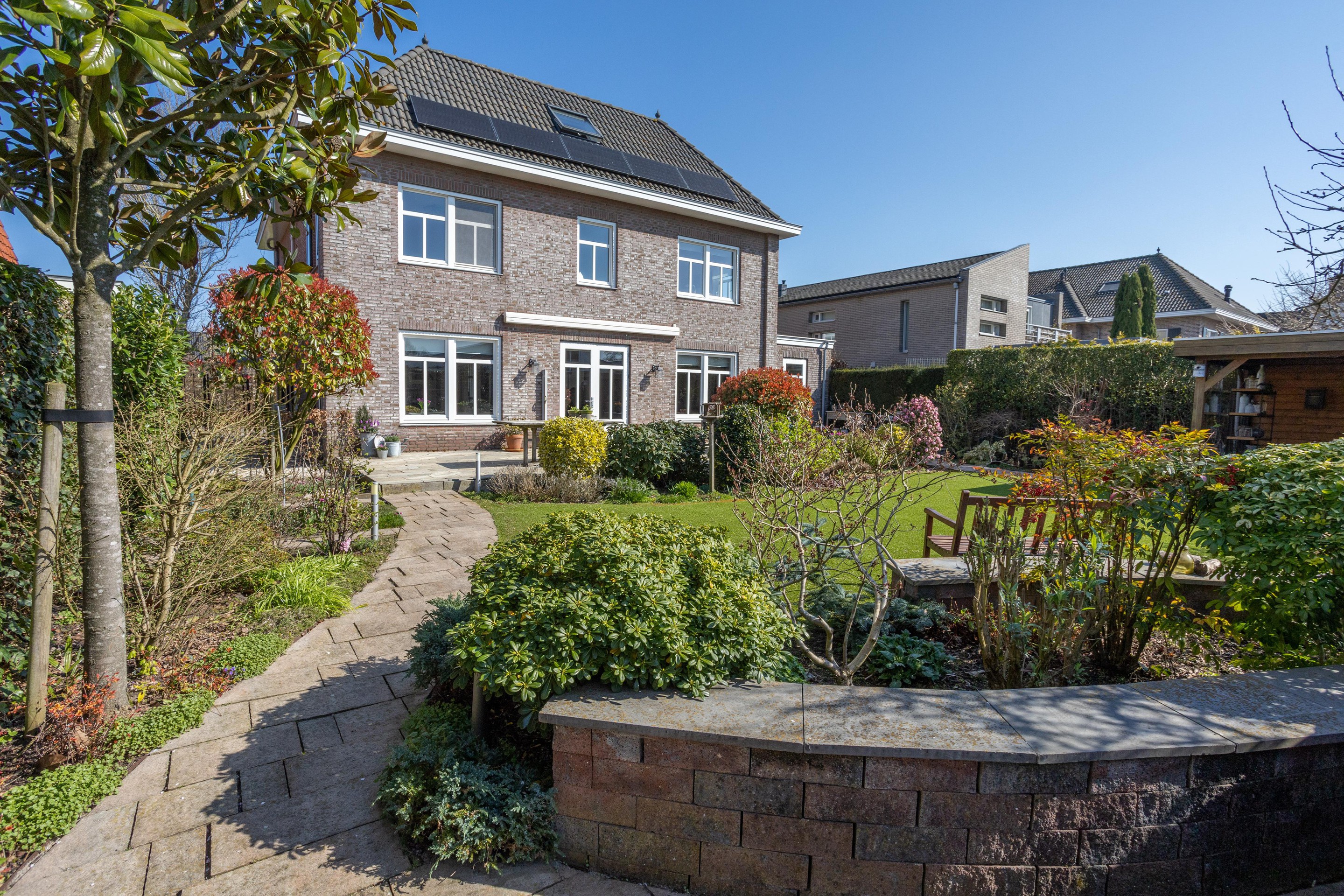 Naast de royale en ruime voortuin is er een is er een mooi aangelegde achtertuin met een overkapping. Heerlijk vrij en zonnig gelegen (zuiden). Er zijn meerdere terrassen aanwezig, u kunt kiezen voor zon en schaduw en gebruik maken van een beschermend liggend jacuzzi.