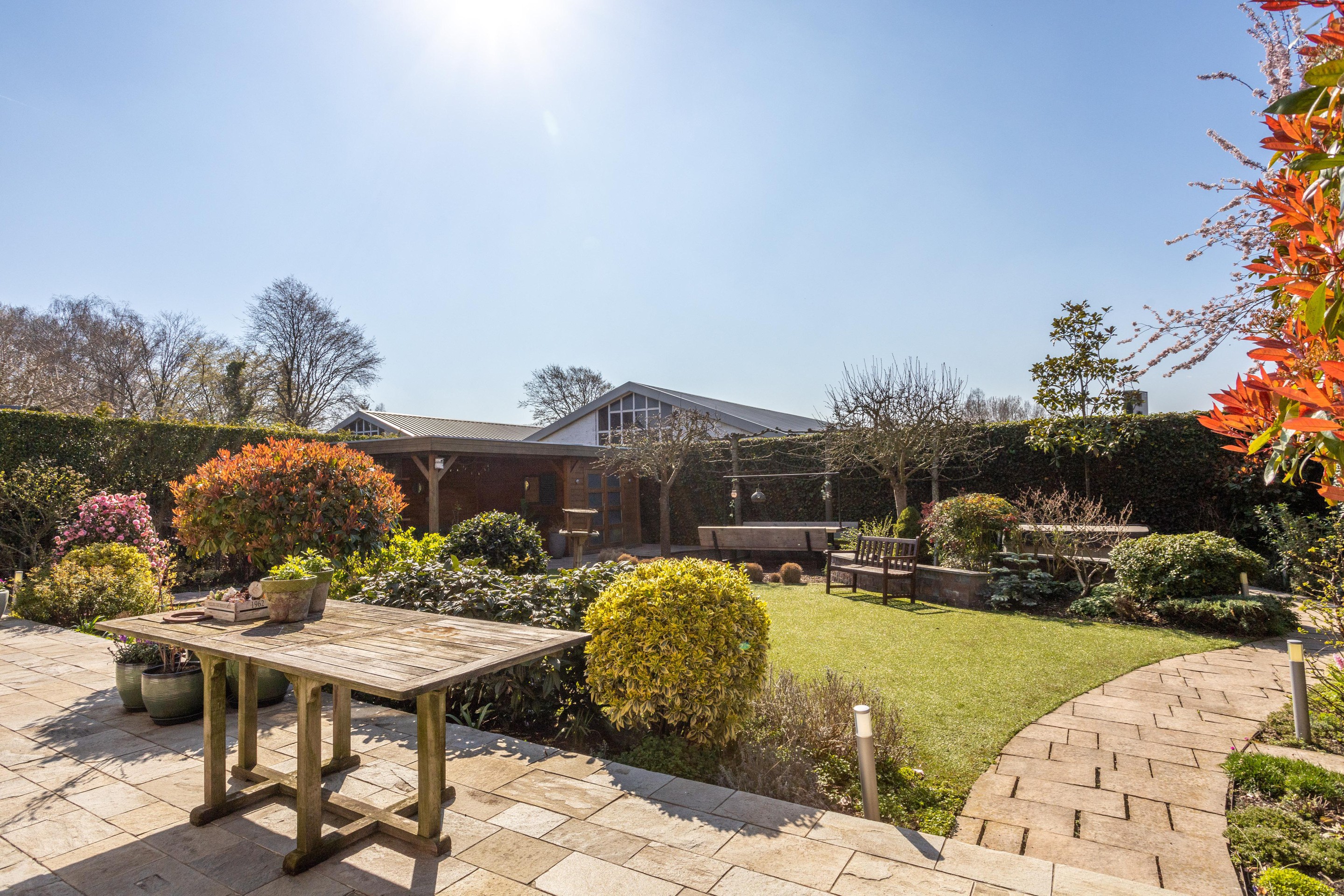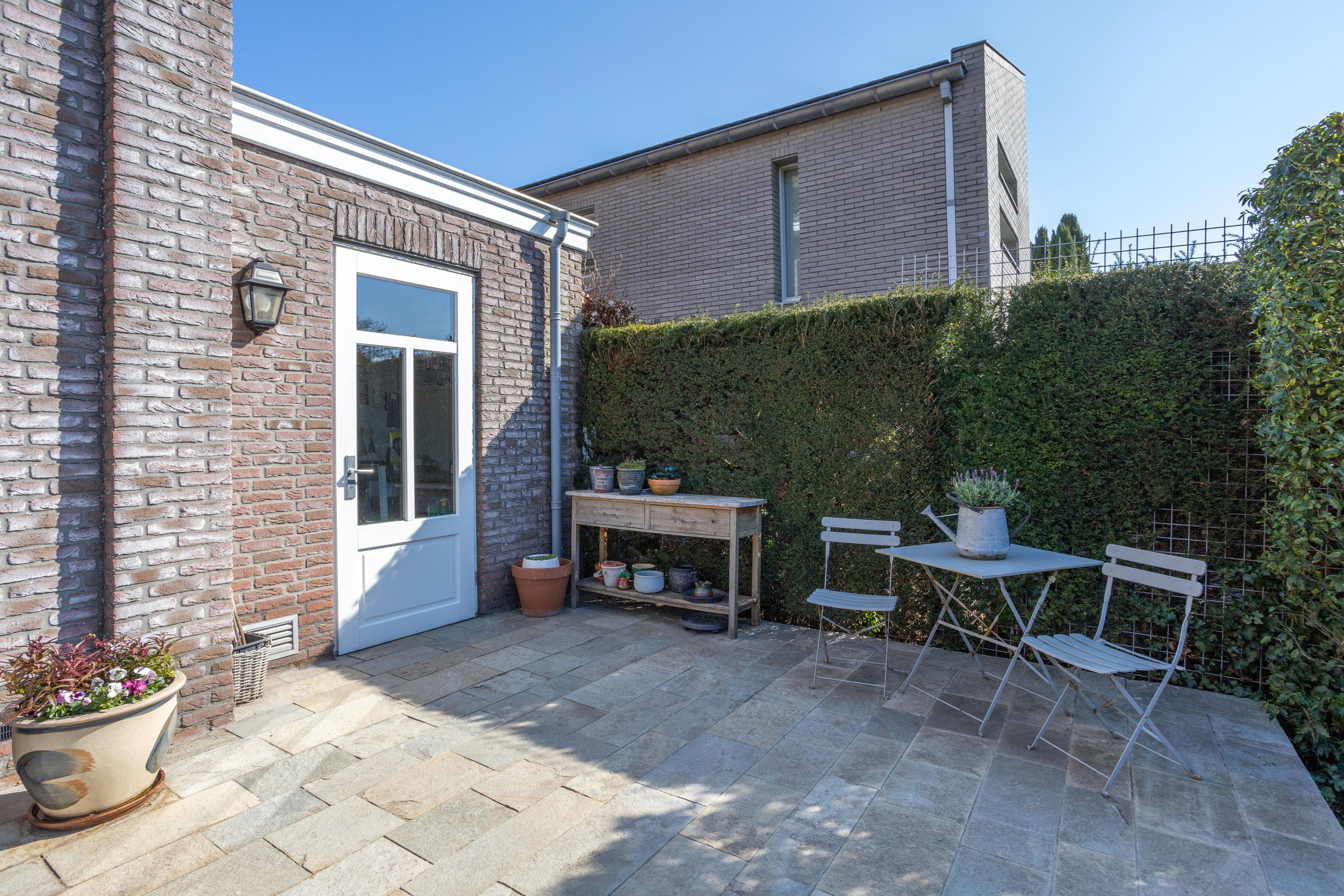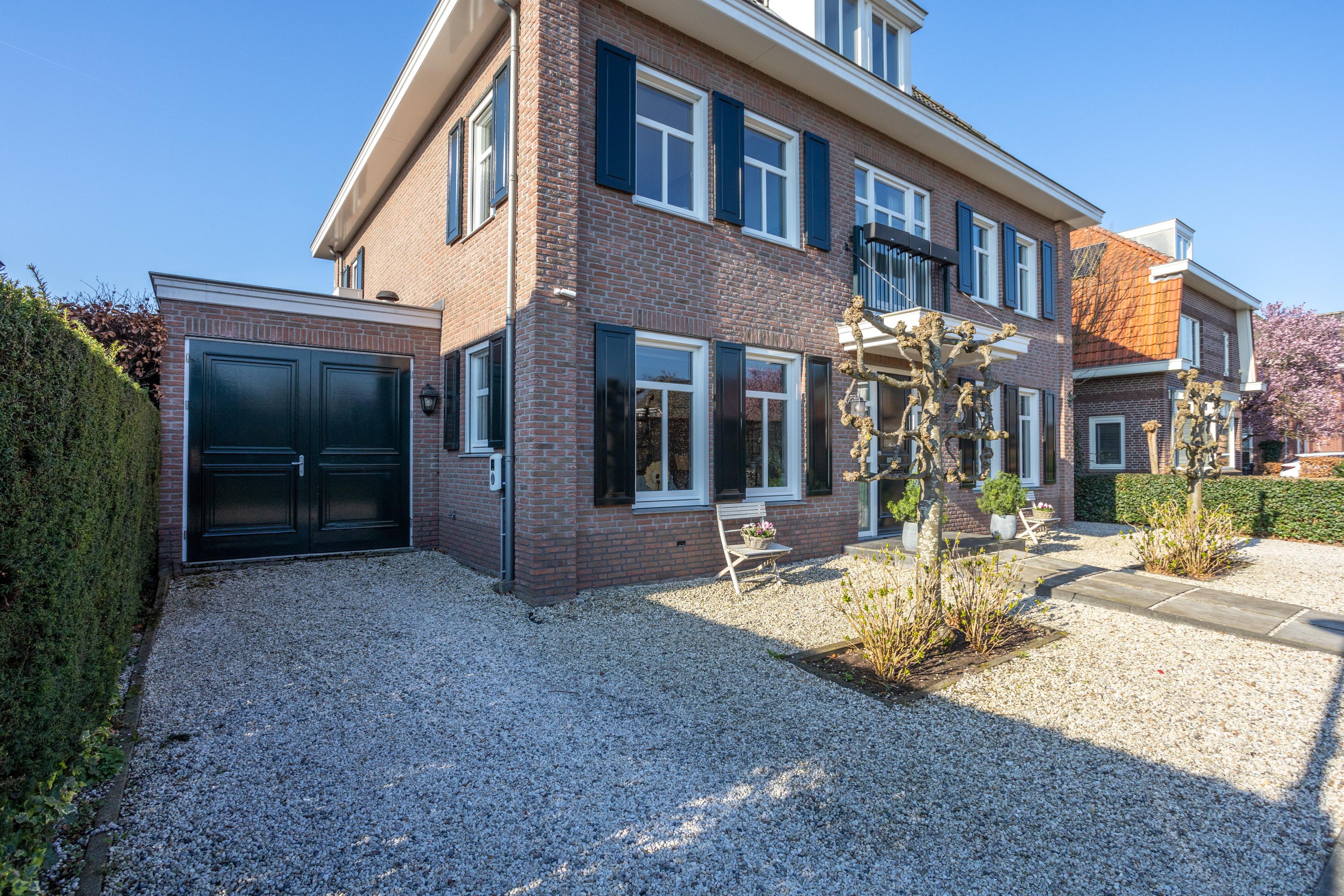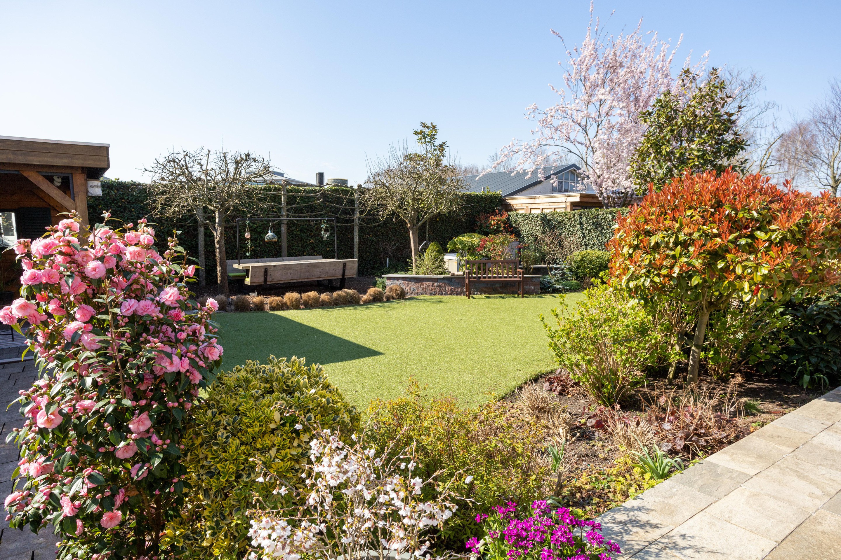 Naast de royale en ruime voortuin is er een is er een mooi aangelegde achtertuin met een overkapping. Heerlijk vrij en zonnig gelegen (zuiden). Er zijn meerdere terrassen aanwezig, u kunt kiezen voor zon en schaduw en gebruik maken van een beschermend liggend jacuzzi.
