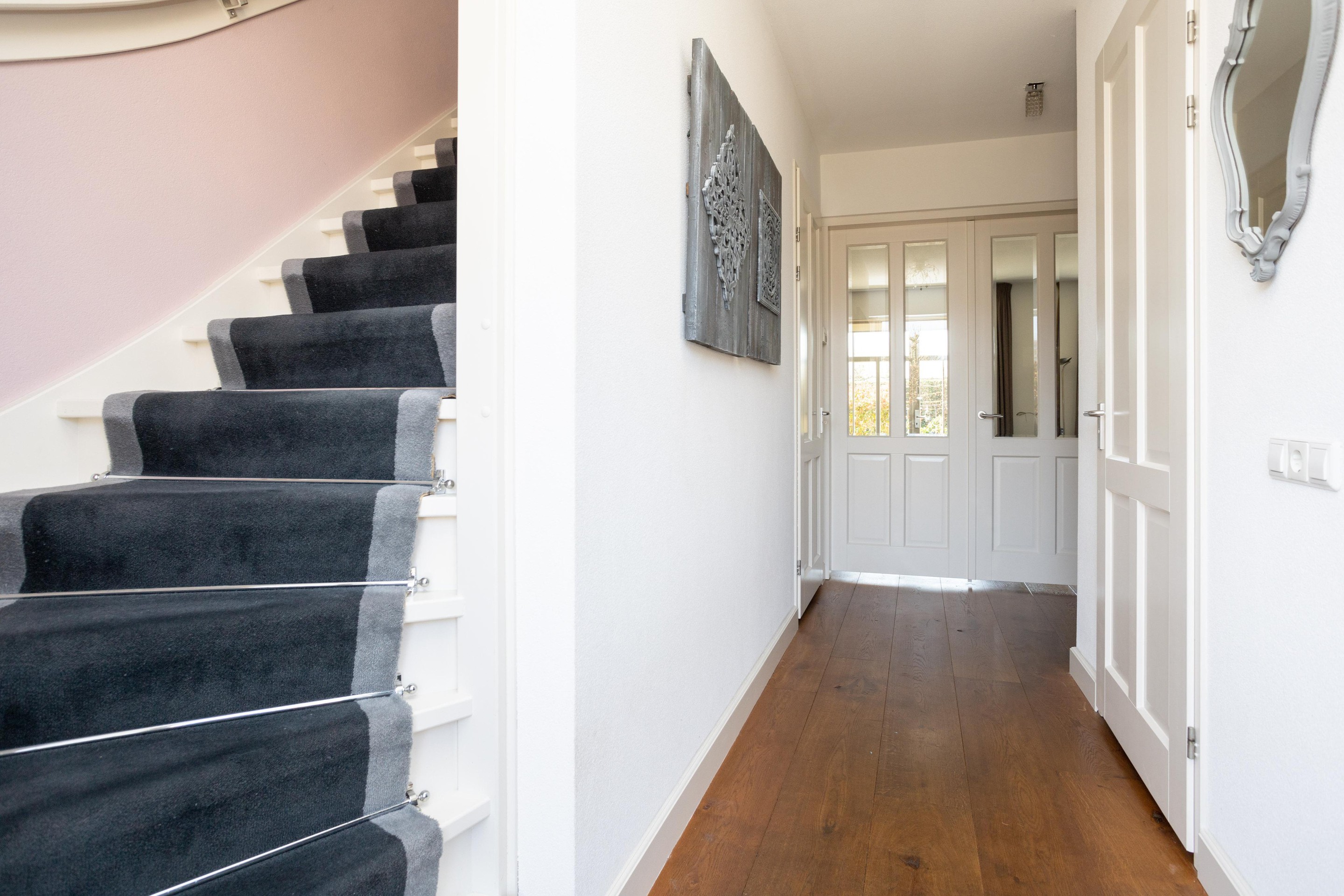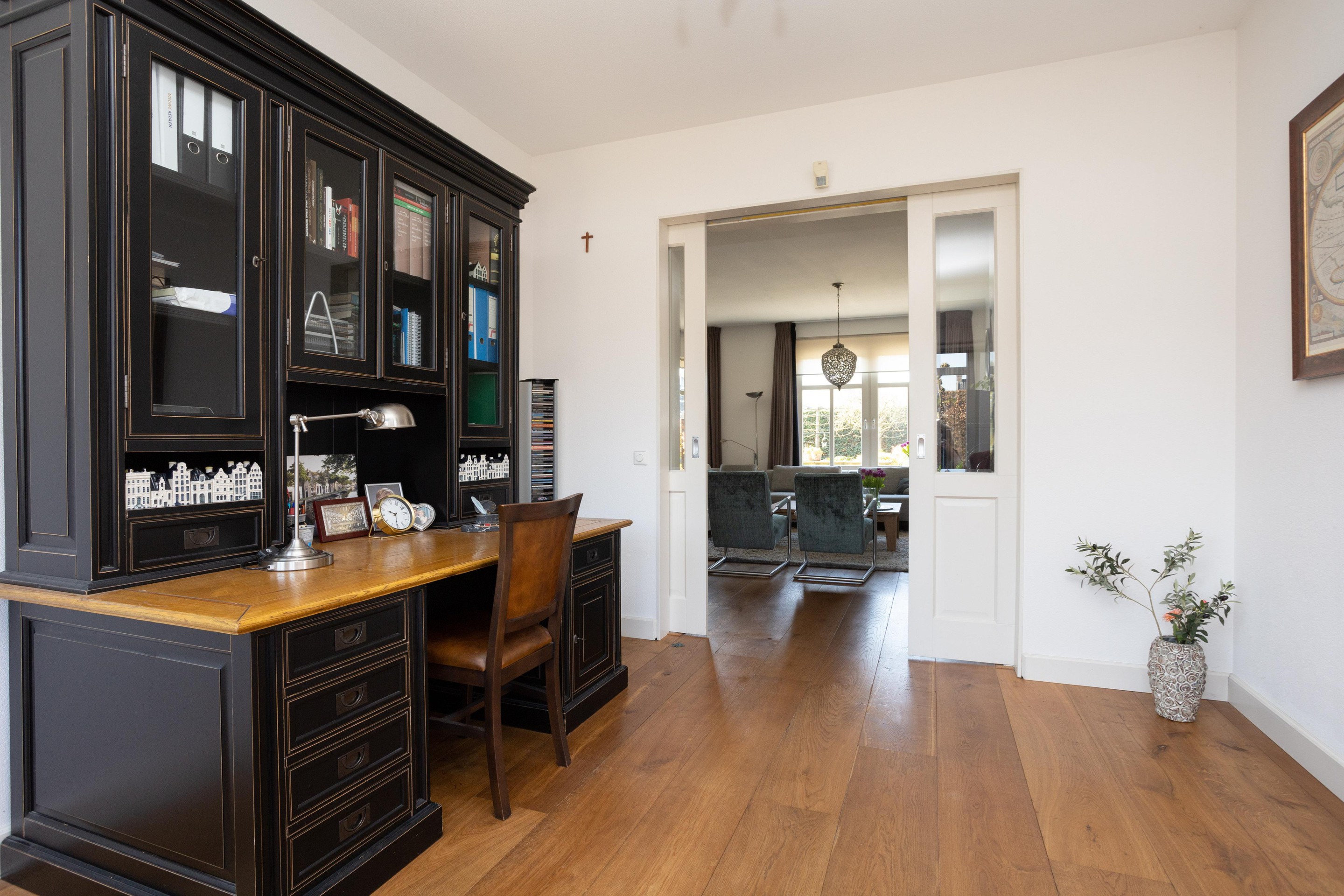 Ruime entree met prachtige trapopgang naar de 1e verdieping, toegang tot de kelder, meterkast, toilet met urinoir en toegang tot de ruime woonkamer. De woonkamer is over de gehele breedte van de woning en biedt prachtig zicht over de achtertuin. Vanuit de woonkamer is er directe toegang tot een mooie werkkamer/tv-kamer. Op de vloer prachtig eiken en de sfeervolle gashaard maakt het geheel af.