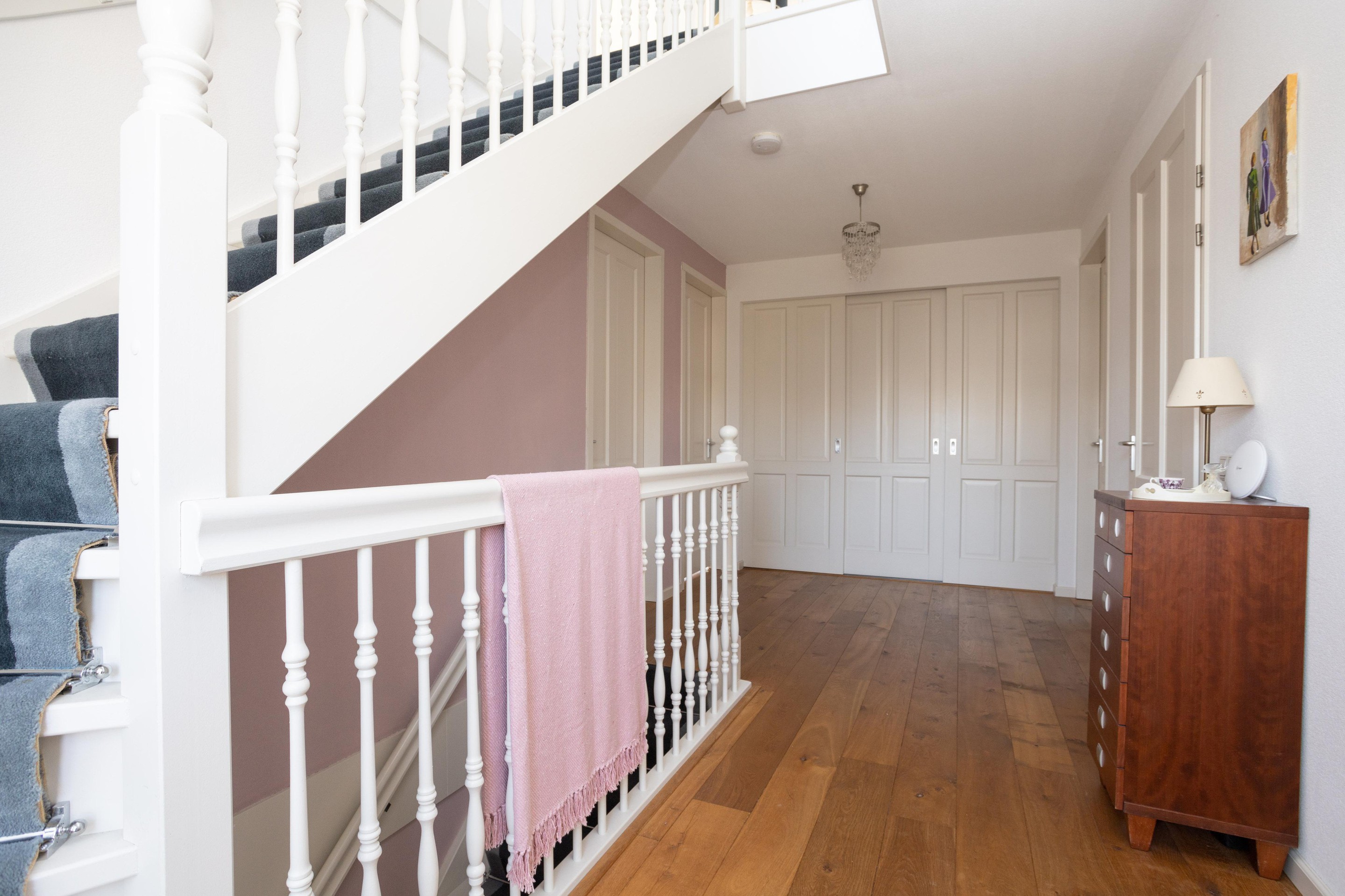 Een ruime, lichte overloop met 3 grote slaapkamers en 2 badkamers. De slaapkamer aan de achterzijde is bijzonder fraai en heeft naast airconditioning een grote inloopkast en een badkamer ensuite met douche en een dubbele wastafel, ook is er vloerverwarming aanwezig. De 2e badkamer aan de voorzijde is voorzien van een ligbad, royale douche en een dubbele wastafel en ook hier is vloerverwarming aanwezig. Tot slot is er nog een apart toilet met fonteintje met urinoir.