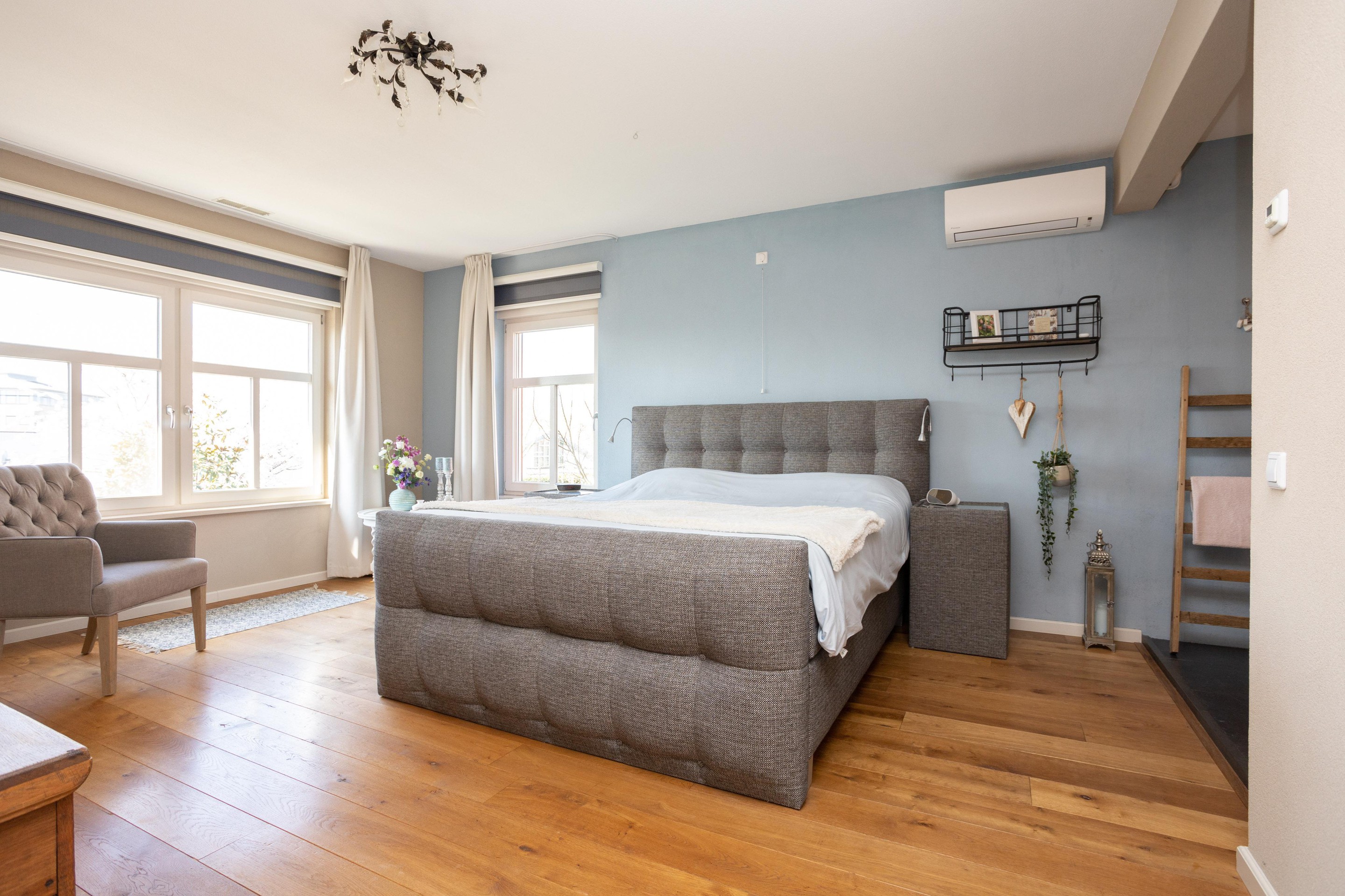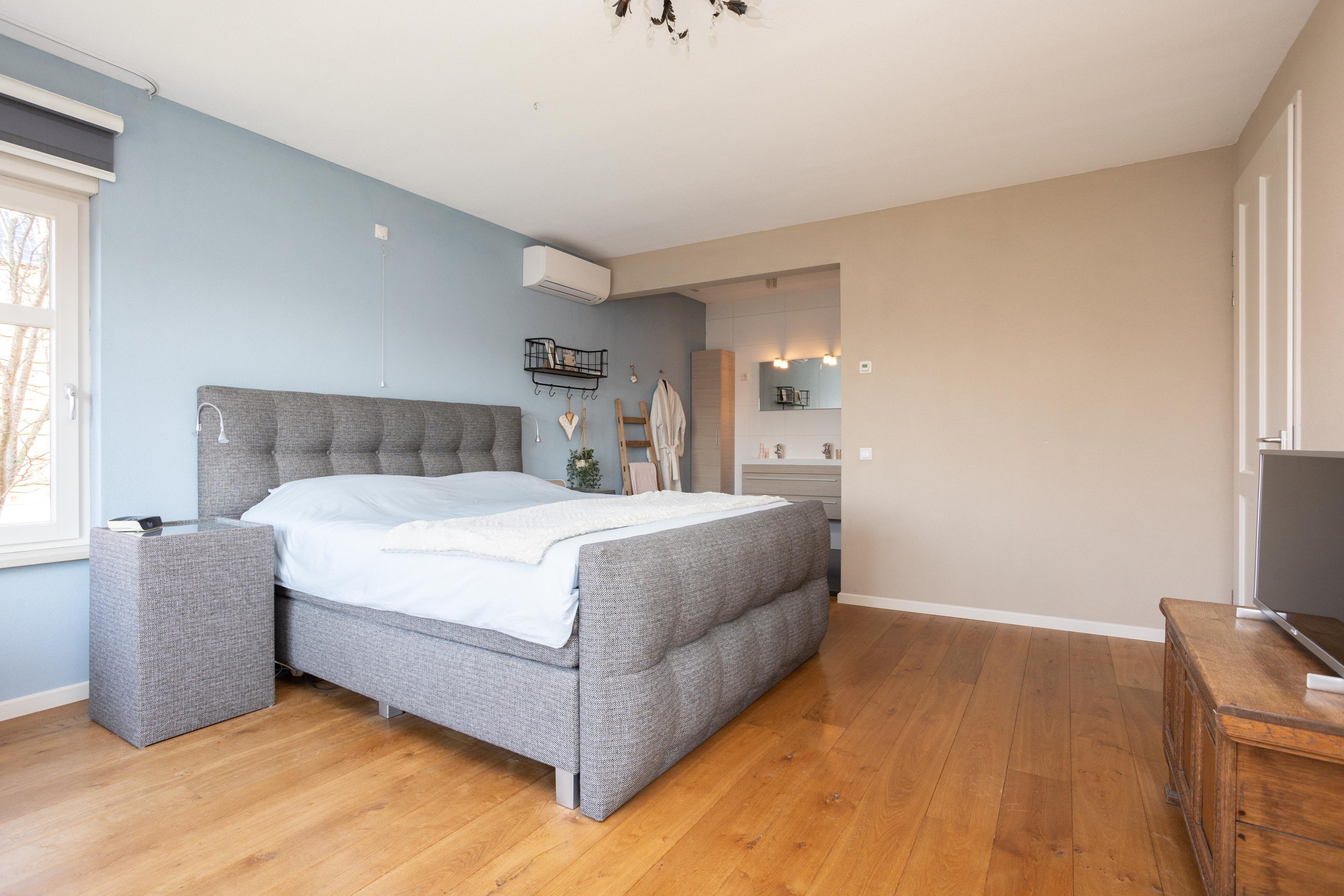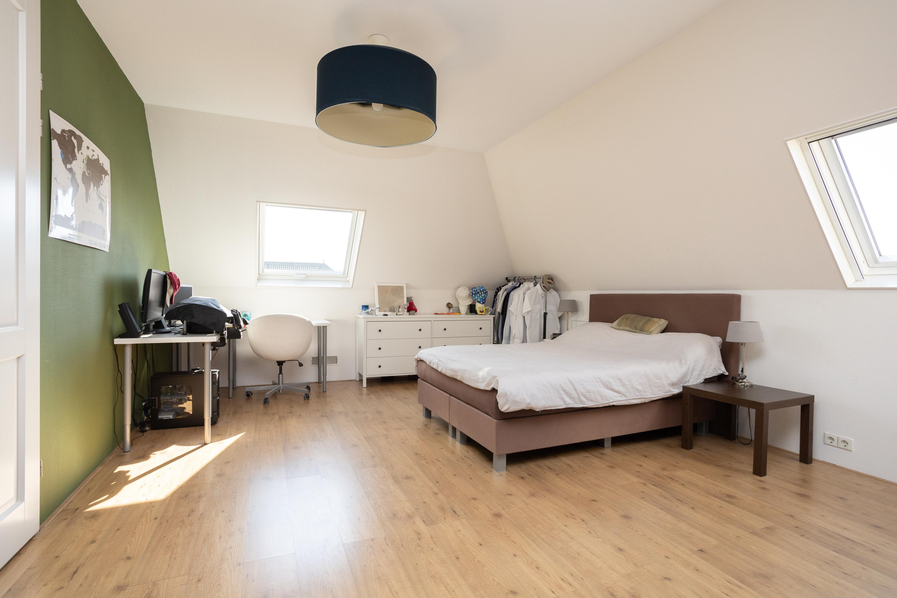 Wat is dit een prachtige verdieping om te verblijven. Er zijn 2 slaapkamers en een technische ruimte. De slaapkamer aan de achterzijde is over de gehele breedte en is voorzien van airconditioning. In de technische ruimte vinden we de opstelling van de luchtverwarming (2005), luchtbevochtiging en de warmtepomp e-boiler (160 liter) uit 2024. Door de luchtverwarming heeft het gehele huis en de garage altijd een aangename temperatuur. Het systeem is voorzien van topcooling waardoor bij warme temperaturen de temperatuur in het huis verlaagd kan worden.
