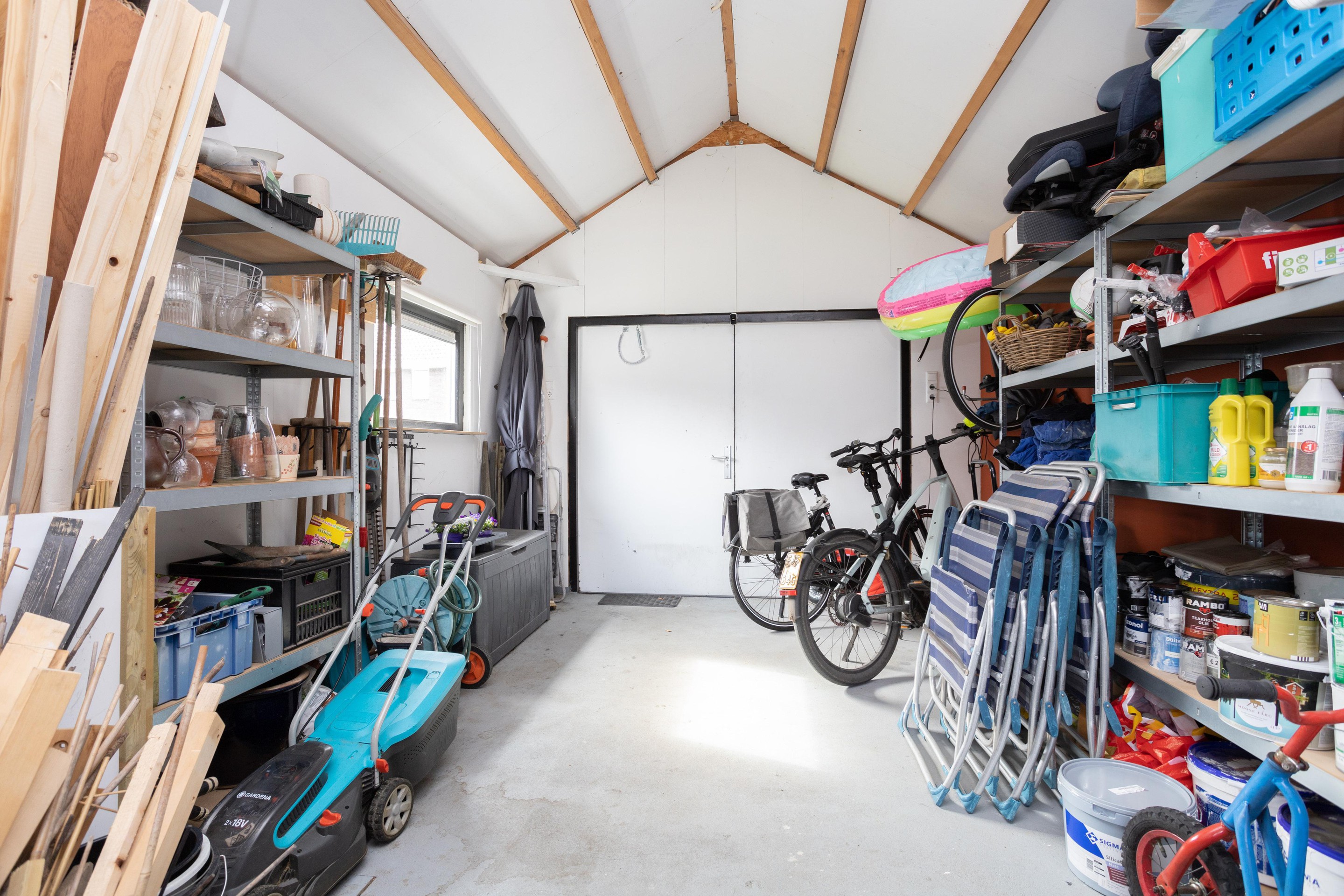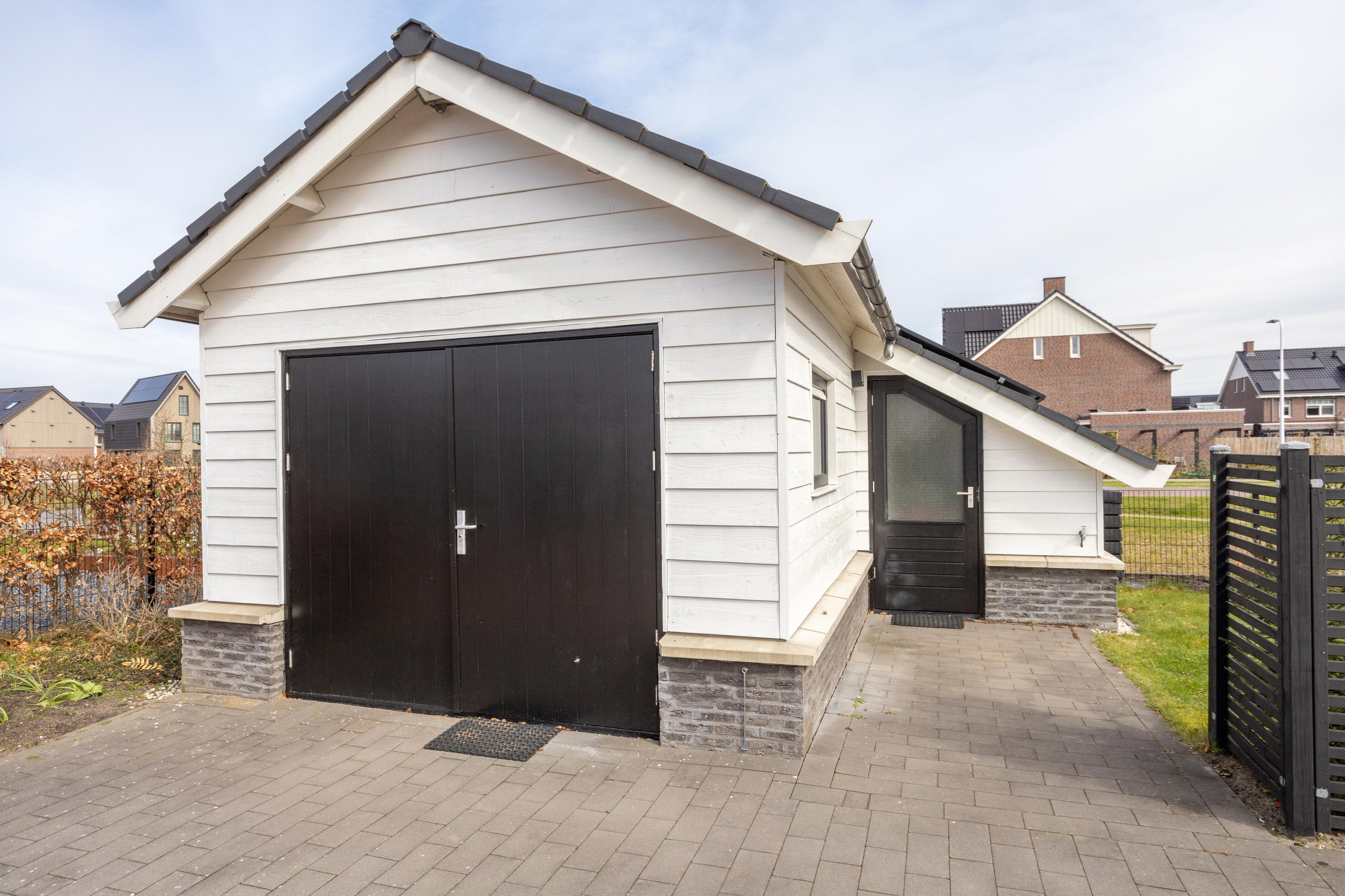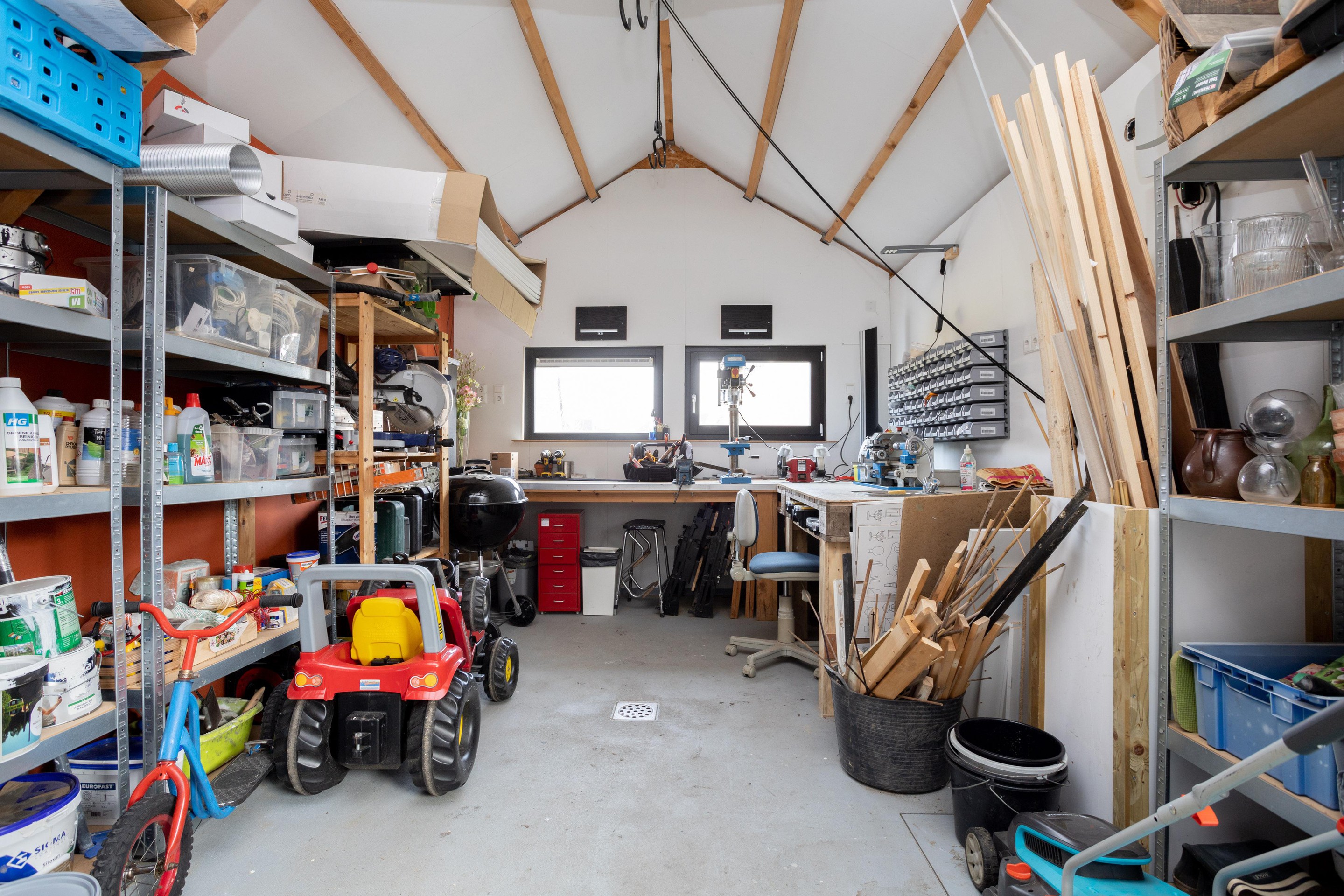 De royale garage annex hobby- of opslagruimte van 7 bij 4 meter is onderheid en voorzien van een wateraansluiting met wasbak en spoelput in de vloer. De garage heeft een aangebouwde schuur met eigen ingang, bedoeld voor de bijwoning. Hier bevindt zich ook de pompinstallatie, die water uit de regenton of sloot trekt, met een eigen buitenkraan.