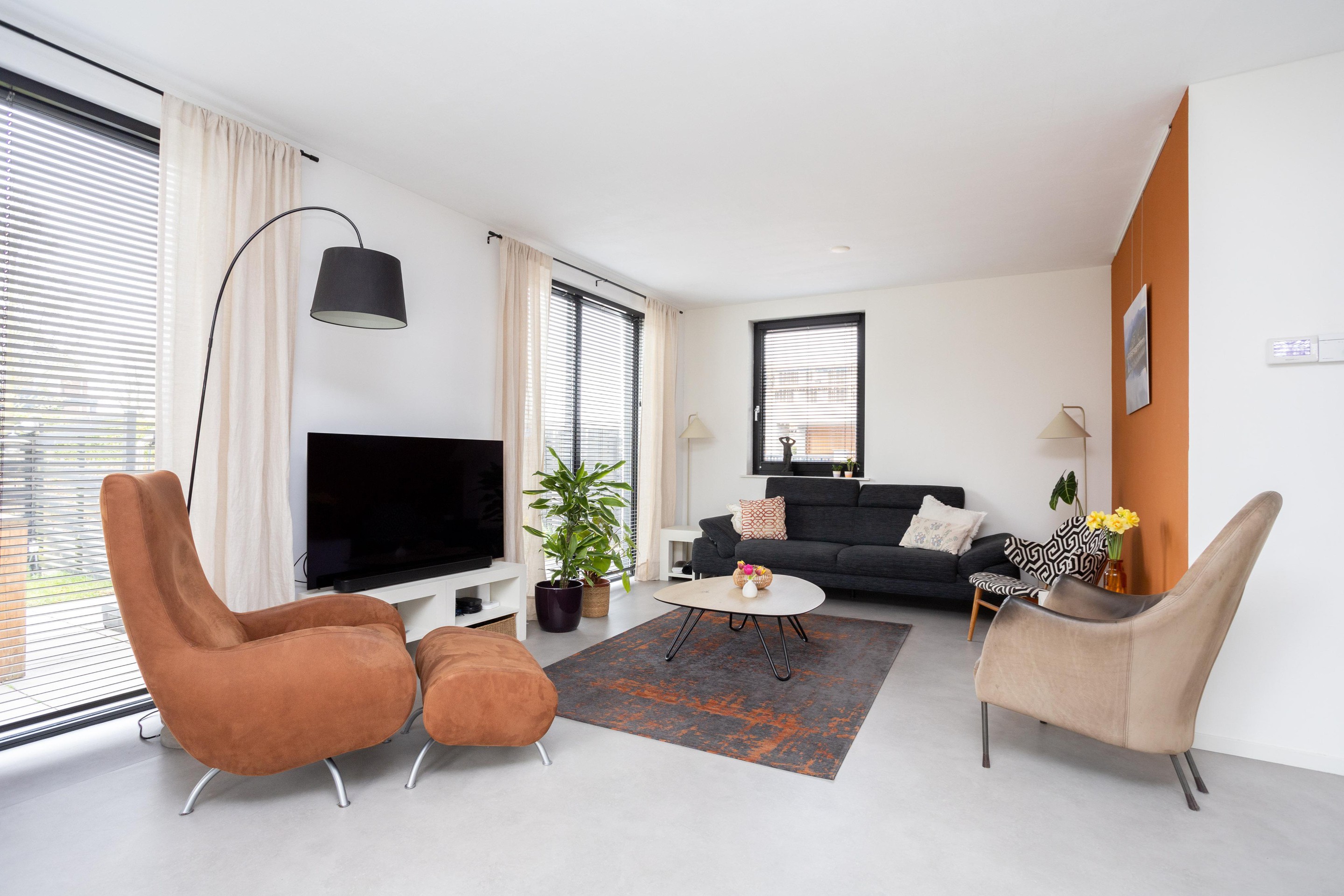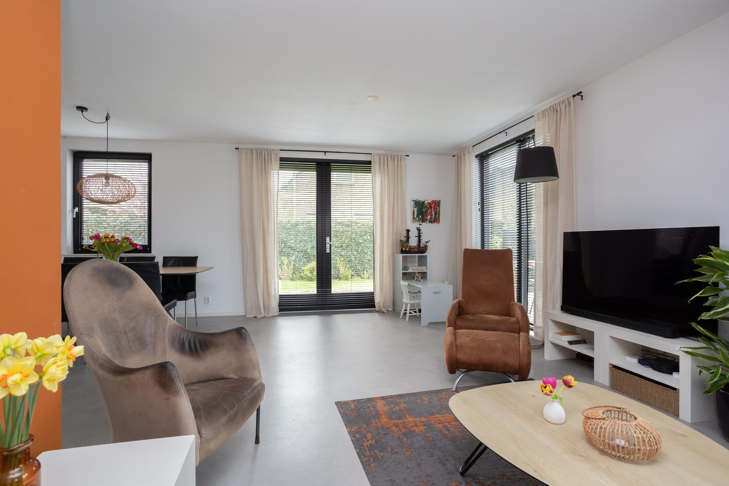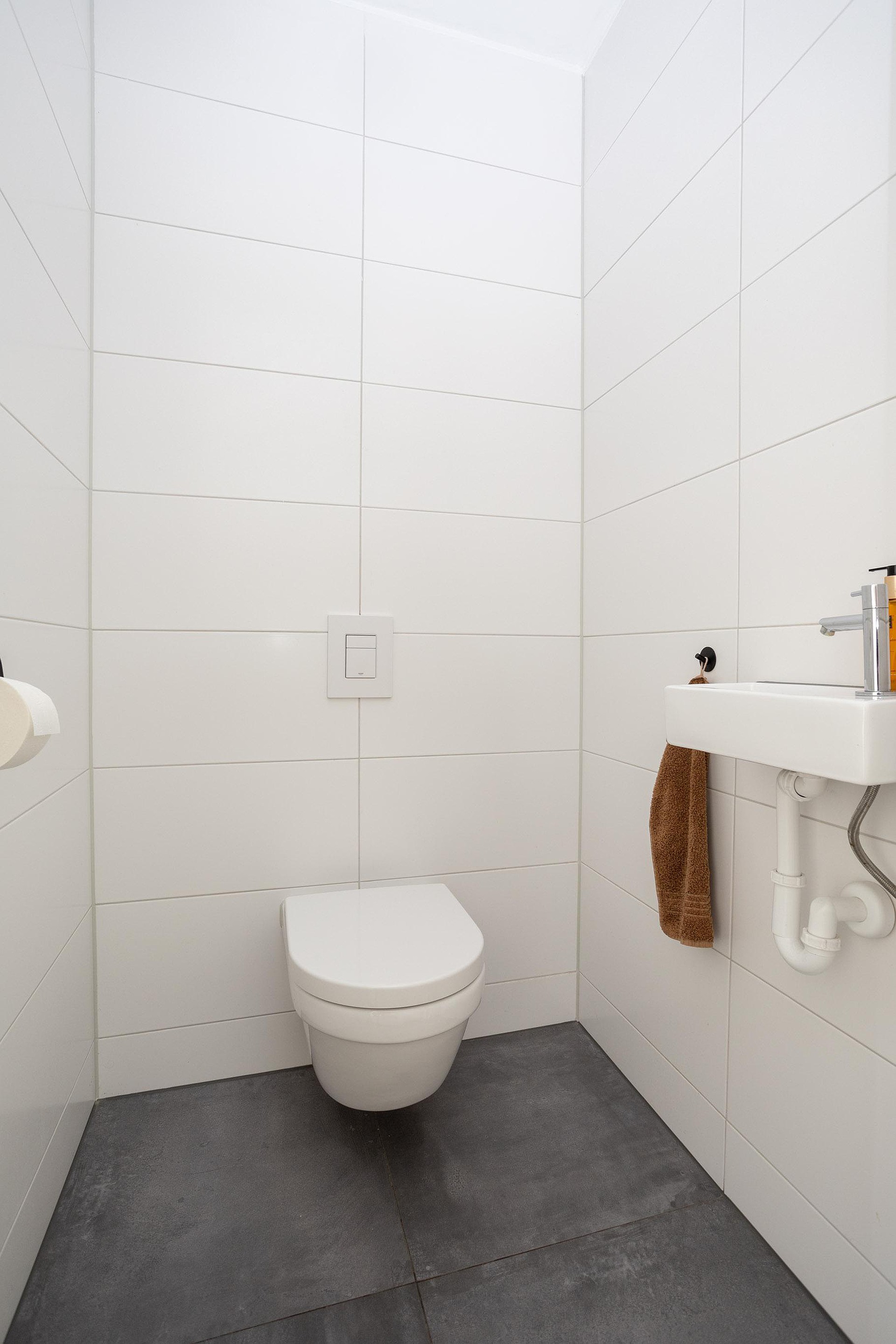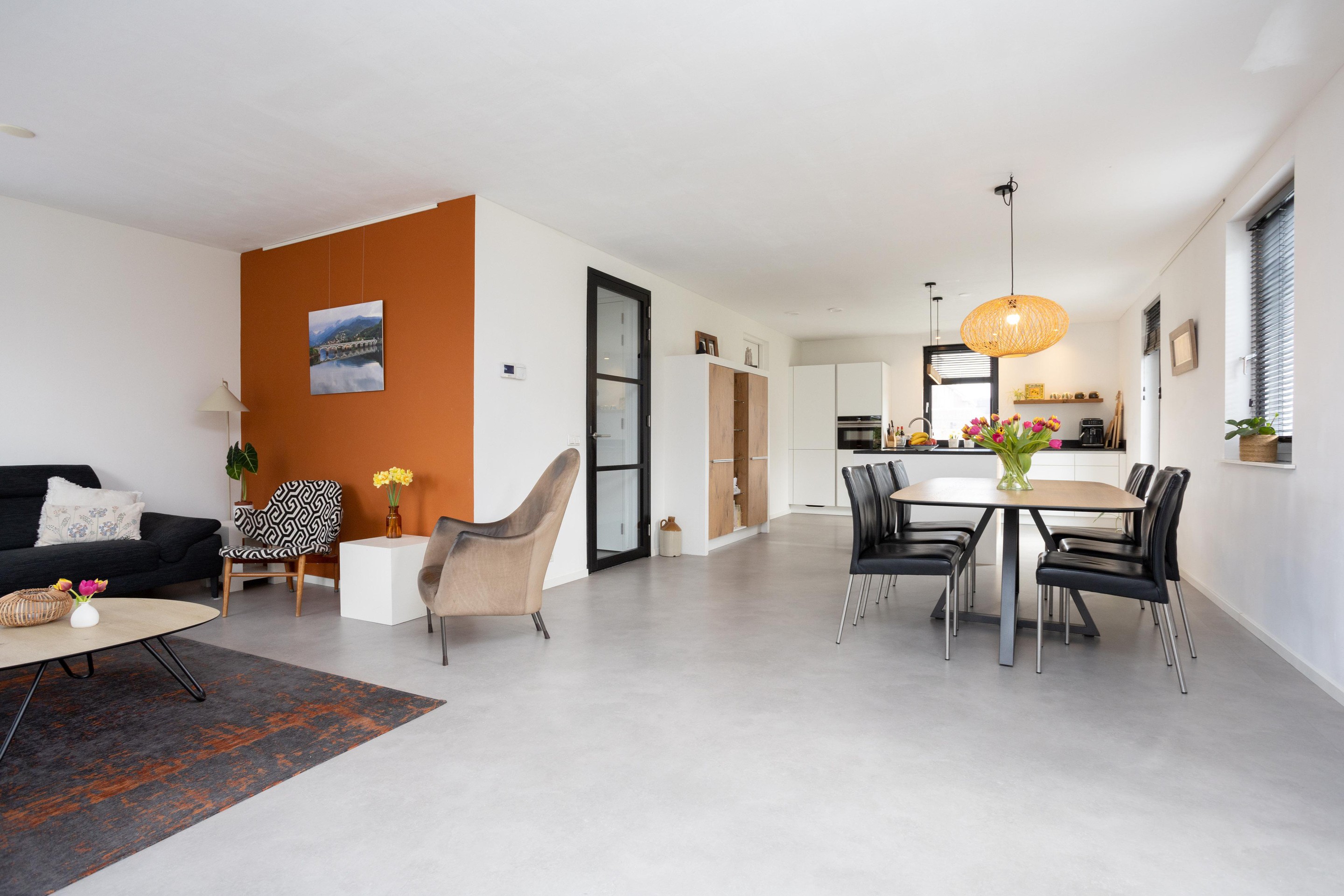 Entree, ruime hal met meterkast, toilet met fonteintje en deur naar de riante living. Bij binnenkomst vallen direct de prachtige raampartijen op; heerlijk al dat licht. Zowel de vloer als wanden zijn strak afgewerkt. En fijn dat er vloerverwarming aanwezig is, die met aparte thermostaten per ruimte te regelen is.