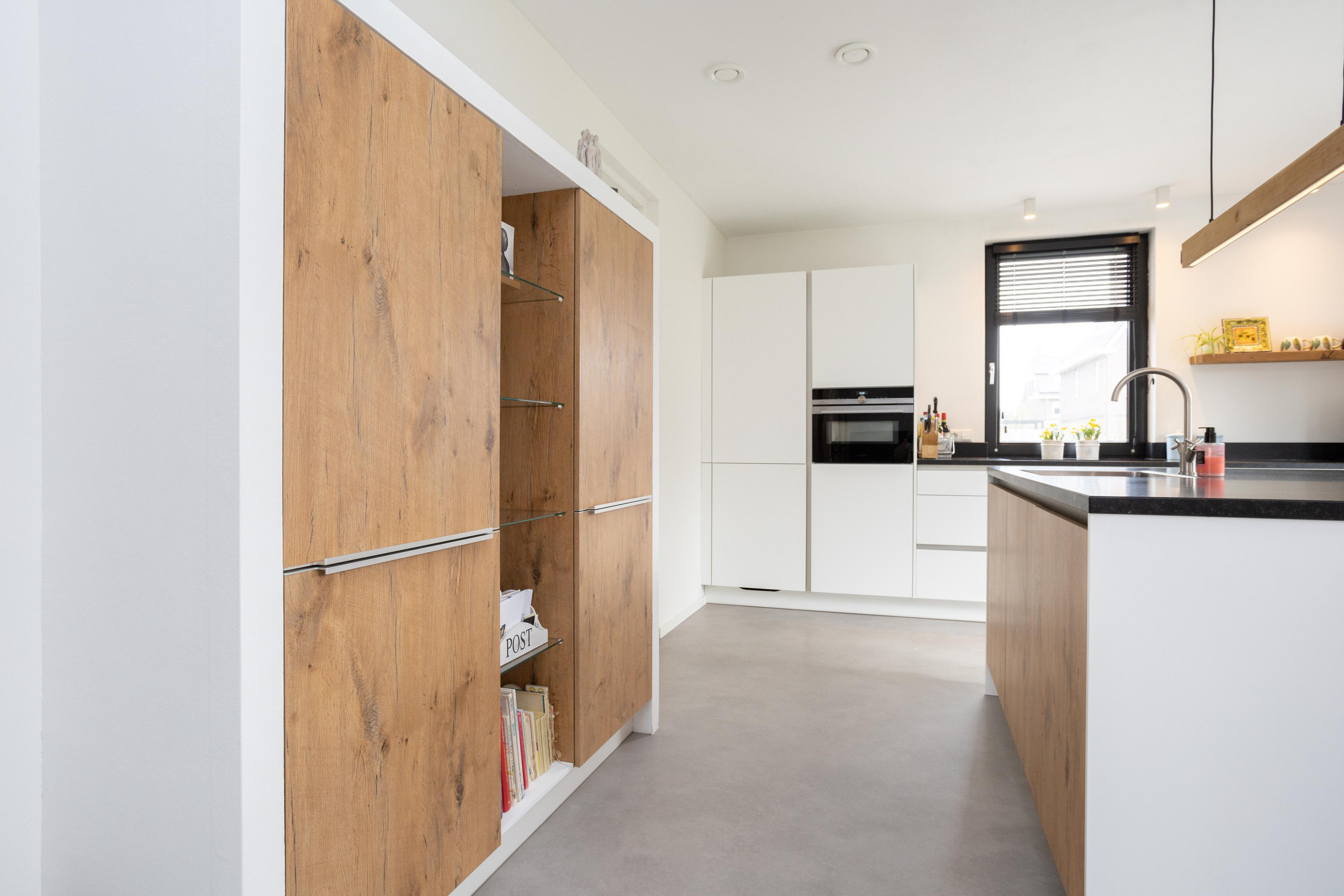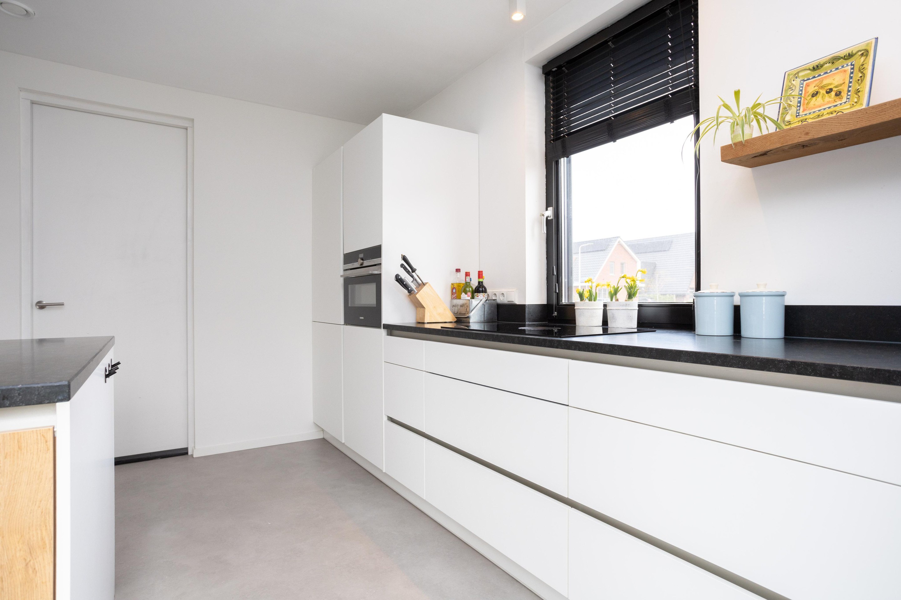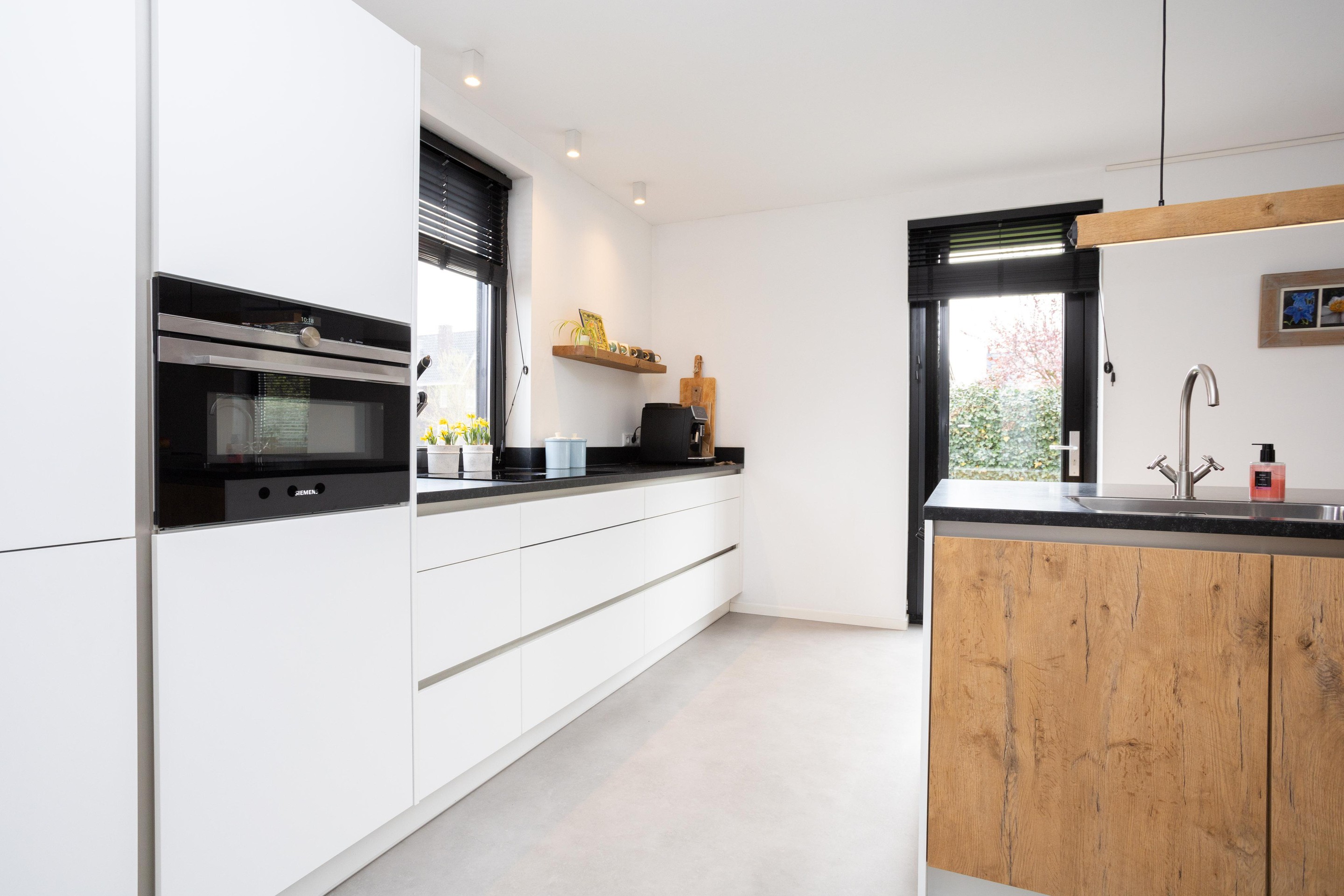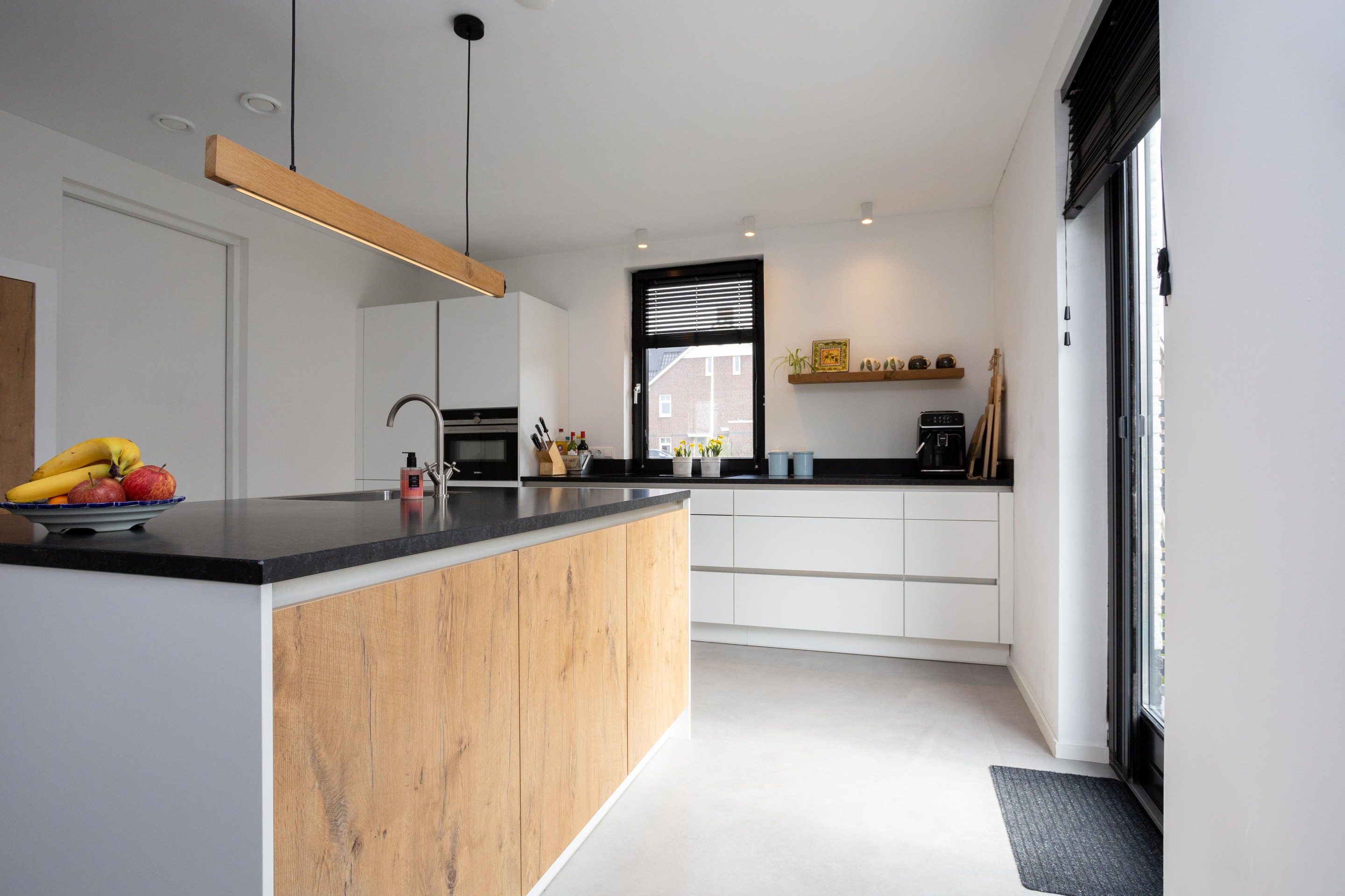 De luxe keuken is voorzien van een spoeleiland en een Bora inductie kookplaat met afzuiging direct onder het raam. Ook zijn een vaatwasser, combimagnetron en een koelkast met vriezer aanwezig. Het geheel is afgewerkt met een granieten werkblad. Vanuit de keuken is er toegang tot de bijkeuken. Hier is plaats voor een wasmachine en droger en extra opbergruimte. Ook vind je hier de binnenunit van de wamtepomp en buffervaten. De buitenunit hangt hier pal achter aan de gevel.