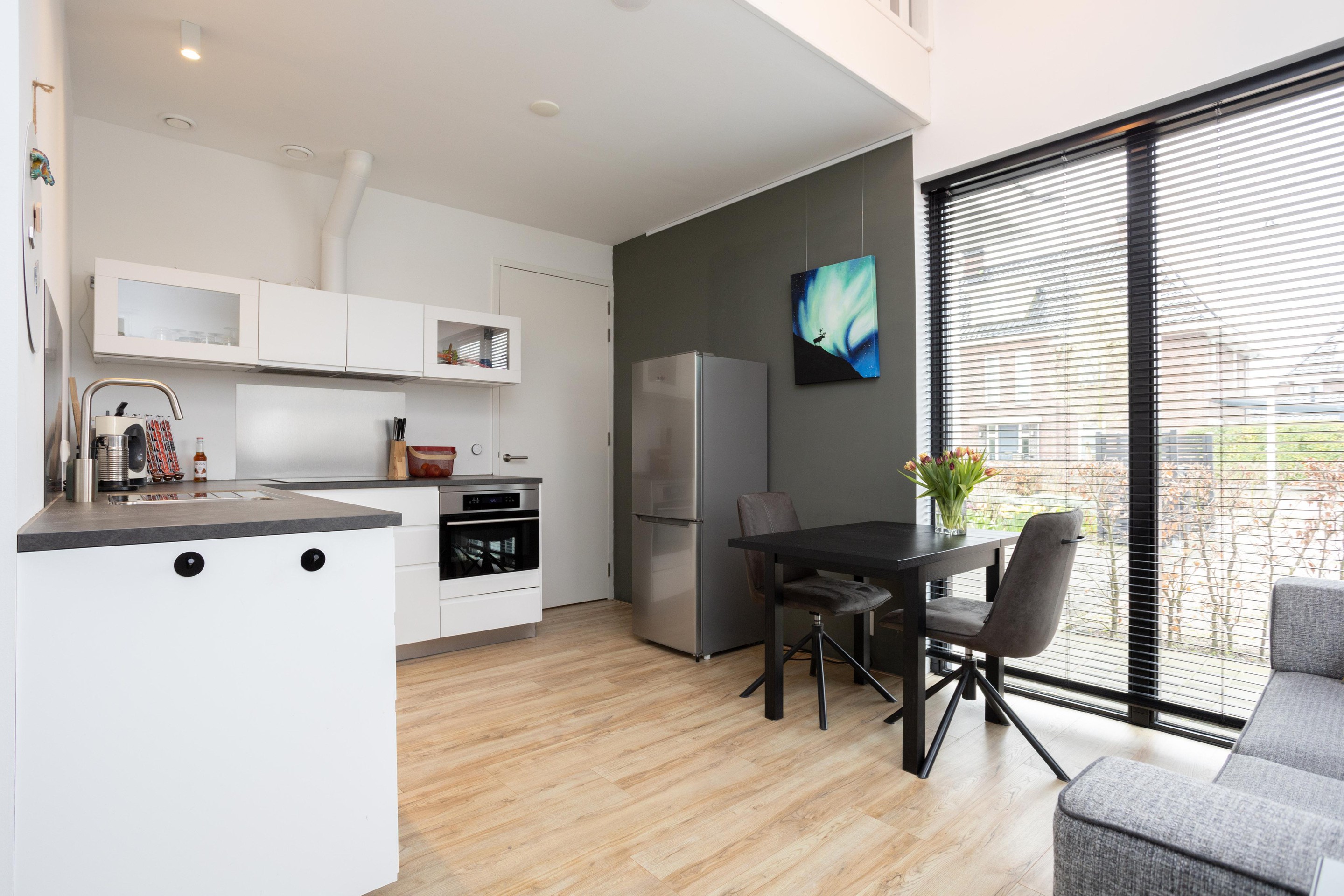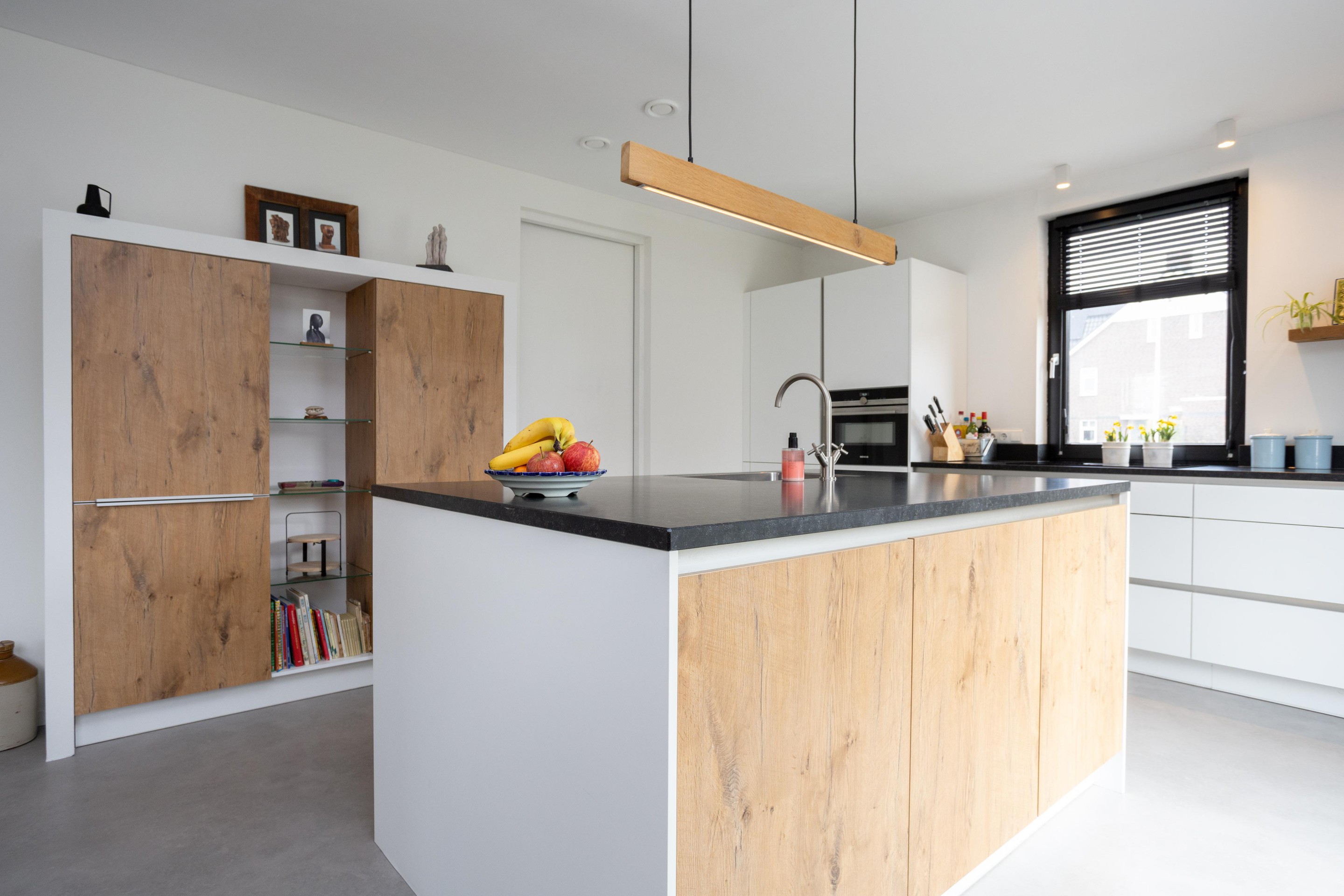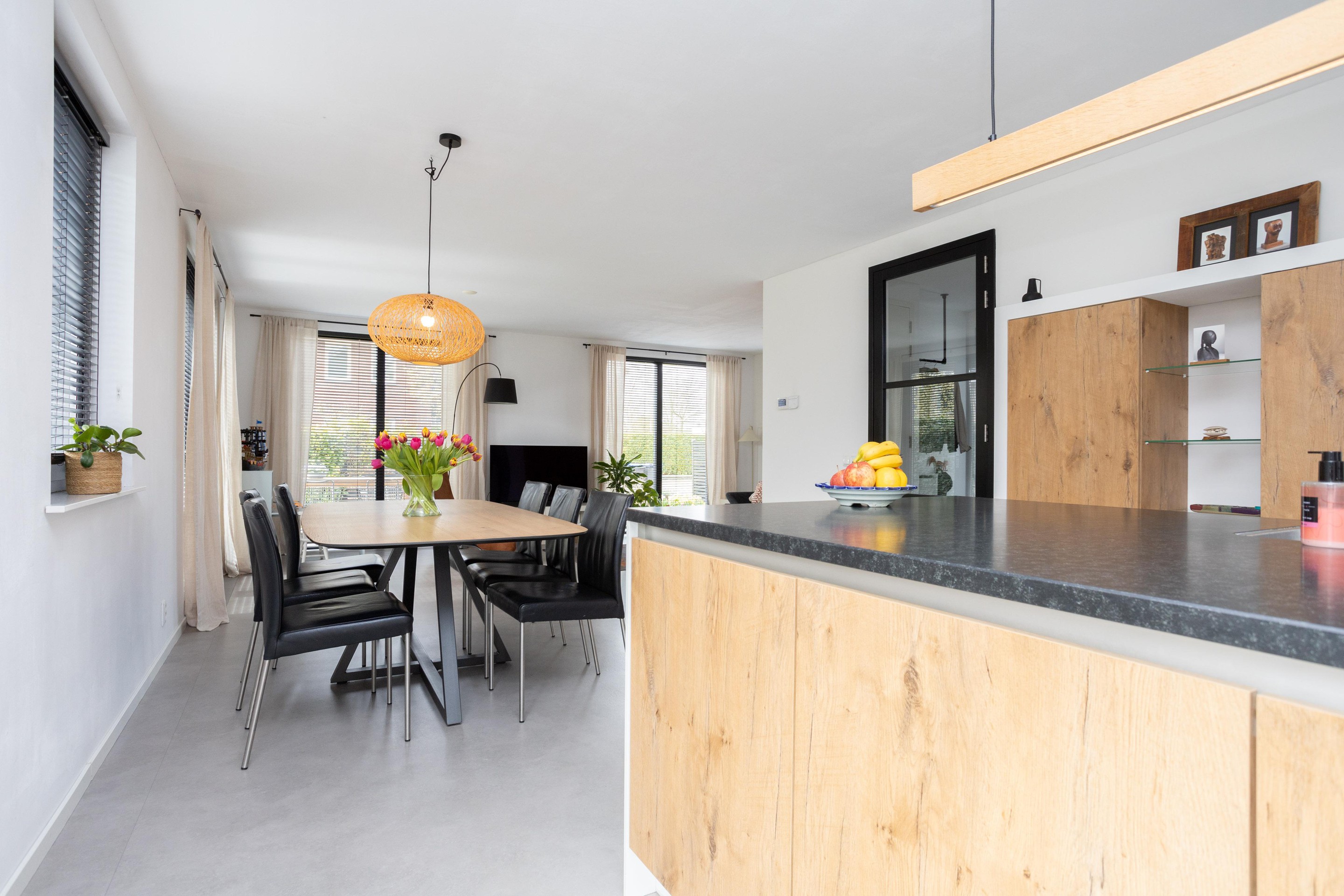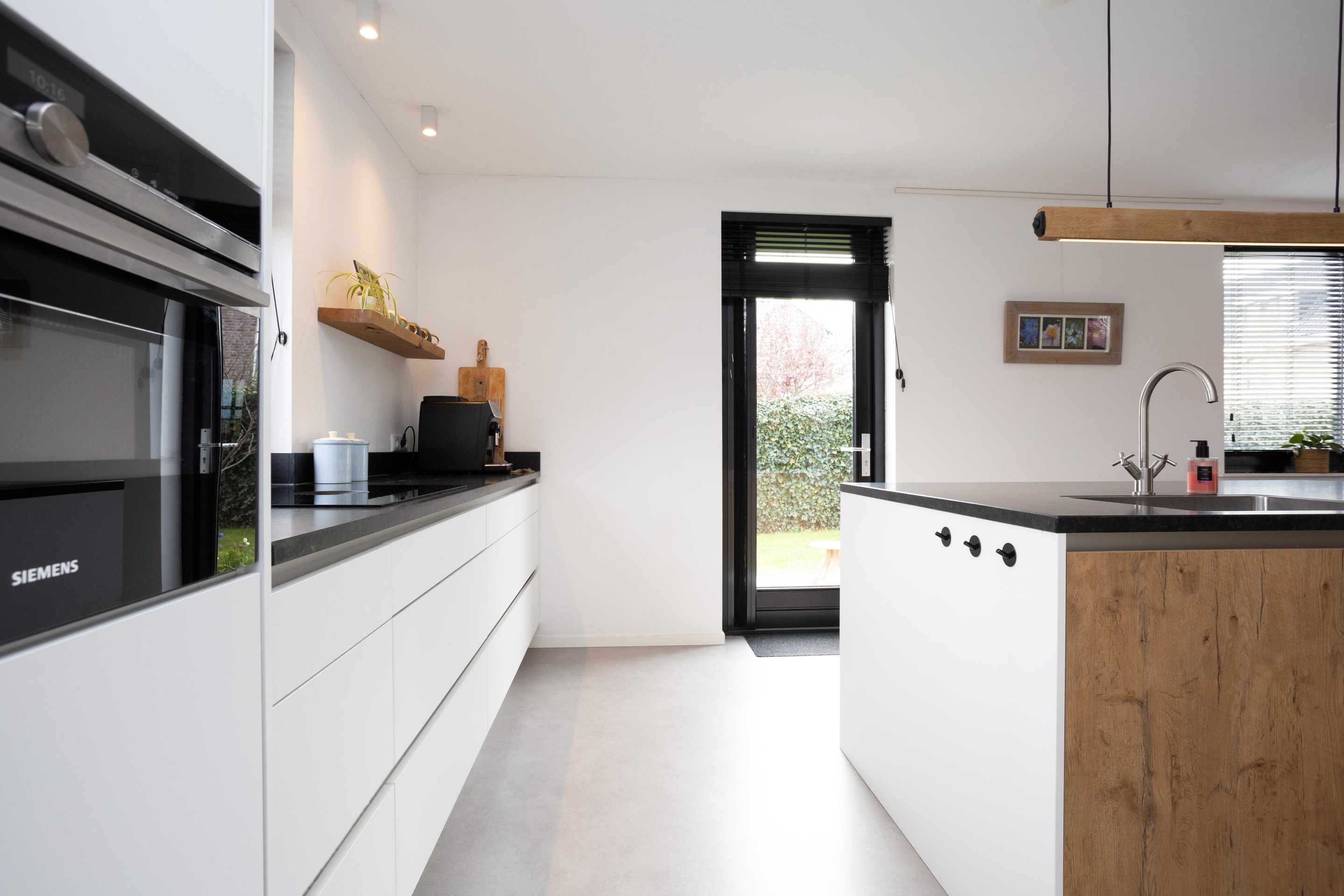 De luxe keuken is voorzien van een spoeleiland en een Bora inductie kookplaat met afzuiging direct onder het raam. Ook zijn een vaatwasser, combimagnetron en een koelkast met vriezer aanwezig. Het geheel is afgewerkt met een granieten werkblad. Vanuit de keuken is er toegang tot de bijkeuken. Hier is plaats voor een wasmachine en droger en extra opbergruimte. Ook vind je hier de binnenunit van de wamtepomp en buffervaten. De buitenunit hangt hier pal achter aan de gevel.