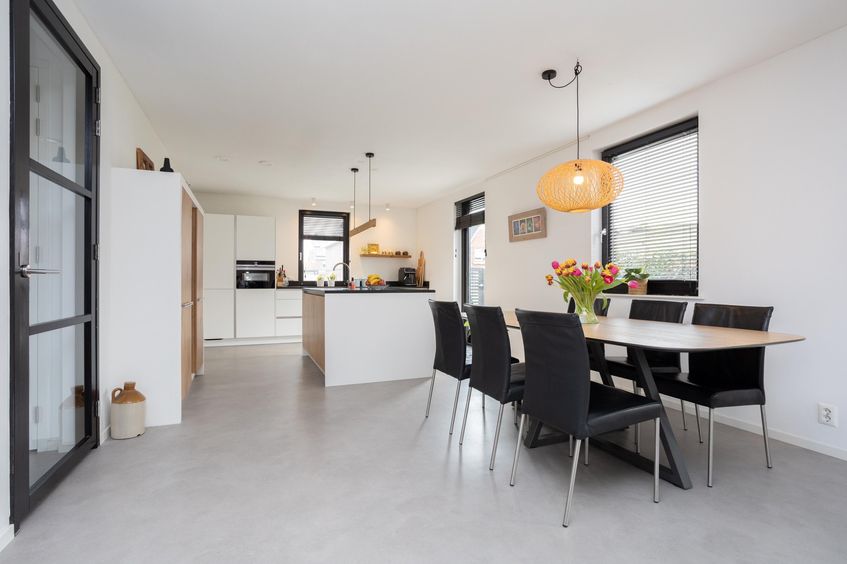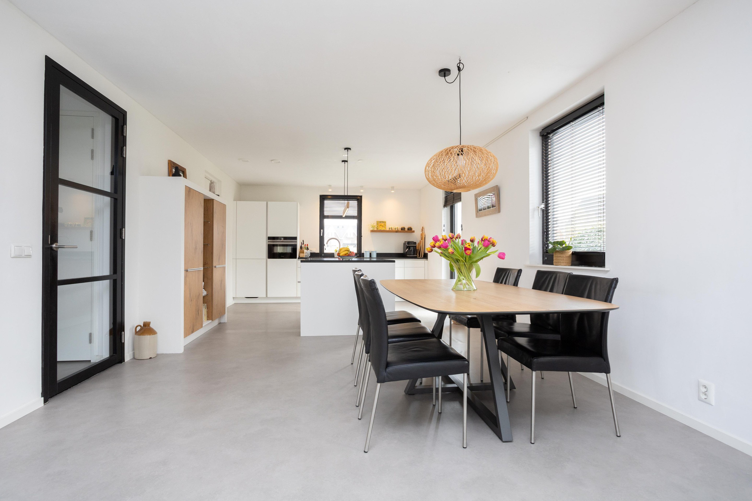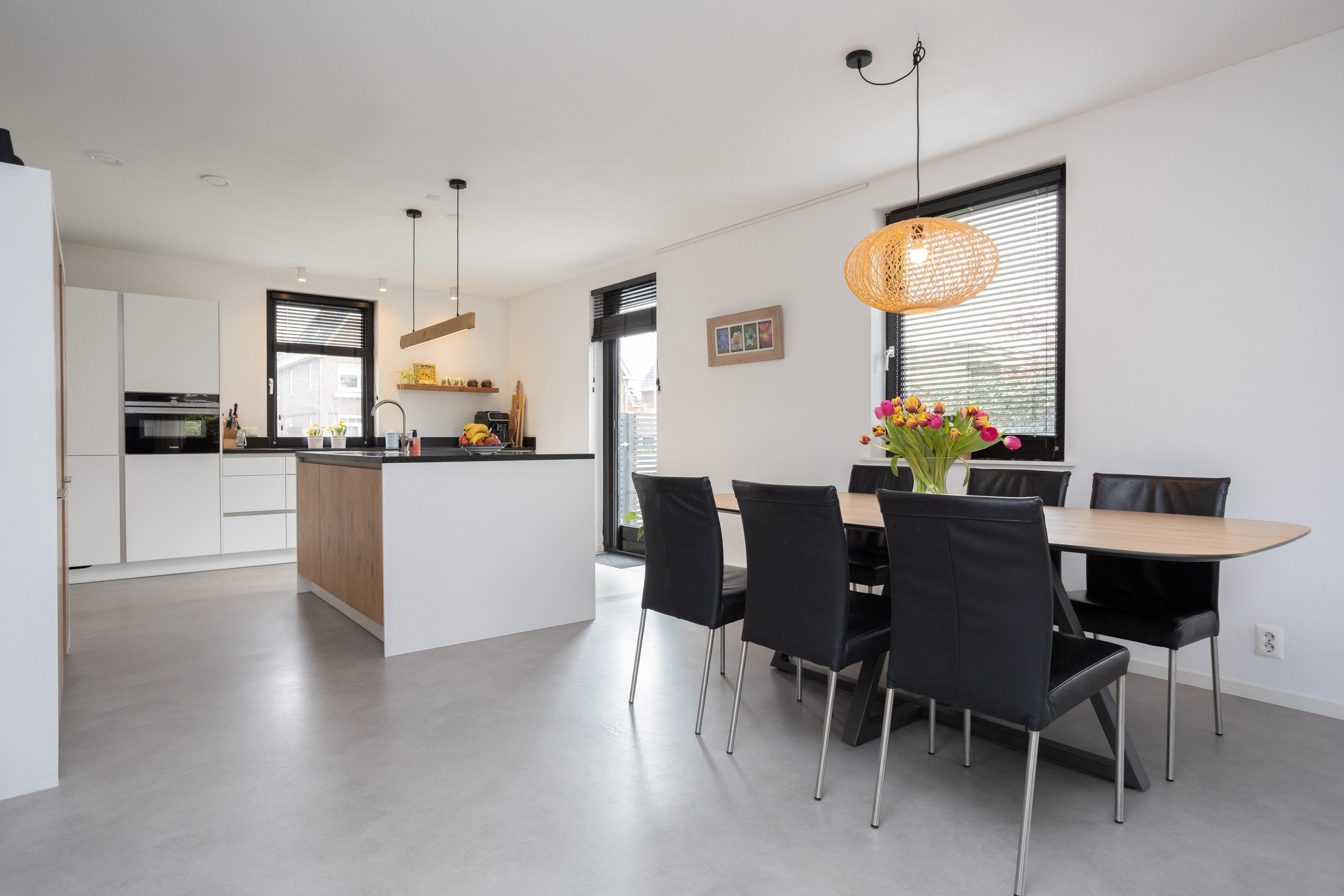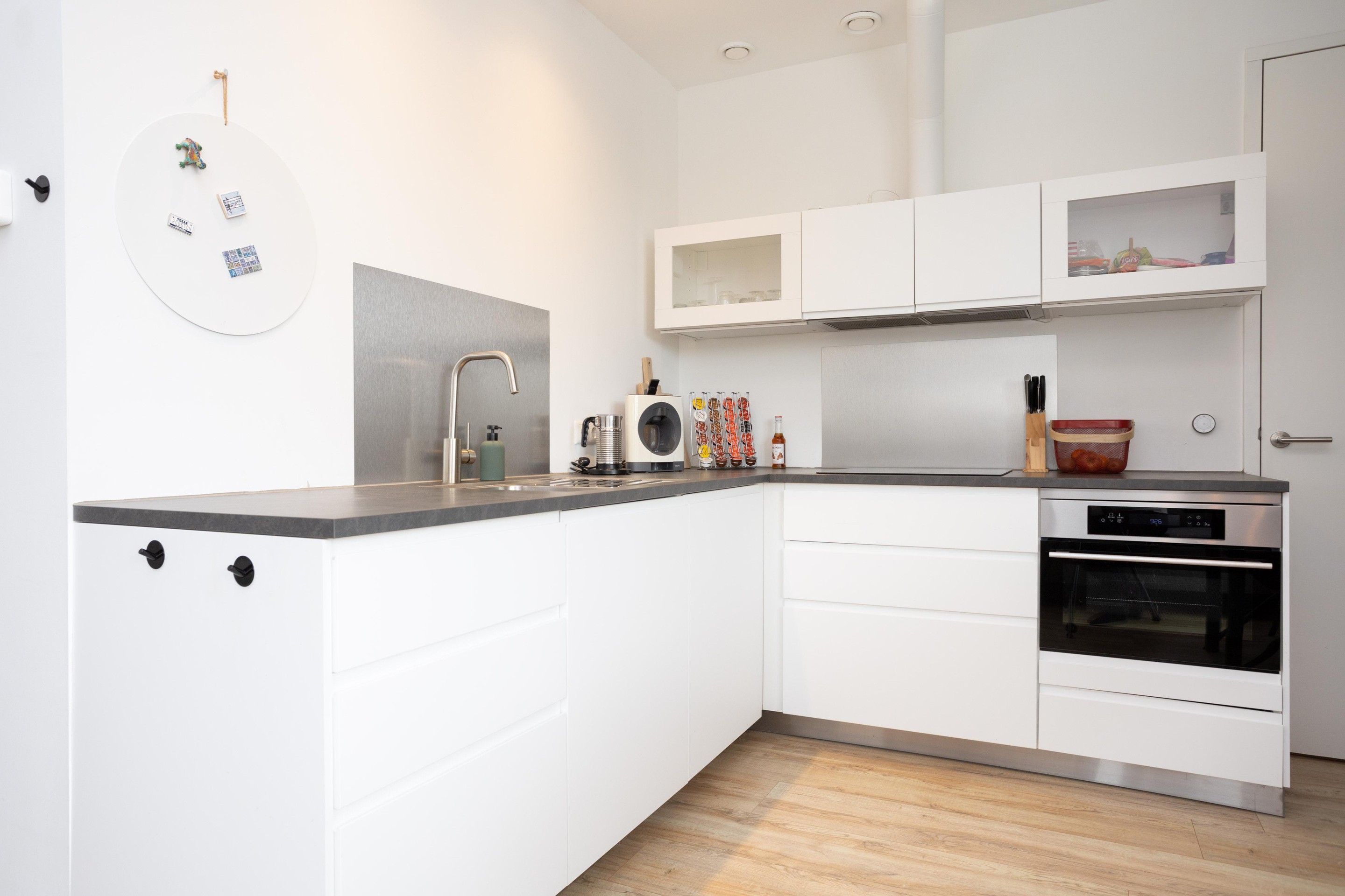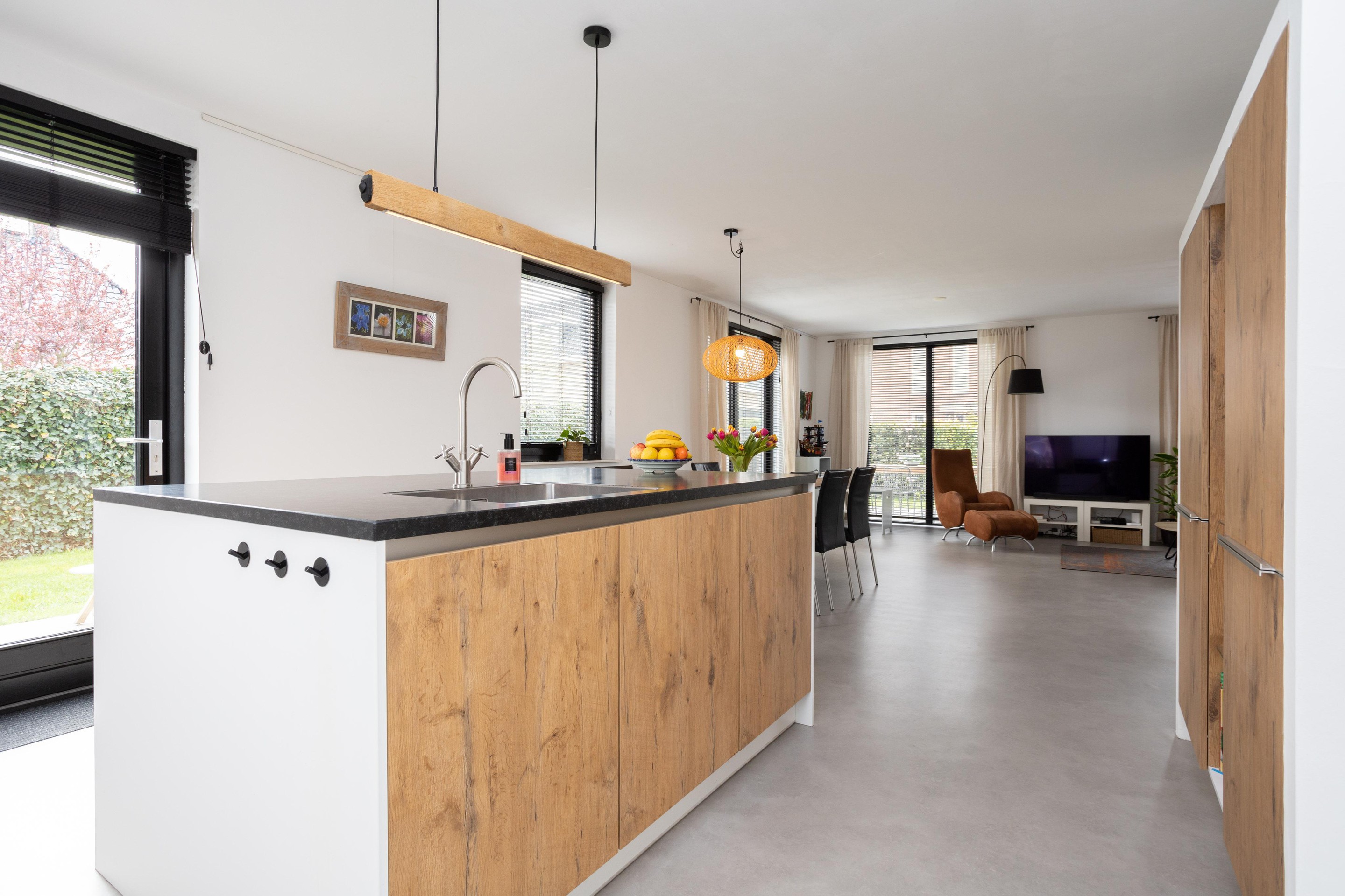 De luxe keuken is voorzien van een spoeleiland en een Bora inductie kookplaat met afzuiging direct onder het raam. Ook zijn een vaatwasser, combimagnetron en een koelkast met vriezer aanwezig. Het geheel is afgewerkt met een granieten werkblad. Vanuit de keuken is er toegang tot de bijkeuken. Hier is plaats voor een wasmachine en droger en extra opbergruimte. Ook vind je hier de binnenunit van de wamtepomp en buffervaten. De buitenunit hangt hier pal achter aan de gevel.