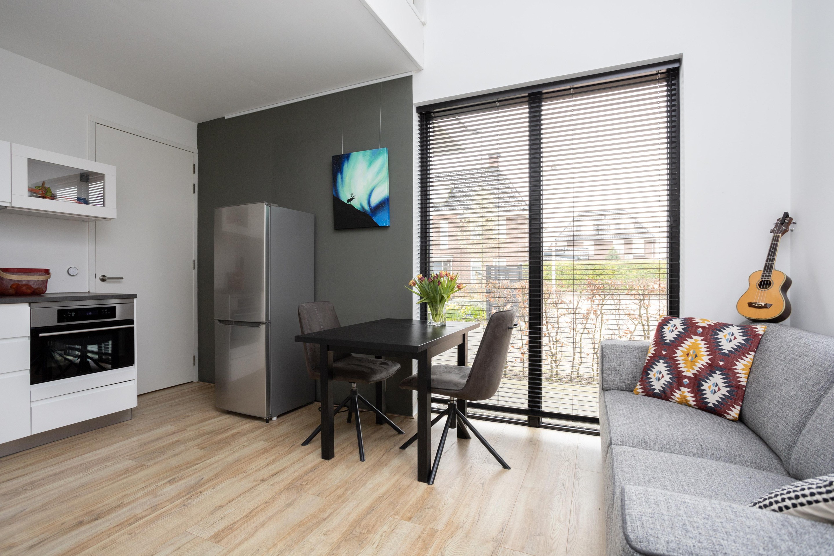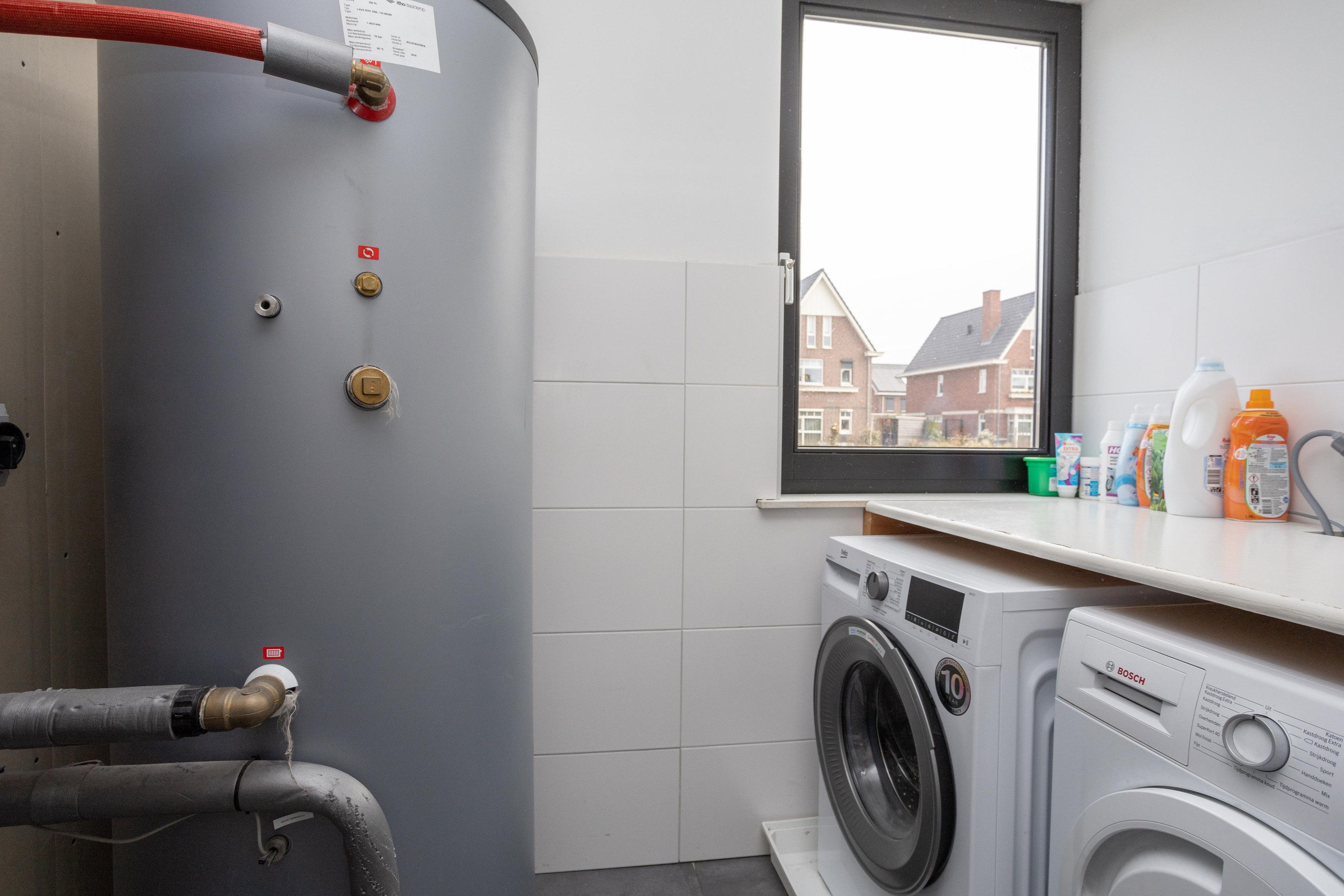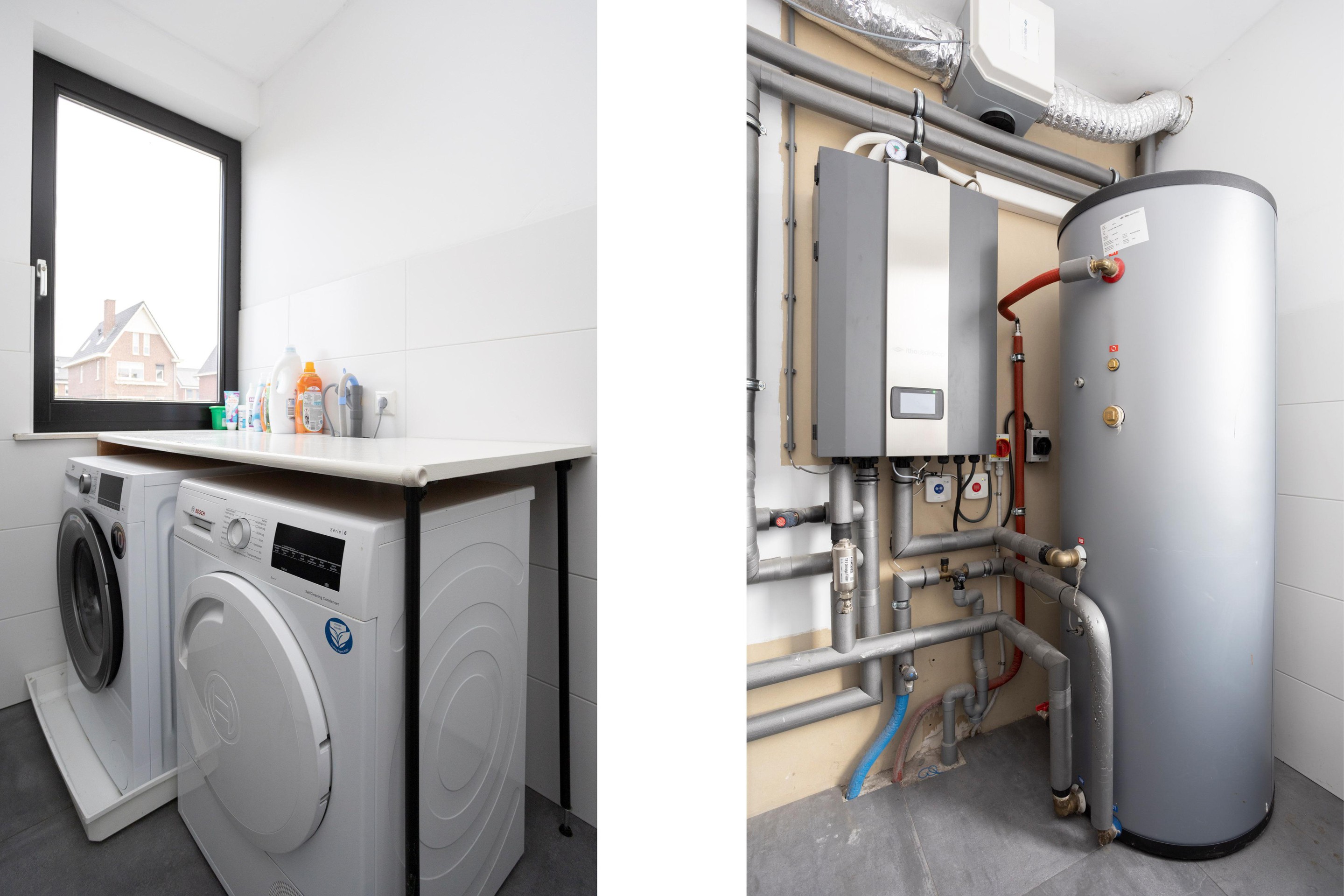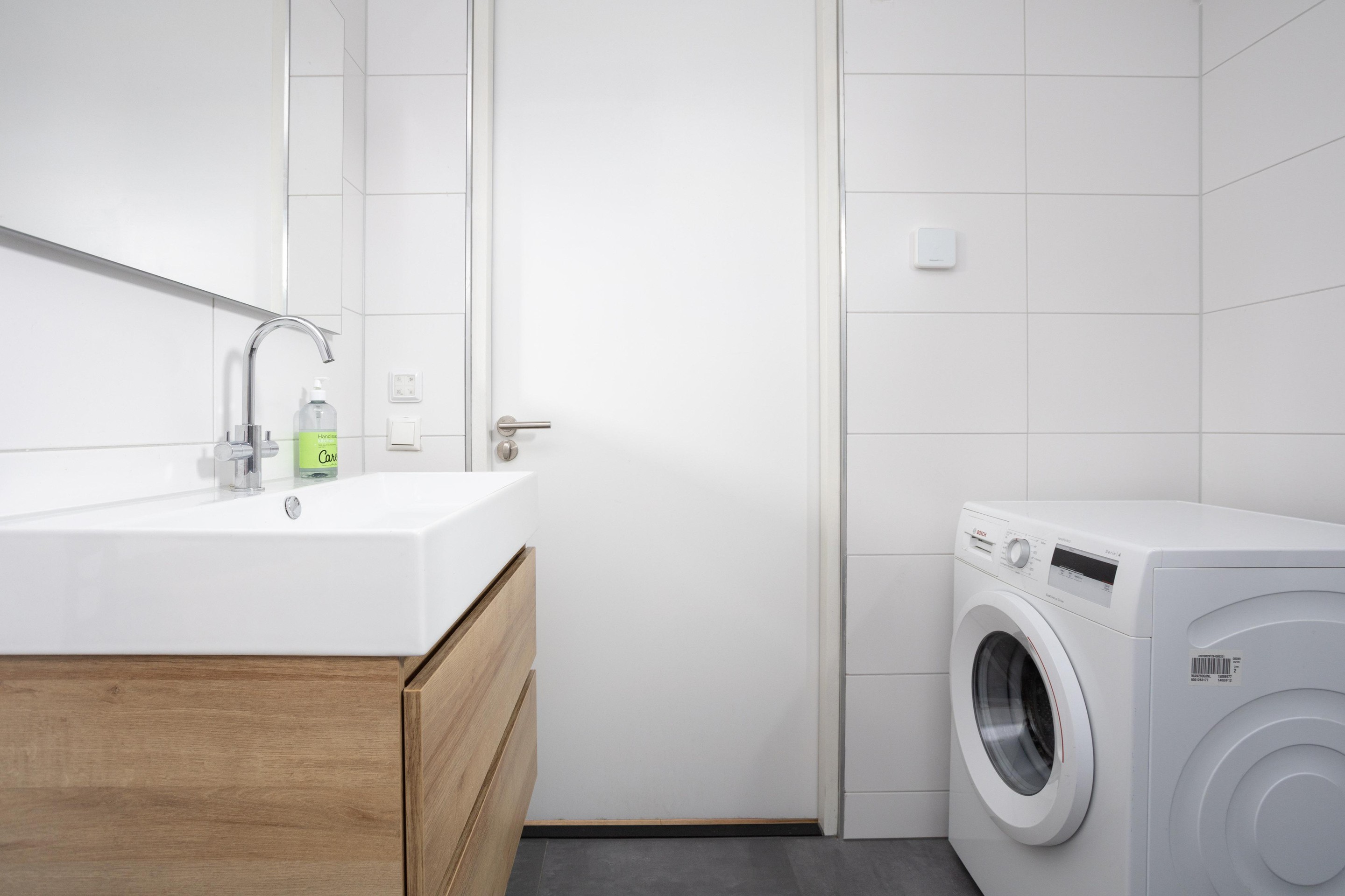 De luxe keuken is voorzien van een spoeleiland en een Bora inductie kookplaat met afzuiging direct onder het raam. Ook zijn een vaatwasser, combimagnetron en een koelkast met vriezer aanwezig. Het geheel is afgewerkt met een granieten werkblad. Vanuit de keuken is er toegang tot de bijkeuken. Hier is plaats voor een wasmachine en droger en extra opbergruimte. Ook vind je hier de binnenunit van de wamtepomp en buffervaten. De buitenunit hangt hier pal achter aan de gevel.