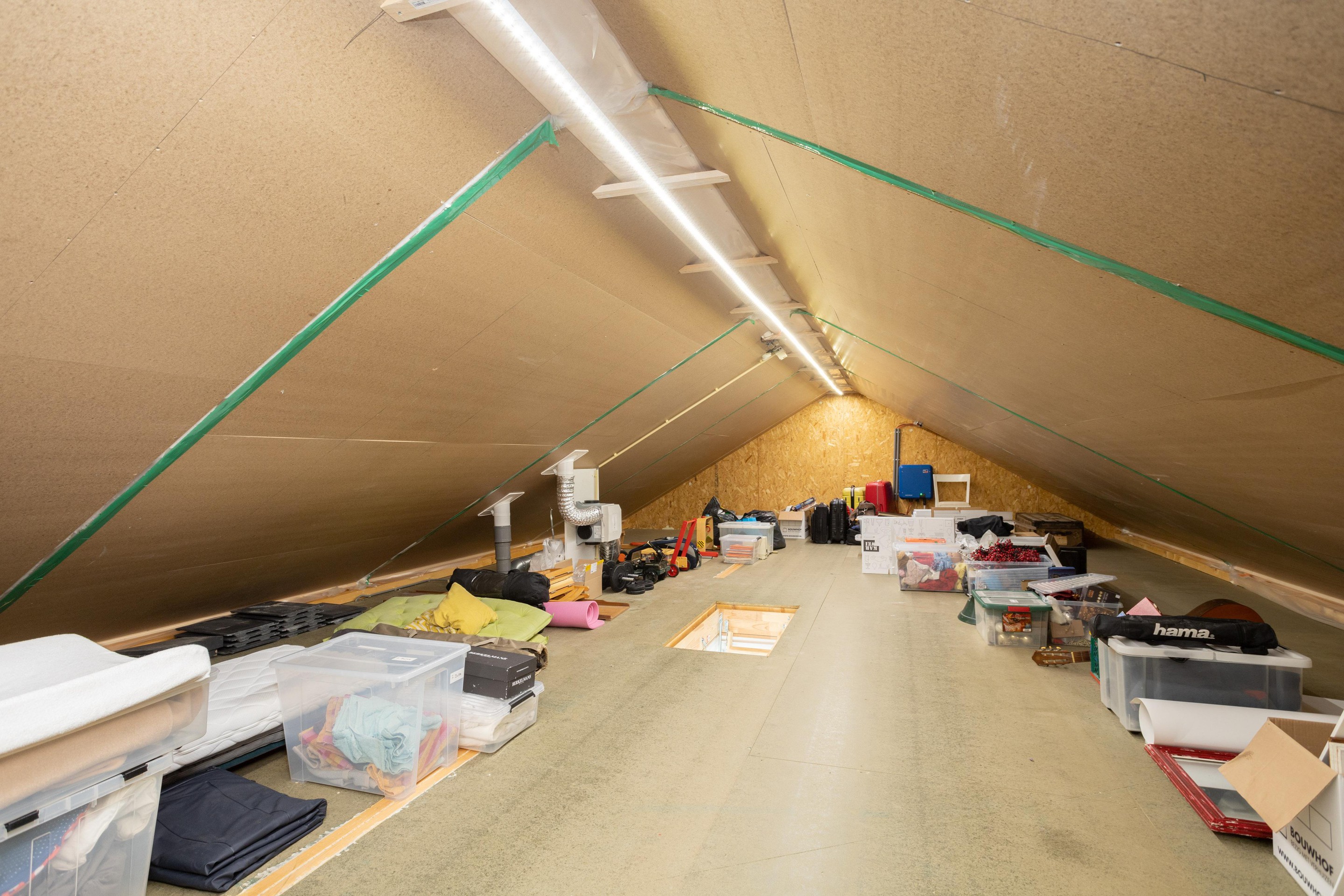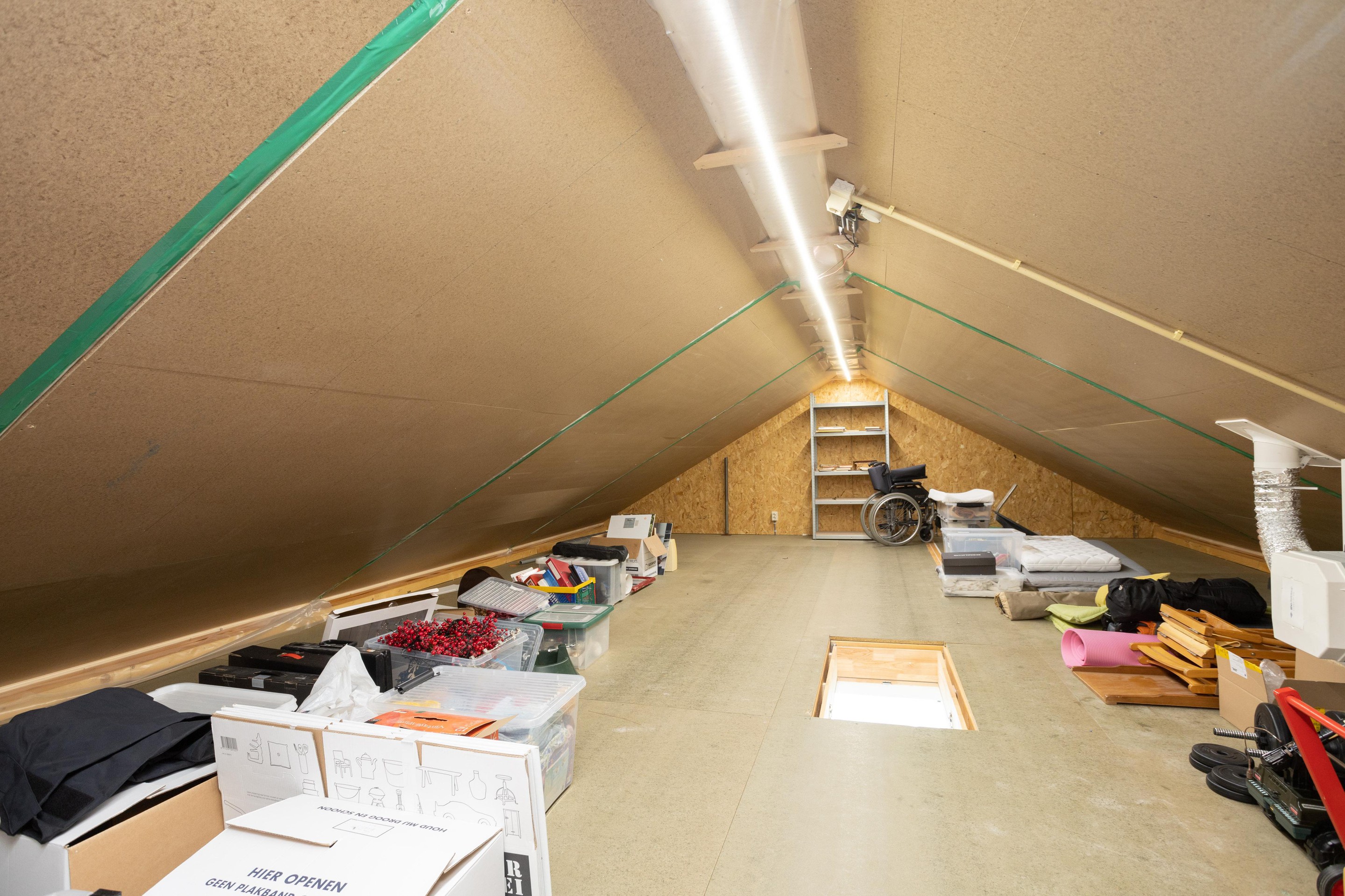 De vliering strekt zich uit over de hele lengte van het huis. Deze is middels een vlizotrap te bereiken en heeft een goede stahoogte in het midden.