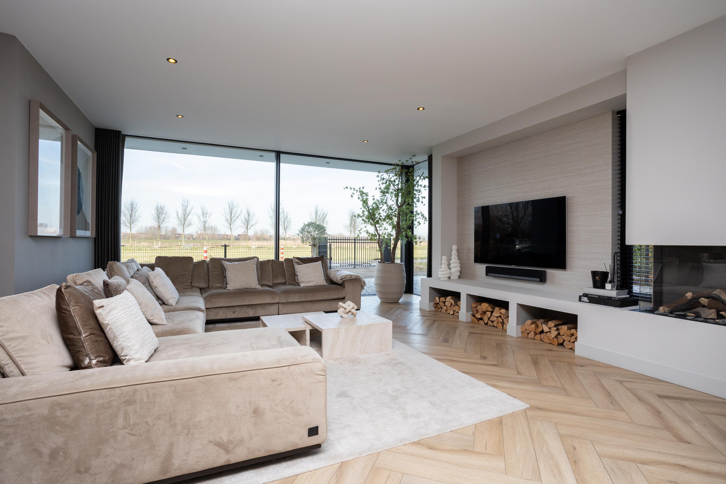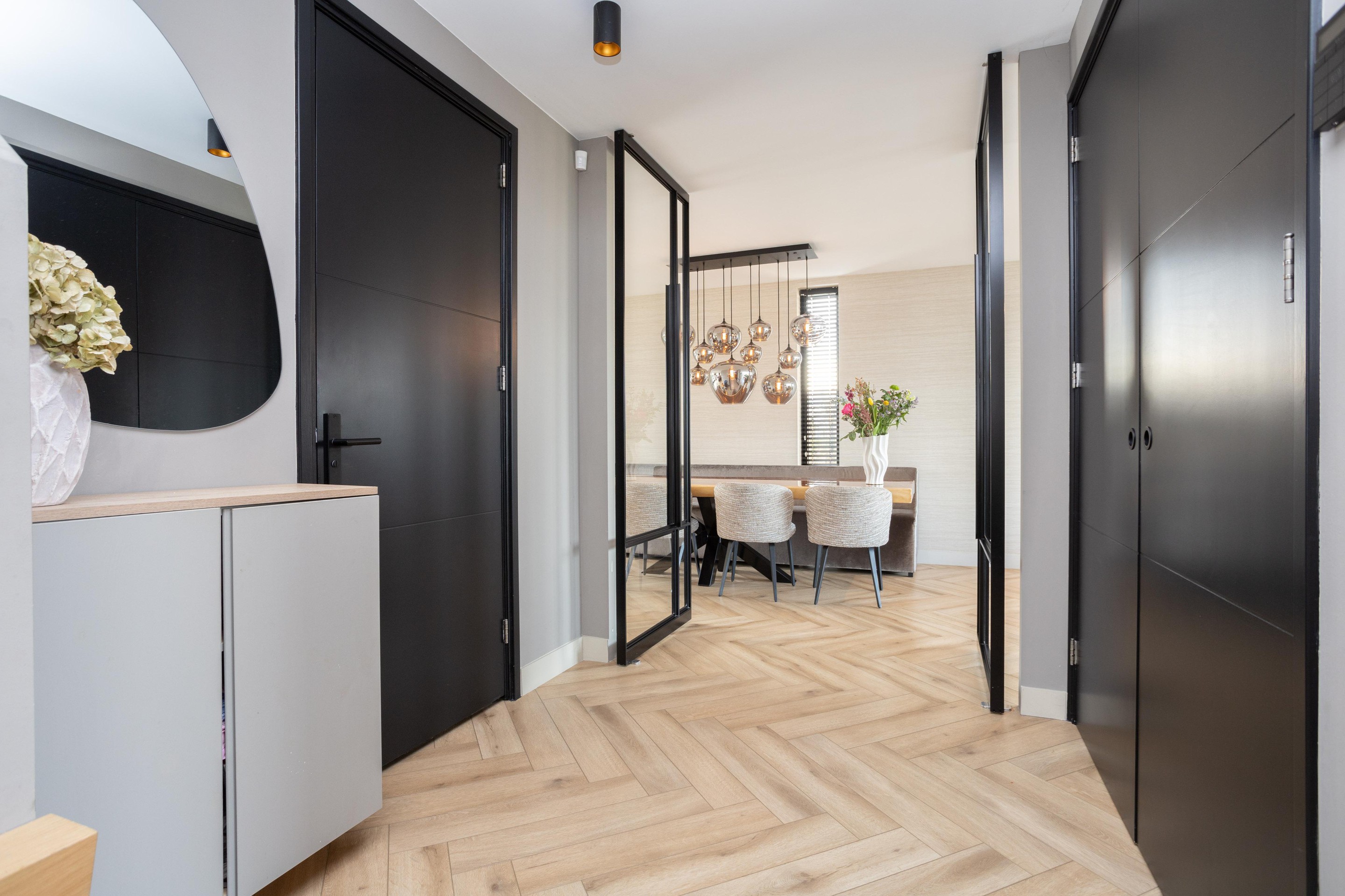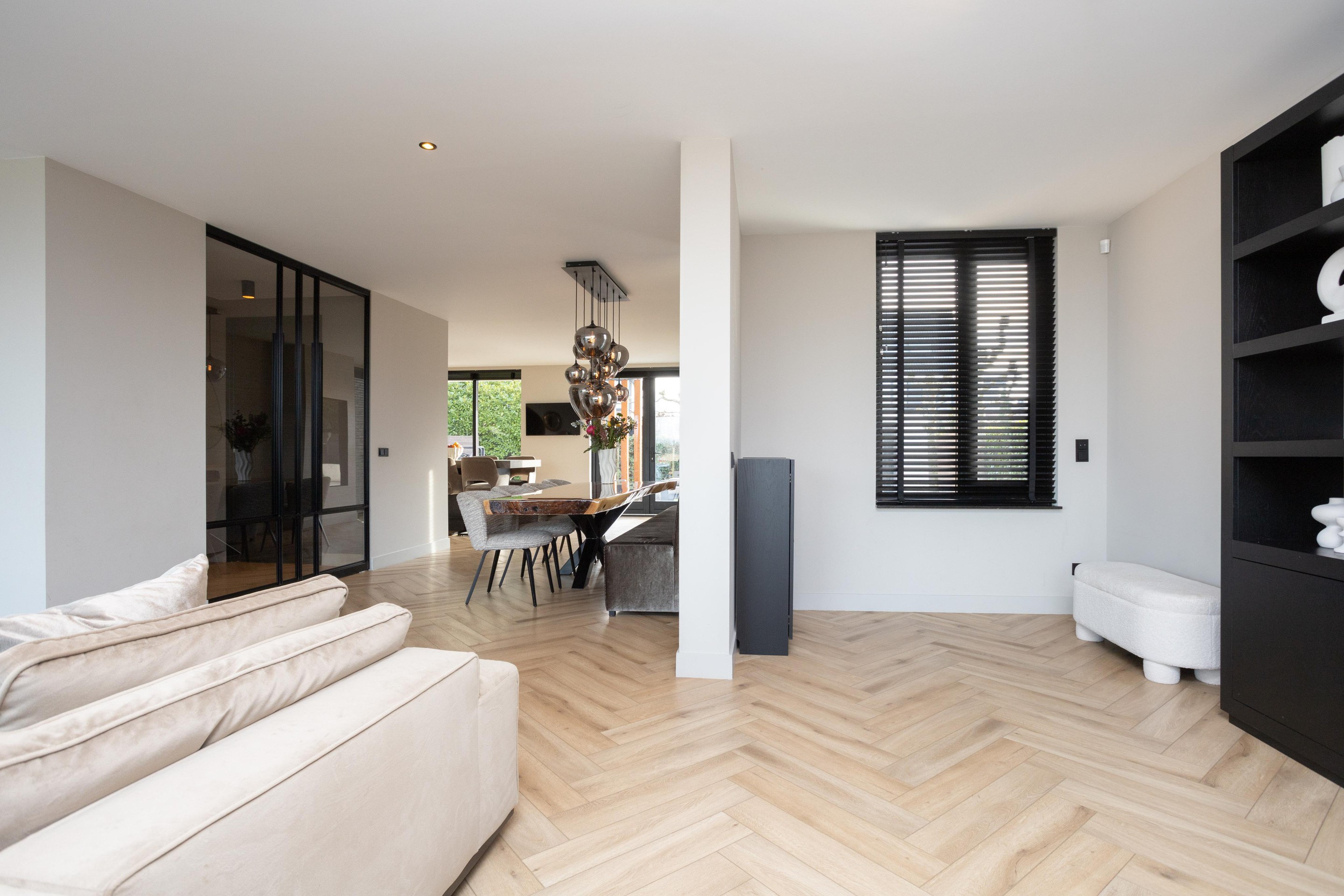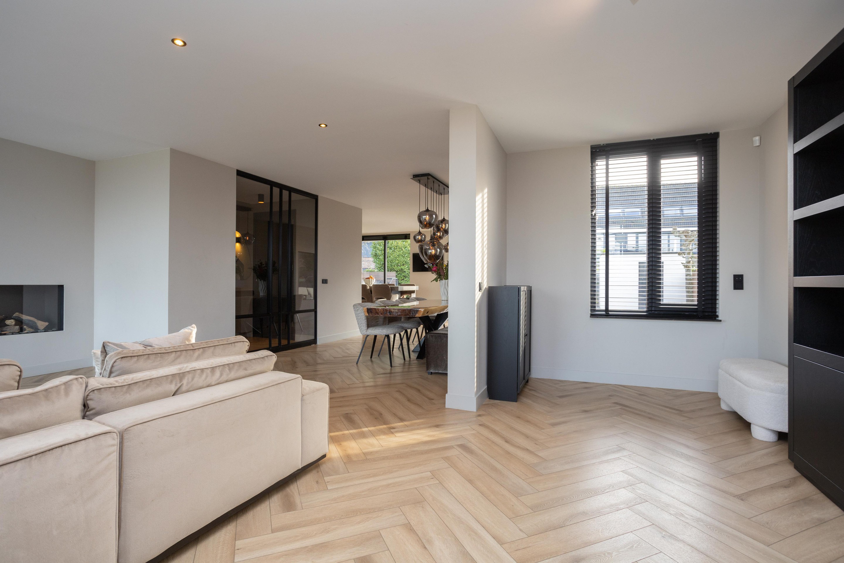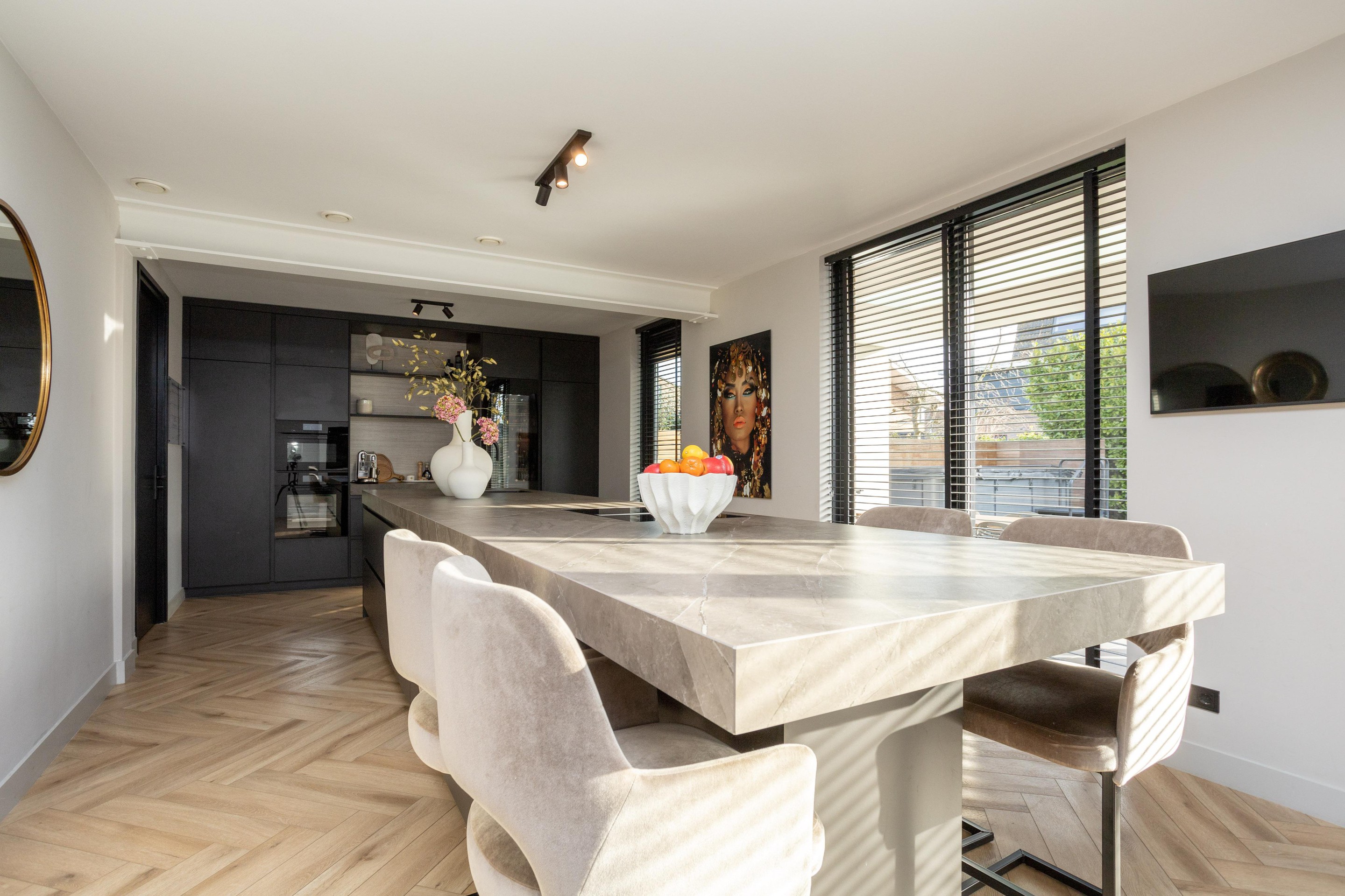 Entree, ruime hal met meterkast, garderobe luxe toilet met fonteintje en trapopgang naar de 1e verdieping. Deur naar de riante living met aan de voorzijde de woonkamer, wat direct opvalt zijn de prachtige raampartijen. Heerlijk al dat licht. Let ook op de wanden en plafond, deze zijn strak gestuukt. Op de vloer prachtig PVC in visgraat motief. De sfeervolle gashaard maakt het af. Aan de achterzijde is de royale open keuken met eiland. Dit is een prettige plek om te verblijven, van alle gemakken voorzien, strak en in een moderne stijl afgewerkt. De keuken is voorzien van een Quooker, stoomoven, oven, wijnklimaatkast, vaatwasser koelkast en een vriezer. Vanuit de keuken toegang tot de inpandige geïsoleerde garage met elektrische deur en openslaande deuren.