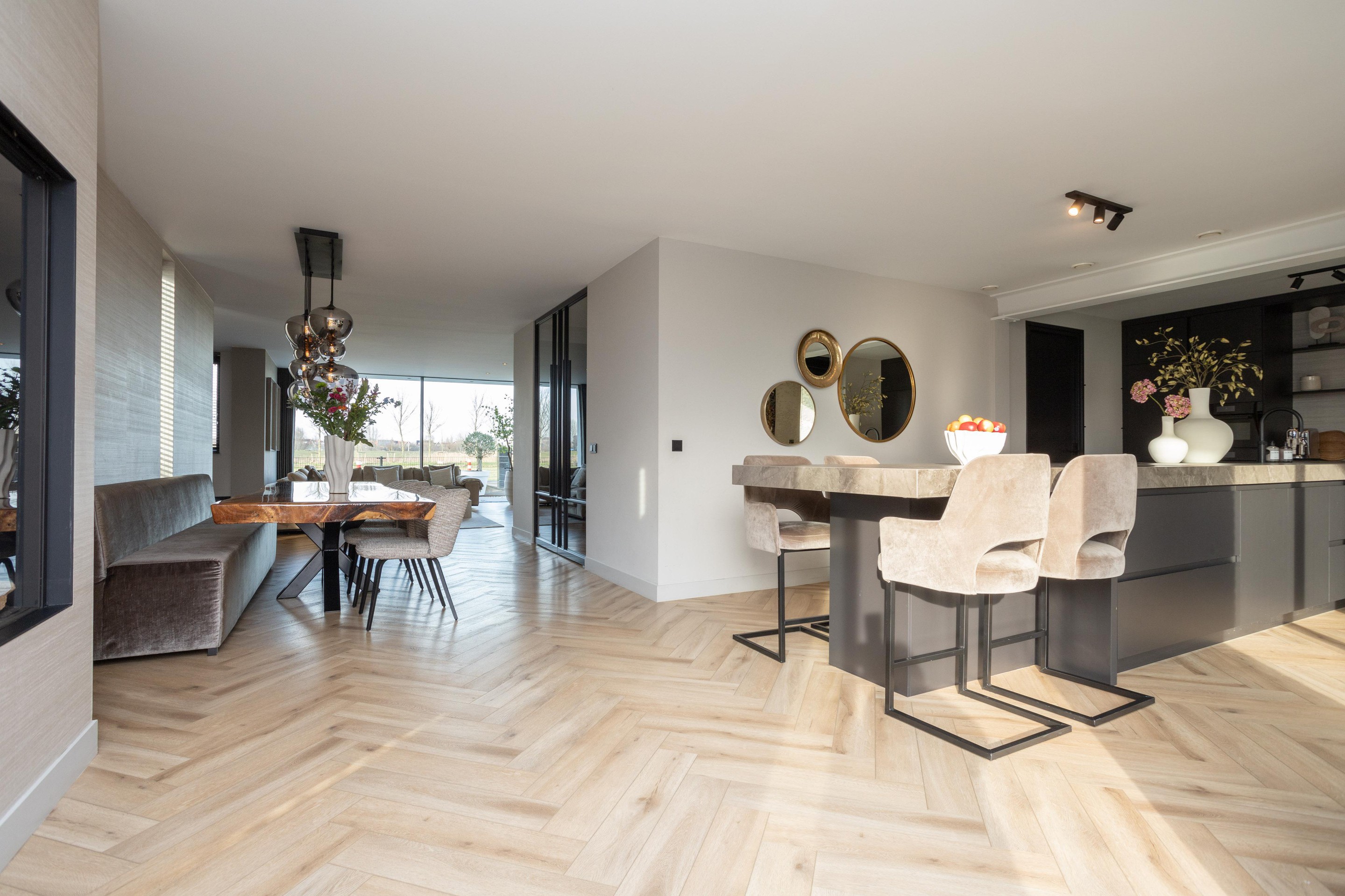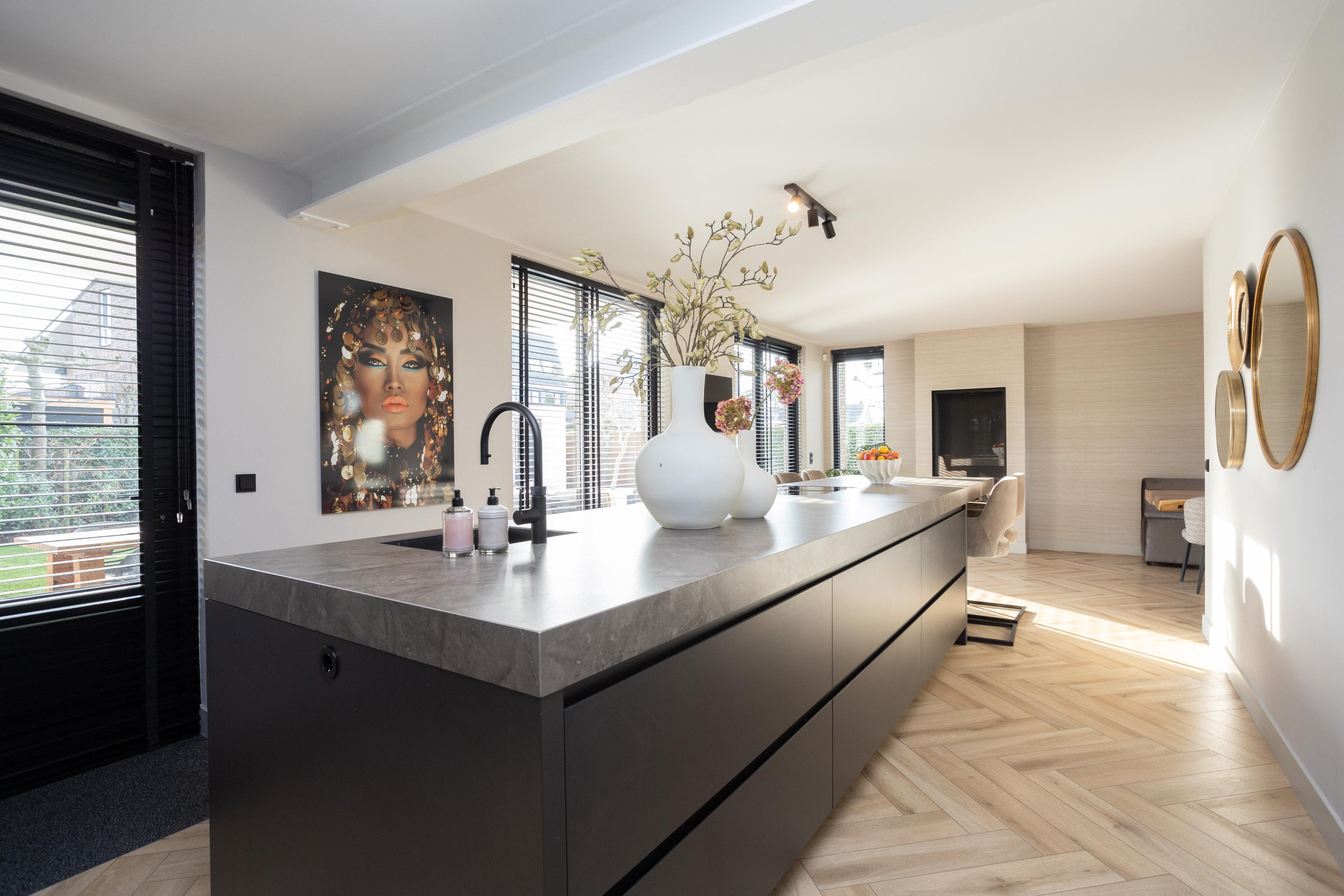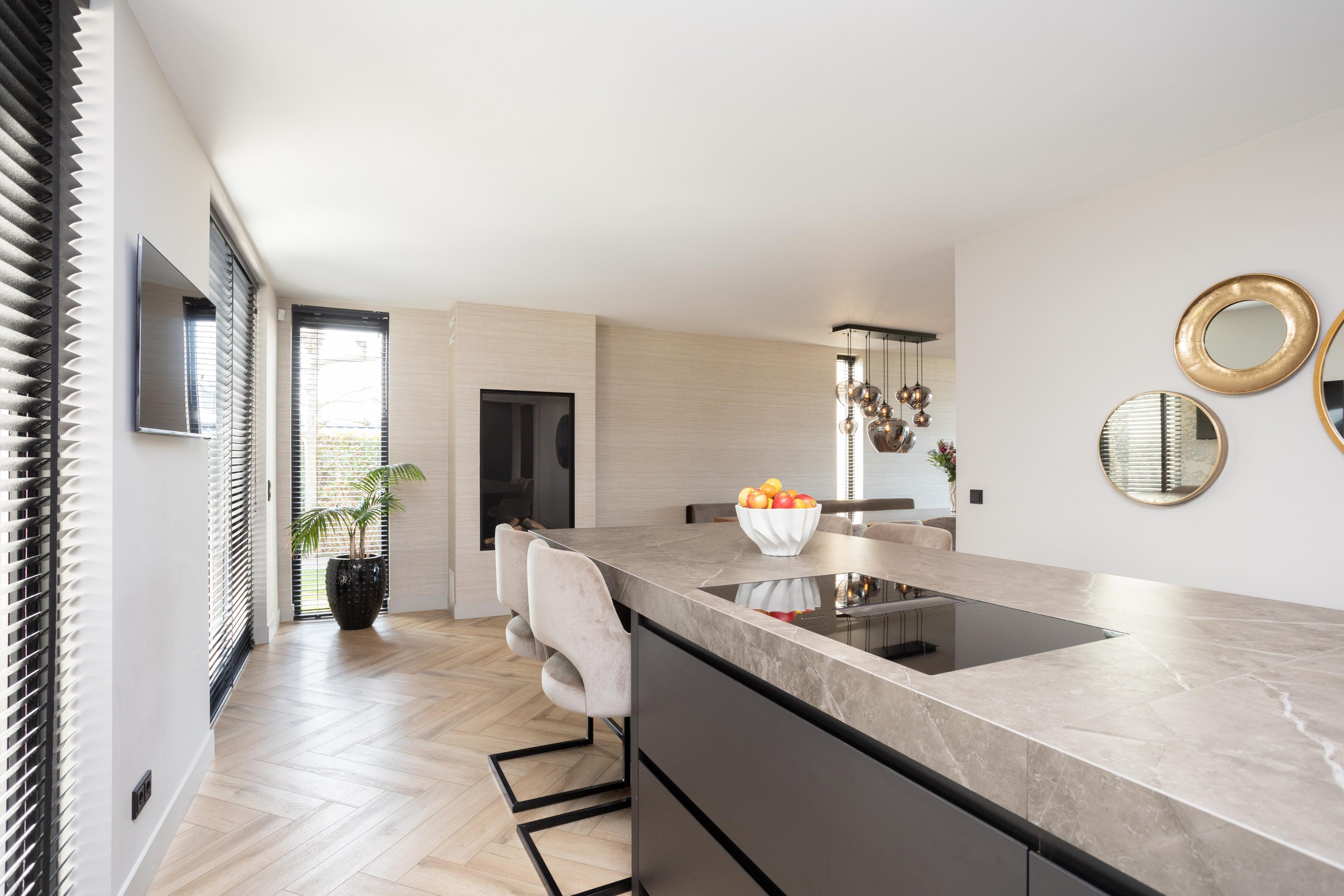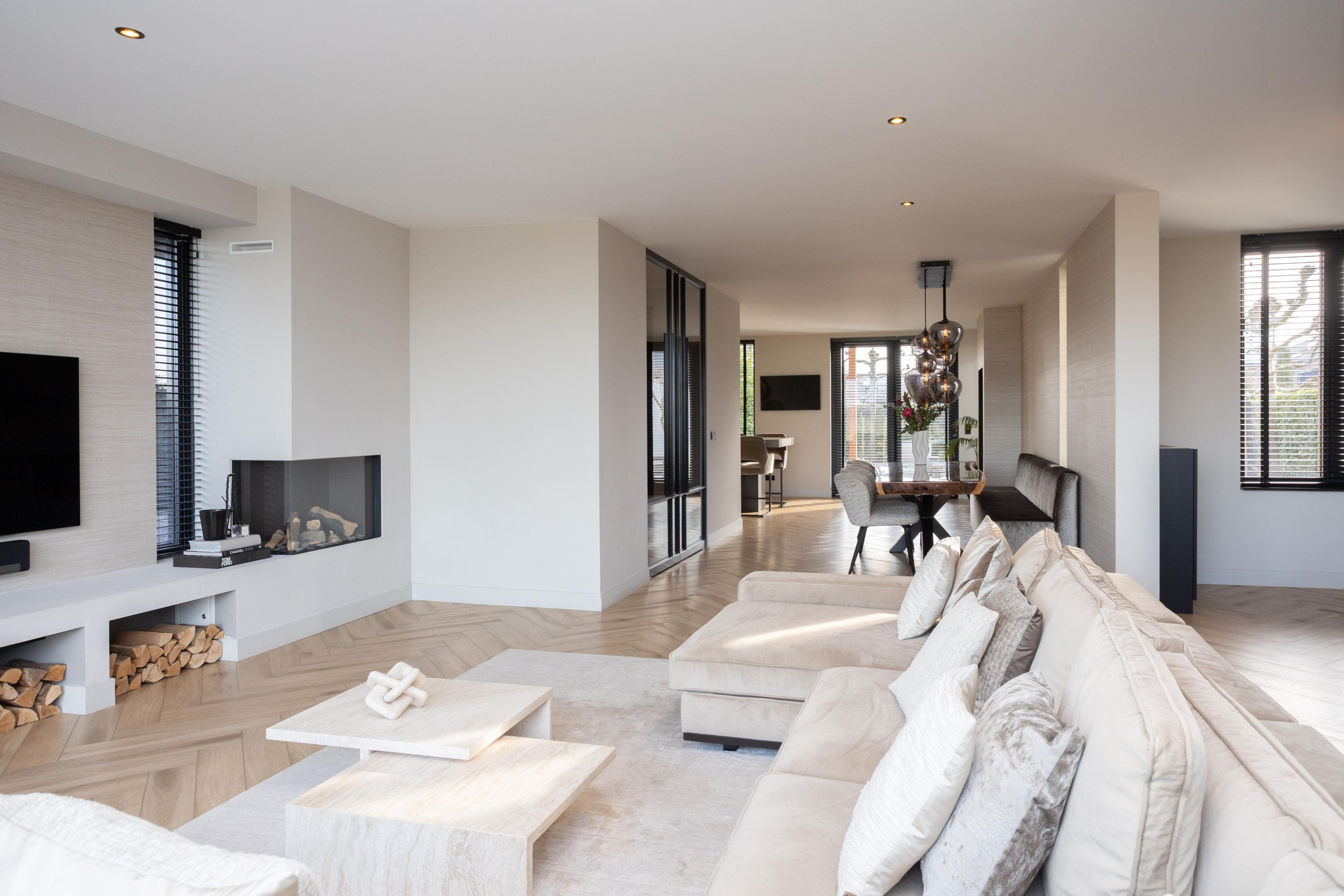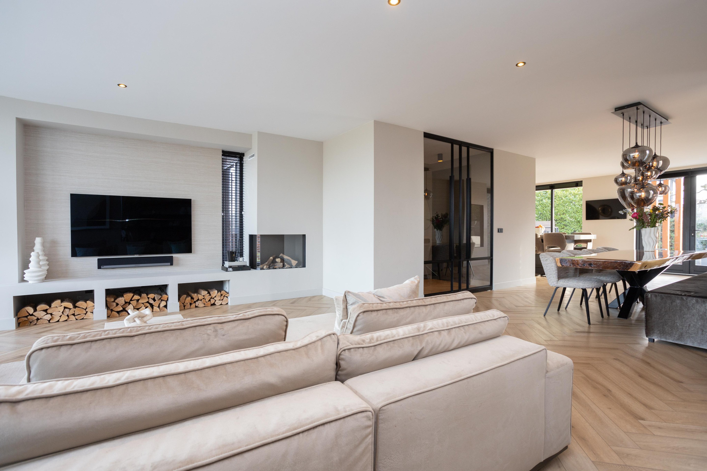 Entree, ruime hal met meterkast, garderobe luxe toilet met fonteintje en trapopgang naar de 1e verdieping. Deur naar de riante living met aan de voorzijde de woonkamer, wat direct opvalt zijn de prachtige raampartijen. Heerlijk al dat licht. Let ook op de wanden en plafond, deze zijn strak gestuukt. Op de vloer prachtig PVC in visgraat motief. De sfeervolle gashaard maakt het af. Aan de achterzijde is de royale open keuken met eiland. Dit is een prettige plek om te verblijven, van alle gemakken voorzien, strak en in een moderne stijl afgewerkt. De keuken is voorzien van een Quooker, stoomoven, oven, wijnklimaatkast, vaatwasser koelkast en een vriezer. Vanuit de keuken toegang tot de inpandige geïsoleerde garage met elektrische deur en openslaande deuren.