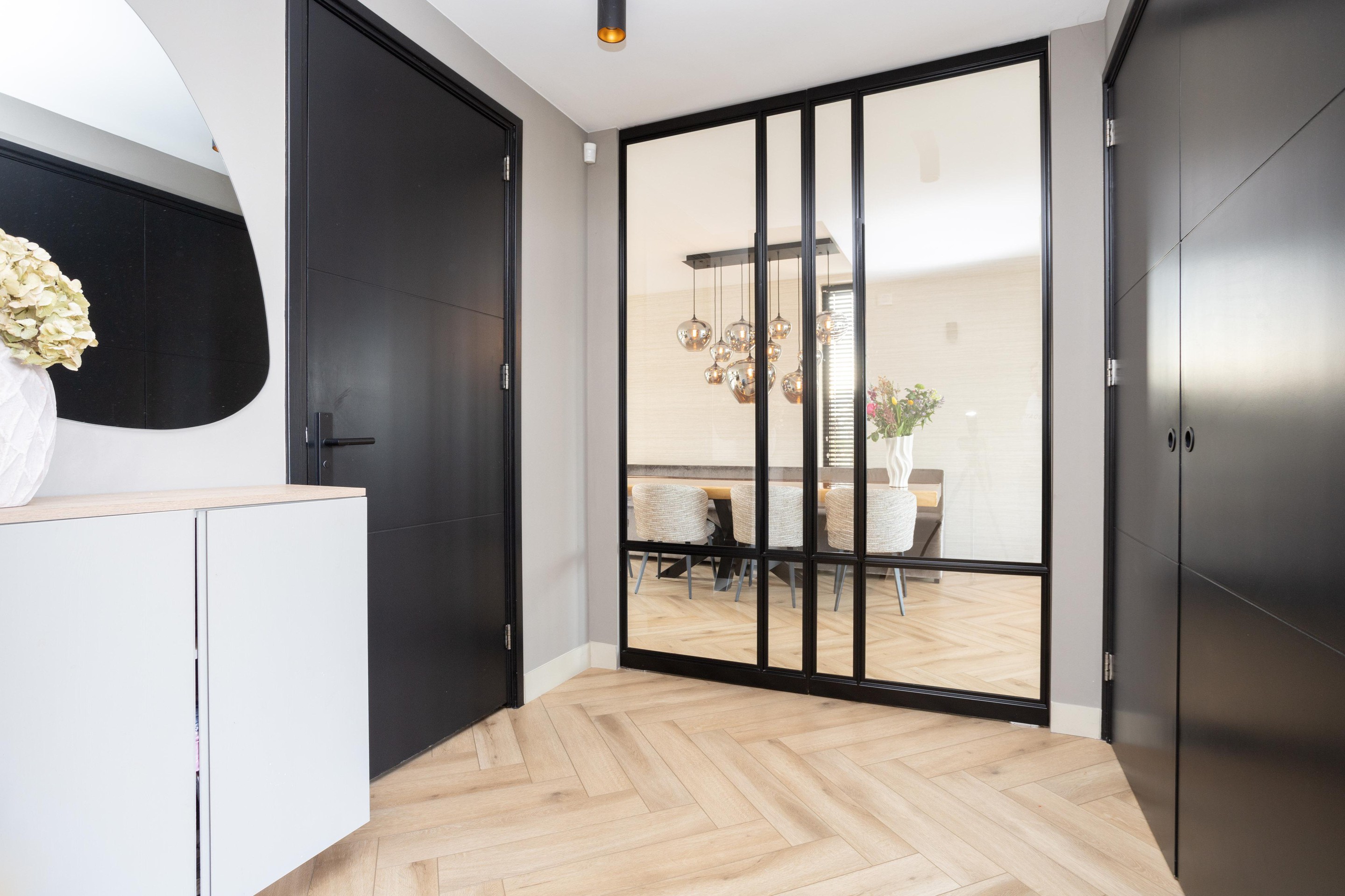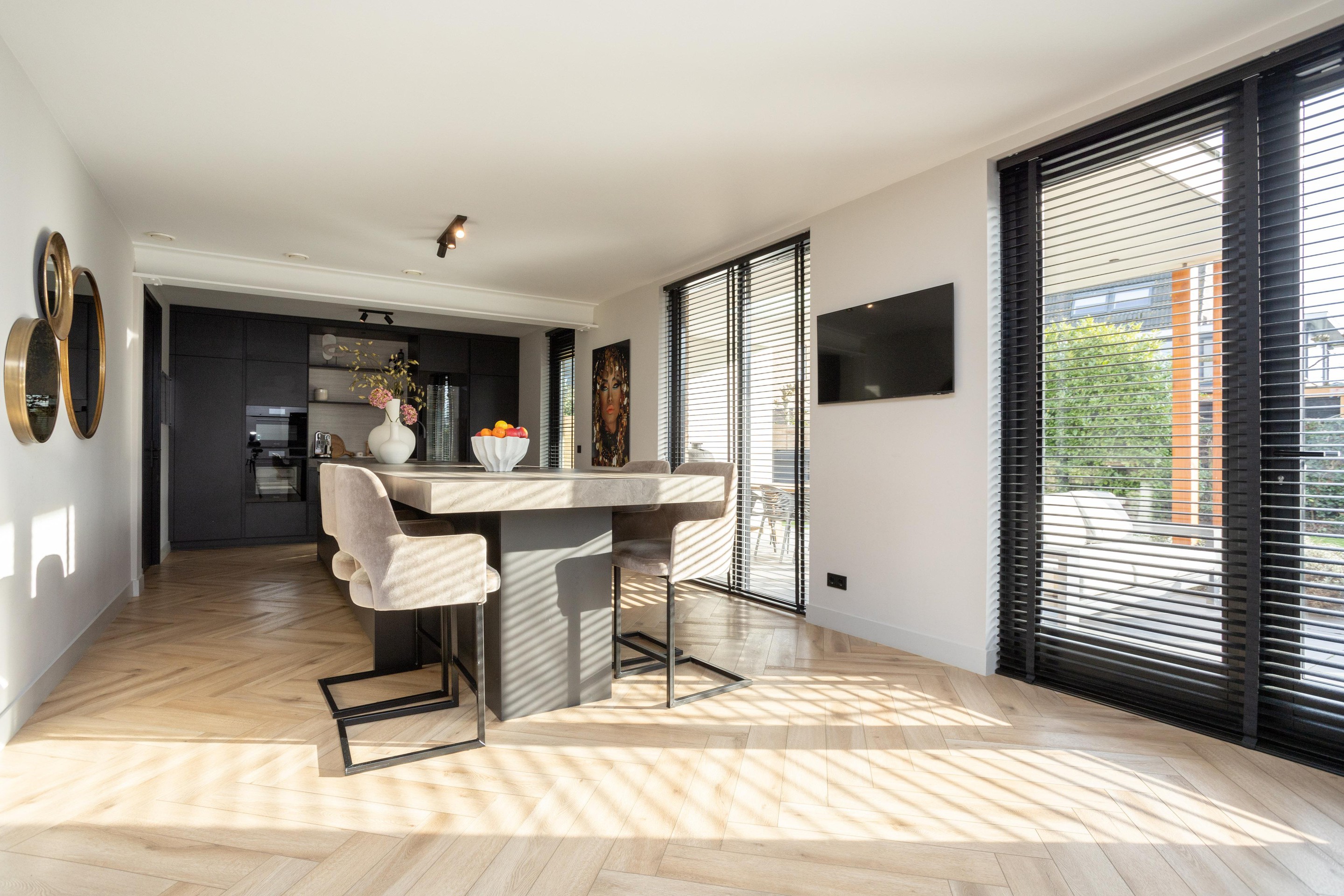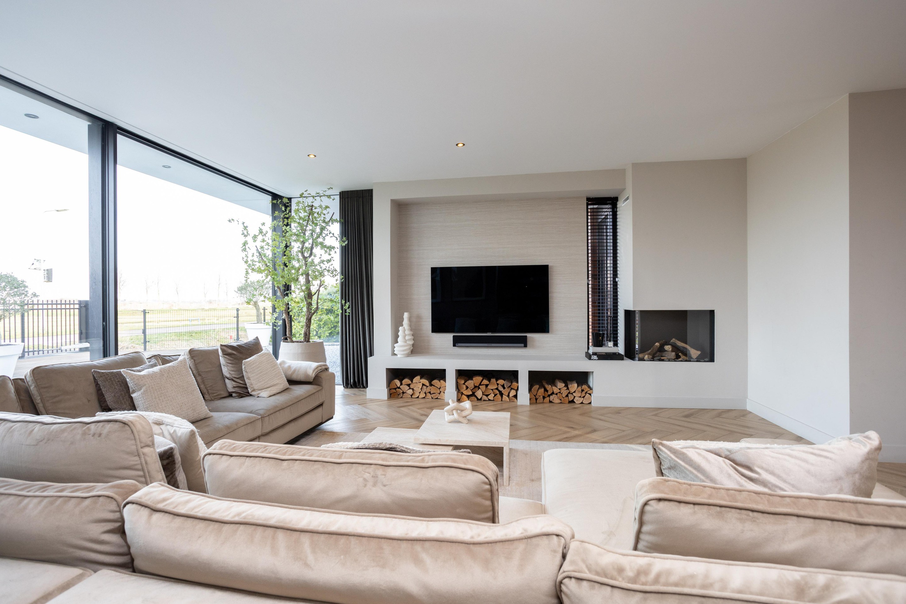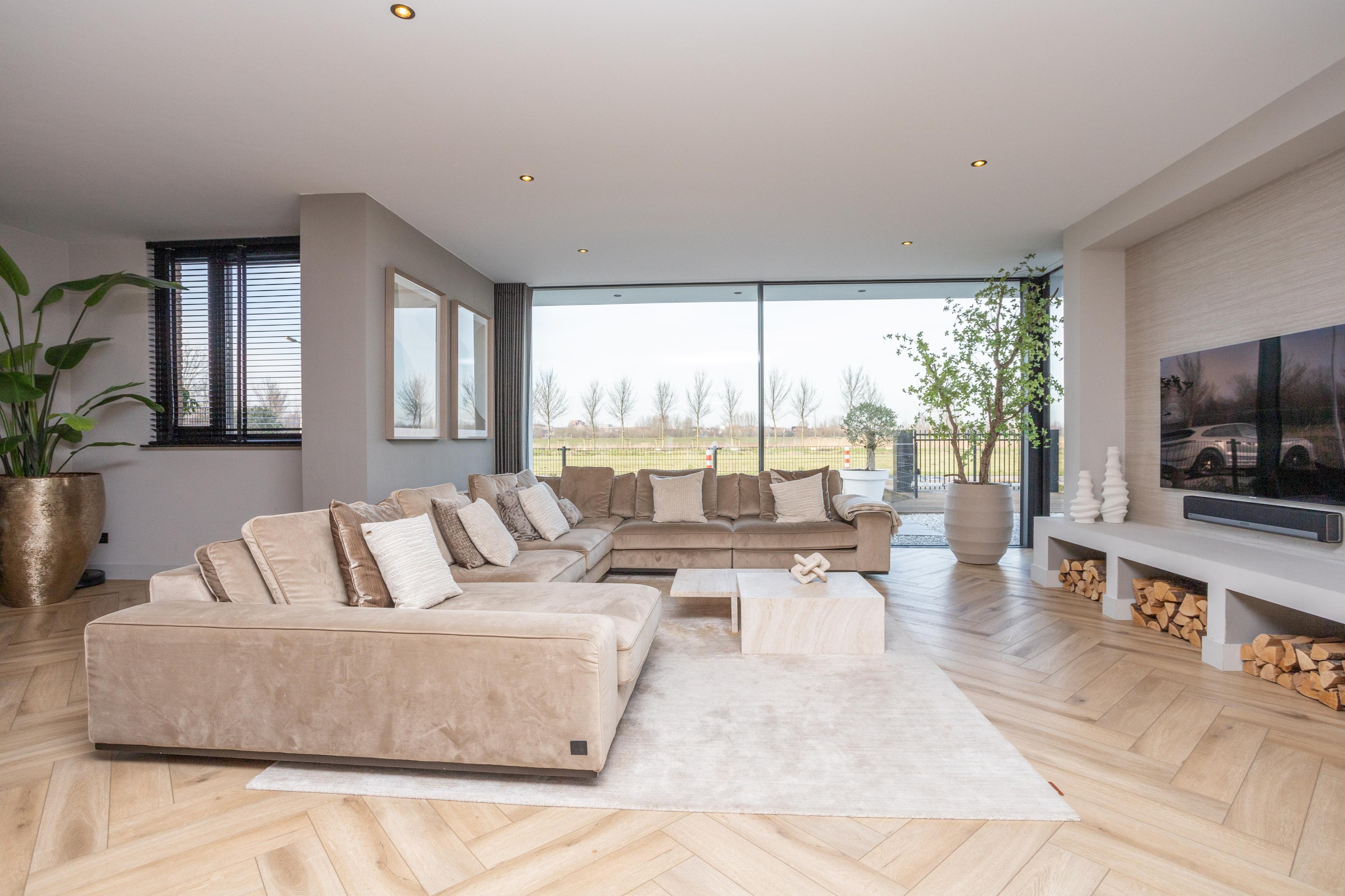Entree, ruime hal met meterkast, garderobe luxe toilet met fonteintje en trapopgang naar de 1e verdieping. Deur naar de riante living met aan de voorzijde de woonkamer, wat direct opvalt zijn de prachtige raampartijen. Heerlijk al dat licht. Let ook op de wanden en plafond, deze zijn strak gestuukt. Op de vloer prachtig PVC in visgraat motief. De sfeervolle gashaard maakt het af. Aan de achterzijde is de royale open keuken met eiland. Dit is een prettige plek om te verblijven, van alle gemakken voorzien, strak en in een moderne stijl afgewerkt. De keuken is voorzien van een Quooker, stoomoven, oven, wijnklimaatkast, vaatwasser koelkast en een vriezer. Vanuit de keuken toegang tot de inpandige geïsoleerde garage met elektrische deur en openslaande deuren.