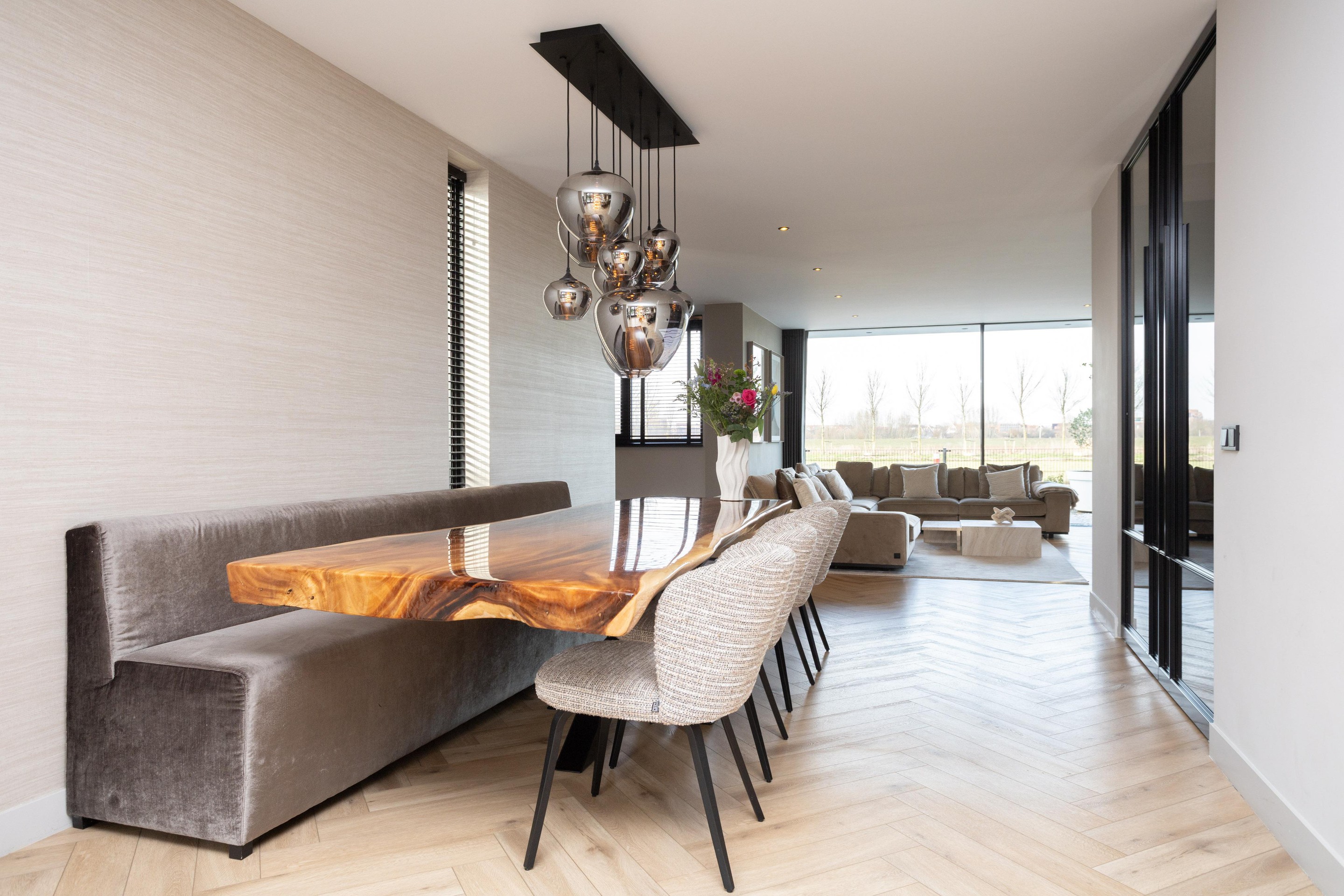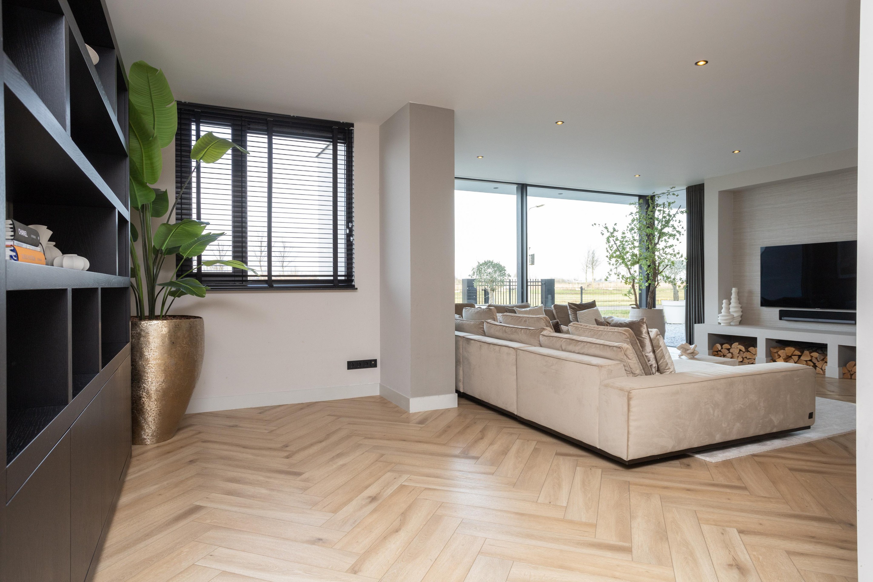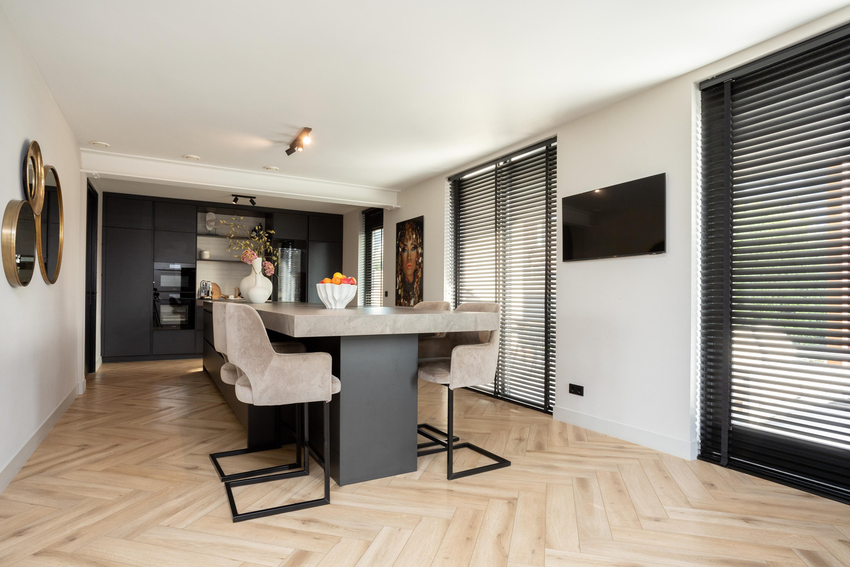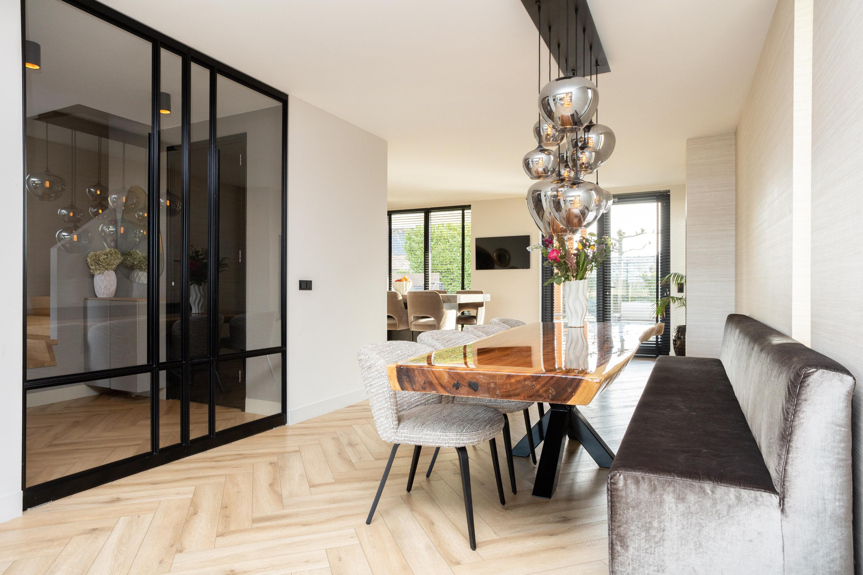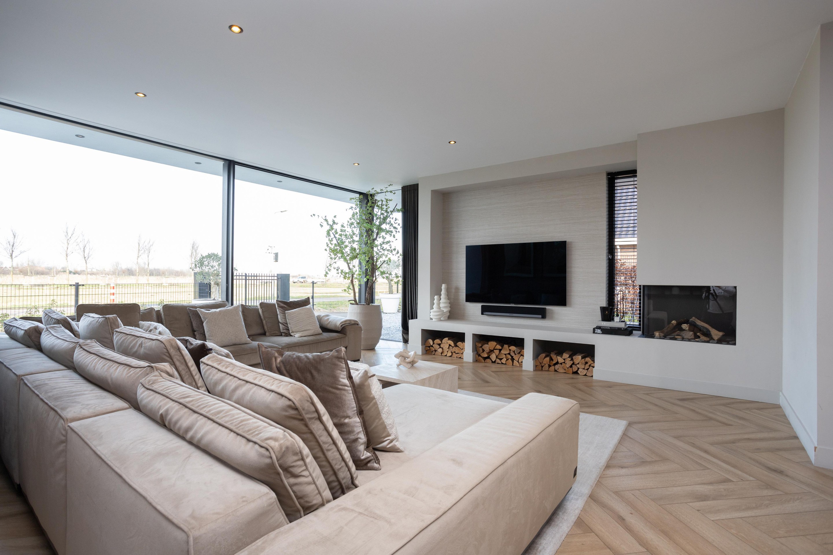 Entree, ruime hal met meterkast, garderobe luxe toilet met fonteintje en trapopgang naar de 1e verdieping. Deur naar de riante living met aan de voorzijde de woonkamer, wat direct opvalt zijn de prachtige raampartijen. Heerlijk al dat licht. Let ook op de wanden en plafond, deze zijn strak gestuukt. Op de vloer prachtig PVC in visgraat motief. De sfeervolle gashaard maakt het af. Aan de achterzijde is de royale open keuken met eiland. Dit is een prettige plek om te verblijven, van alle gemakken voorzien, strak en in een moderne stijl afgewerkt. De keuken is voorzien van een Quooker, stoomoven, oven, wijnklimaatkast, vaatwasser koelkast en een vriezer. Vanuit de keuken toegang tot de inpandige geïsoleerde garage met elektrische deur en openslaande deuren.