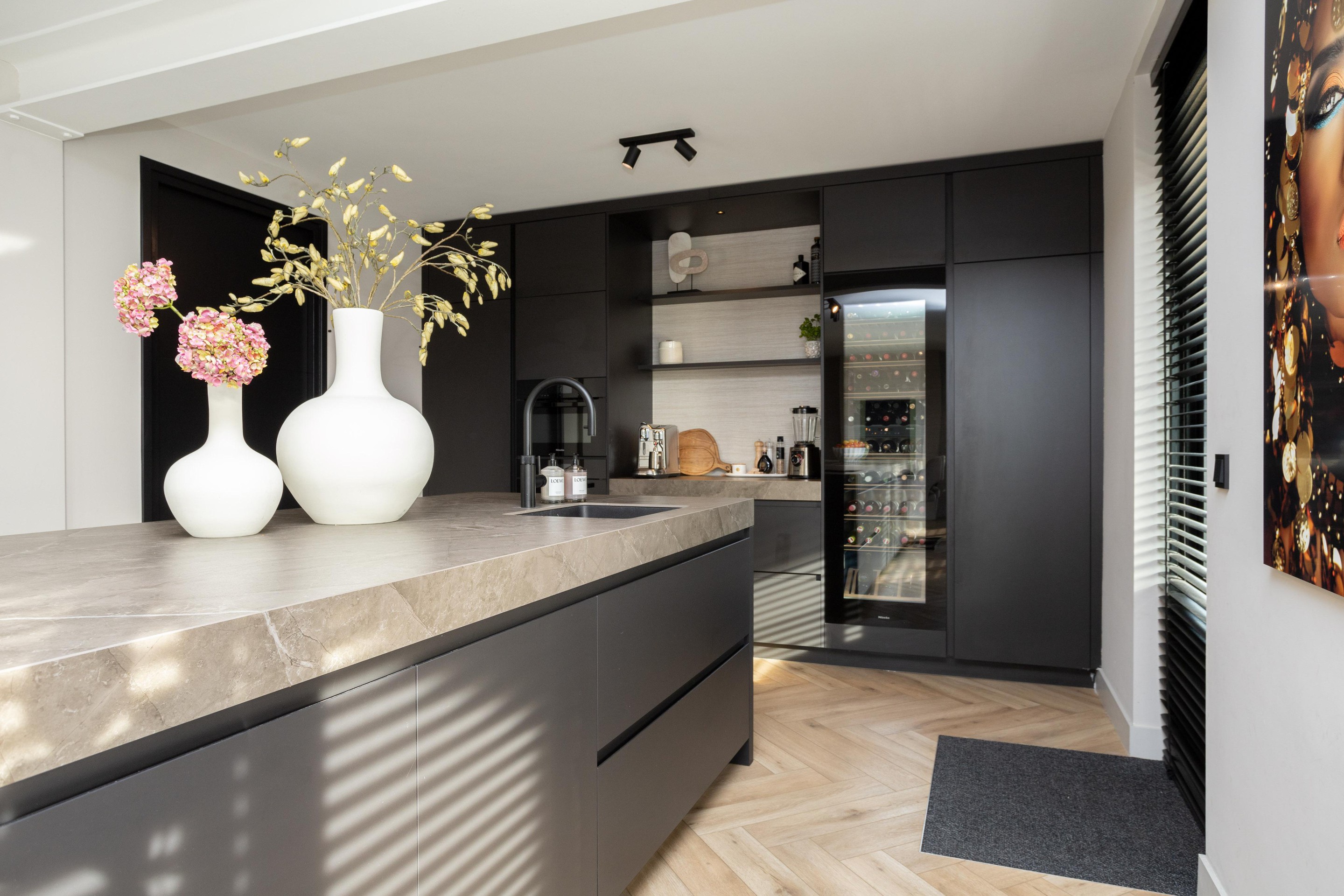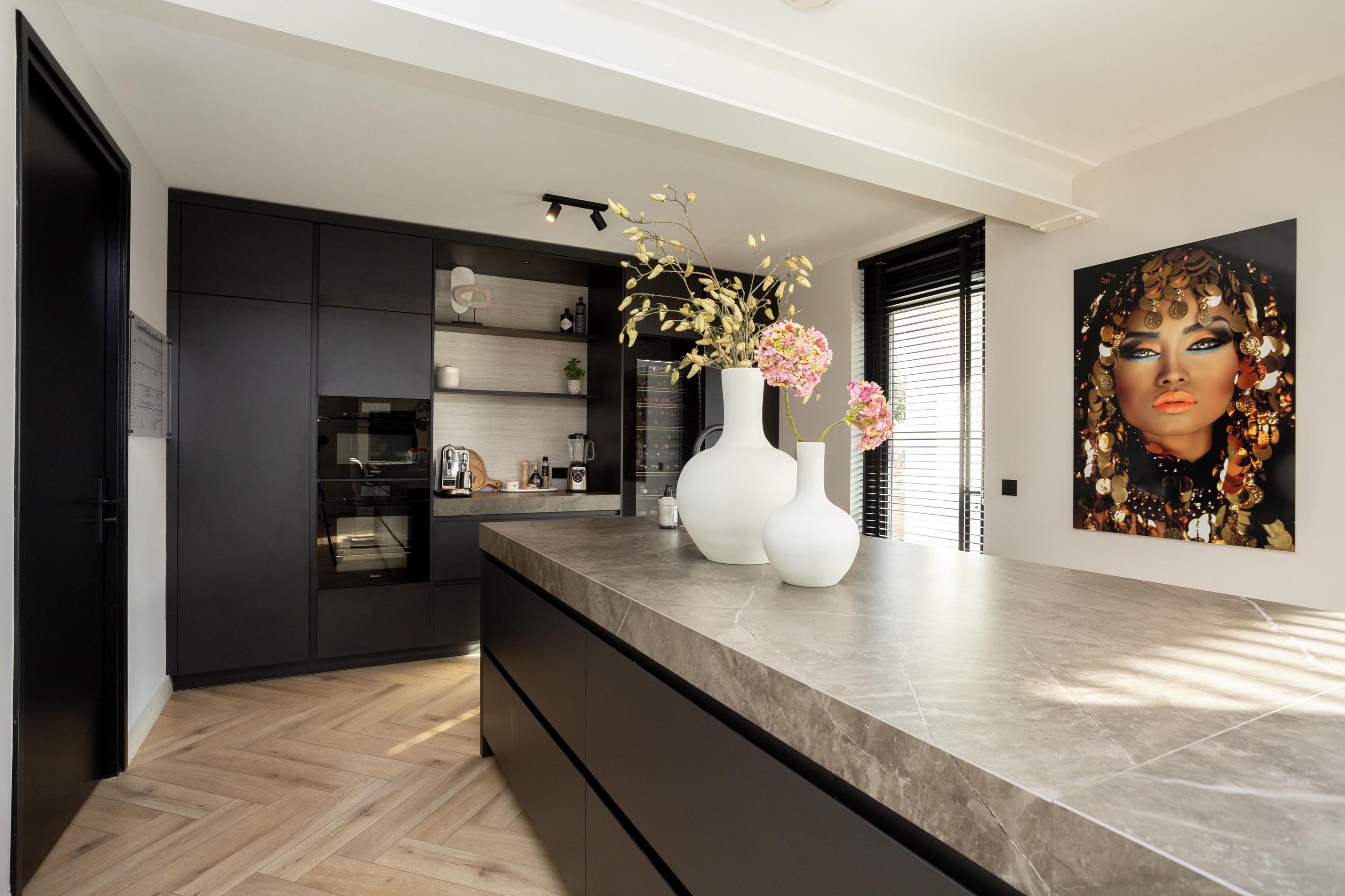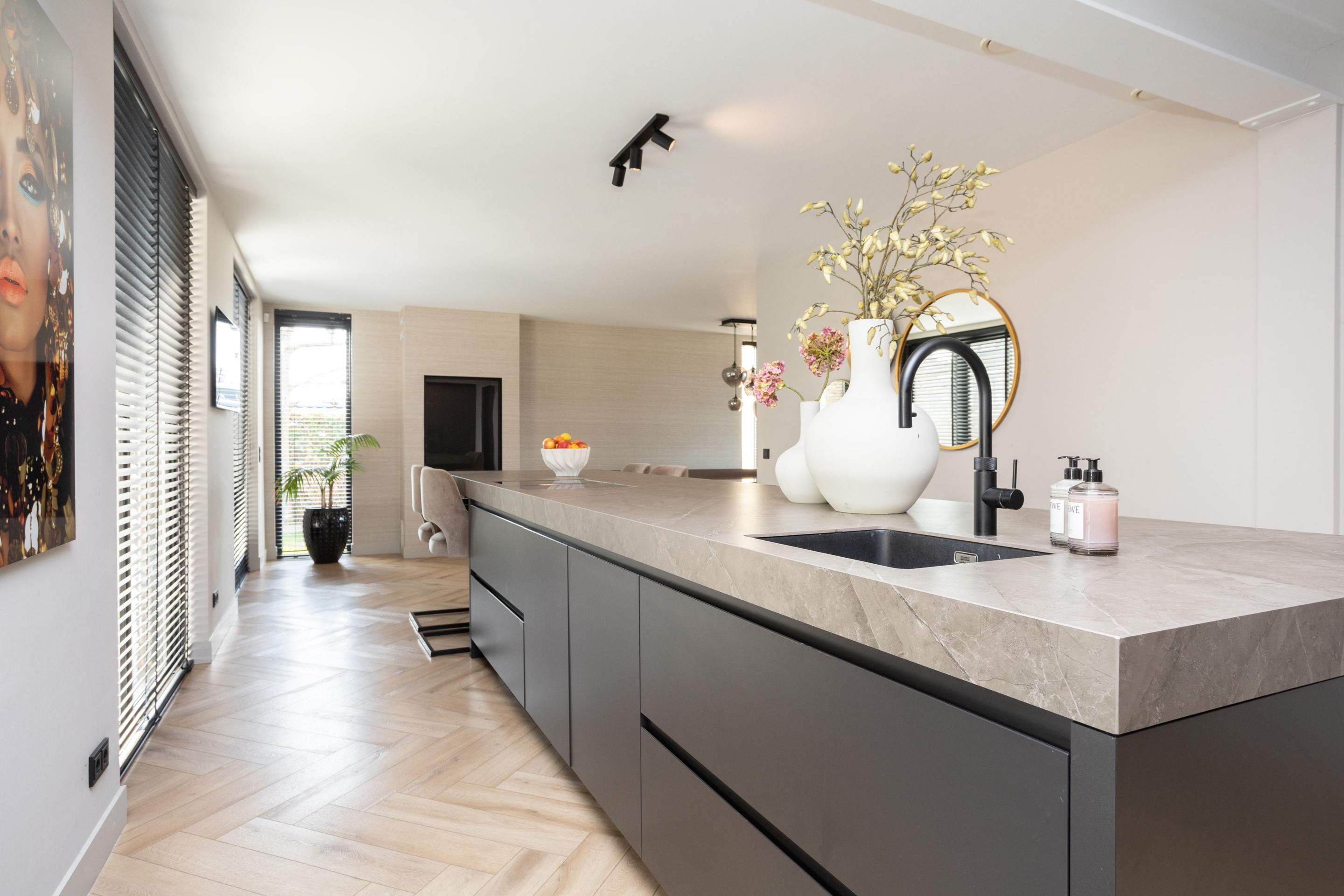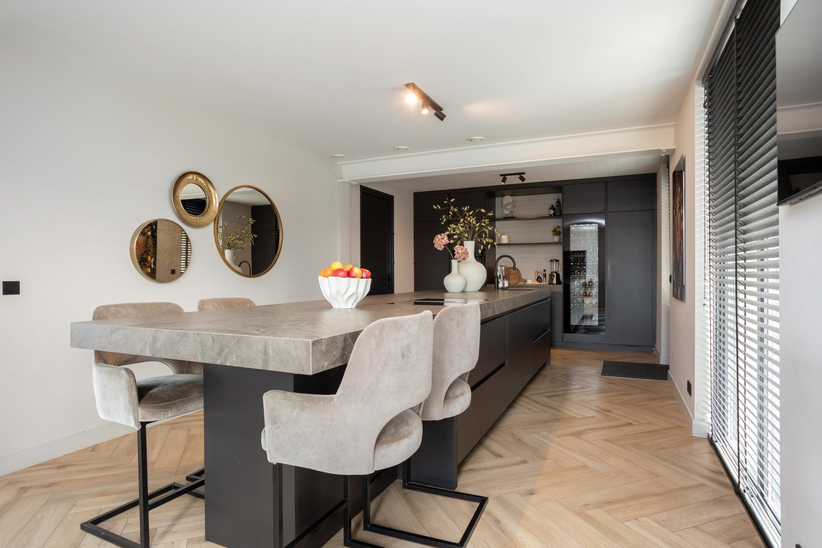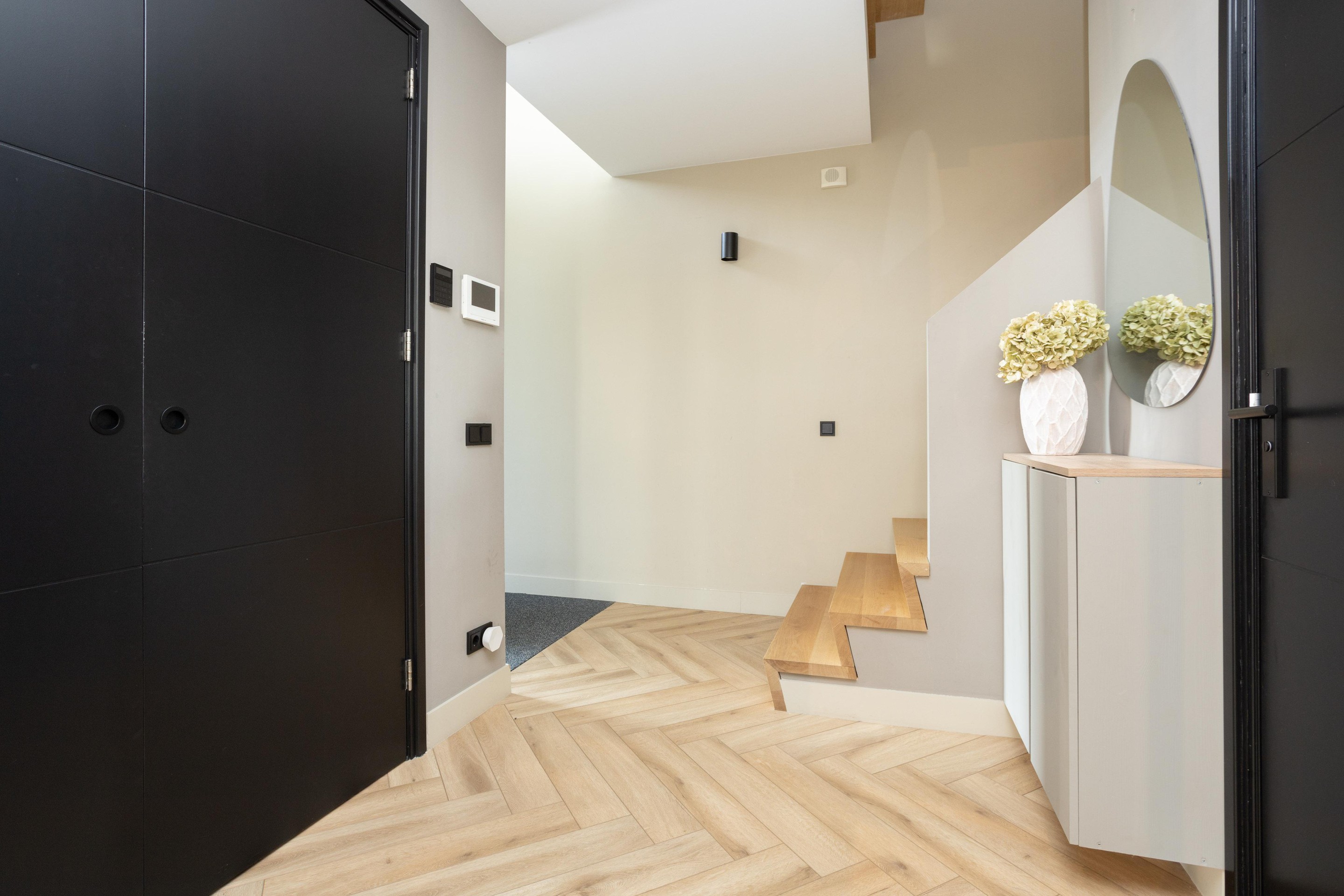 Entree, ruime hal met meterkast, garderobe luxe toilet met fonteintje en trapopgang naar de 1e verdieping. Deur naar de riante living met aan de voorzijde de woonkamer, wat direct opvalt zijn de prachtige raampartijen. Heerlijk al dat licht. Let ook op de wanden en plafond, deze zijn strak gestuukt. Op de vloer prachtig PVC in visgraat motief. De sfeervolle gashaard maakt het af. Aan de achterzijde is de royale open keuken met eiland. Dit is een prettige plek om te verblijven, van alle gemakken voorzien, strak en in een moderne stijl afgewerkt. De keuken is voorzien van een Quooker, stoomoven, oven, wijnklimaatkast, vaatwasser koelkast en een vriezer. Vanuit de keuken toegang tot de inpandige geïsoleerde garage met elektrische deur en openslaande deuren.