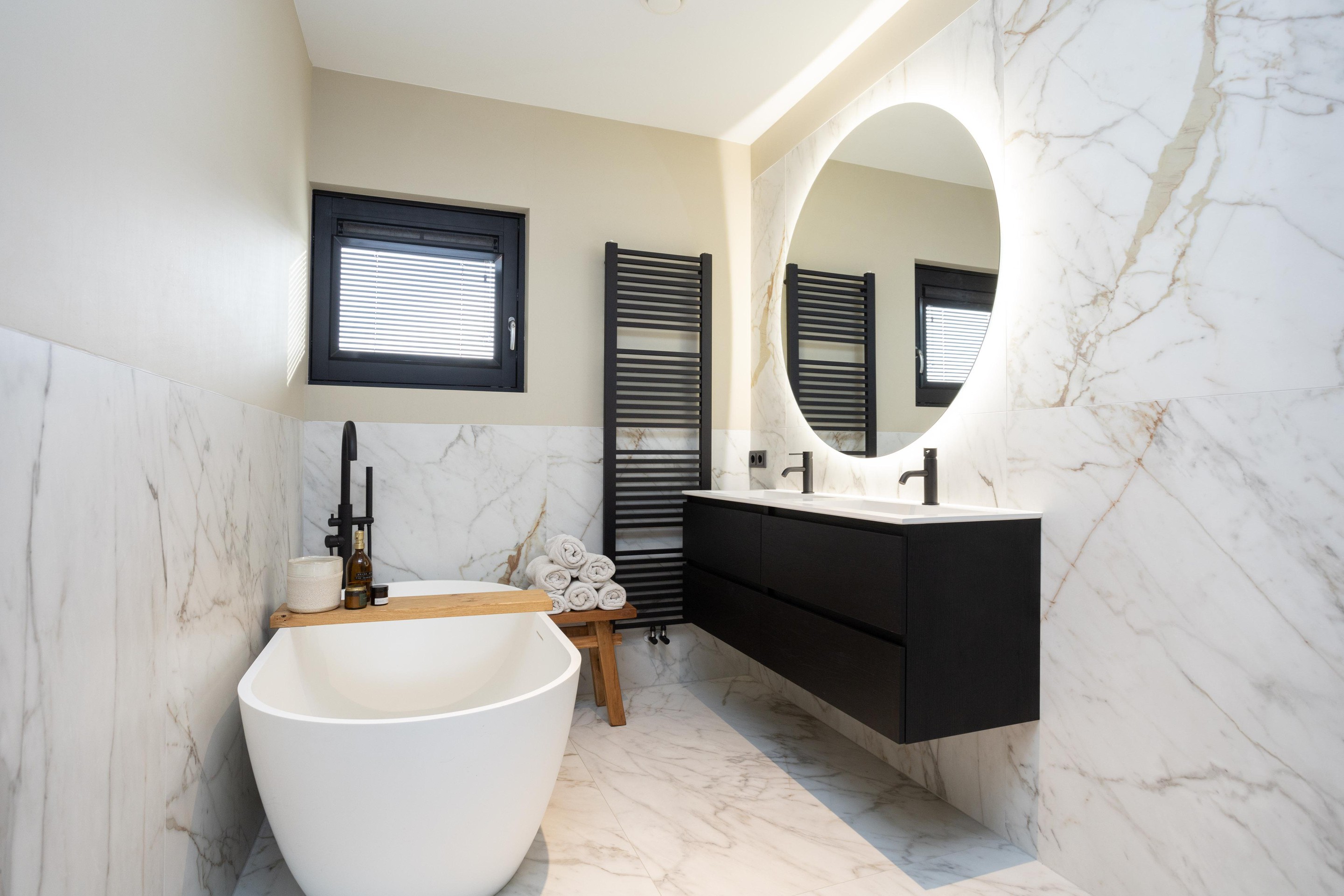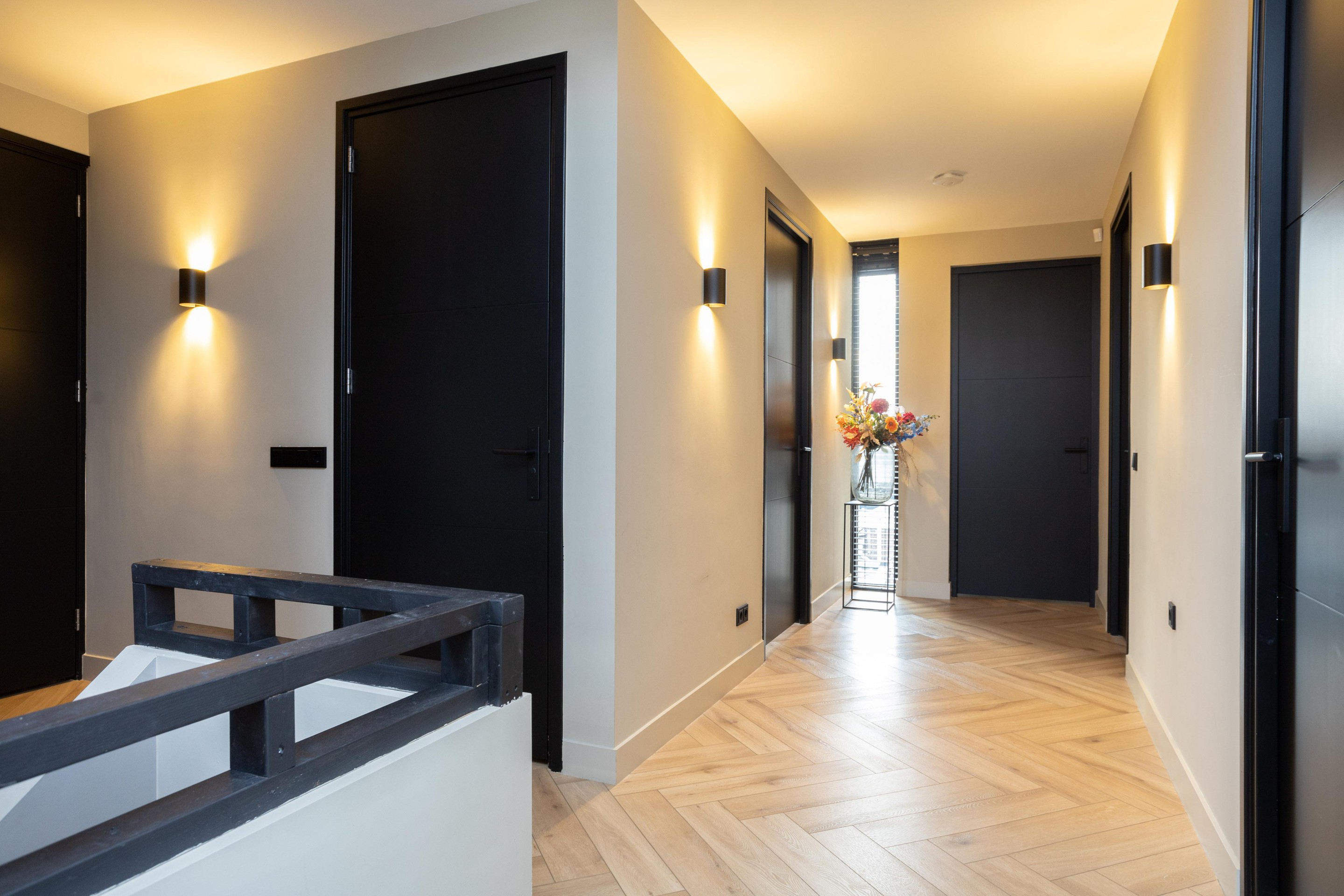 Op deze verdieping een royale overloop met 4 slaapkamers, riante waskamer, badkamer en toilet. Alles is strak afgewerkt met PVC vloer. De luxe badkamer beschikt over een ligbad, royale inloopdouche en een dubbele wastafel. Tot slot is er nog een apart toilet.