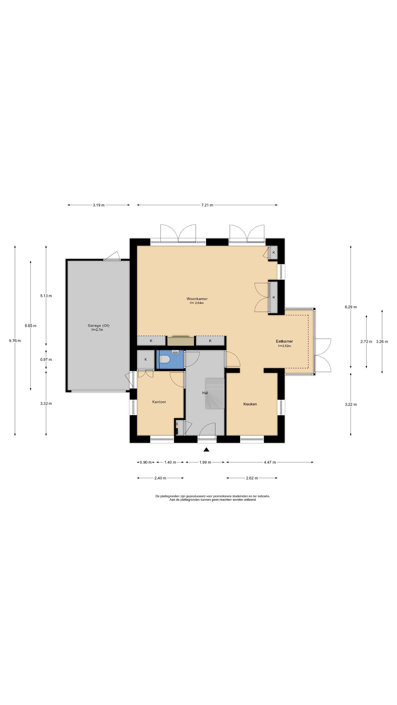 Binnenkomst in de hal met meterkast en trapopgang naar de eerste verdieping. De hal geeft toegang tot de werkkamer, het toilet en de living. De werkkamer (3.32 x 2.40) met handige inbouwkast is aan de voorzijde gesitueerd. Vanuit hier heb je toegang tot de extra grote garage (6.80 x 3.19) met elektrische deur. Het toilet is voorzien van een wandcloset en wastafel. De living (7.21 x 5.13) is geweldig! Hier zijn alle woonwensen gerealiseerd van vaste kasten, kachel, ruimte voor grote meubelen tot op twee plaatsen dubbele deuren. Deze geven je het ultieme binnen-buiten gevoel. Ook in de eetkamer (4.47 x 3.26) krijg je datzelfde gevoel, want ook hier heb je de mogelijkheid om de dubbele deuren open te zetten op een mooie zomerse dag. De half open keuken (3.22 x 2.62) past perfect in het hele plaatje met een hardstenen werkblad en de houten afwerking van de kastruimte. Uiteraard is de keuken voorzien van diverse inbouwapparatuur. Tijdens het koken kijk je hier heerlijk uit over de singel.
