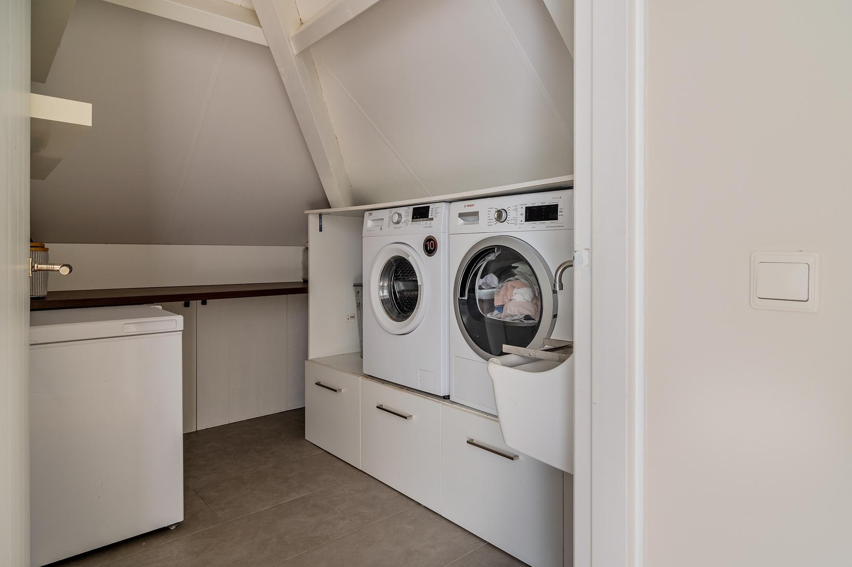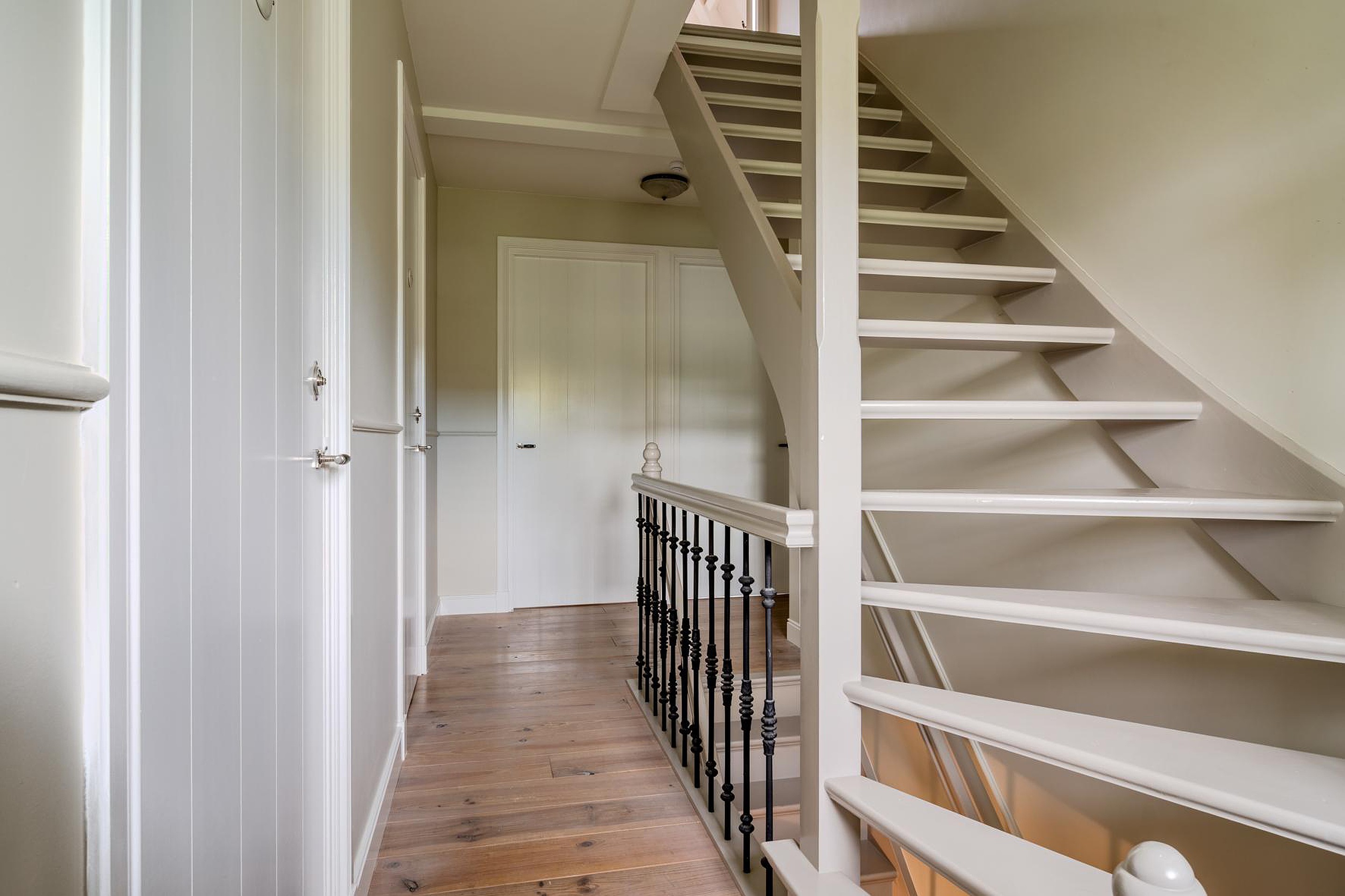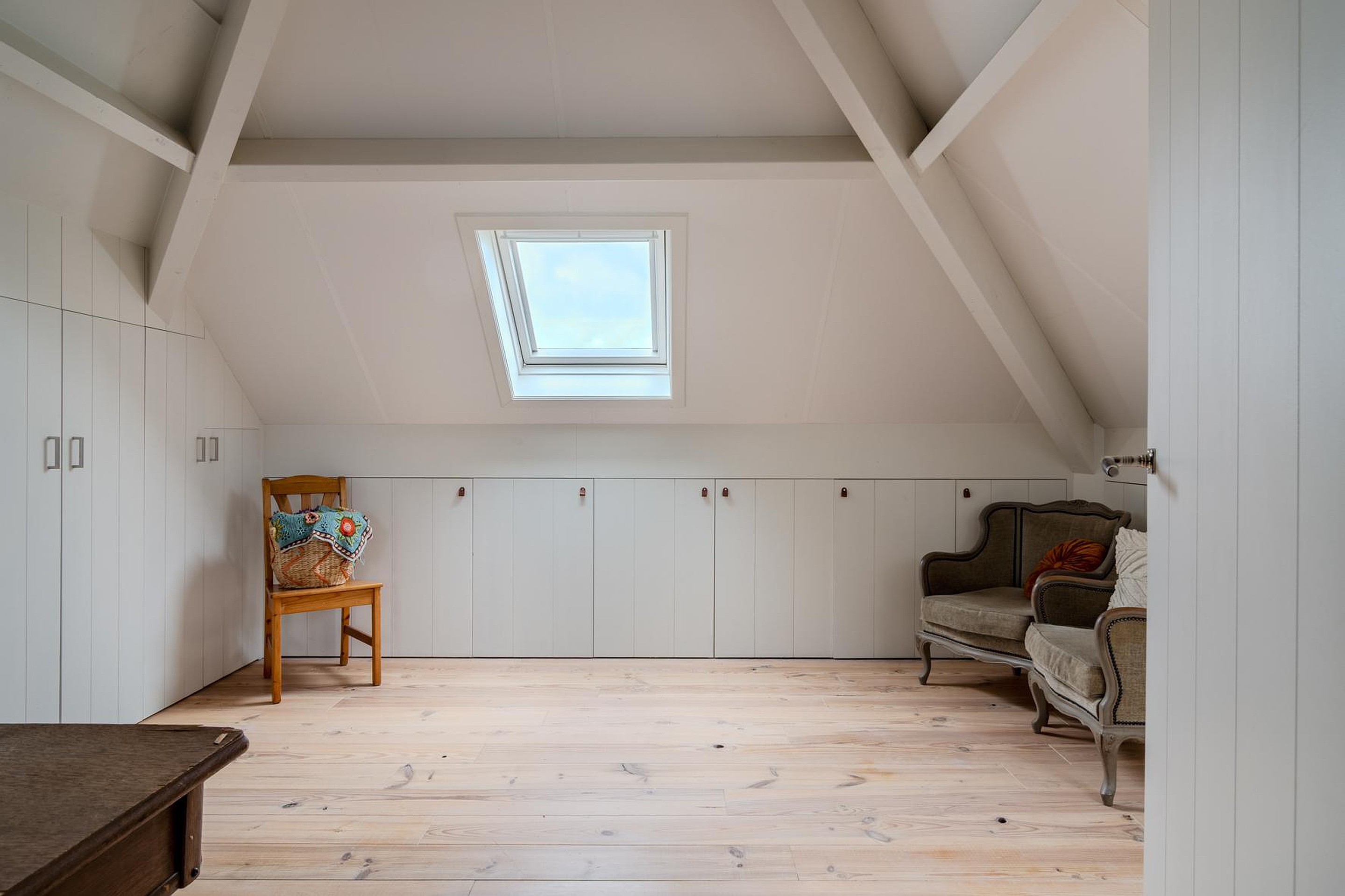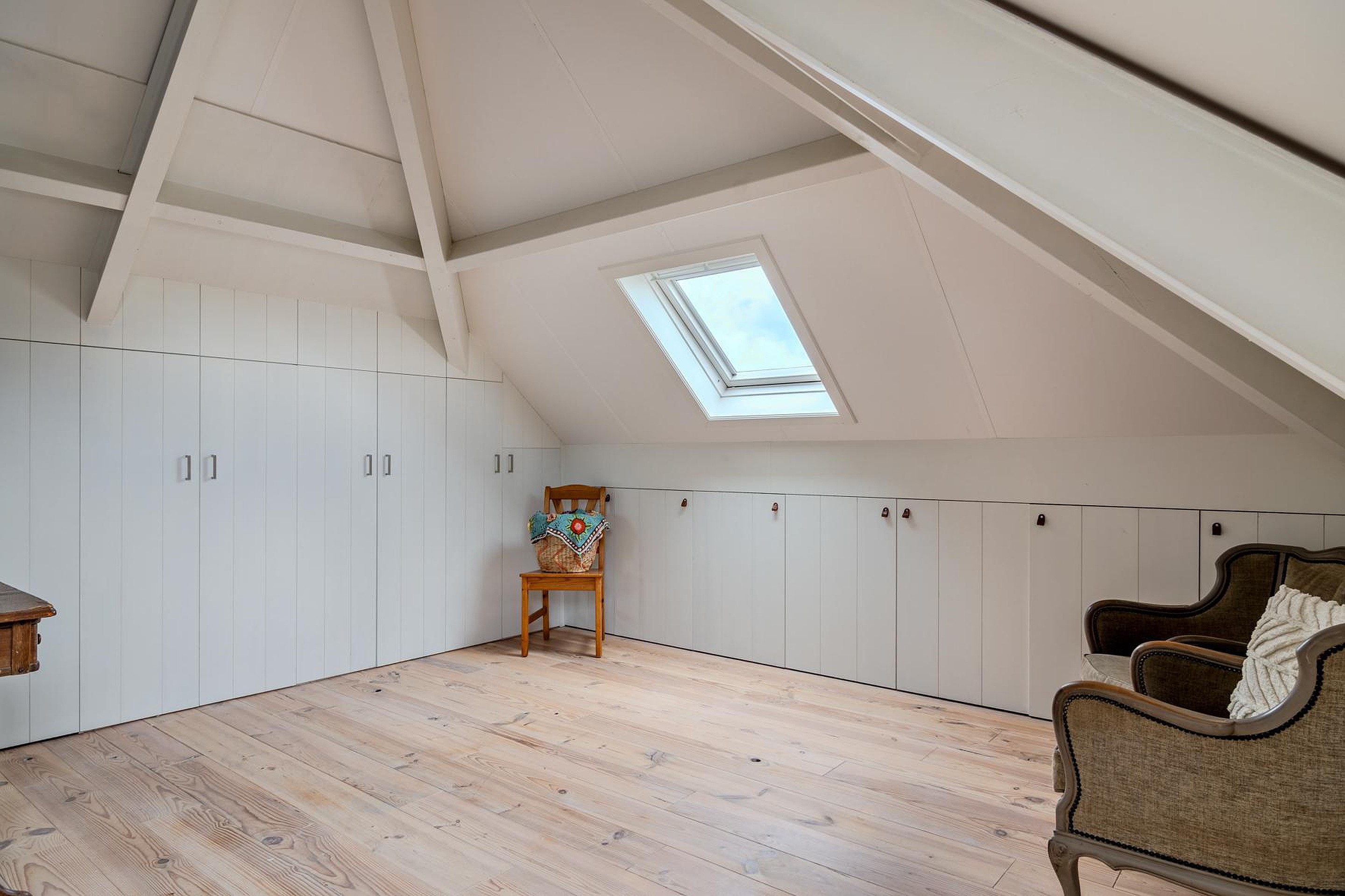 Met een vaste trap kom je op de overloop van de tweede verdieping. De vrije ruimte is perfect voor een vierde slaapkamer (4.08 x 3.50) en is volledig voorzien van op maat gemaakte inbouwkasten onder de schotten van het schuine dak. In de kasten is ook de opstelplaats van de cv-ketel die gebruikt wordt voor warm water en doorstroomfunctie vanaf de cv-kachel/haard. Er is ook extra vrije ruimte toegankelijk via deze kamer (3.76 x 1.44). Vanaf de overloop heb je ook toegang tot de wasruimte (2.79 x 2.46) met de opstelplaats van de wasmachine en droger en toegang tot de inbouwkasten. Rondom de gehele tweede verdieping heb je dus enorm veel bergruimte.