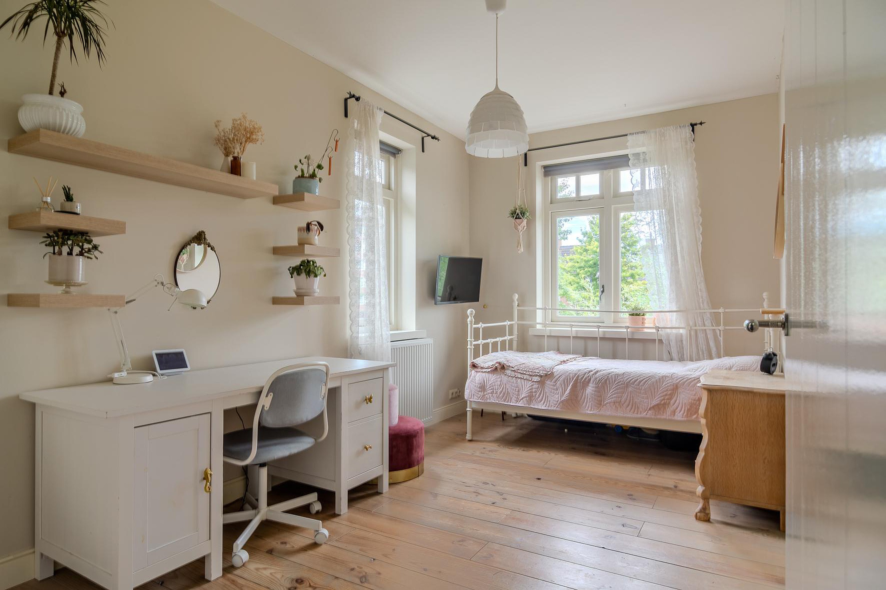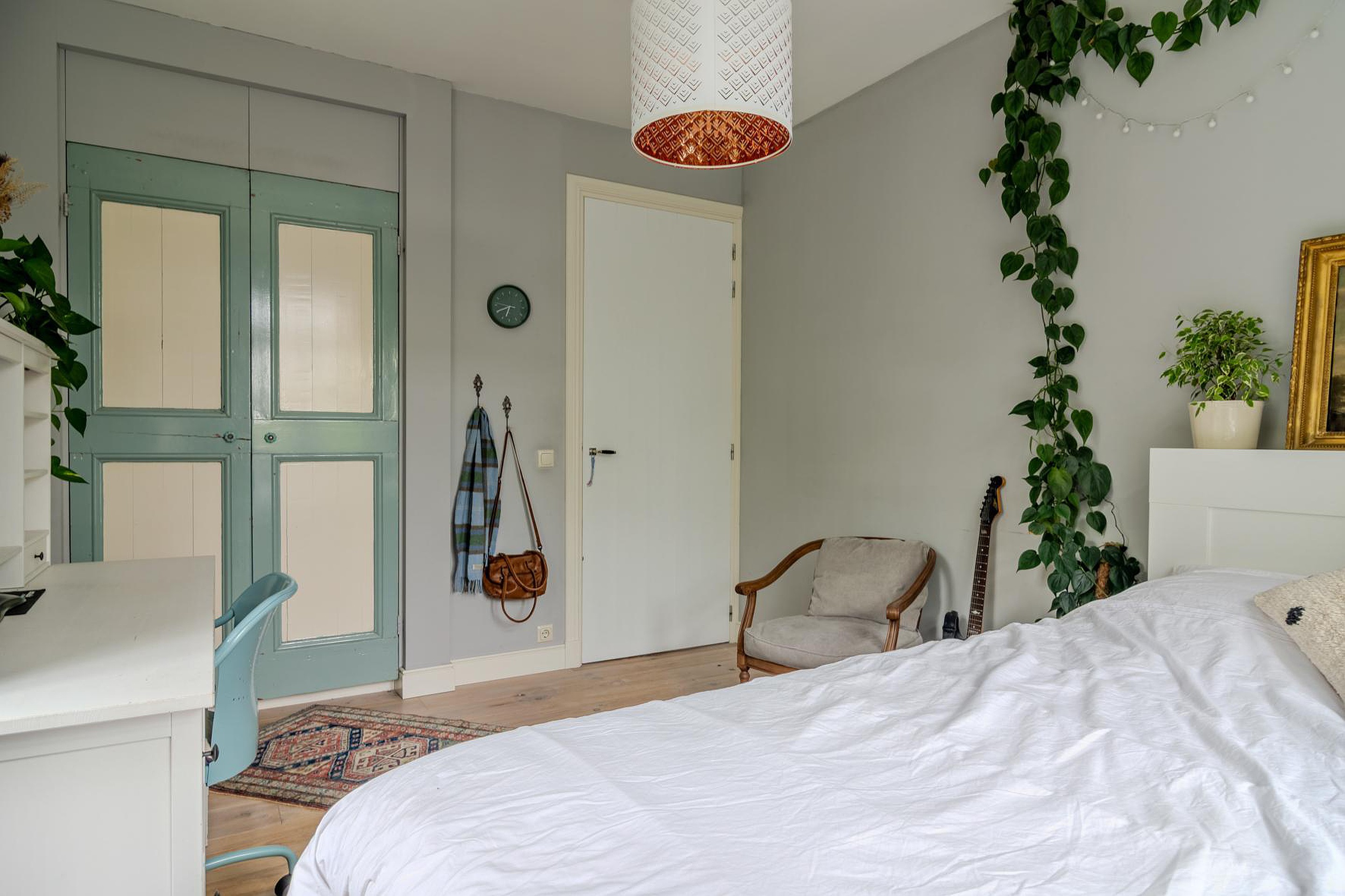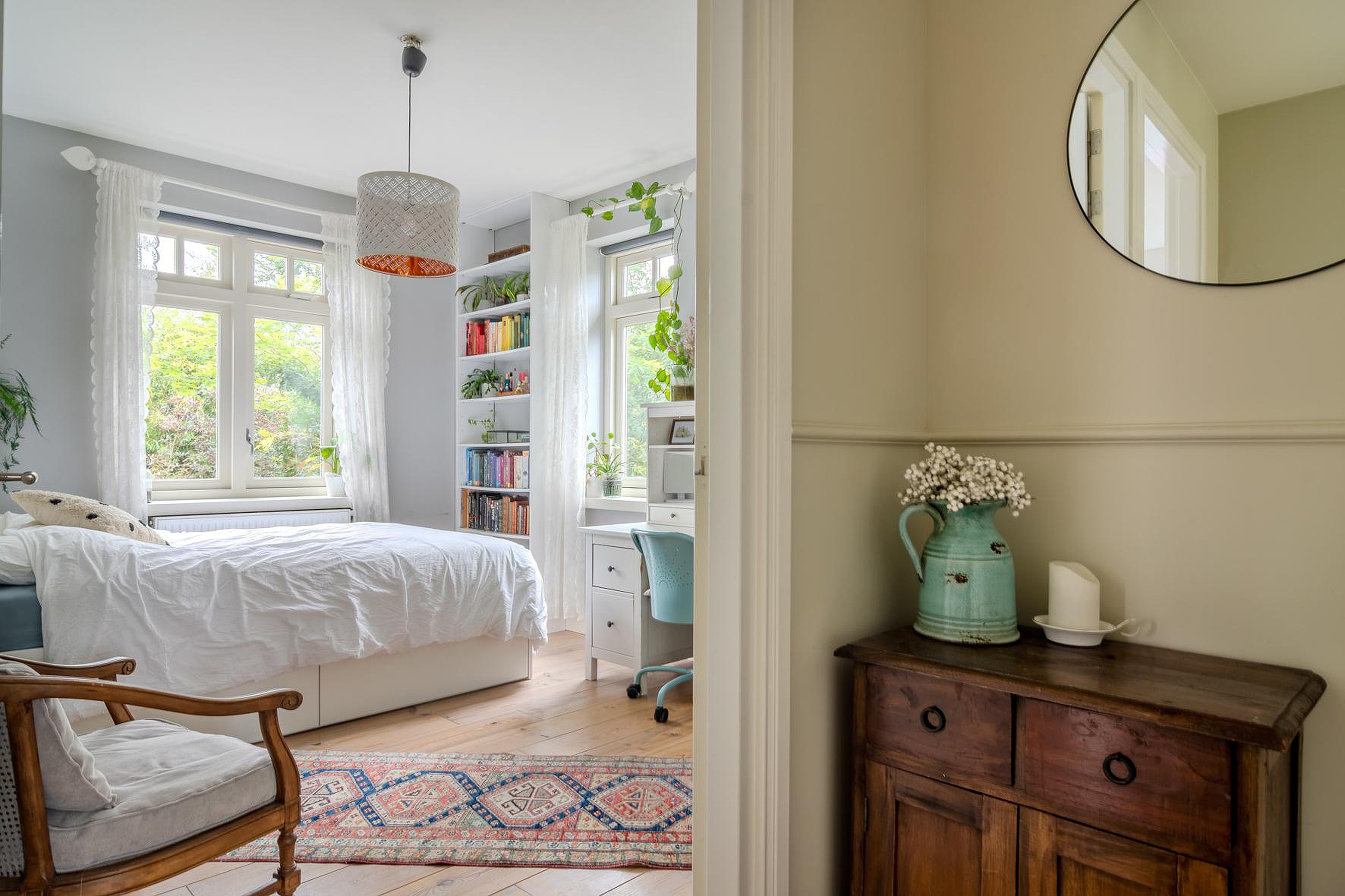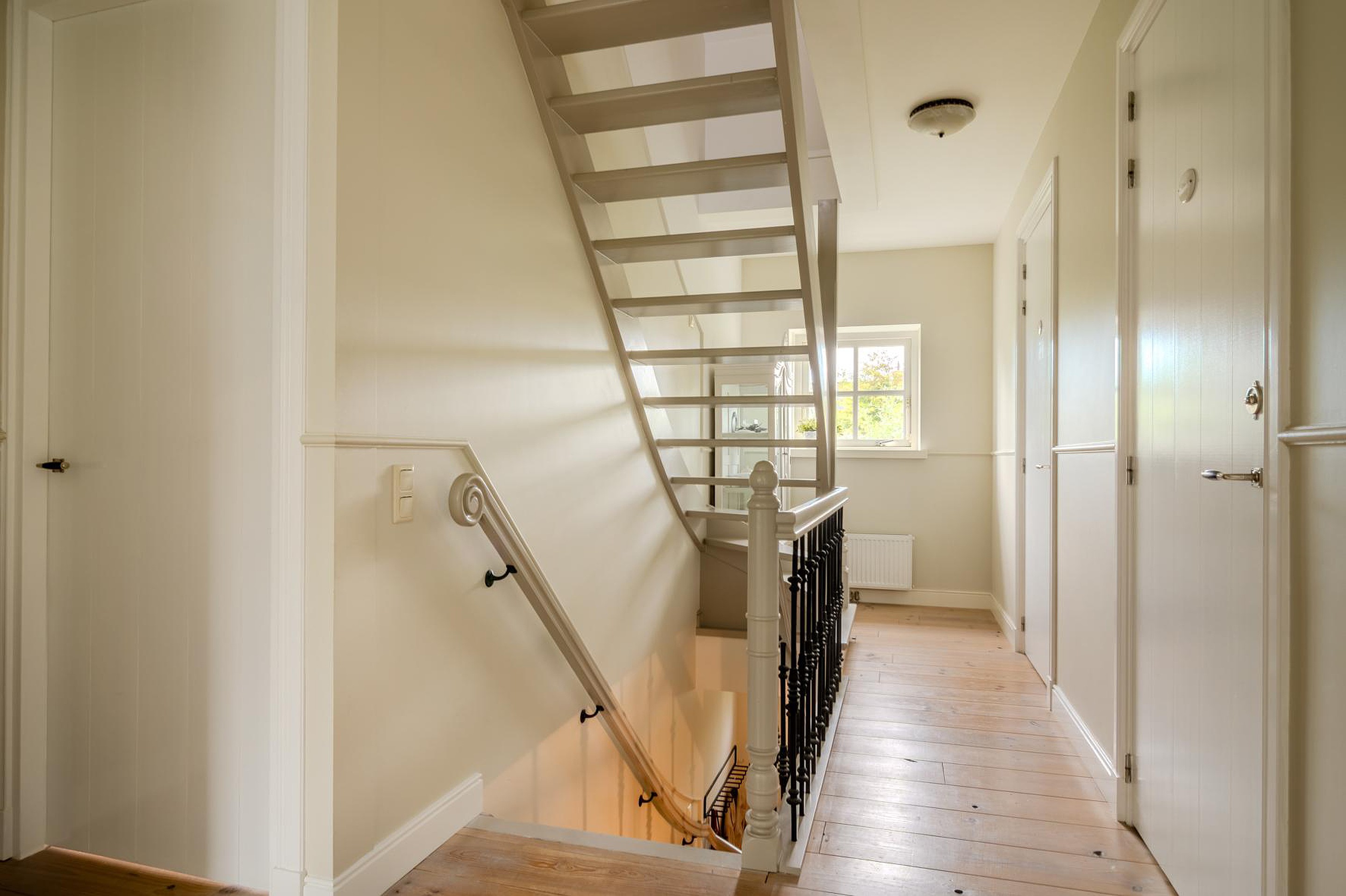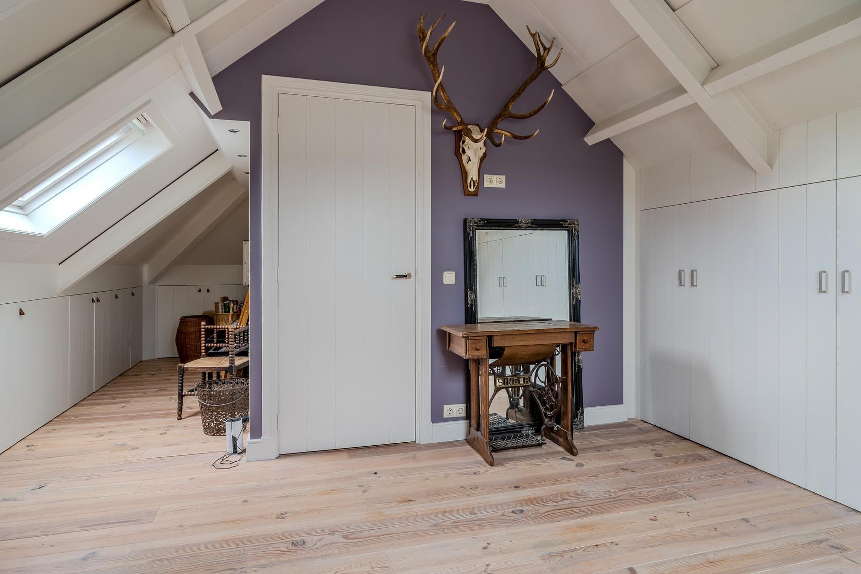 Met een vaste trap kom je op de overloop van de tweede verdieping. De vrije ruimte is perfect voor een vierde slaapkamer (4.08 x 3.50) en is volledig voorzien van op maat gemaakte inbouwkasten onder de schotten van het schuine dak. In de kasten is ook de opstelplaats van de cv-ketel die gebruikt wordt voor warm water en doorstroomfunctie vanaf de cv-kachel/haard. Er is ook extra vrije ruimte toegankelijk via deze kamer (3.76 x 1.44). Vanaf de overloop heb je ook toegang tot de wasruimte (2.79 x 2.46) met de opstelplaats van de wasmachine en droger en toegang tot de inbouwkasten. Rondom de gehele tweede verdieping heb je dus enorm veel bergruimte.