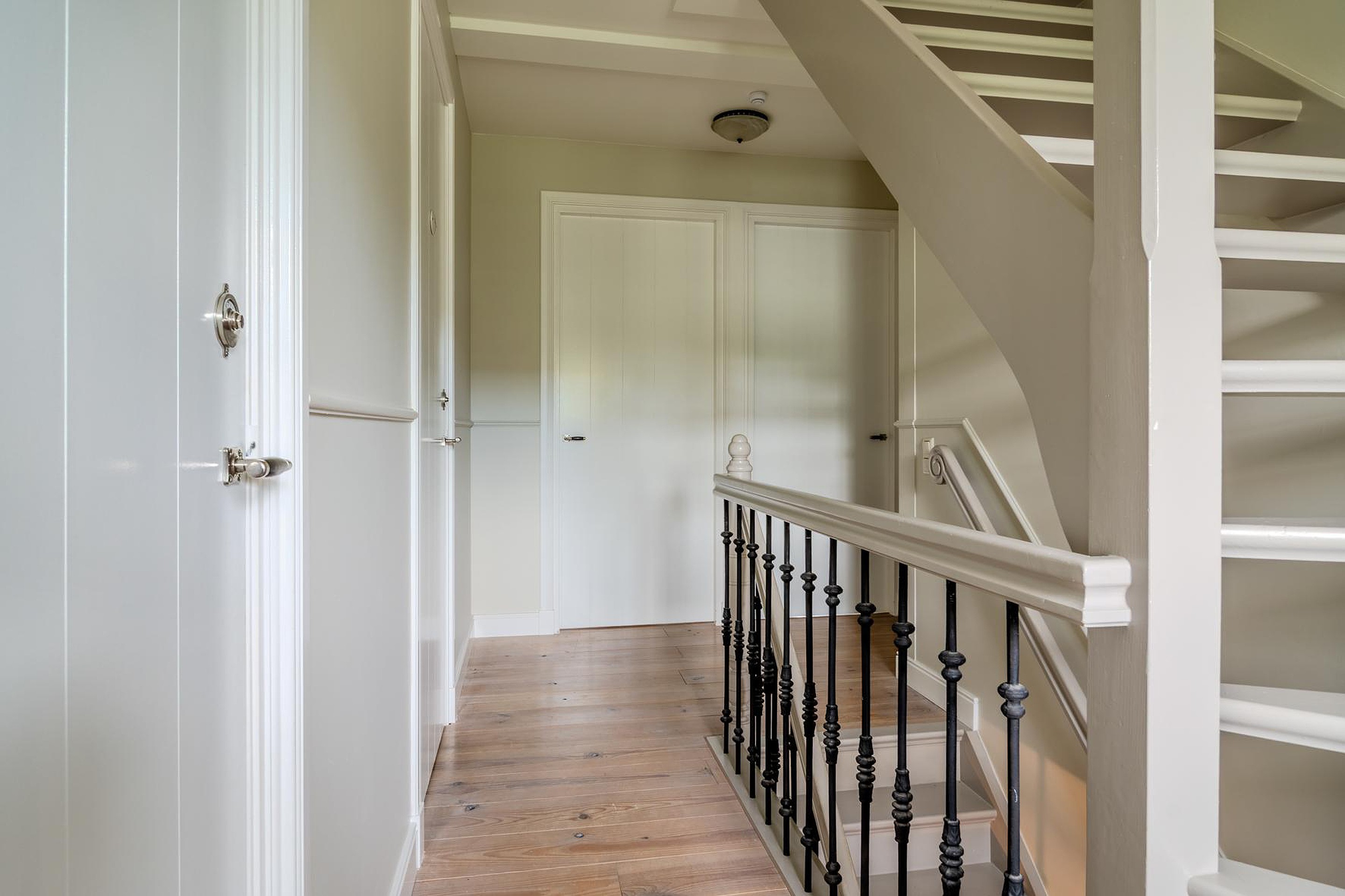 Op de eerste verdieping geeft de overloop toegang tot drie slaapkamers, badkamer en het tweede toilet. Aan de achterzijde twee ruime slaapkamers (4.00 x 3.98 en 3.16 x 3.98), beide voorzien van praktische inbouwkasten. Aan de voorzijde de derde slaapkamer (4.39 x 2.64) met inbouwkast en de badkamer (4.39 x 2.54). De badkamer is voorzien van een hardstenen vloer, vrijstaand ligbad, wastafel en inloopdouche. Het tweede toilet is in dezelfde stijl als beneden afgewerkt met een wandcloset en wastafel.
