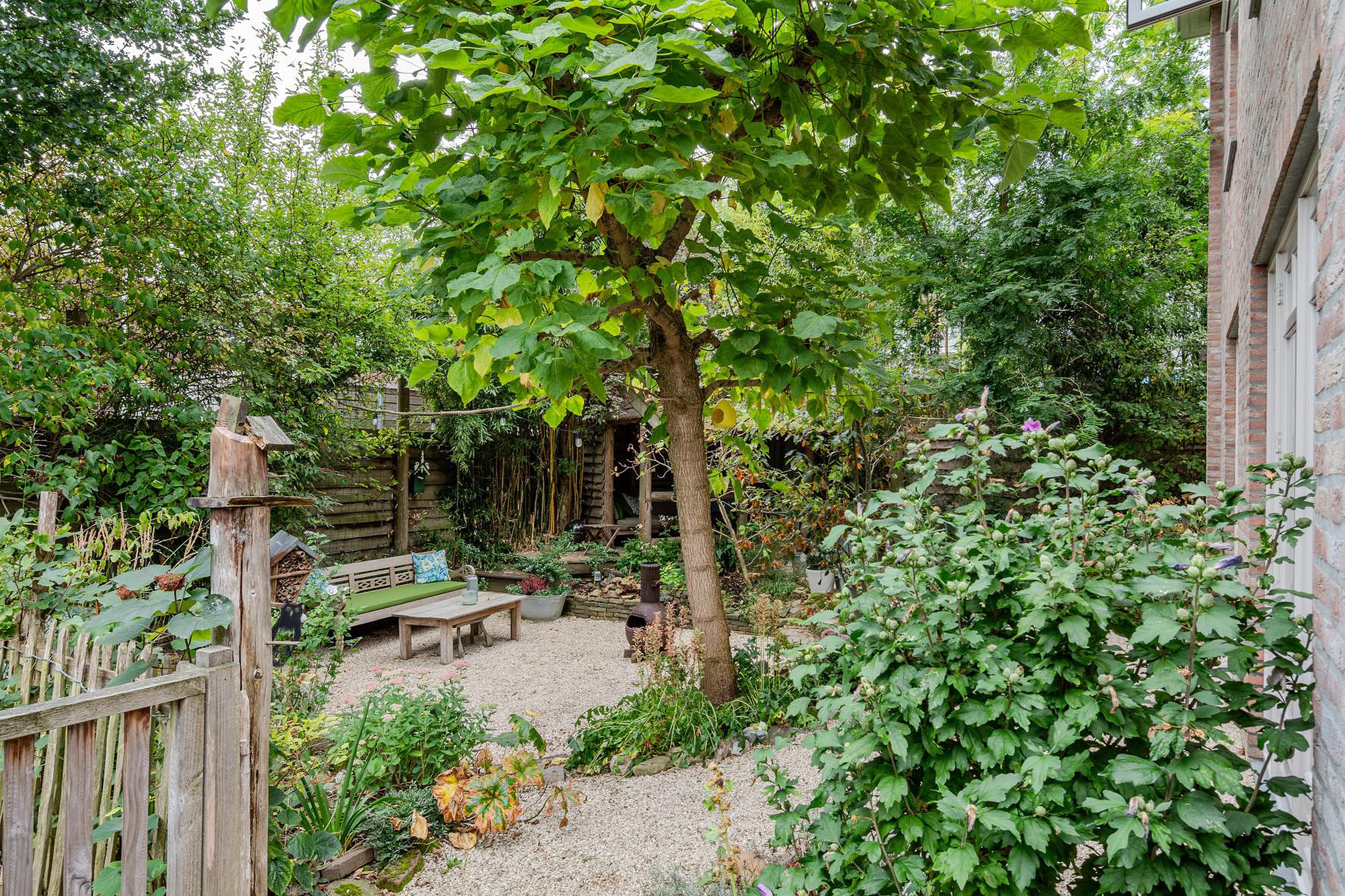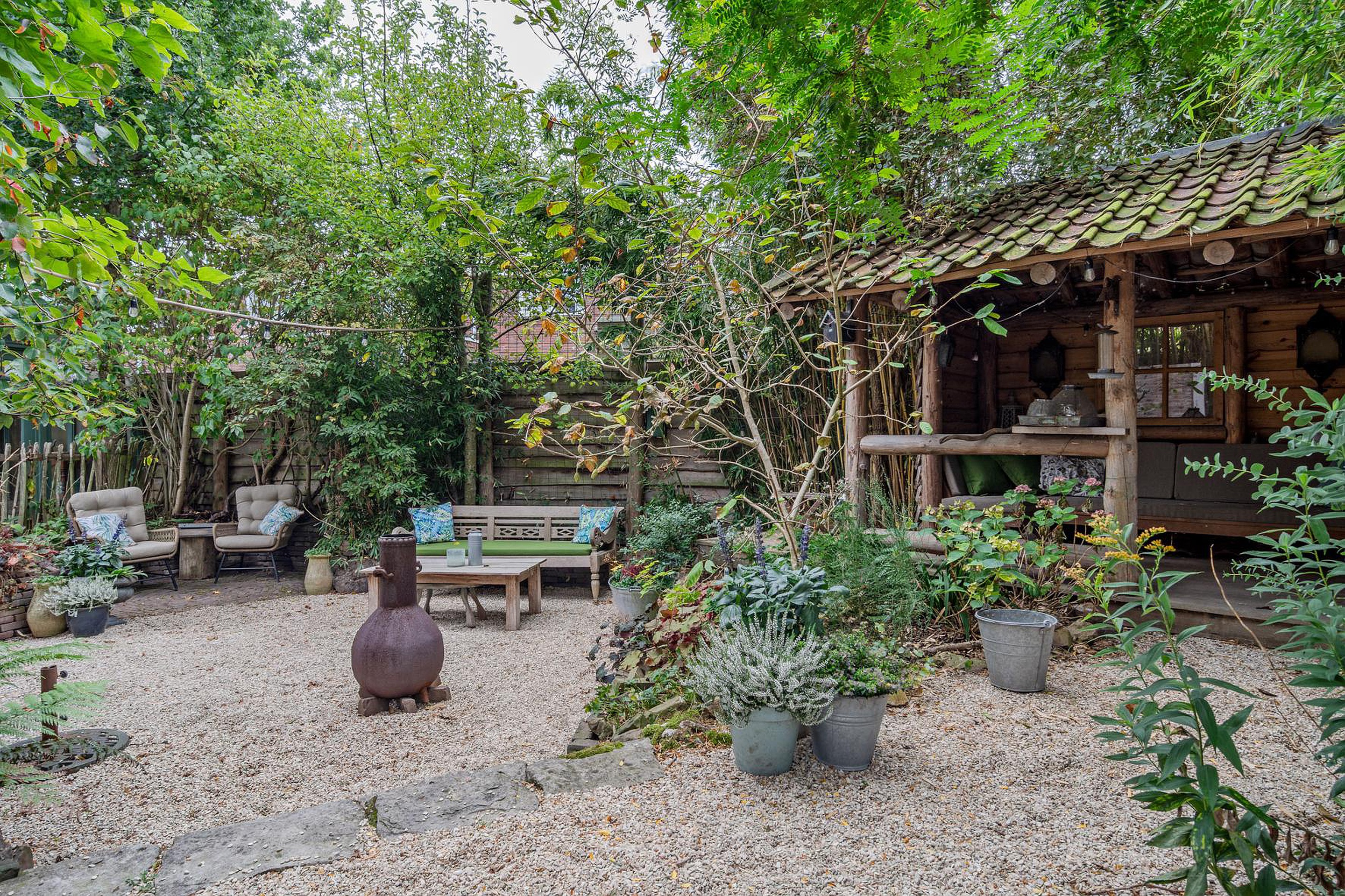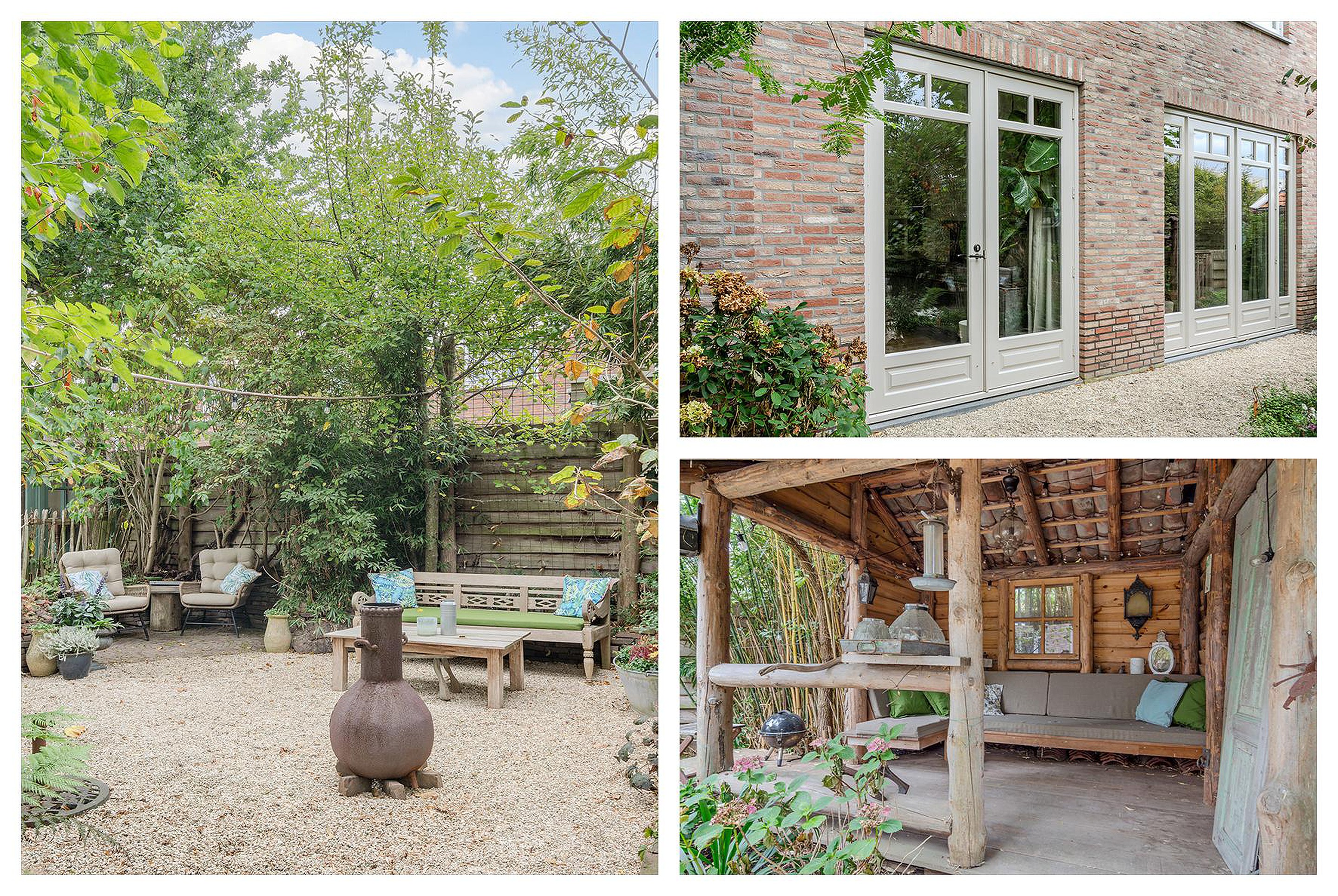 En dan nog de tuin rondom! Ook weer perfect afgestemd op de woning met het gebruik van diverse natuurlijke materialen, knusse zithoekjes, hobbykas(berging) en overkapping. Verder heb je in de voortuin de ruimte om twee auto's te parkeren op eigen grond.