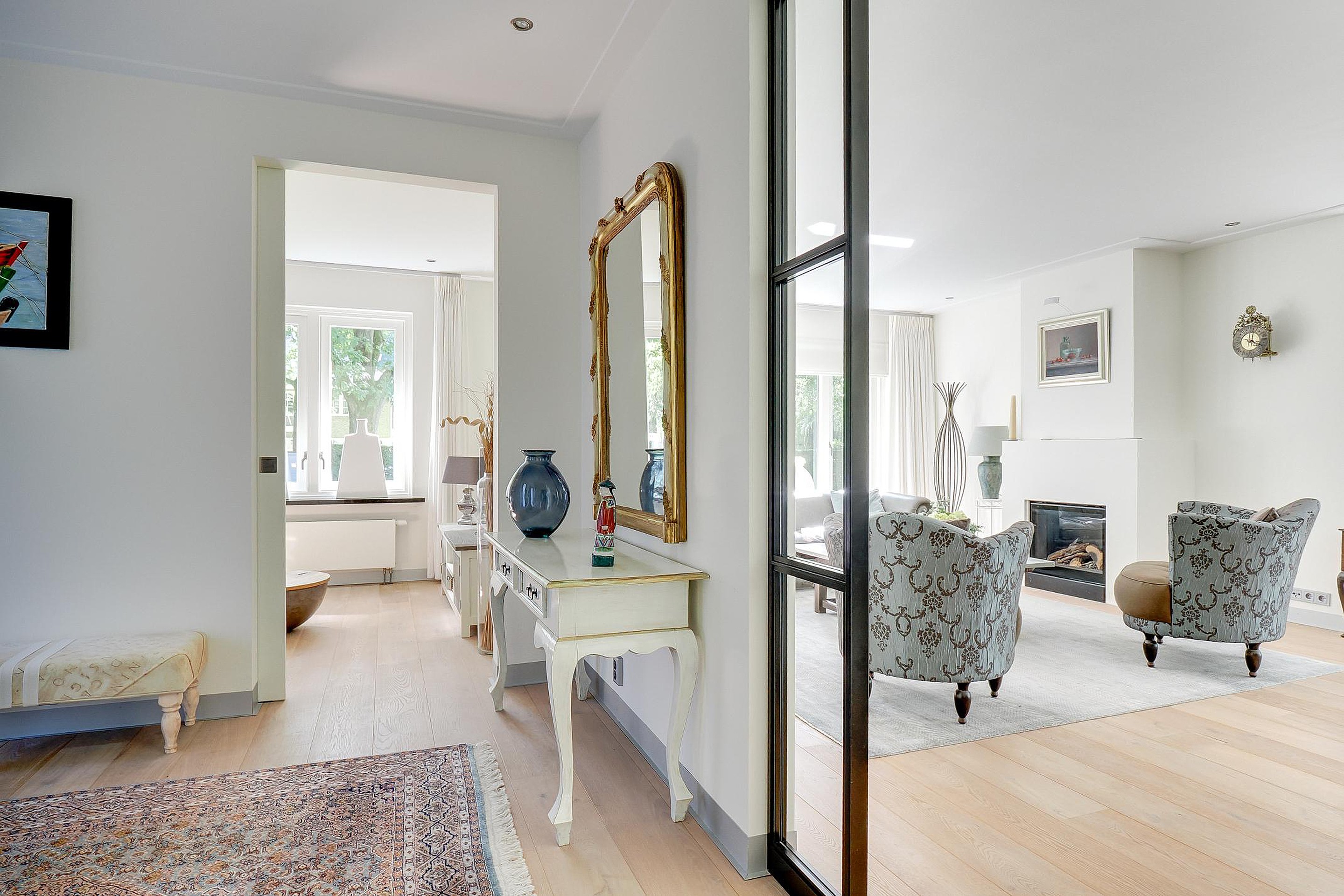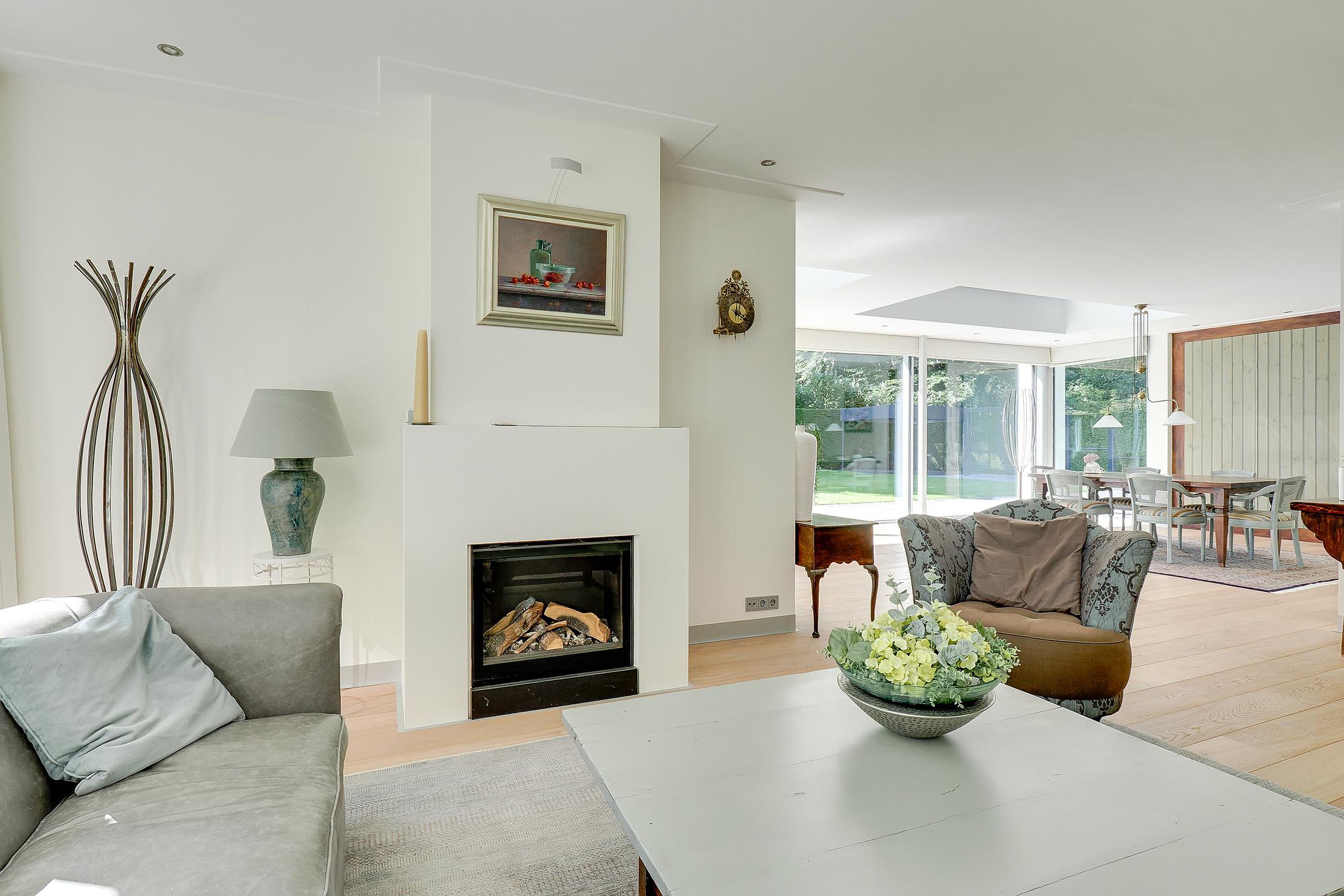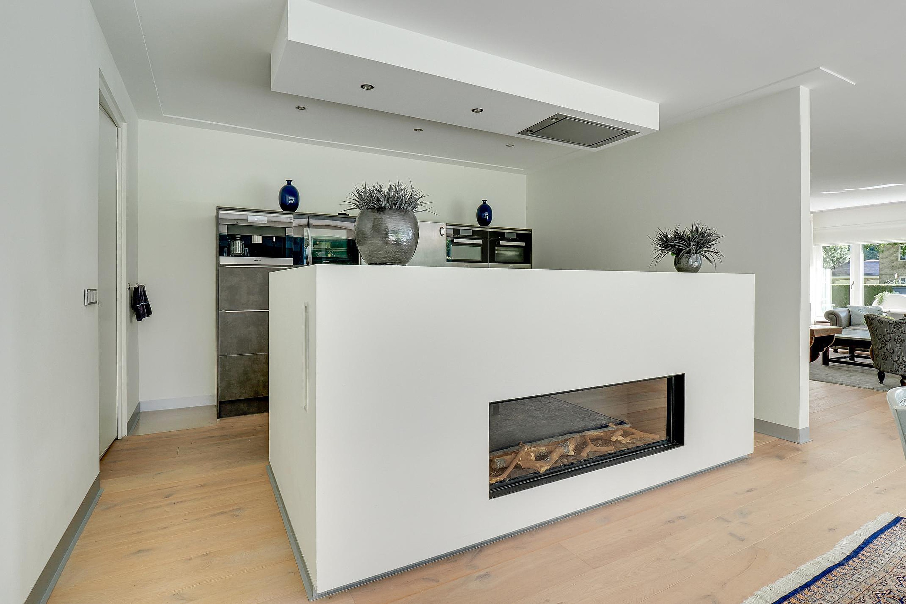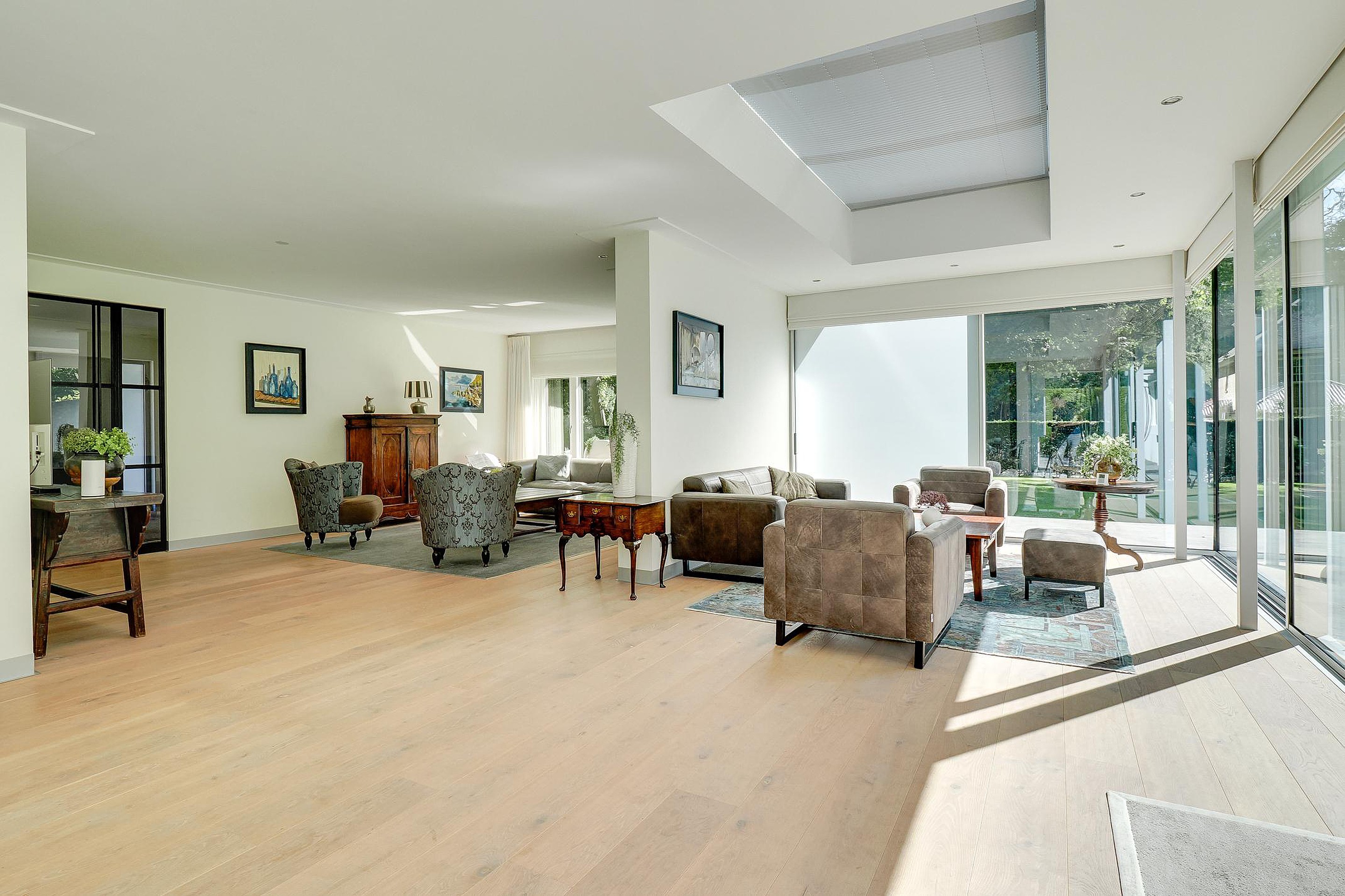 Je komt binnen in een ruime entree met stoere opslaande glasdeuren naar de woonvertrekken. Van hieruit wandel je de woonkamer binnen. Hier ligt een eiken houten vloer met vloerverwarming, lekker aangenaam en duurzaam. De woonkamer baadt in het licht door het vele glas. Schuifdeuren en ramen van vloer tot plafond verbinden de leefruimtes vloeiend met het terras en de tuin. Vooral de grote ramen laten het groen naar binnen komen. De gashaarden zorgen voor gezelligheid in de wat guurdere dagen. De open keuken is modern en voorzien van de beste apparatuur (Miele) incl. een wijnkoeler. Terwijl je kookt, hou je fijn contact met je dierbaren. Aan de zijde van de keuken loop je via de deur naar de Master bedroom met eigen royale walk-in closet en luxe badkamer. Hier slaap je aan de achterzijde en daarom altijd rust gewaarborgd. De aangrenzende luxe sfeervolle badkamer bevat een dubbele wastafel, een ruime inloopdouche en een bad met gashaard. Badderen wordt zo een ultieme wellnes ervaring.