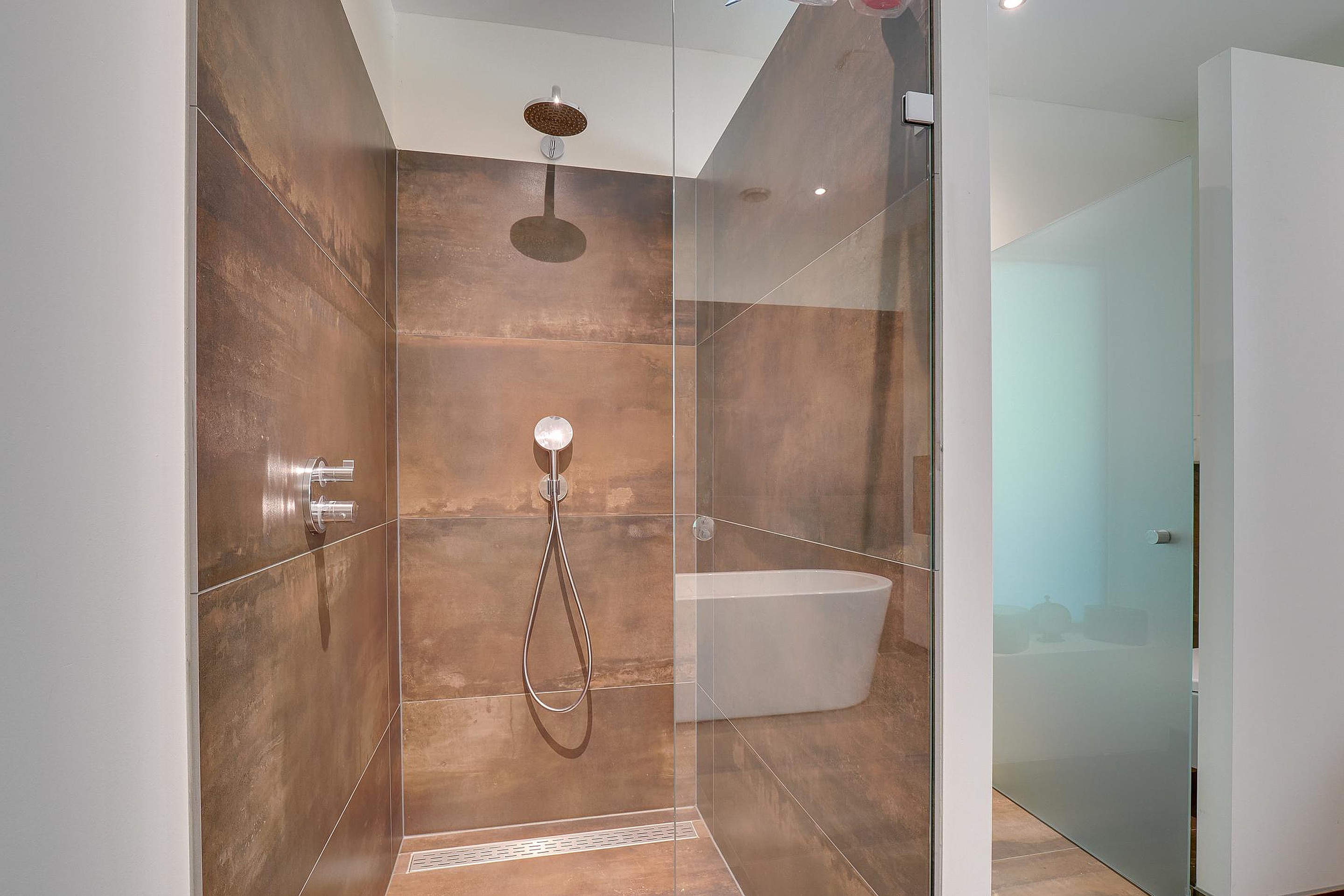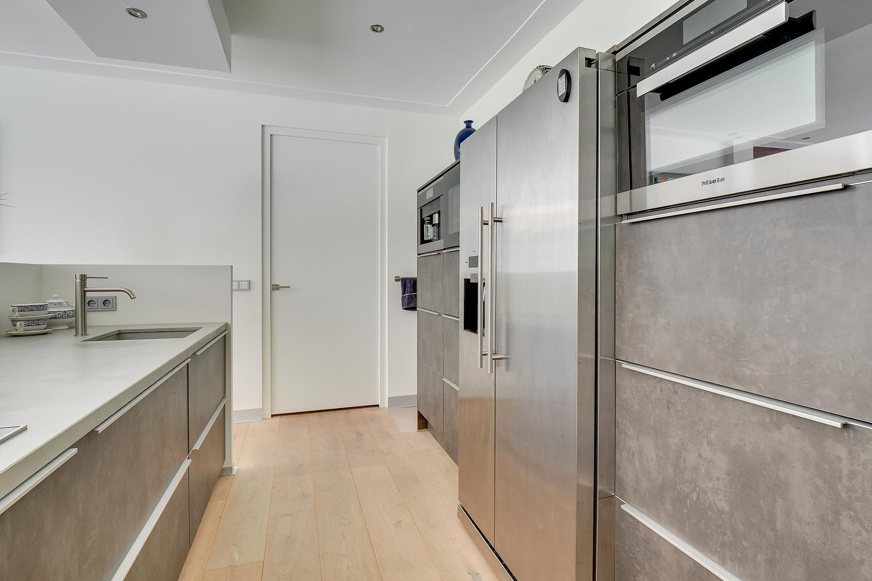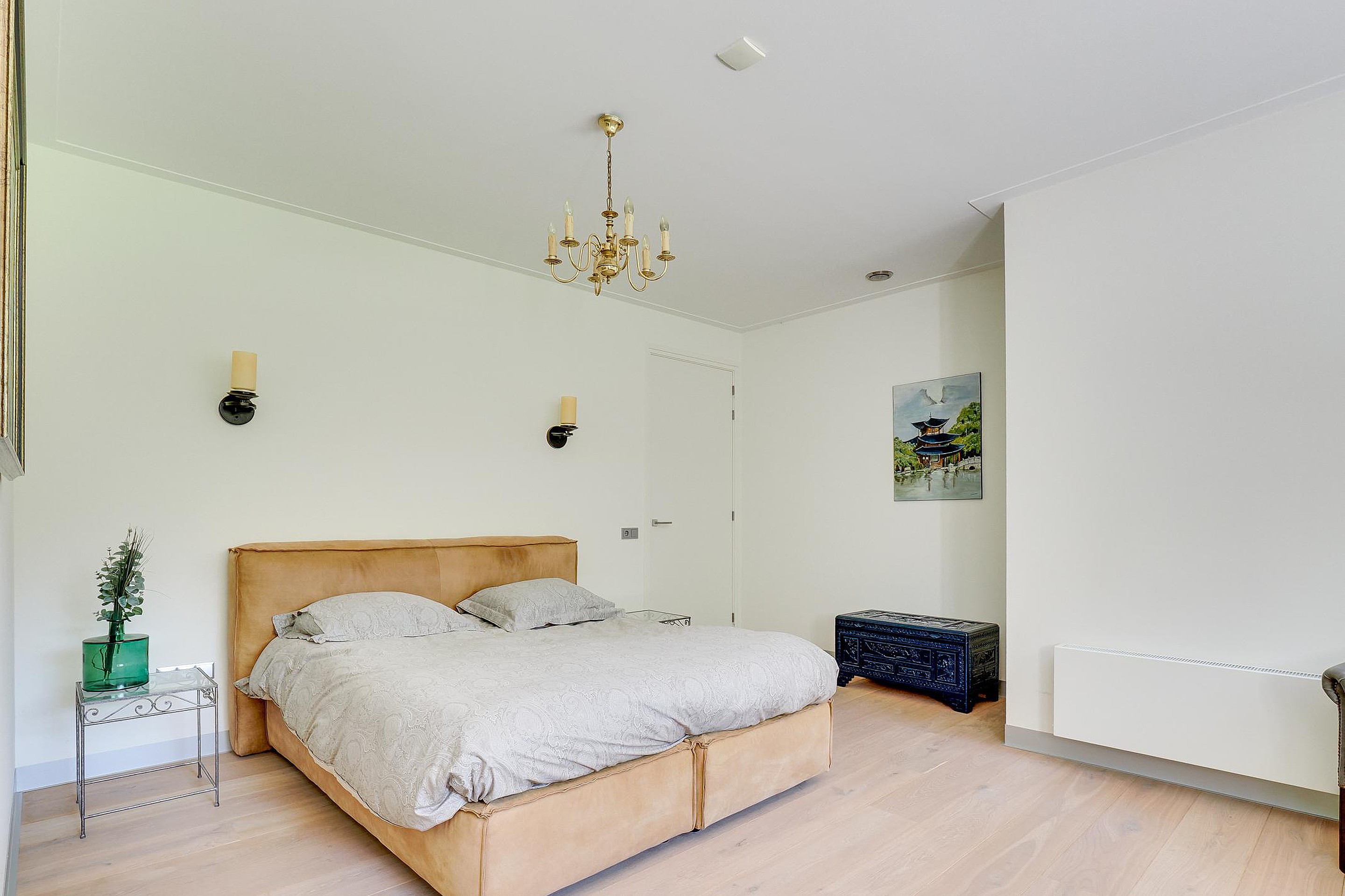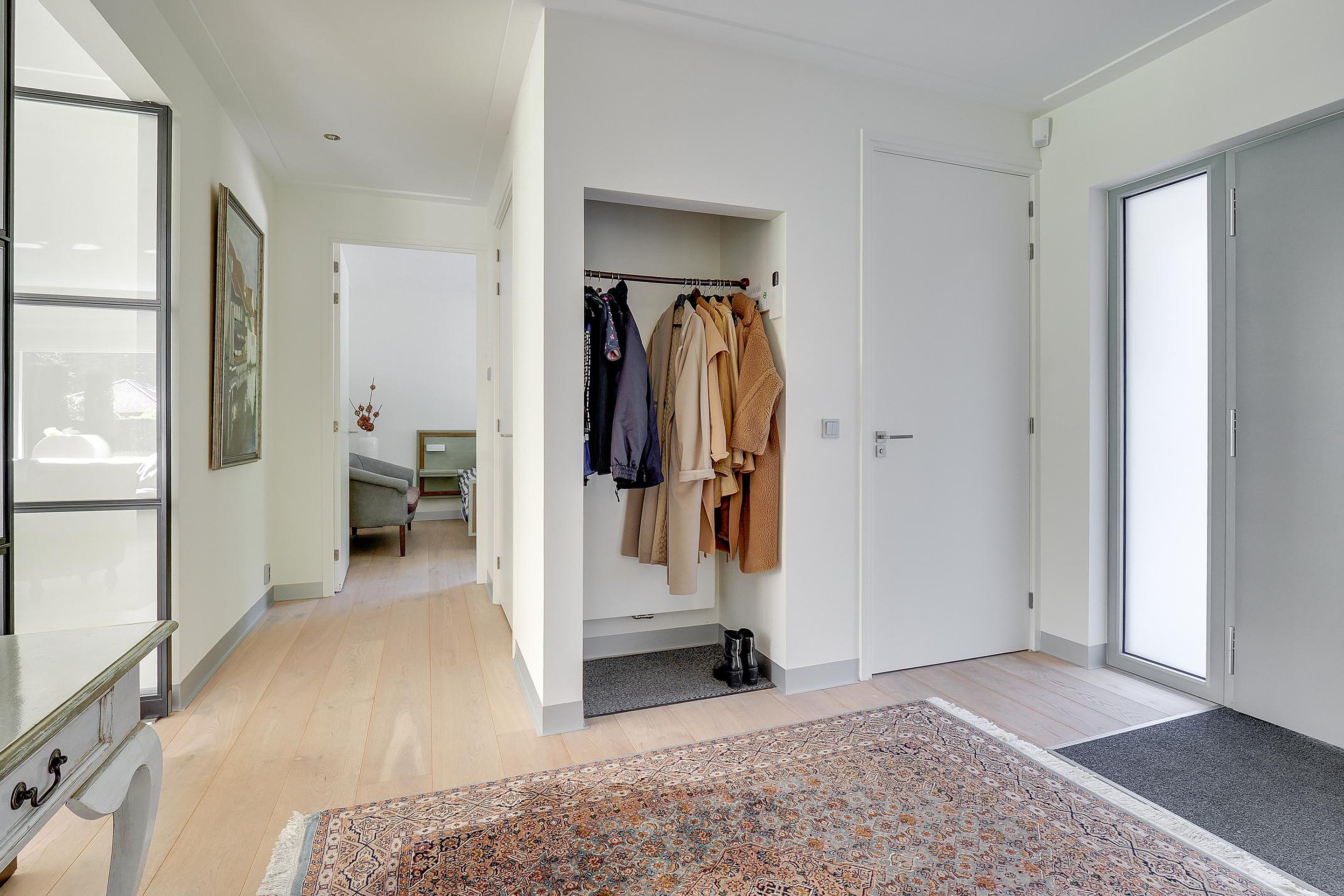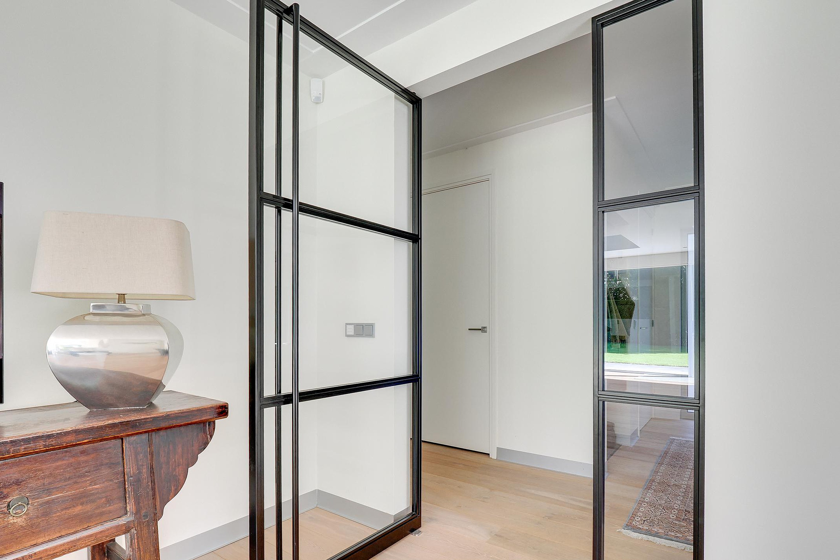 Je komt binnen in een ruime entree met stoere opslaande glasdeuren naar de woonvertrekken. Van hieruit wandel je de woonkamer binnen. Hier ligt een eiken houten vloer met vloerverwarming, lekker aangenaam en duurzaam. De woonkamer baadt in het licht door het vele glas. Schuifdeuren en ramen van vloer tot plafond verbinden de leefruimtes vloeiend met het terras en de tuin. Vooral de grote ramen laten het groen naar binnen komen. De gashaarden zorgen voor gezelligheid in de wat guurdere dagen. De open keuken is modern en voorzien van de beste apparatuur (Miele) incl. een wijnkoeler. Terwijl je kookt, hou je fijn contact met je dierbaren. Aan de zijde van de keuken loop je via de deur naar de Master bedroom met eigen royale walk-in closet en luxe badkamer. Hier slaap je aan de achterzijde en daarom altijd rust gewaarborgd. De aangrenzende luxe sfeervolle badkamer bevat een dubbele wastafel, een ruime inloopdouche en een bad met gashaard. Badderen wordt zo een ultieme wellnes ervaring.