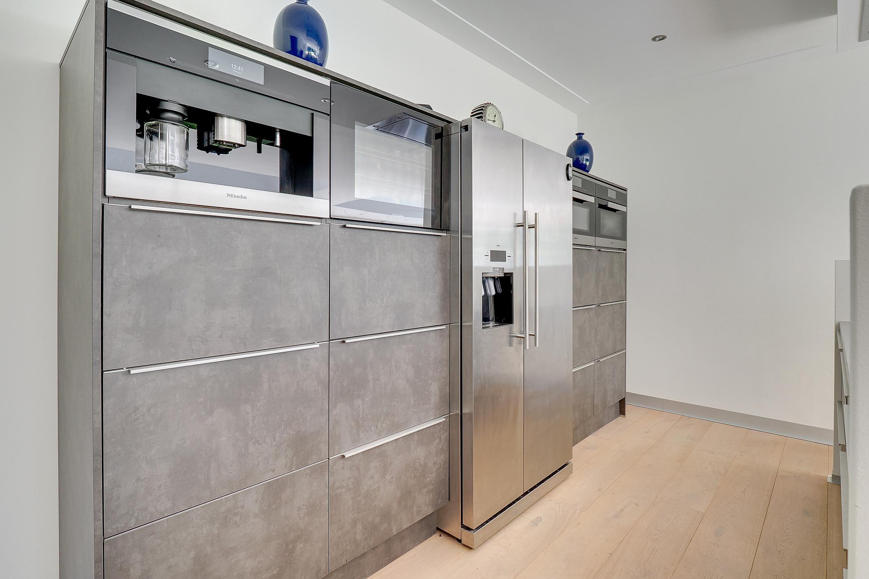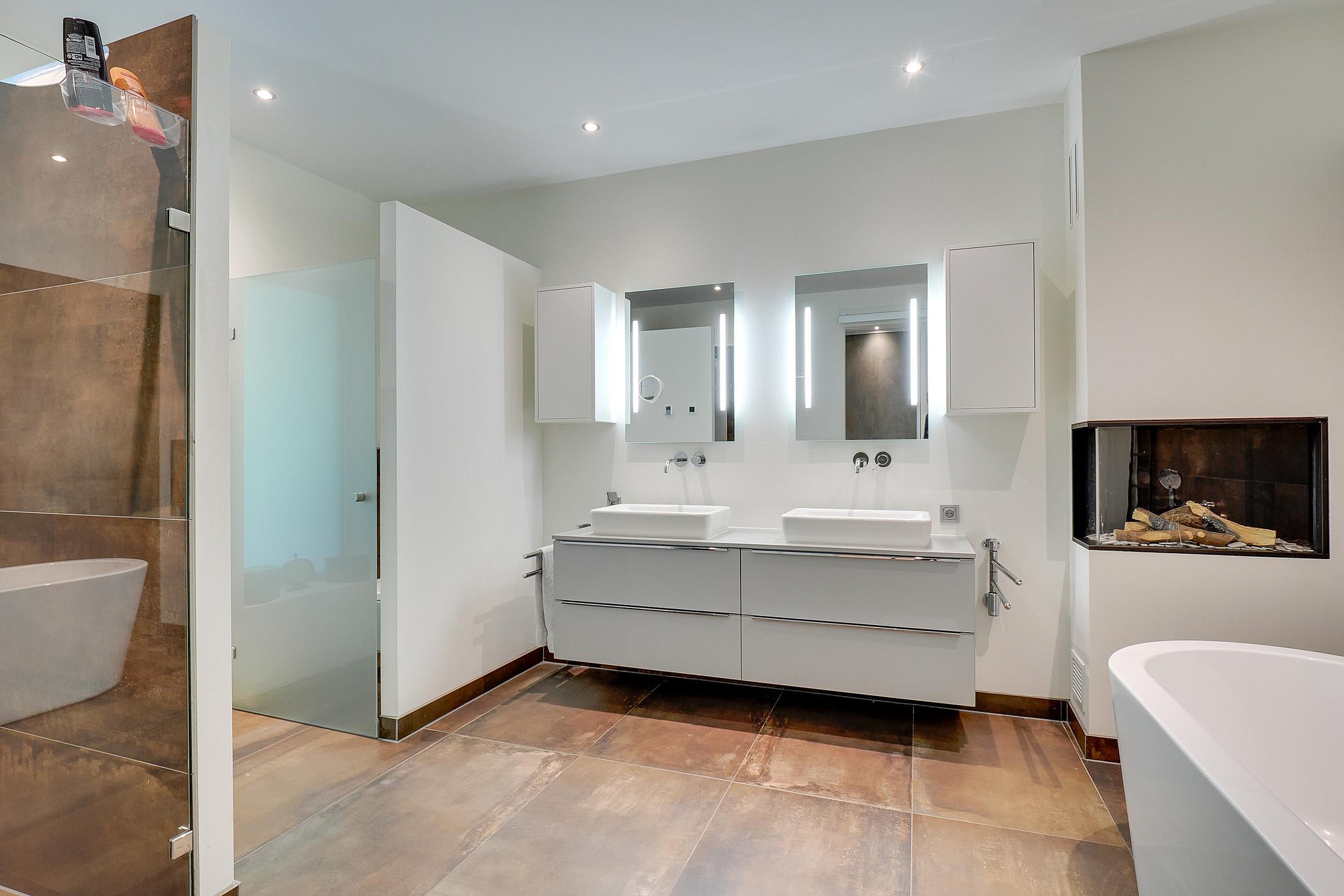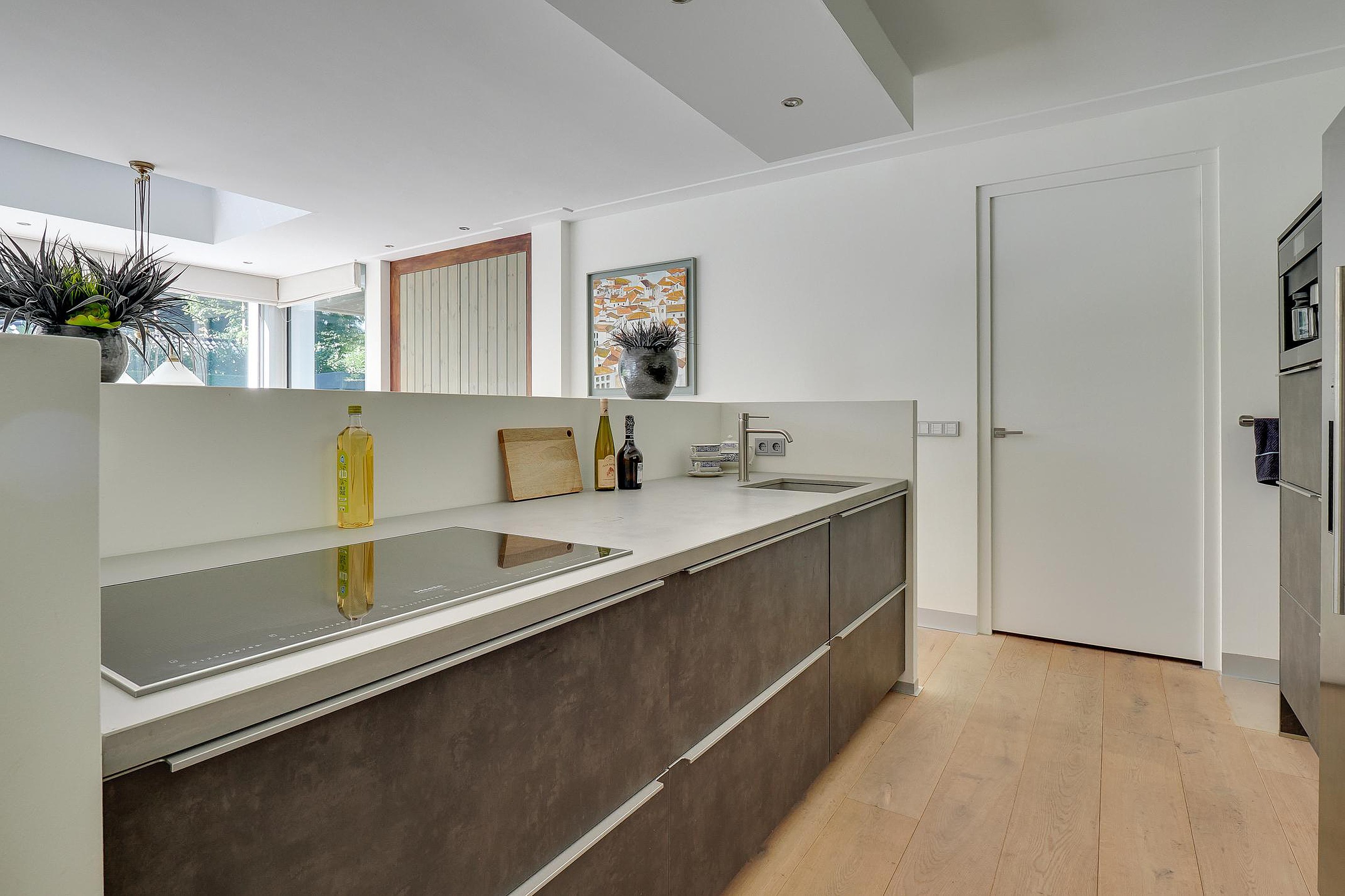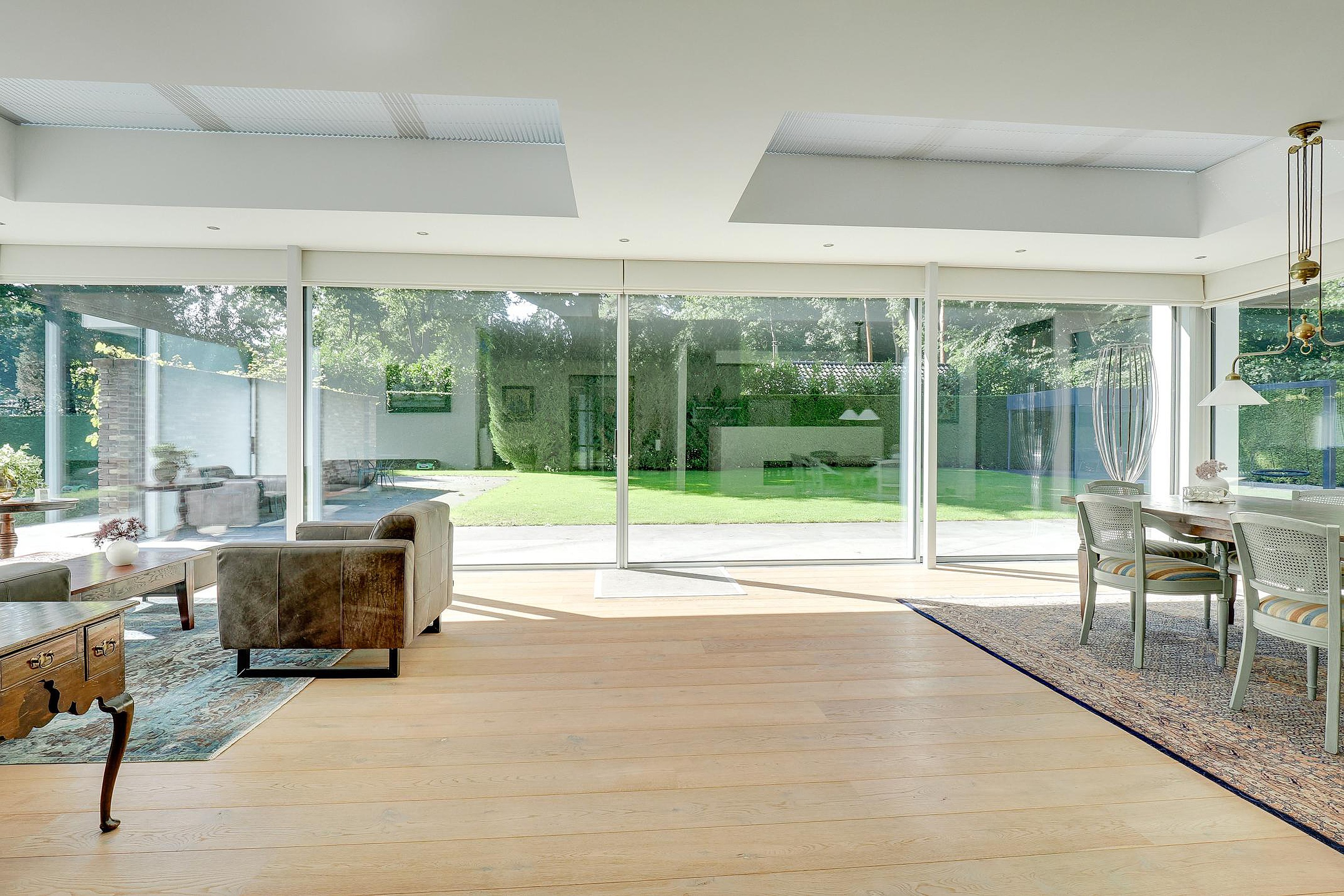 Je komt binnen in een ruime entree met stoere opslaande glasdeuren naar de woonvertrekken. Van hieruit wandel je de woonkamer binnen. Hier ligt een eiken houten vloer met vloerverwarming, lekker aangenaam en duurzaam. De woonkamer baadt in het licht door het vele glas. Schuifdeuren en ramen van vloer tot plafond verbinden de leefruimtes vloeiend met het terras en de tuin. Vooral de grote ramen laten het groen naar binnen komen. De gashaarden zorgen voor gezelligheid in de wat guurdere dagen. De open keuken is modern en voorzien van de beste apparatuur (Miele) incl. een wijnkoeler. Terwijl je kookt, hou je fijn contact met je dierbaren. Aan de zijde van de keuken loop je via de deur naar de Master bedroom met eigen royale walk-in closet en luxe badkamer. Hier slaap je aan de achterzijde en daarom altijd rust gewaarborgd. De aangrenzende luxe sfeervolle badkamer bevat een dubbele wastafel, een ruime inloopdouche en een bad met gashaard. Badderen wordt zo een ultieme wellnes ervaring.