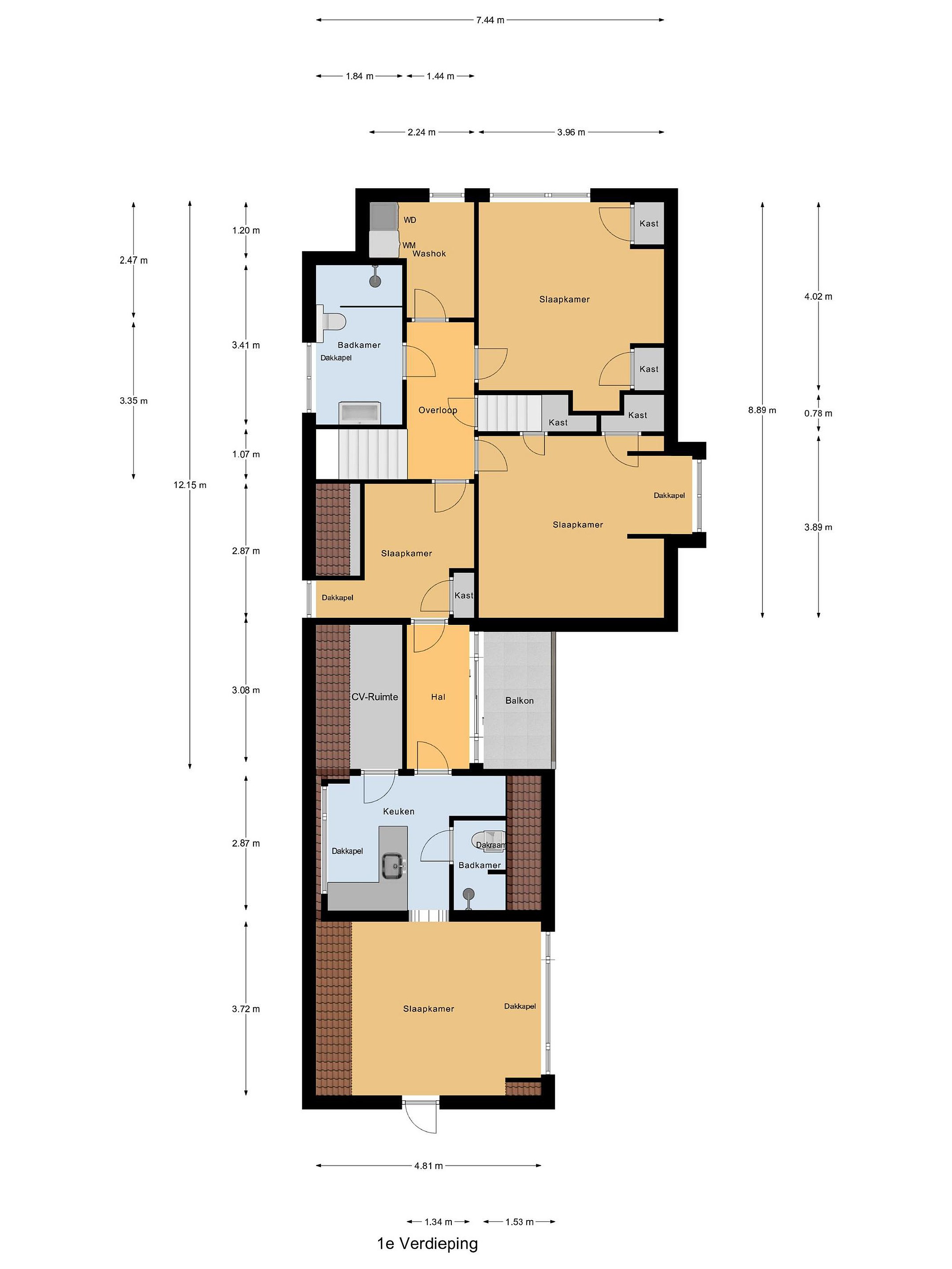 Vanaf de bordestrap bereikt u de overloop en drie slaapkamers, allemaal met vaste kasten en gelegen in het voorste deel van de woning. Verder vindt u op deze verdieping een badkamer, wasruimte, een vaste trap naar zolder en doorgang naar de studio (met eigen voorzieningen) aan de achterzijde van de woning.