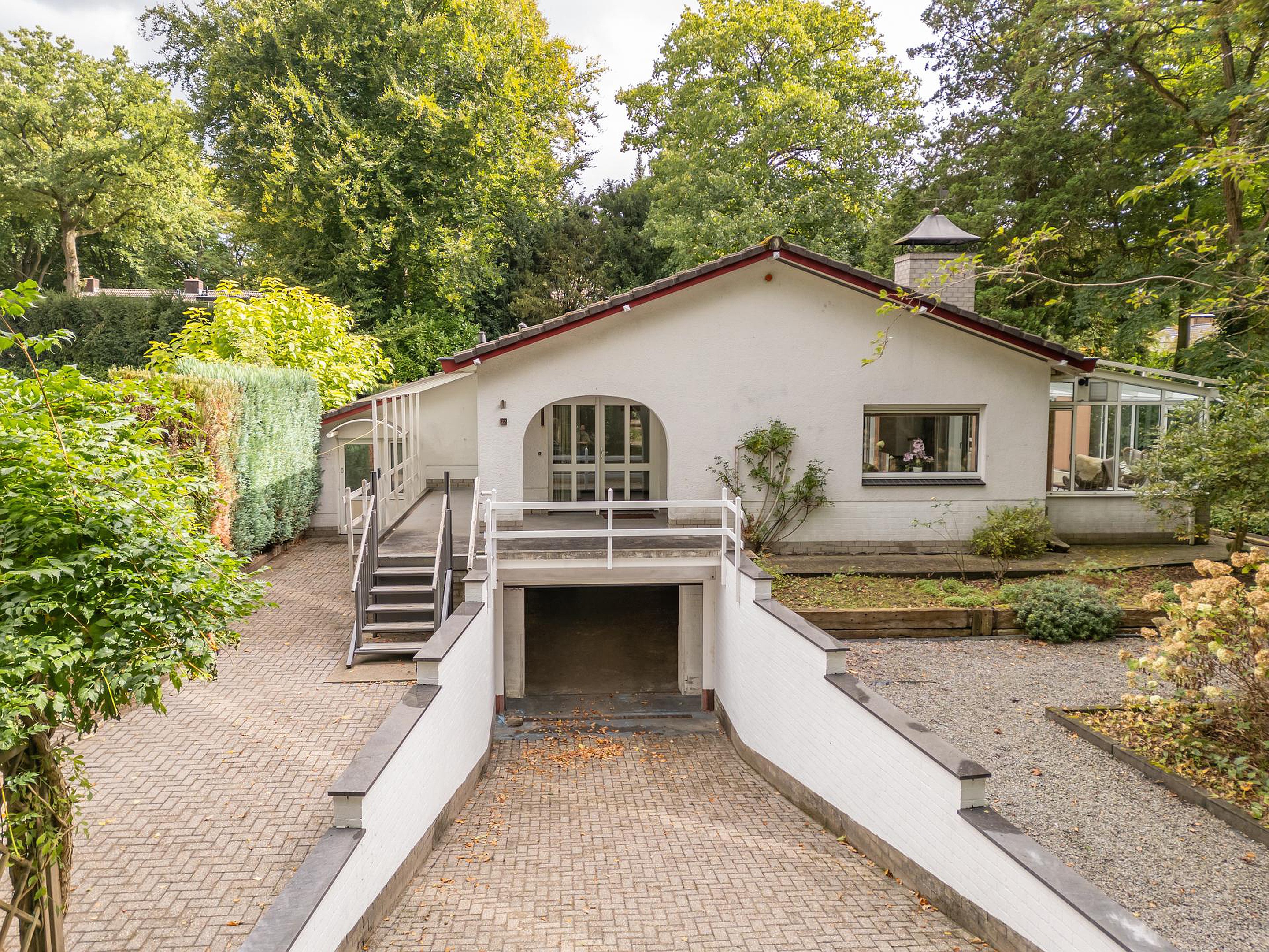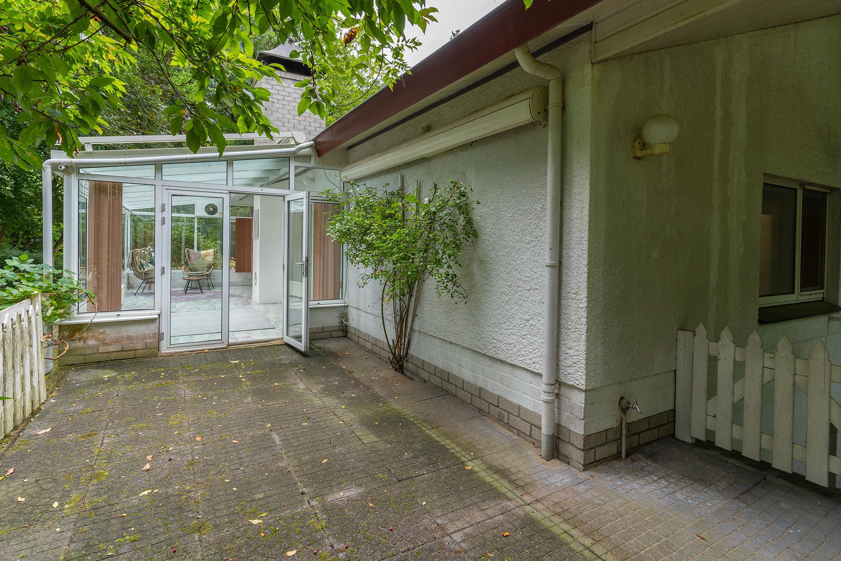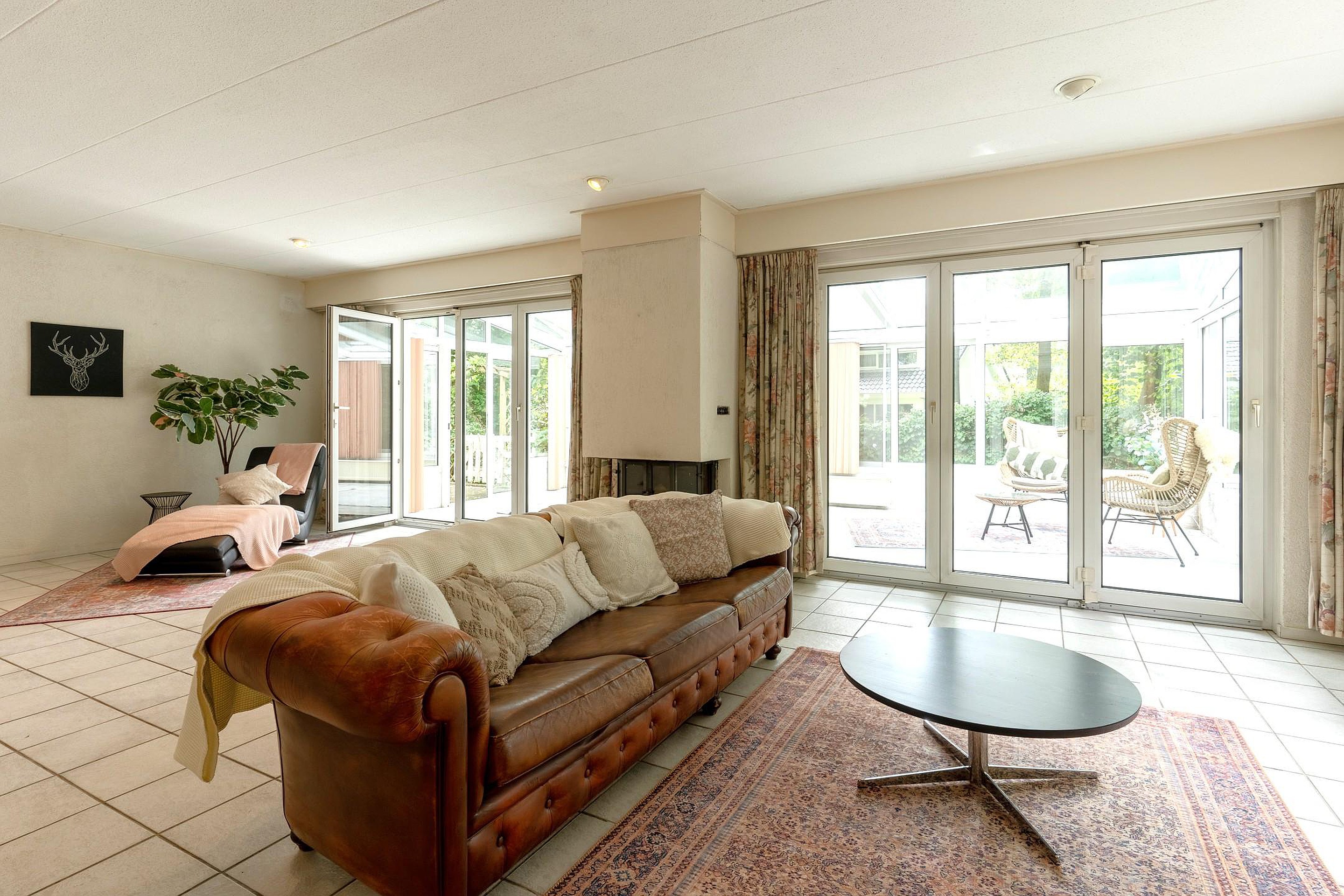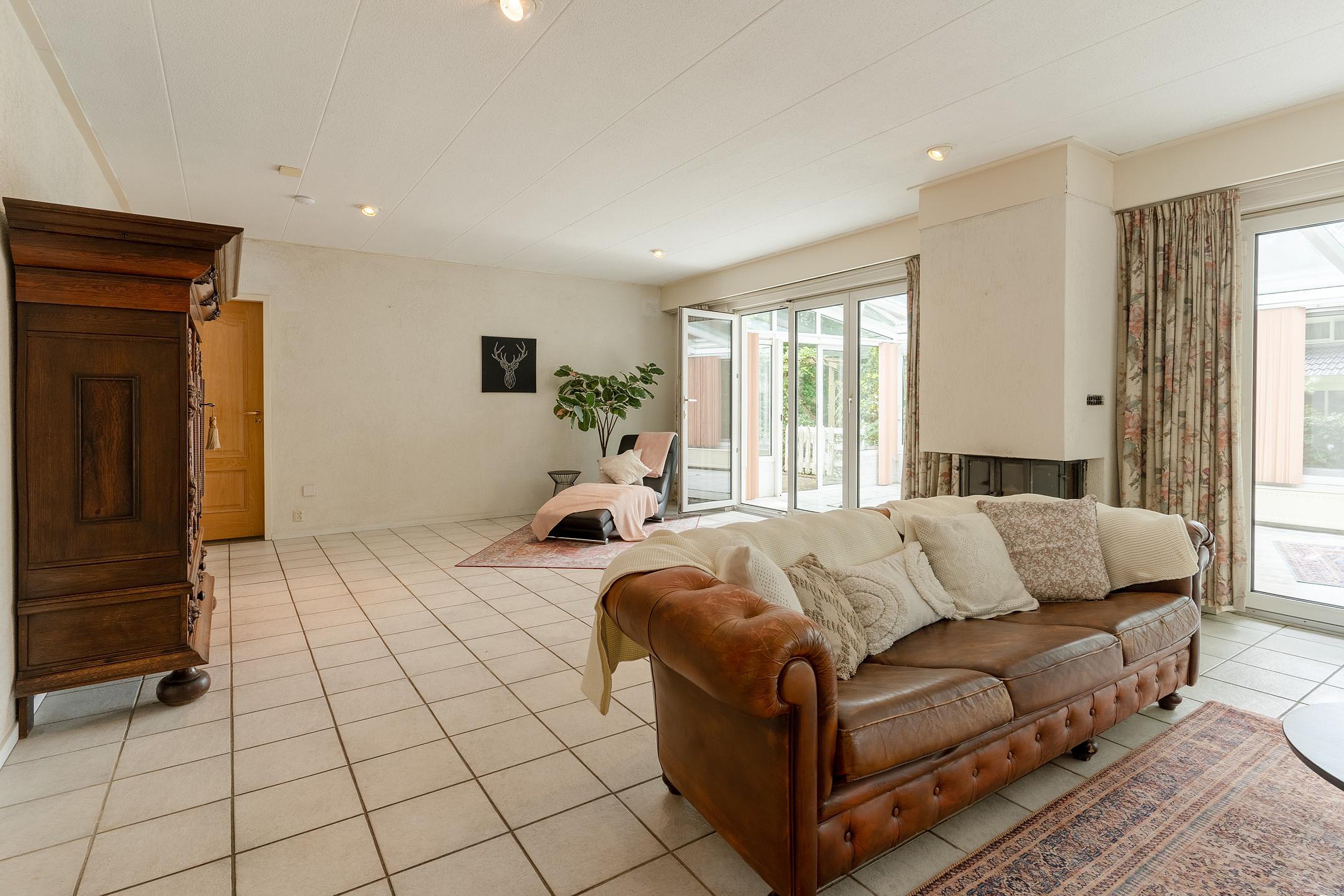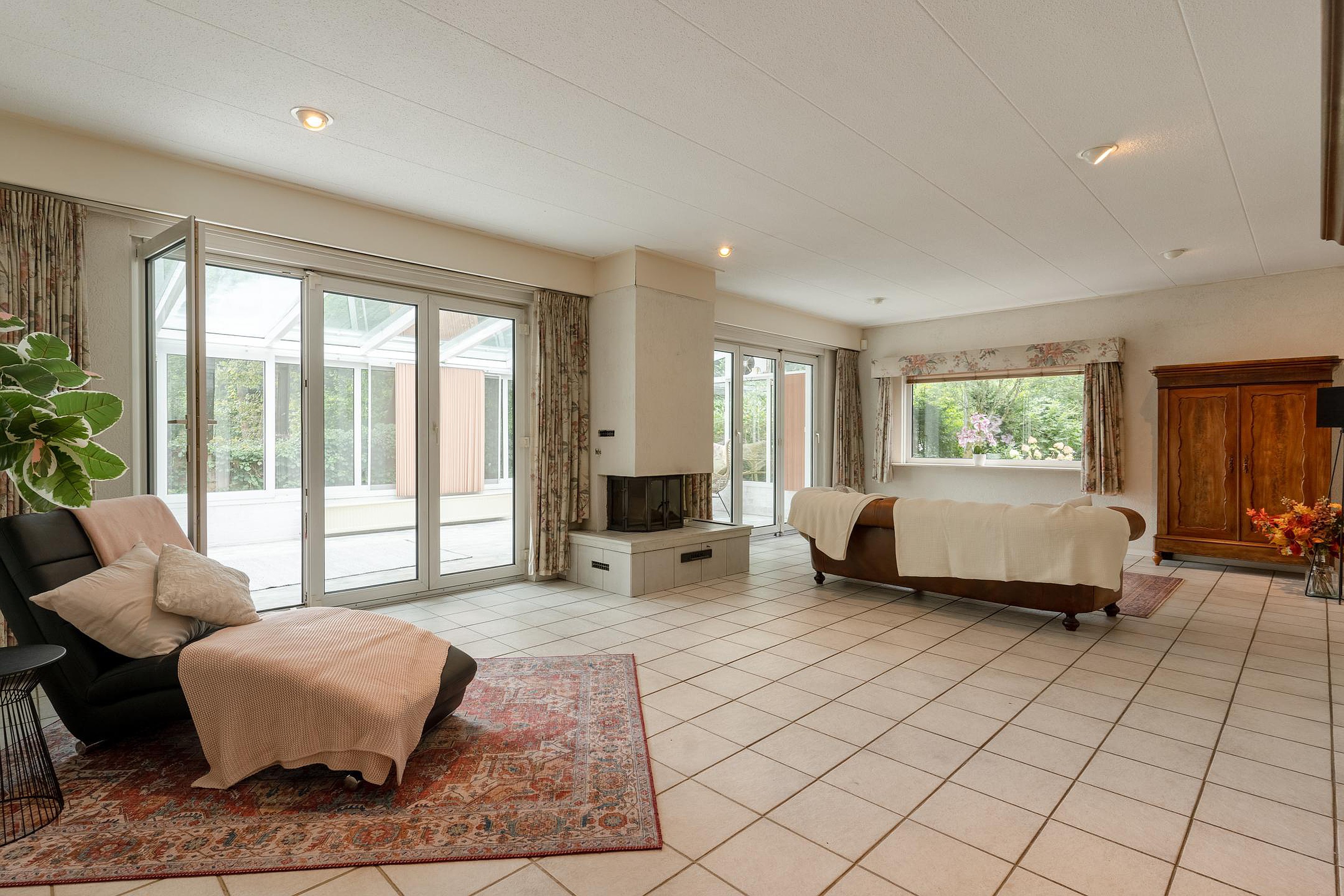 Via een ruime patio kom je binnen in de lichte hal met toilet. De royale woonkamer is omringd door grote raampartijen die uitzicht bieden op de voor- en zijtuin. Aangrenzend bevindt zich een sfeervolle serre — een heerlijke plek om te eten, te lezen of gewoon te genieten van de tuin, elk seizoen opnieuw.