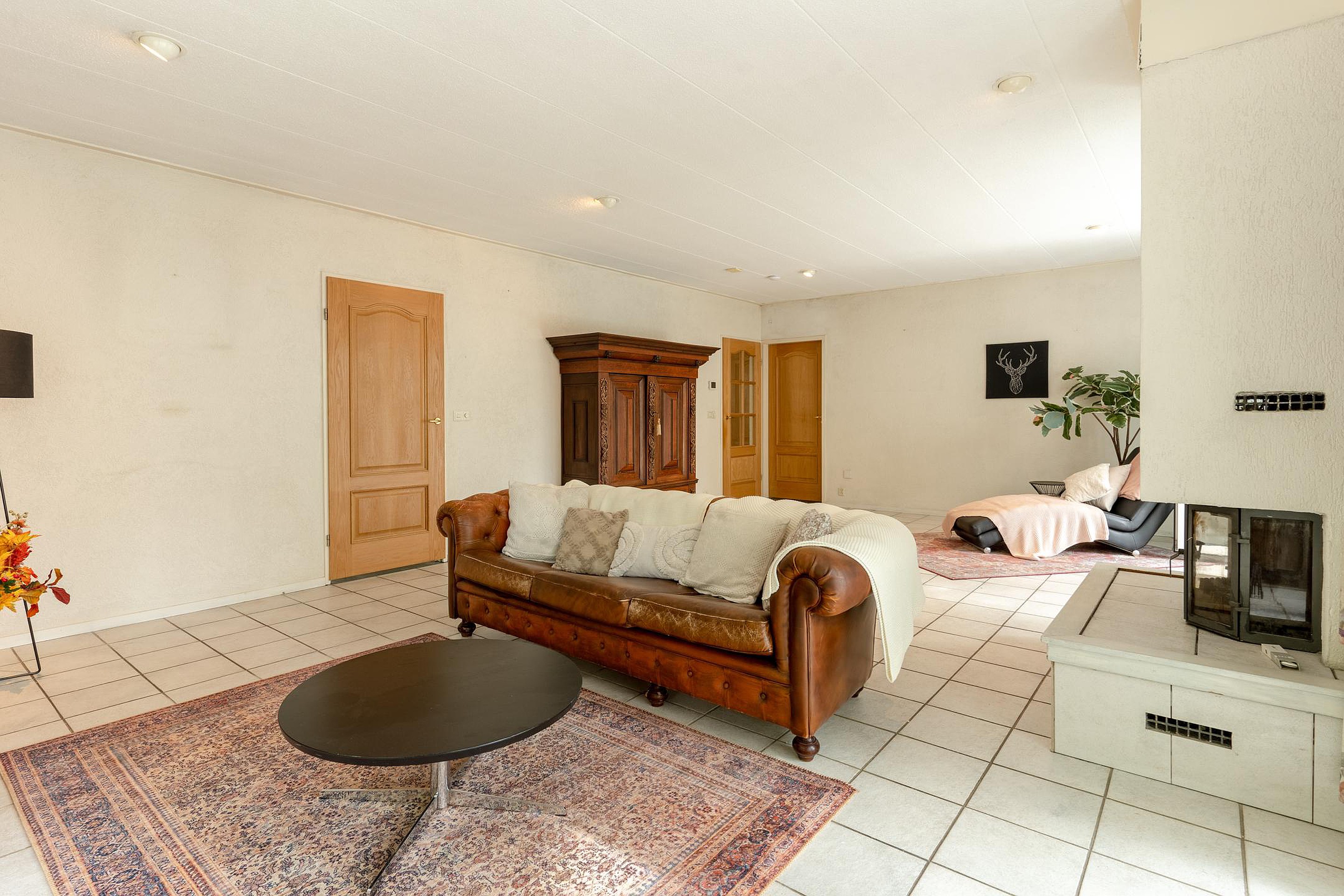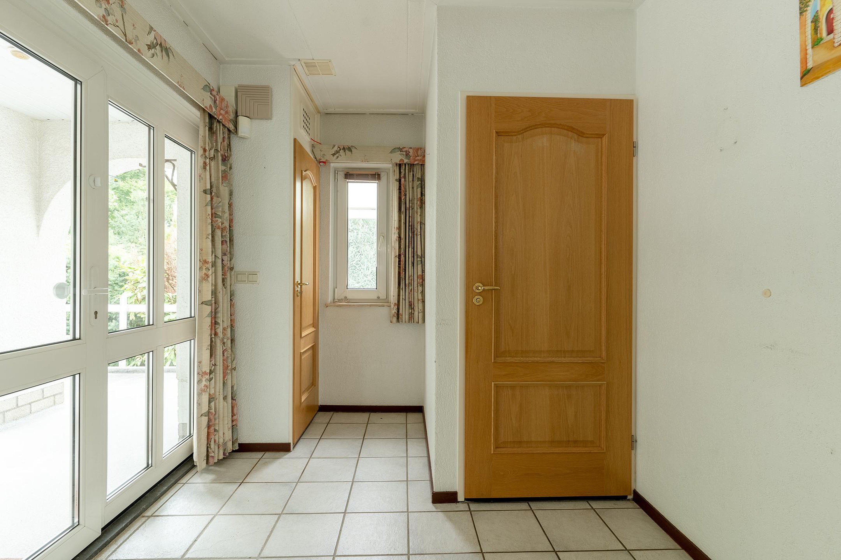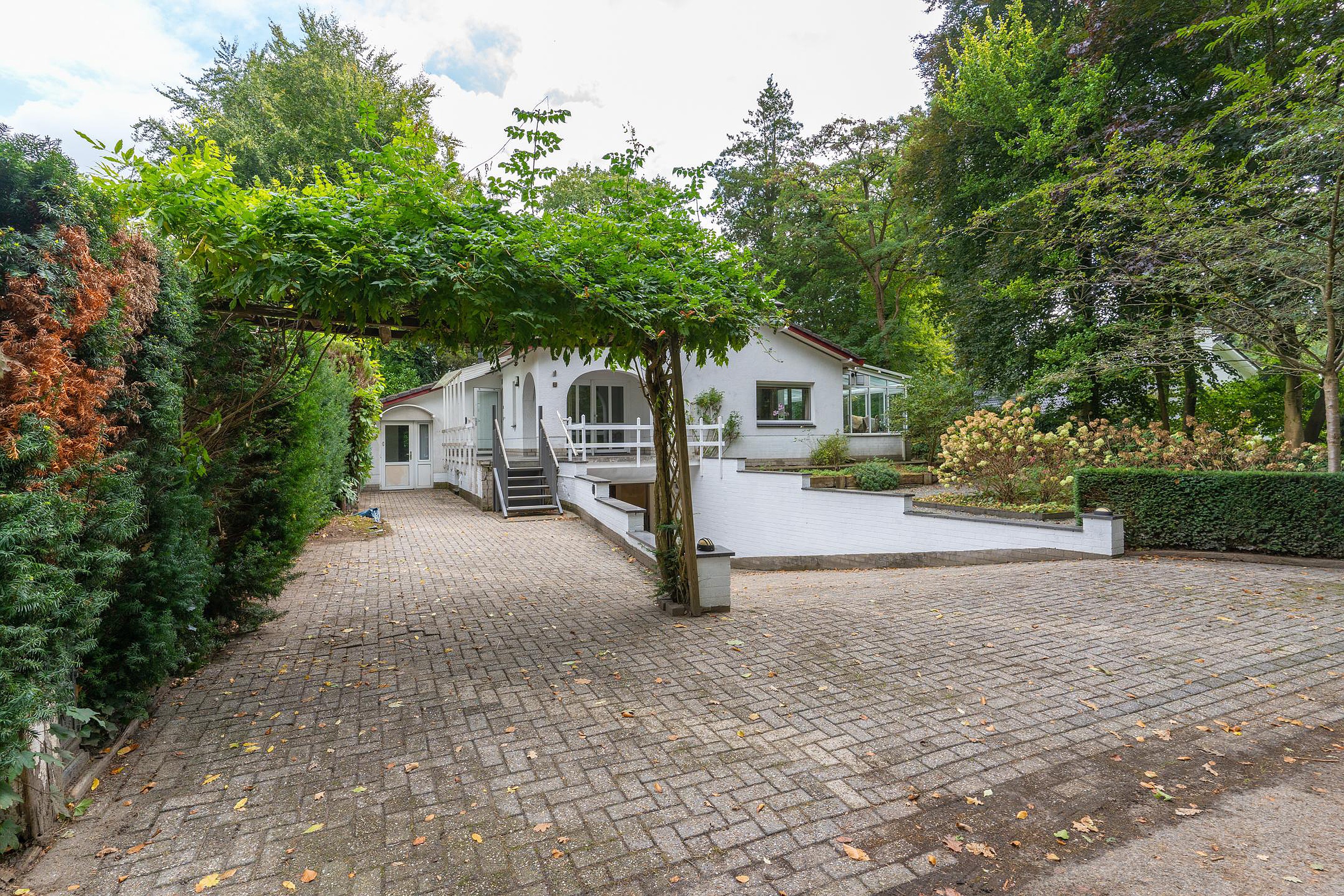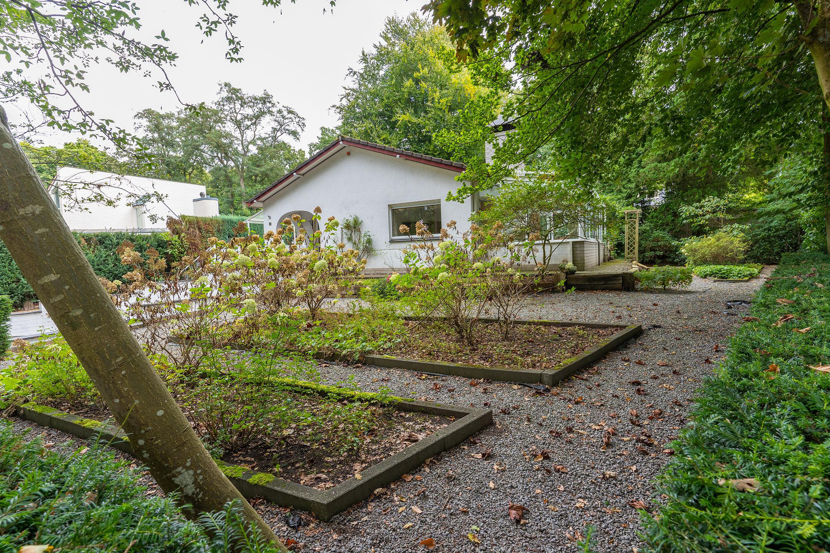 Via een ruime patio kom je binnen in de lichte hal met toilet. De royale woonkamer is omringd door grote raampartijen die uitzicht bieden op de voor- en zijtuin. Aangrenzend bevindt zich een sfeervolle serre — een heerlijke plek om te eten, te lezen of gewoon te genieten van de tuin, elk seizoen opnieuw.