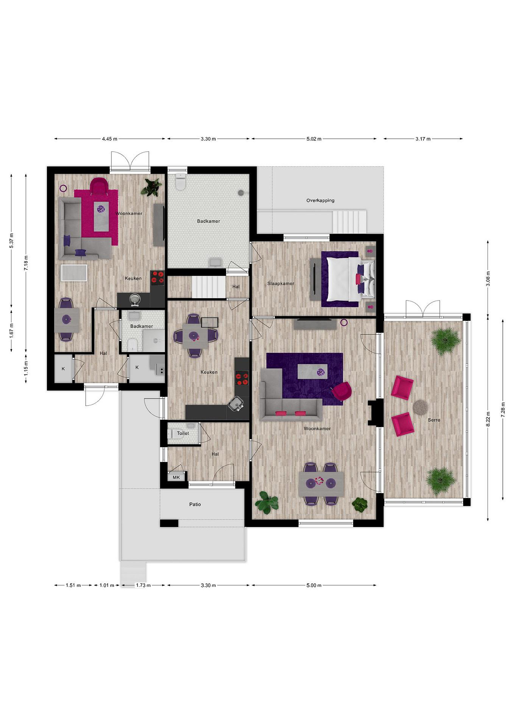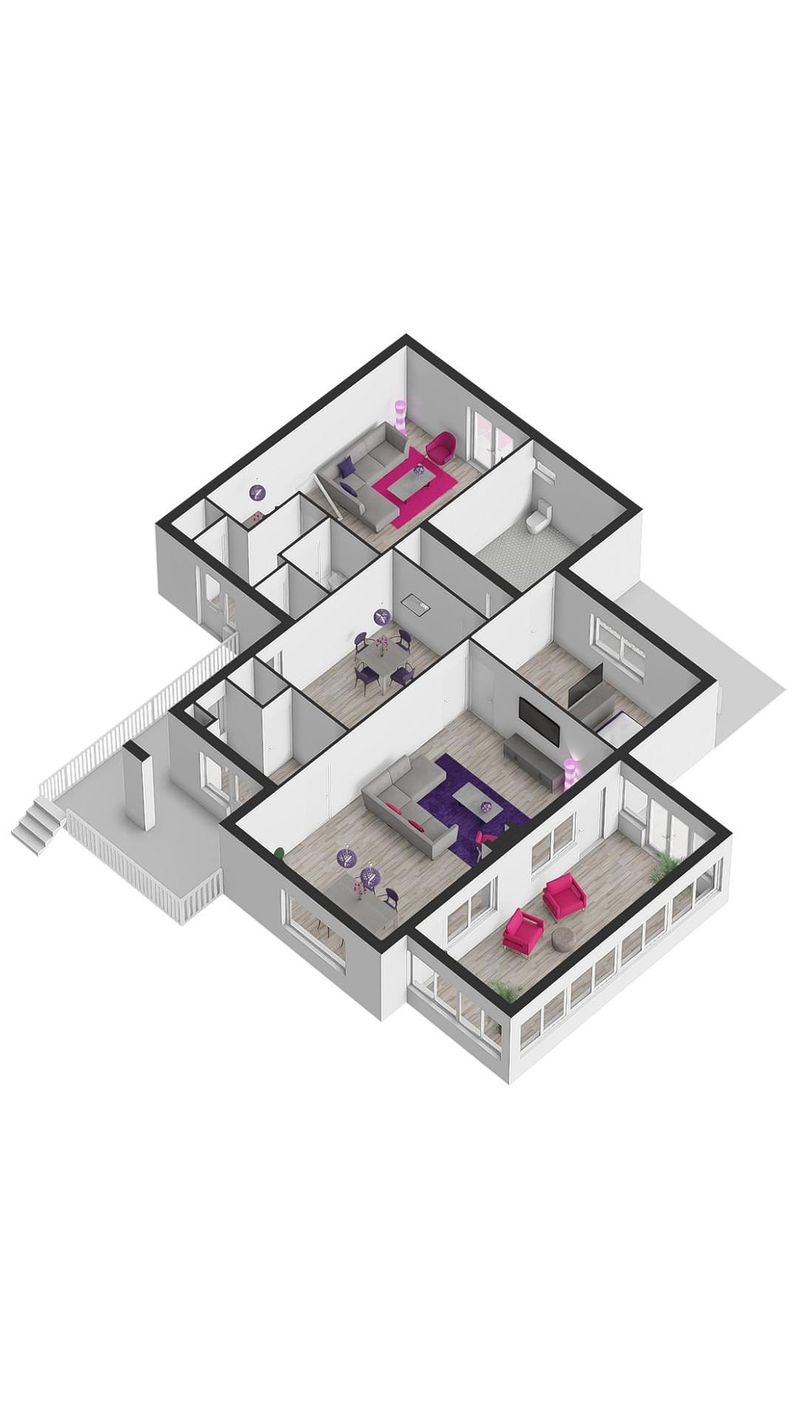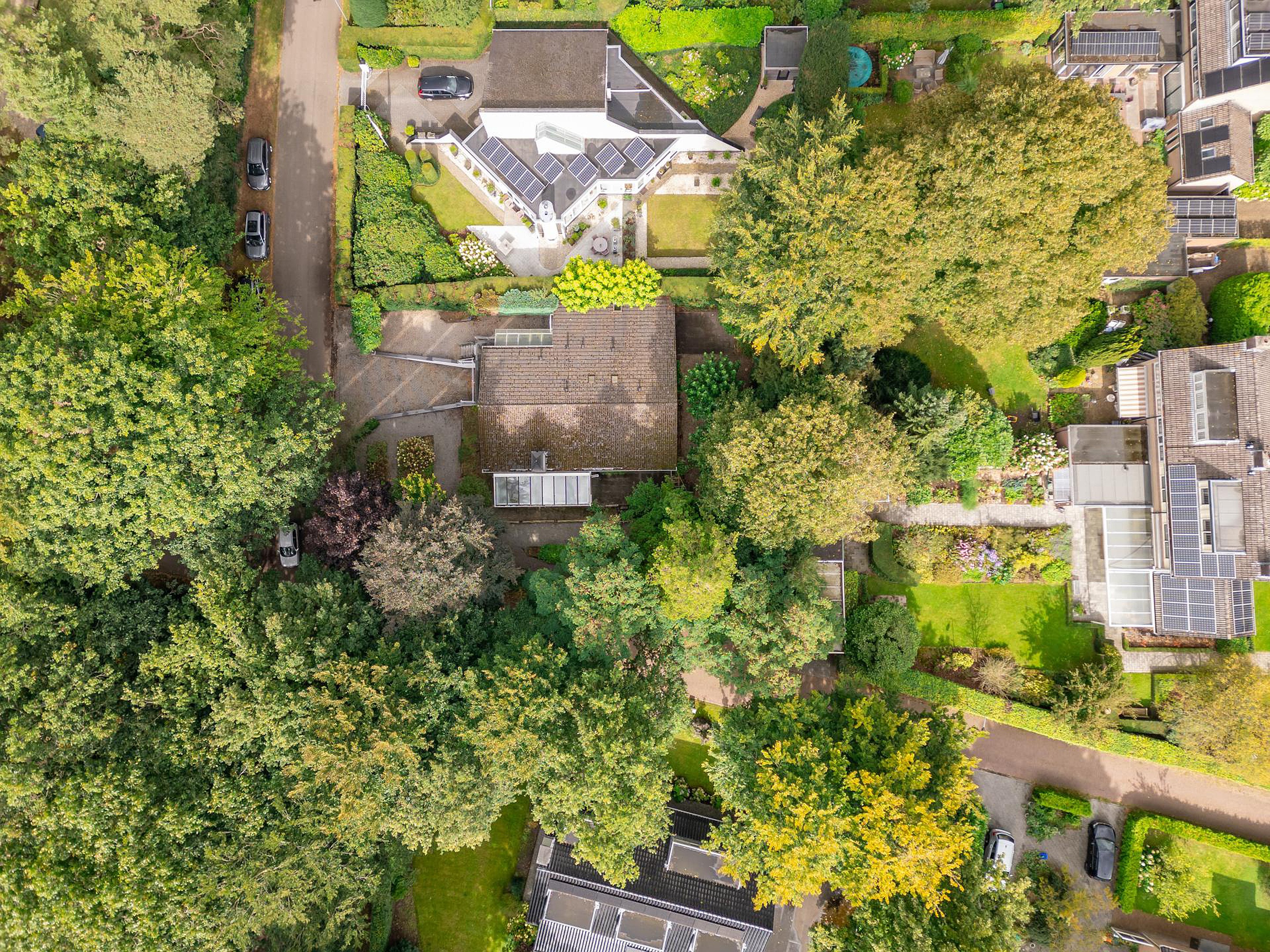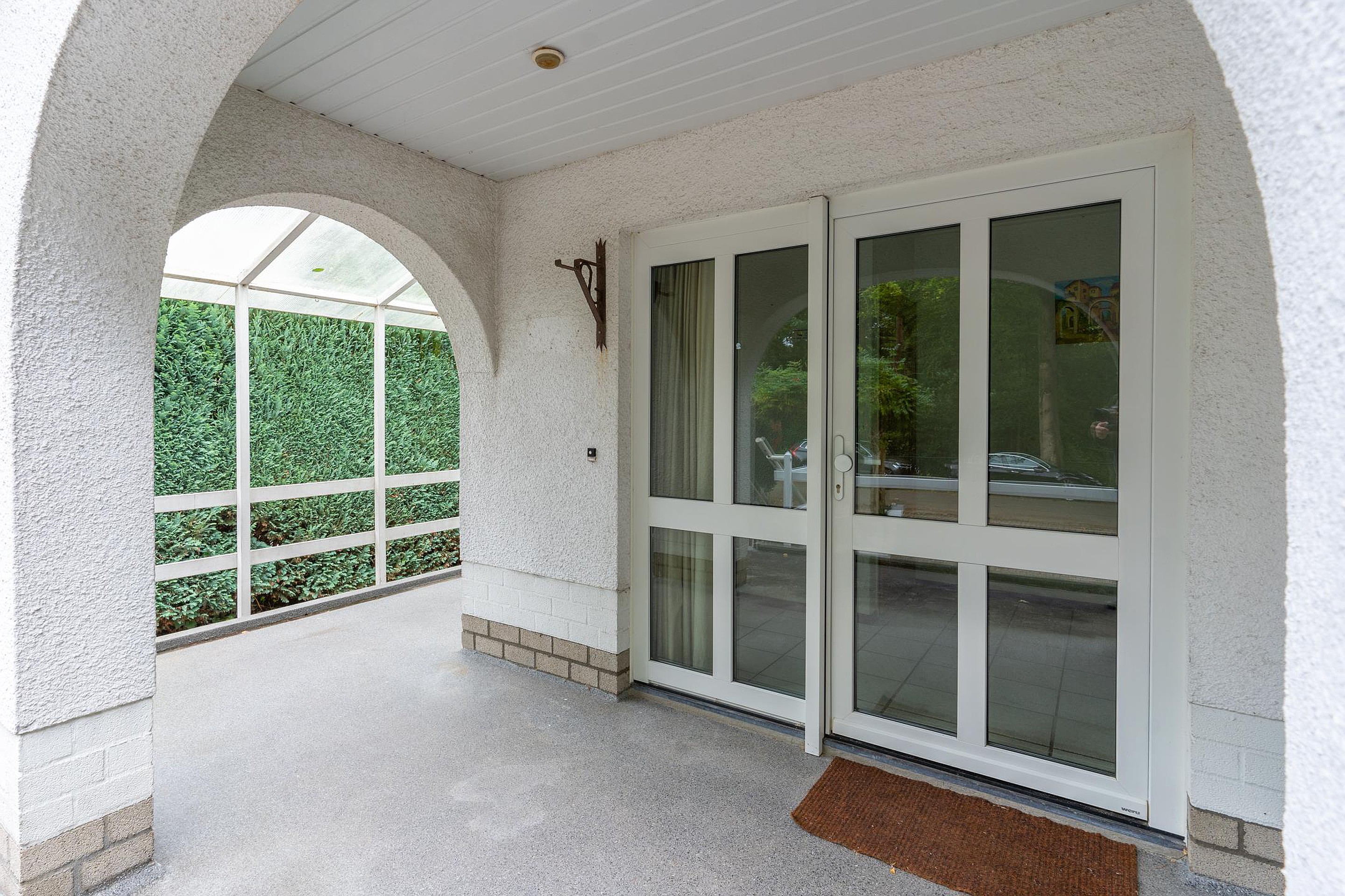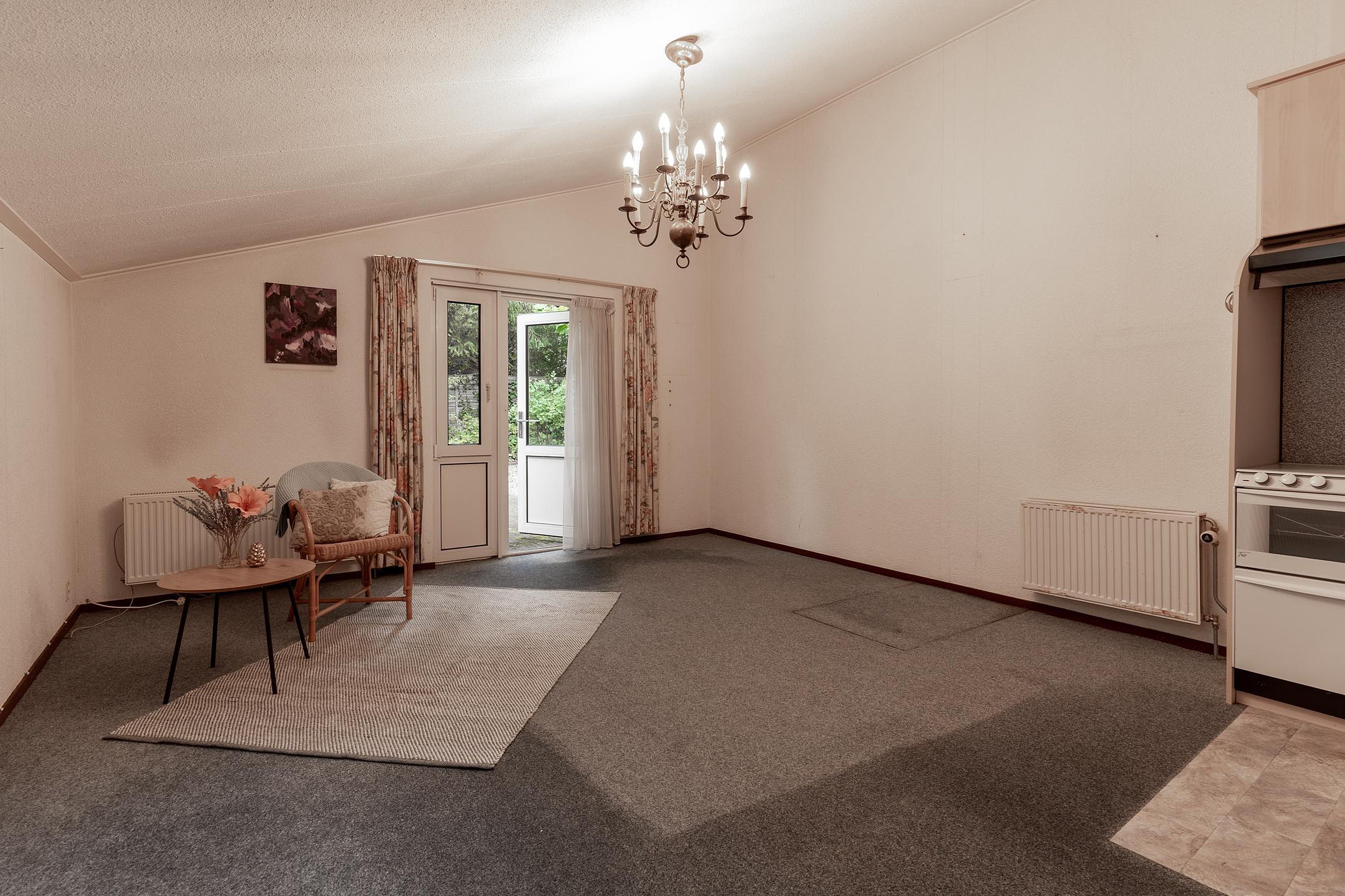 Via een ruime patio kom je binnen in de lichte hal met toilet. De royale woonkamer is omringd door grote raampartijen die uitzicht bieden op de voor- en zijtuin. Aangrenzend bevindt zich een sfeervolle serre — een heerlijke plek om te eten, te lezen of gewoon te genieten van de tuin, elk seizoen opnieuw.