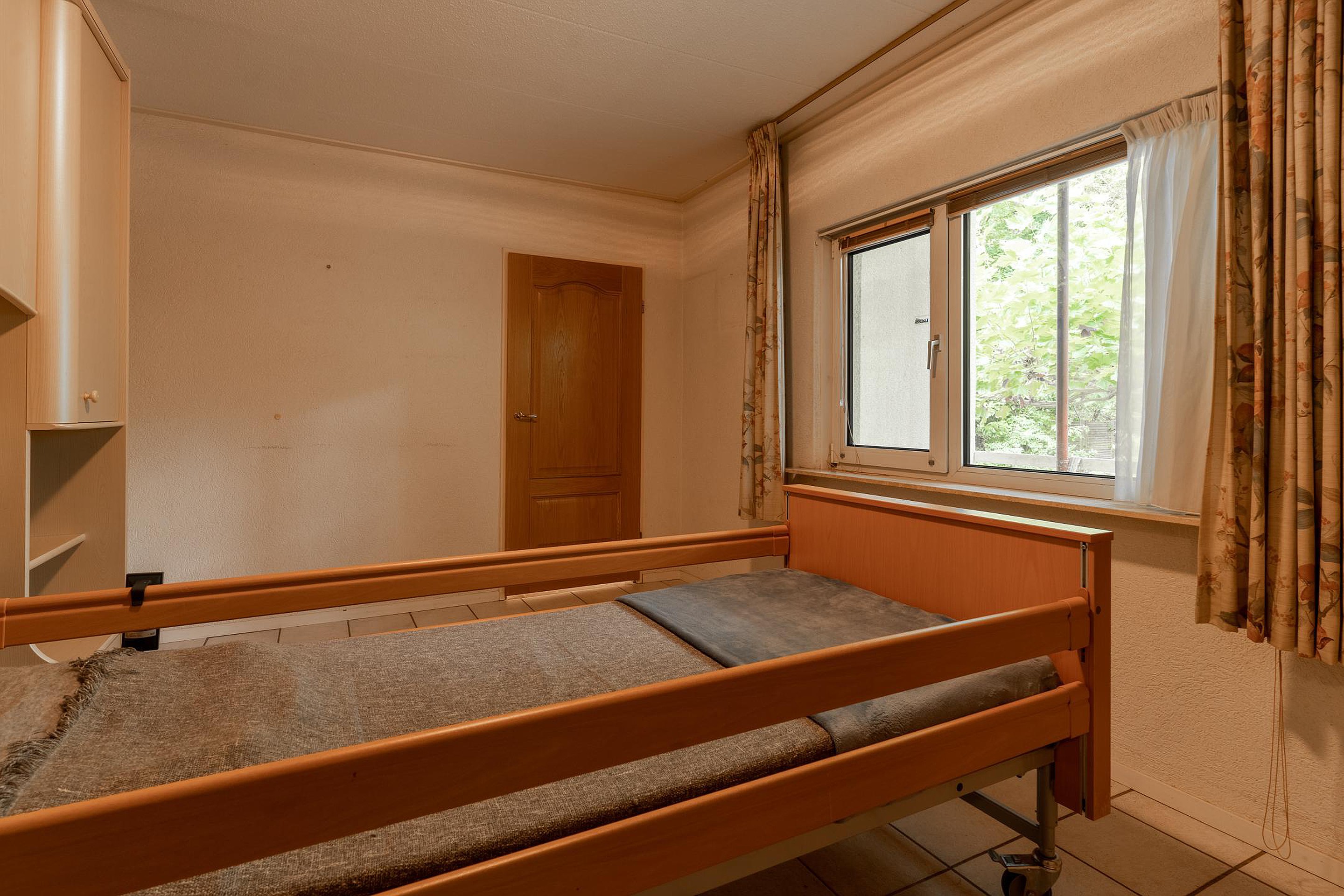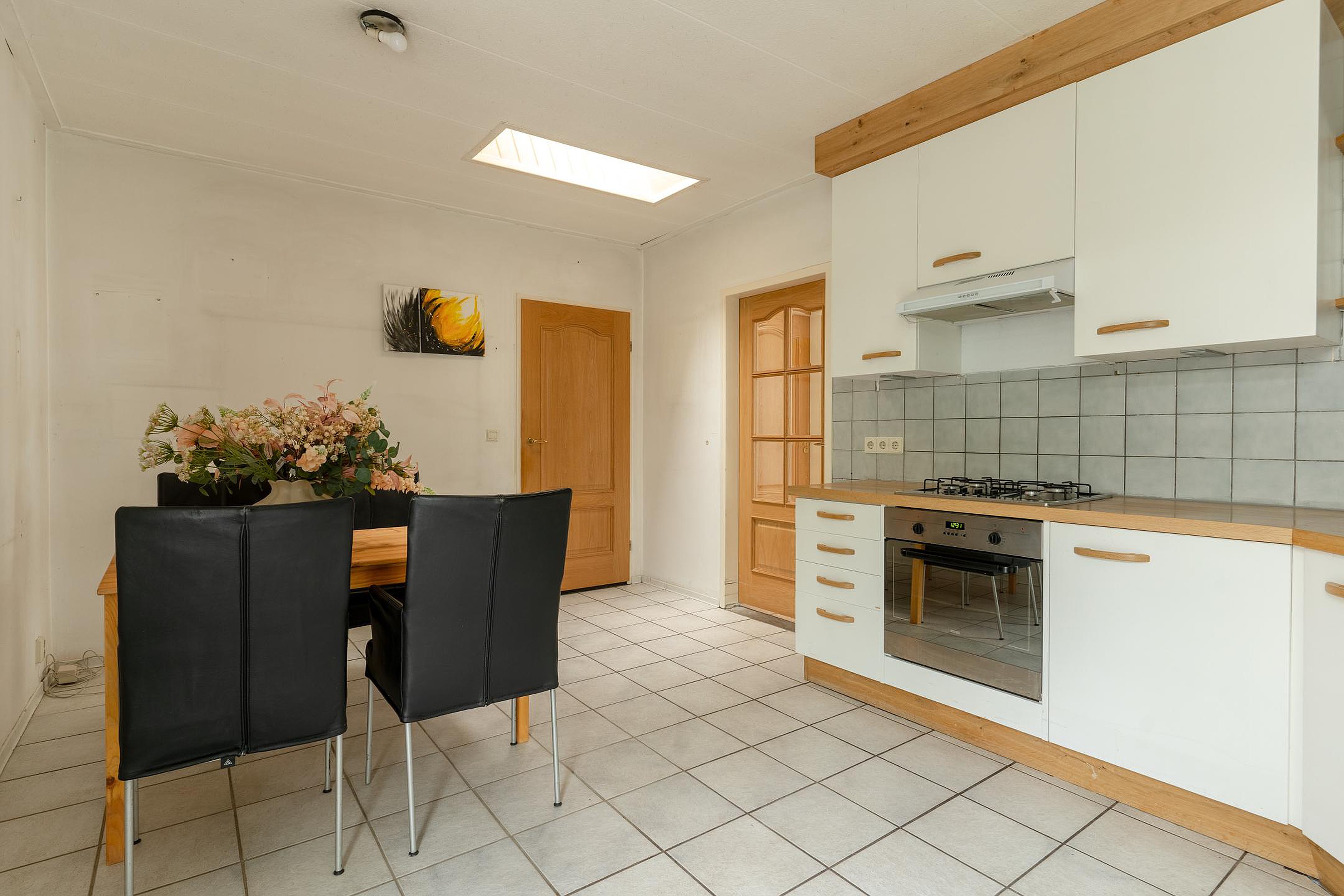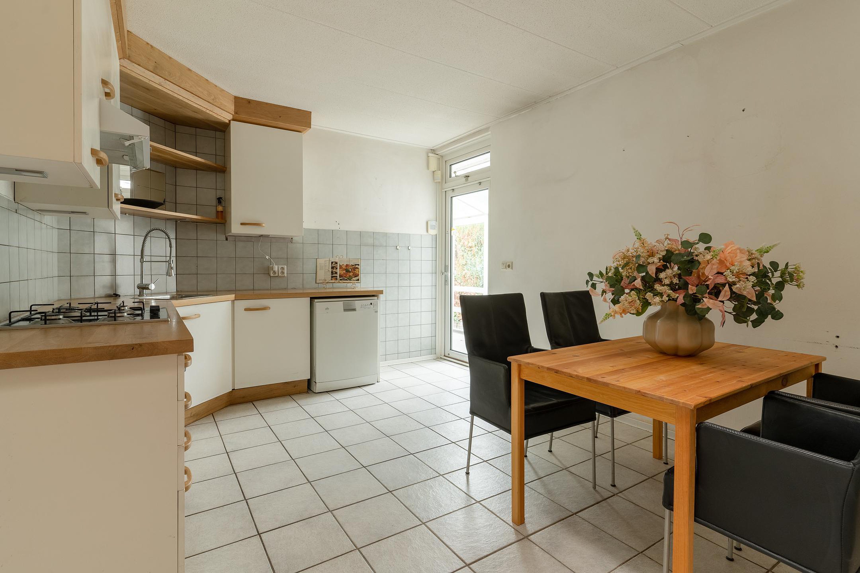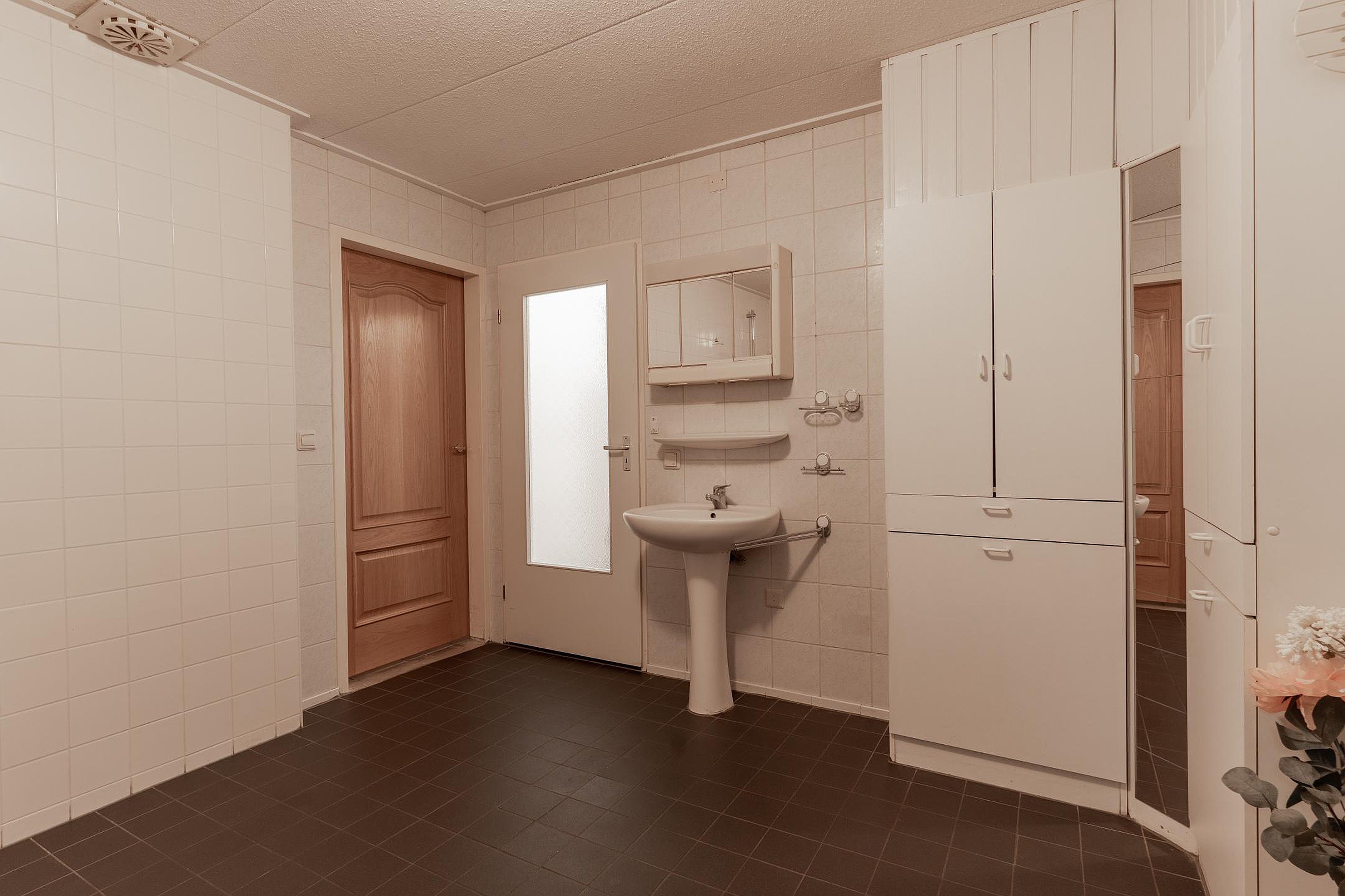 Naast de achter entree bereik je vanuit de woonkamer de ruime woonkeuken, én een slaapkamer op de begane grond met directe toegang tot de badkamer. Deze slaapkamer ligt bovendien aan een hal die ook weer terugloopt naar de keuken — praktisch én slim ingedeeld. Vanuit deze hal leidt een trap naar het souterrain.