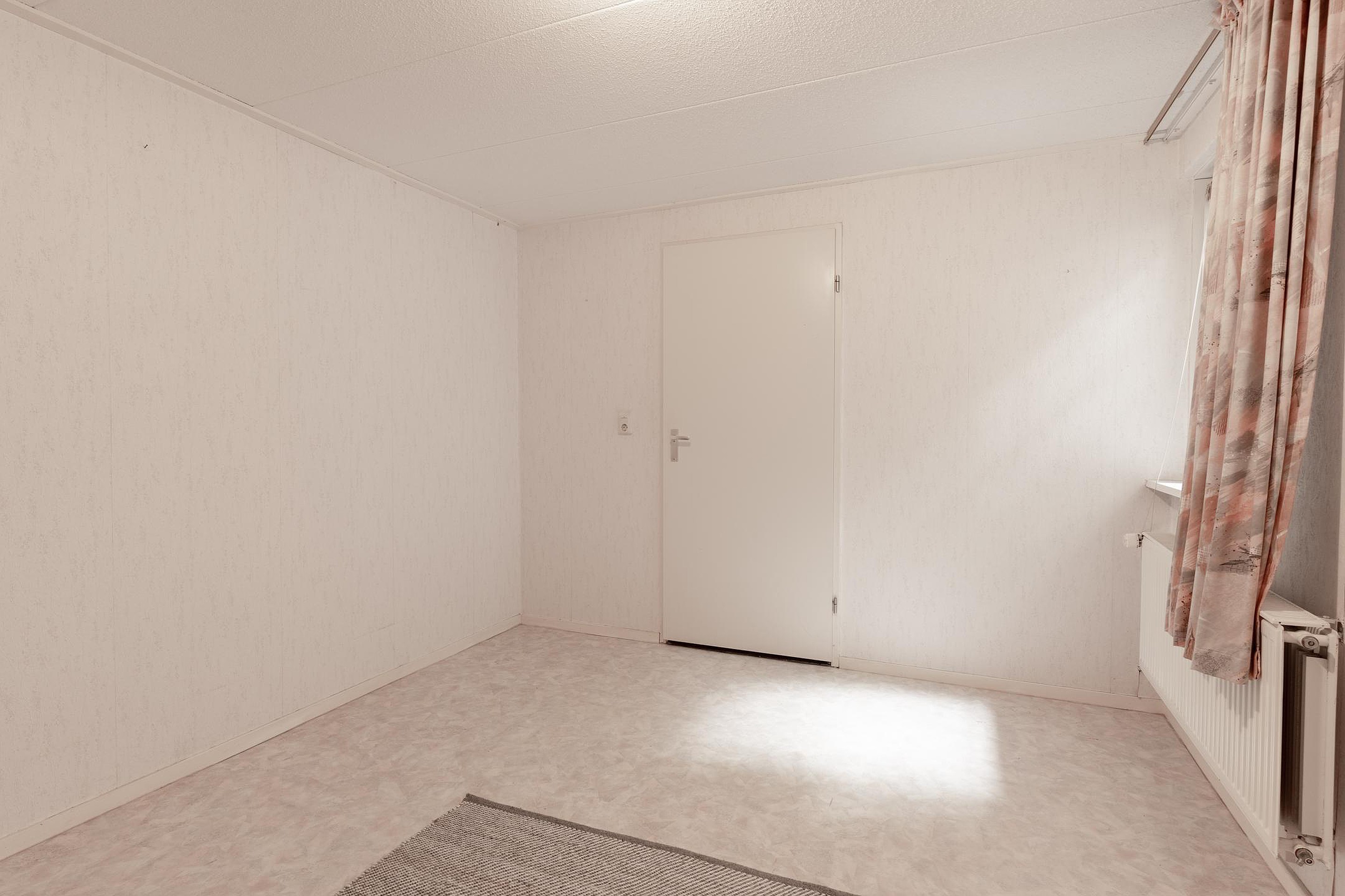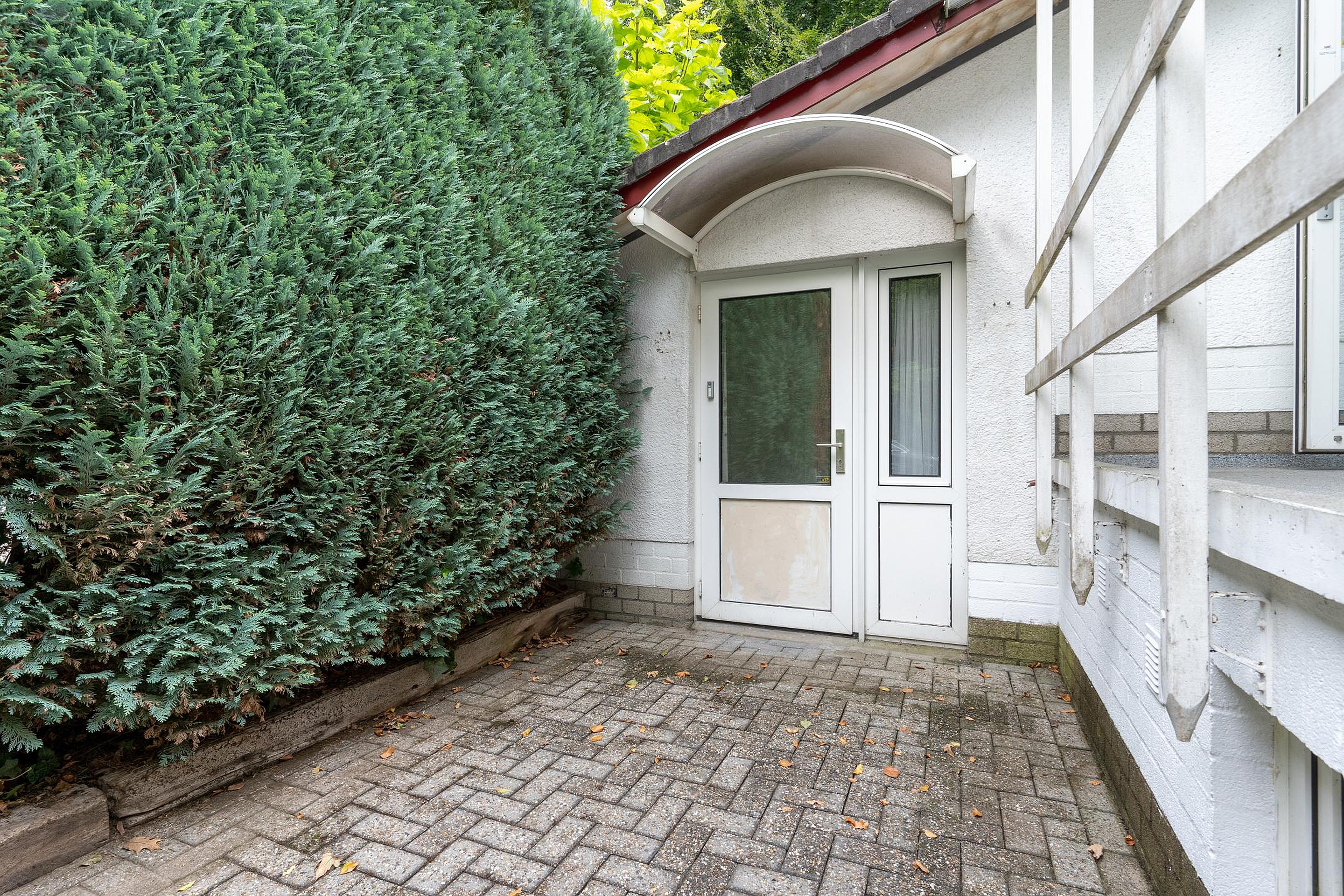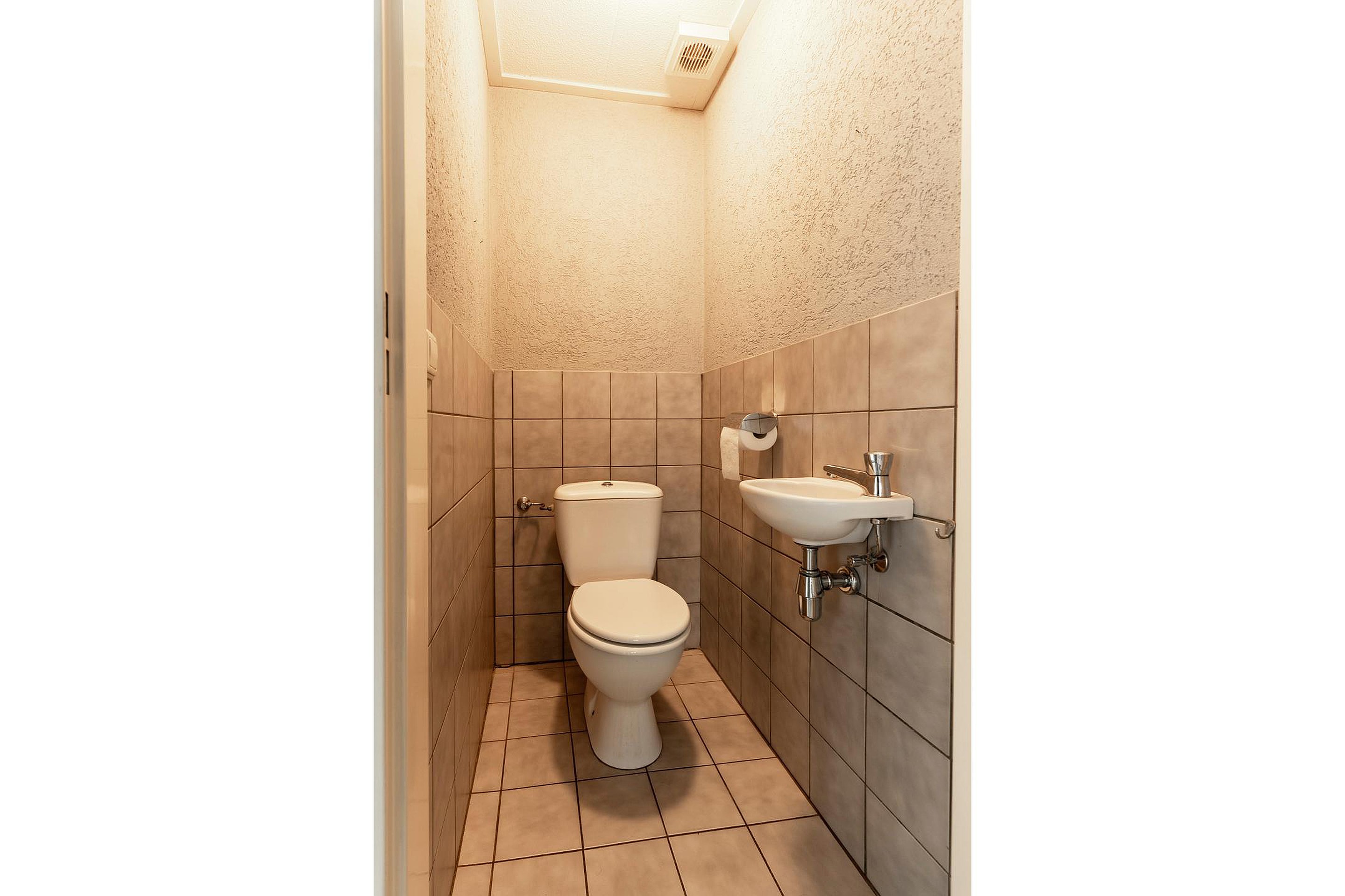 Naast de achter entree bereik je vanuit de woonkamer de ruime woonkeuken, én een slaapkamer op de begane grond met directe toegang tot de badkamer. Deze slaapkamer ligt bovendien aan een hal die ook weer terugloopt naar de keuken — praktisch én slim ingedeeld. Vanuit deze hal leidt een trap naar het souterrain.