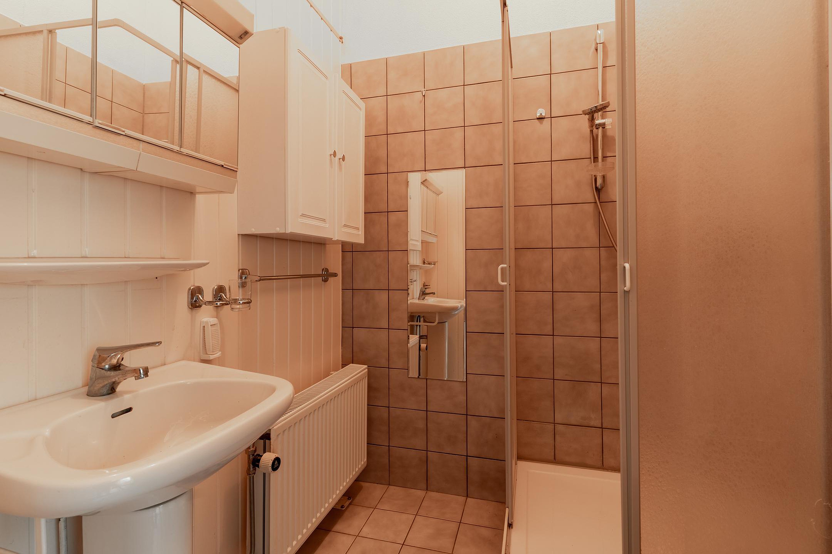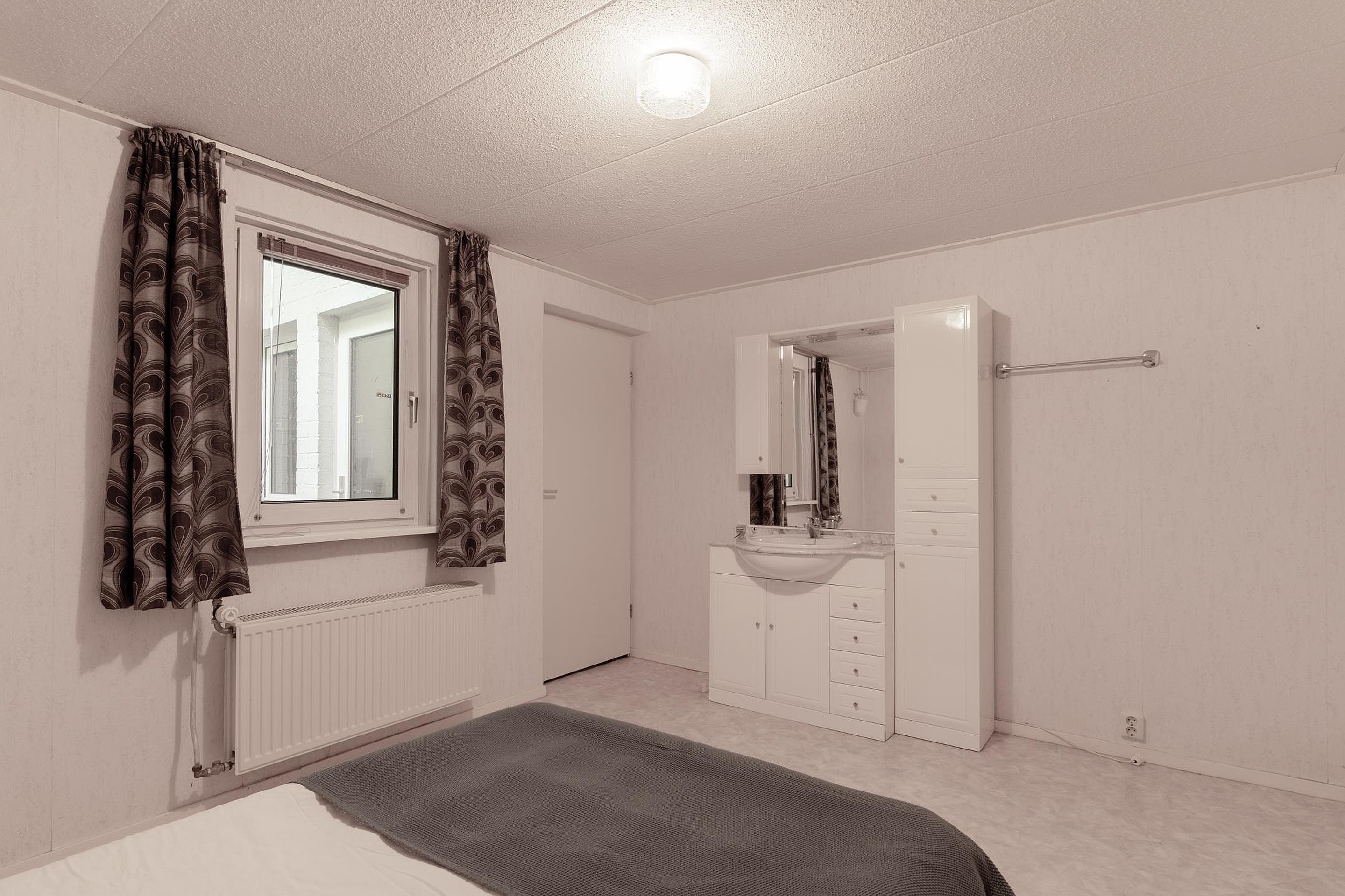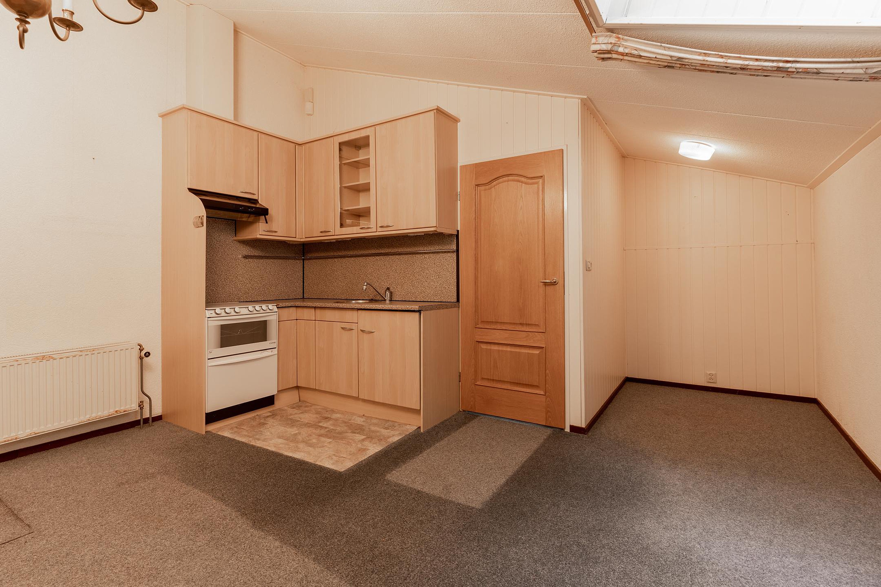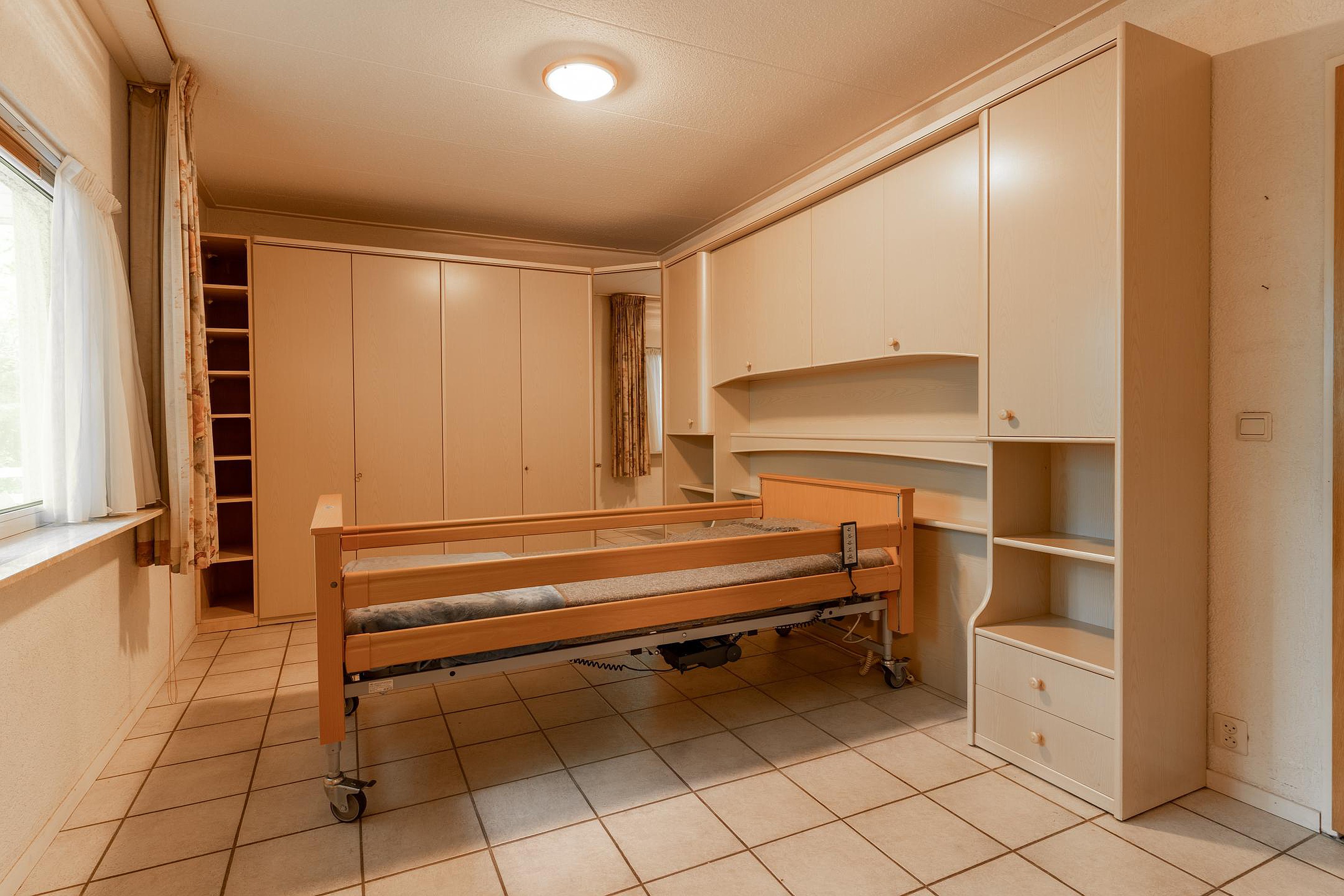 Naast de achter entree bereik je vanuit de woonkamer de ruime woonkeuken, én een slaapkamer op de begane grond met directe toegang tot de badkamer. Deze slaapkamer ligt bovendien aan een hal die ook weer terugloopt naar de keuken — praktisch én slim ingedeeld. Vanuit deze hal leidt een trap naar het souterrain.