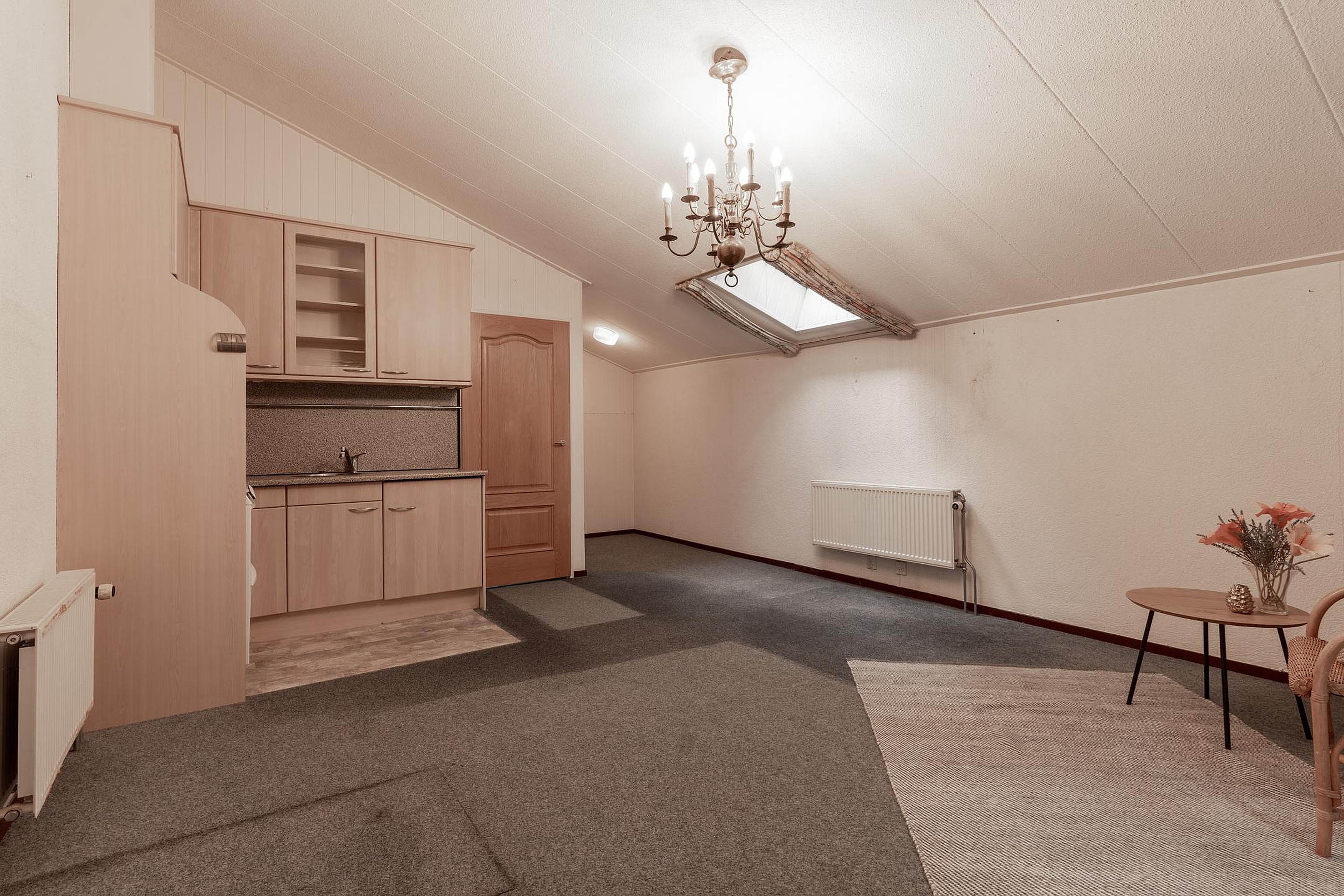 Aan de zijkant van de woning bevindt zich een zelfstandige aanbouw met een eigen entree, hal, toilet, douche, keuken en woonkamer, plus een achterdeur naar de tuin. Deze ruimte is perfect geschikt als kantoor of praktijk aan huis, of voor inwoning van bijvoorbeeld ouders of kinderen.