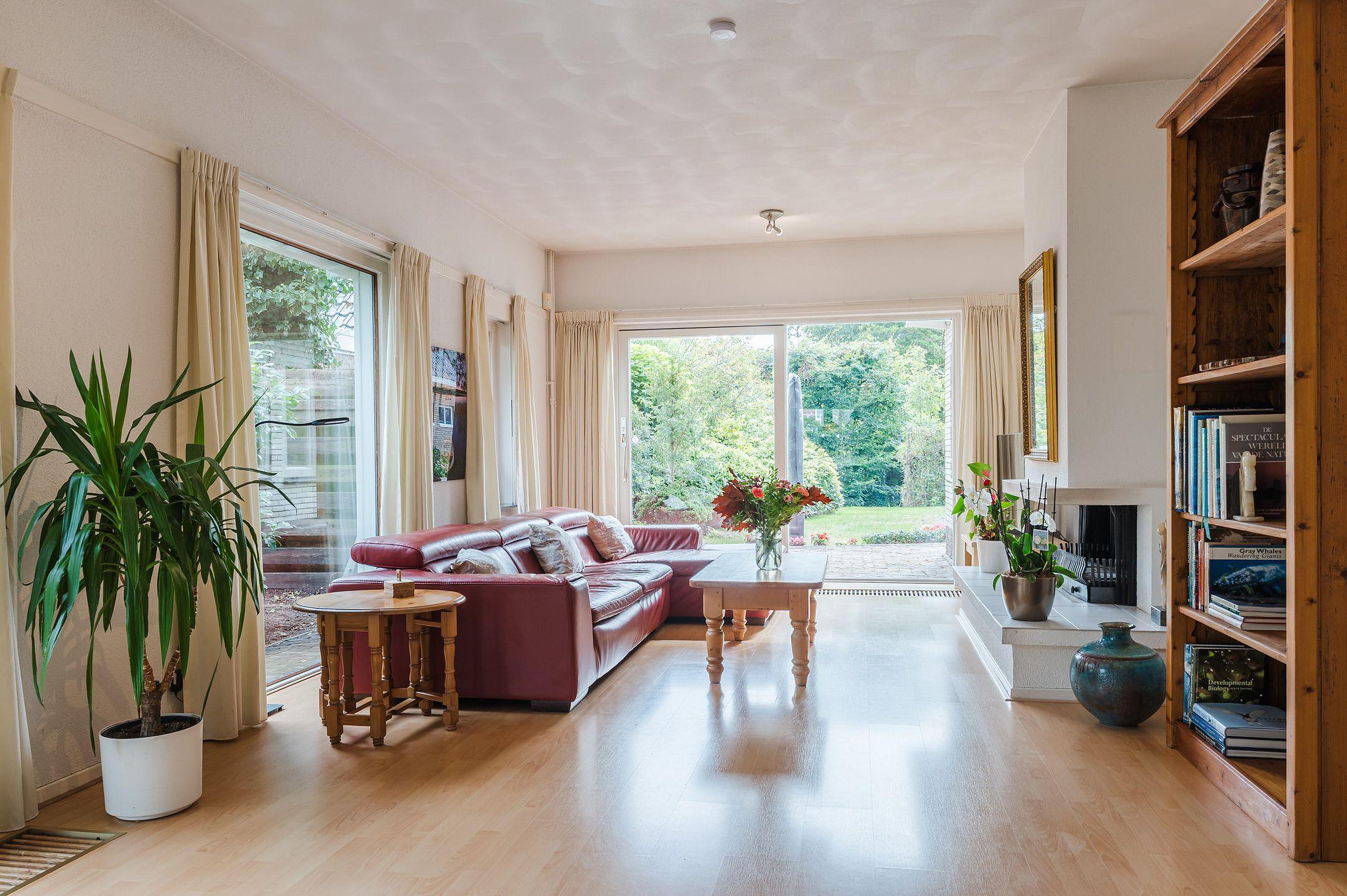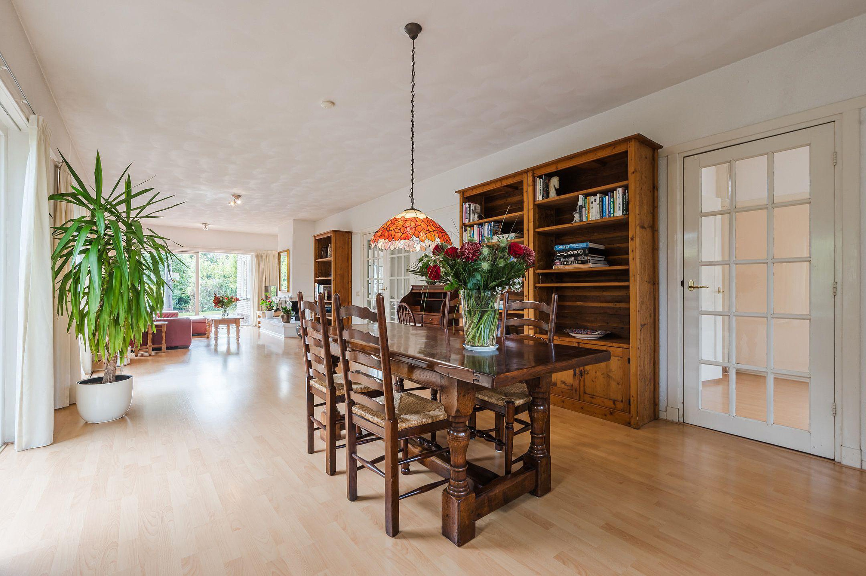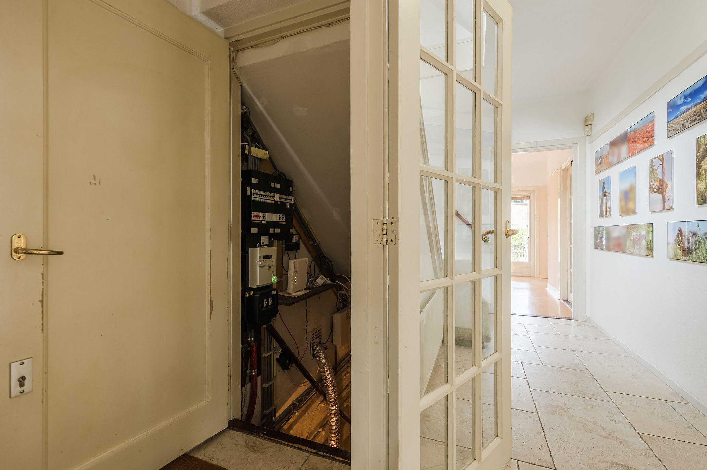 Entree, vestibule, trap naar grote droge provisie-wijnkelder (4x2.6m + 4.55x2.6m) met aansluiting t.b.v. diverse apparatuur; wasmachine / droger en close-in boiler. Ruime hal, toilet met fonteintje, garderobe, zeer fraai trappenhuis, deur naar grote (4m) brede woonkamer met deur naar (aansluitend) een grote werk-kantoor-(slaap)-zijkamer (ca.4x3.5m) met openslaande deuren naar / toegang tot de voortuin. Woonkamer (13m lang) met heel veel zijramen, open haard (aangesloten op CV systeem) en een schuifpui naar de prachtige zonnige achtertuin. De direct naast de woonkamer gelegen grote zijkamer kan eventueel ook bij de woonkamer betrokken worden. De moderne, ruime, lichte (uitgebouwde) eet-woonkeuken (ca.7x3m) met vloerverwarming heeft via 3 ramen en een achterdeur direct zicht op de achtertuin en beschikt over inbouw apparatuur.