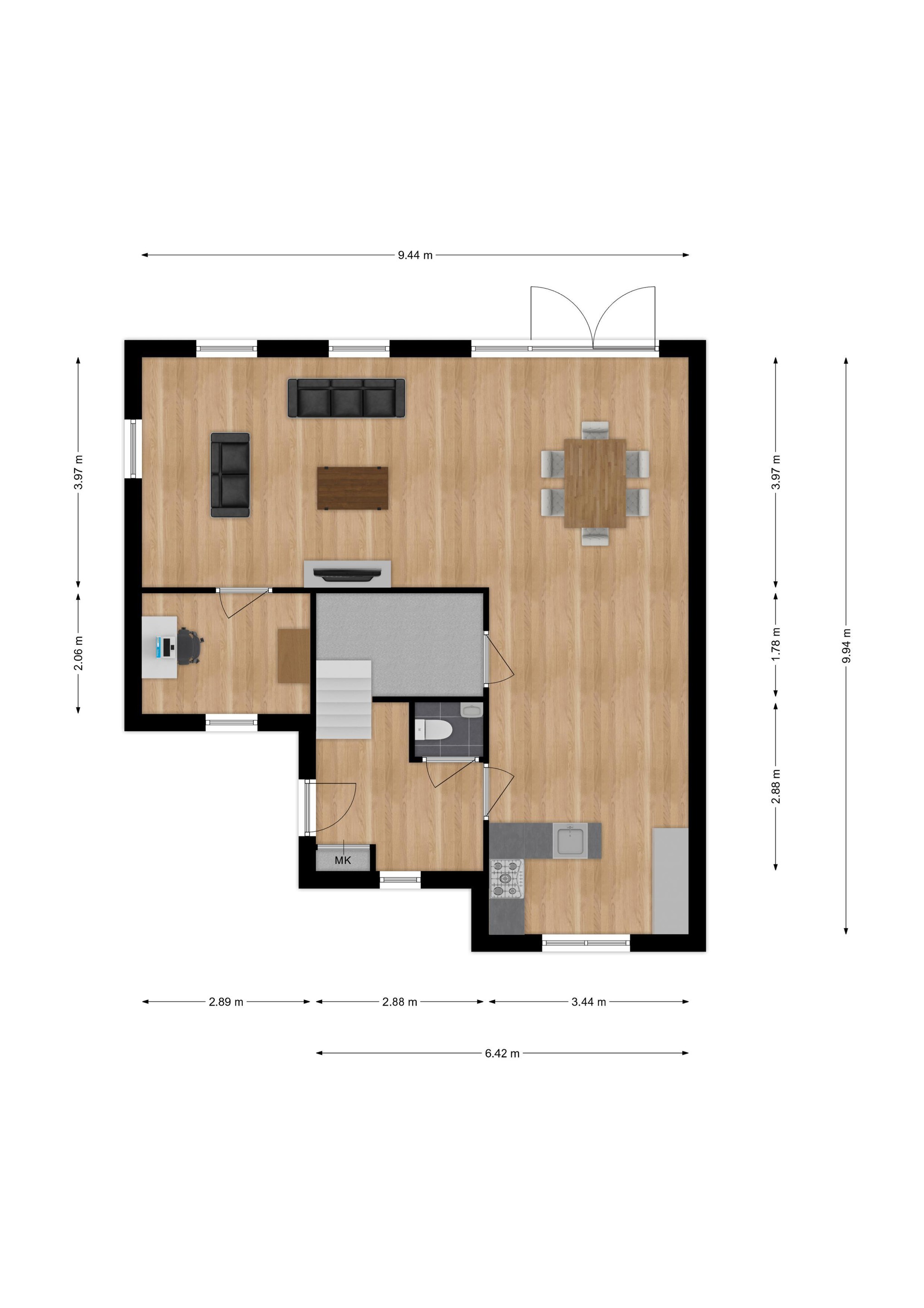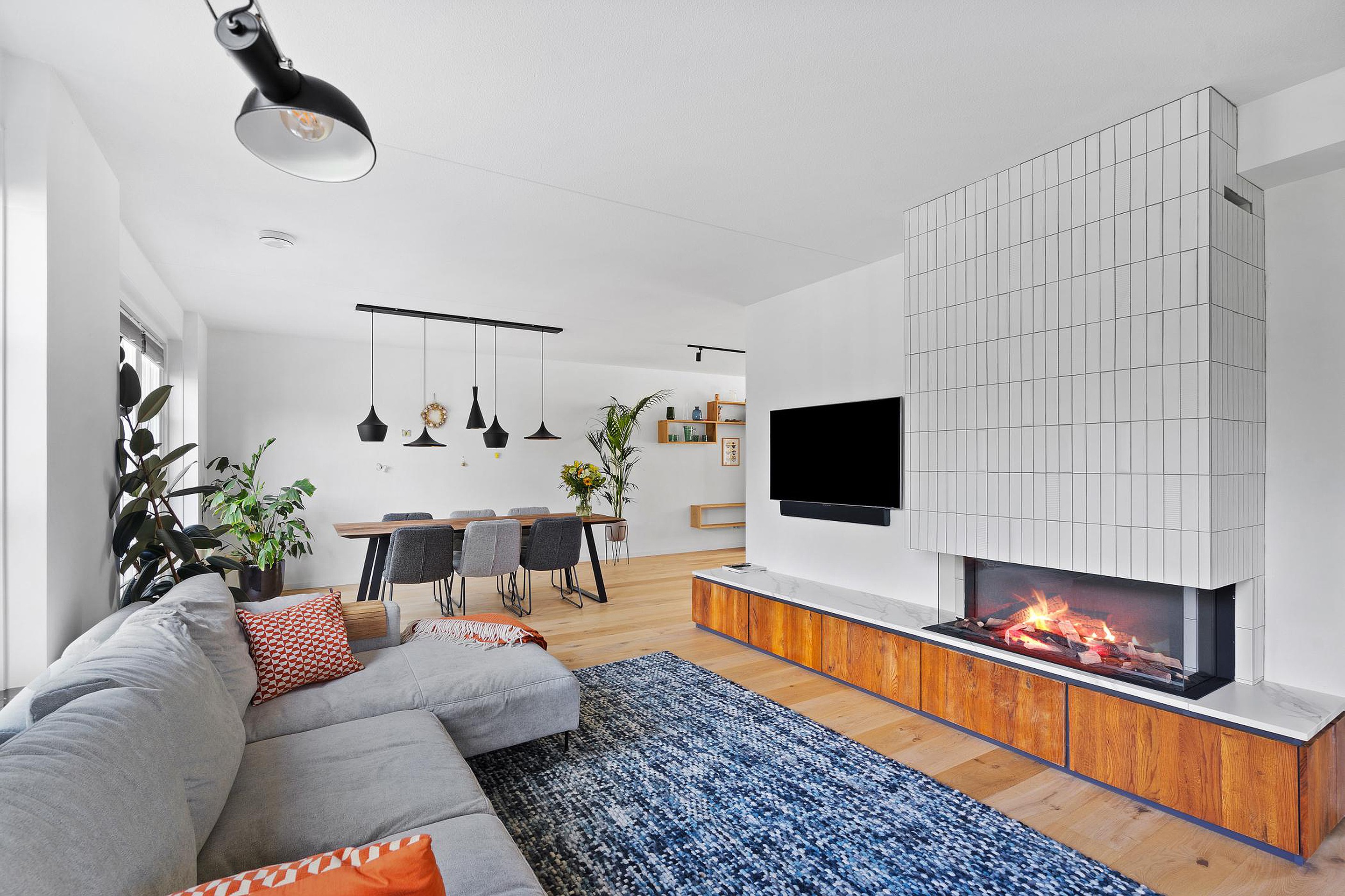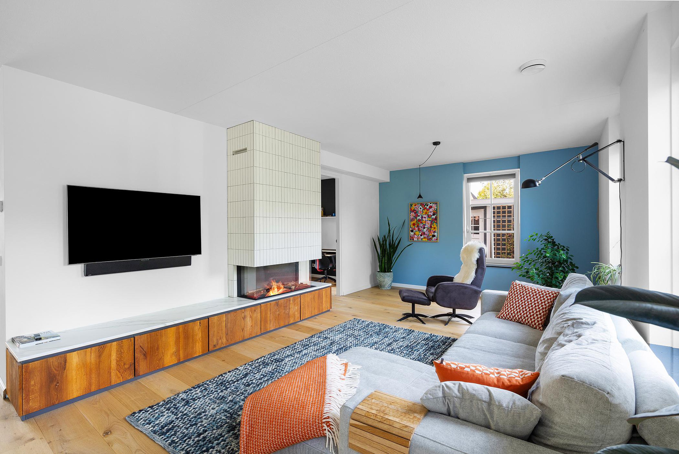 De royale L-vormige woonkamer beschikt over een massief houten vloer, een moderne haardpartij met inbouw sfeerhaard (gas) en biedt toegang tot de open keuken (2022), die van alle gemakken is voorzien. Verder zijn een royale provisieruimte (onder de trappartij), een study/werkkamer met zicht op de voortuin en de enorme achtertuin bereikbaar.