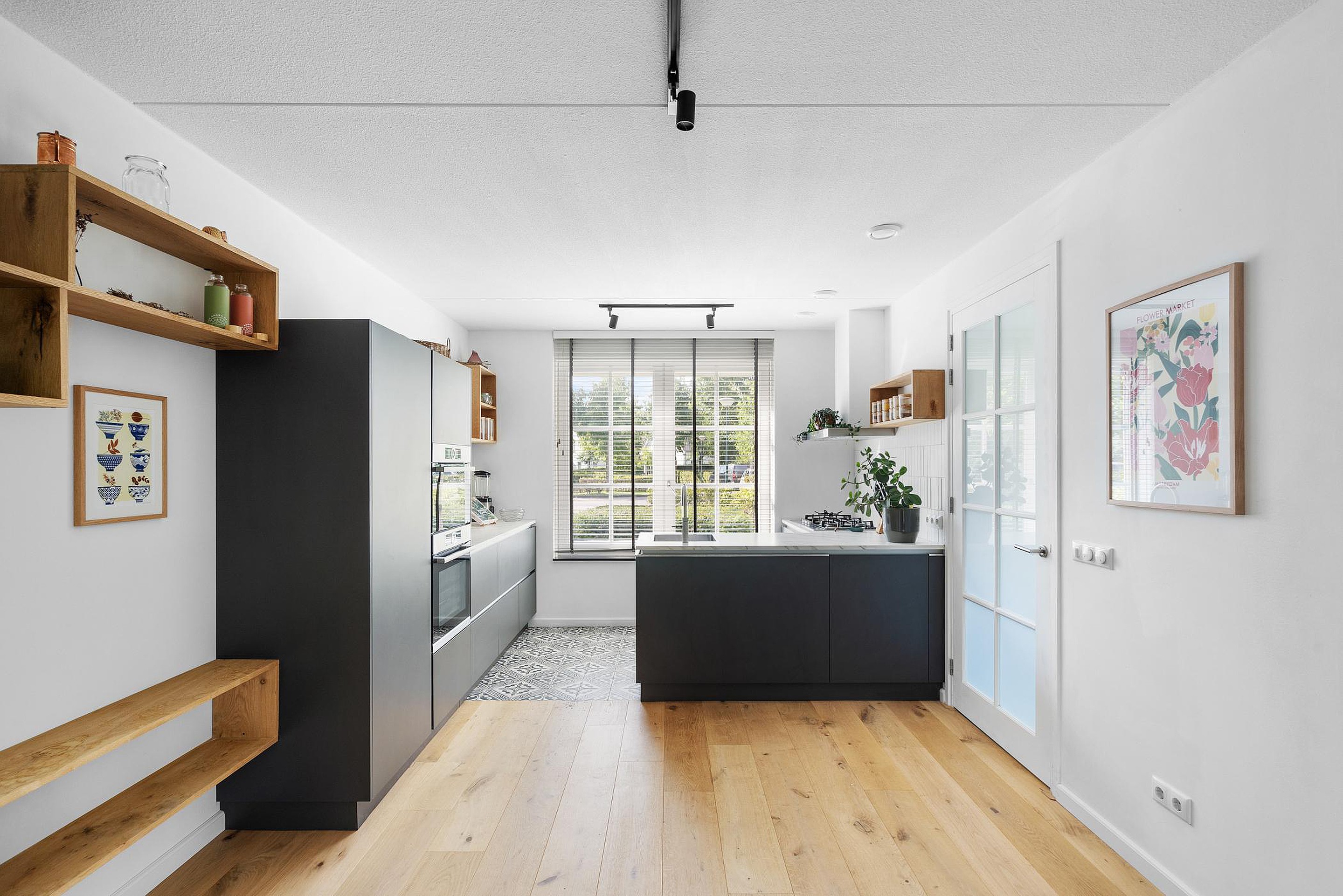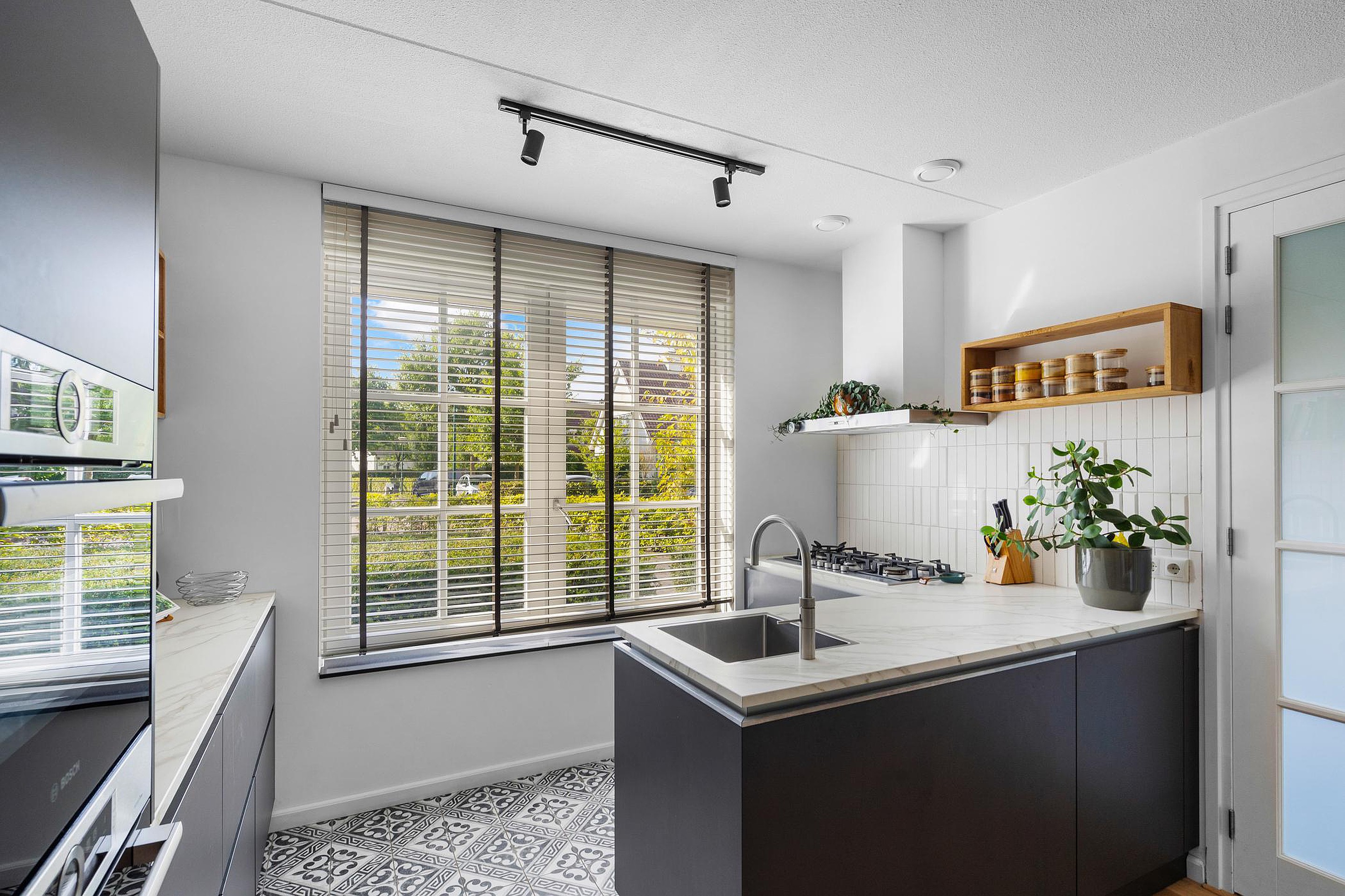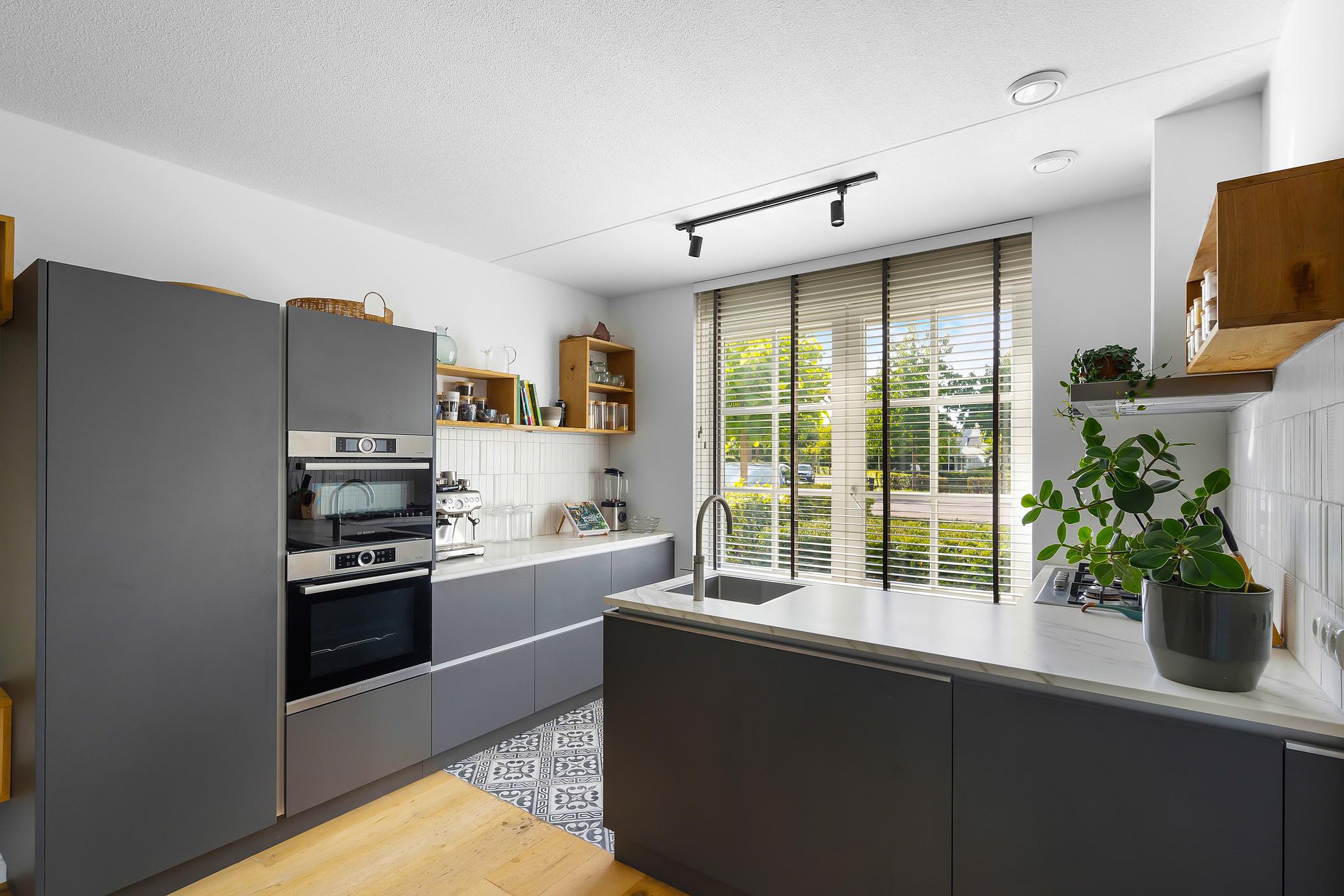 De keuken bestaat uit een dubbele opstelling: een L-vormige opstelling met een werkblad, kasten, laden, koken en spoelen (met Quooker) en een wand opgesteld gedeelte bestaande uit kasten, laden, werkblad en alle denkbare inbouwapparatuur.