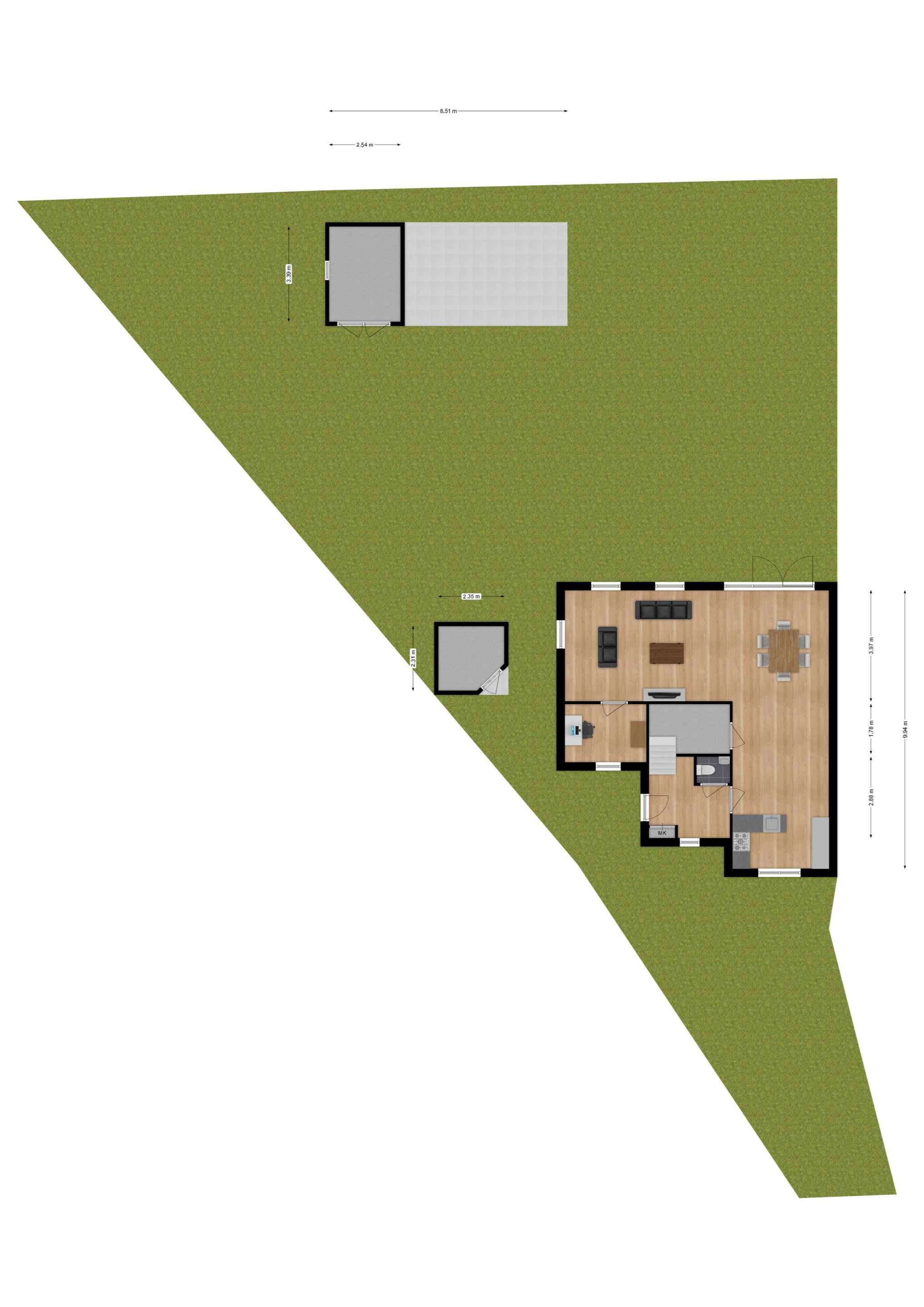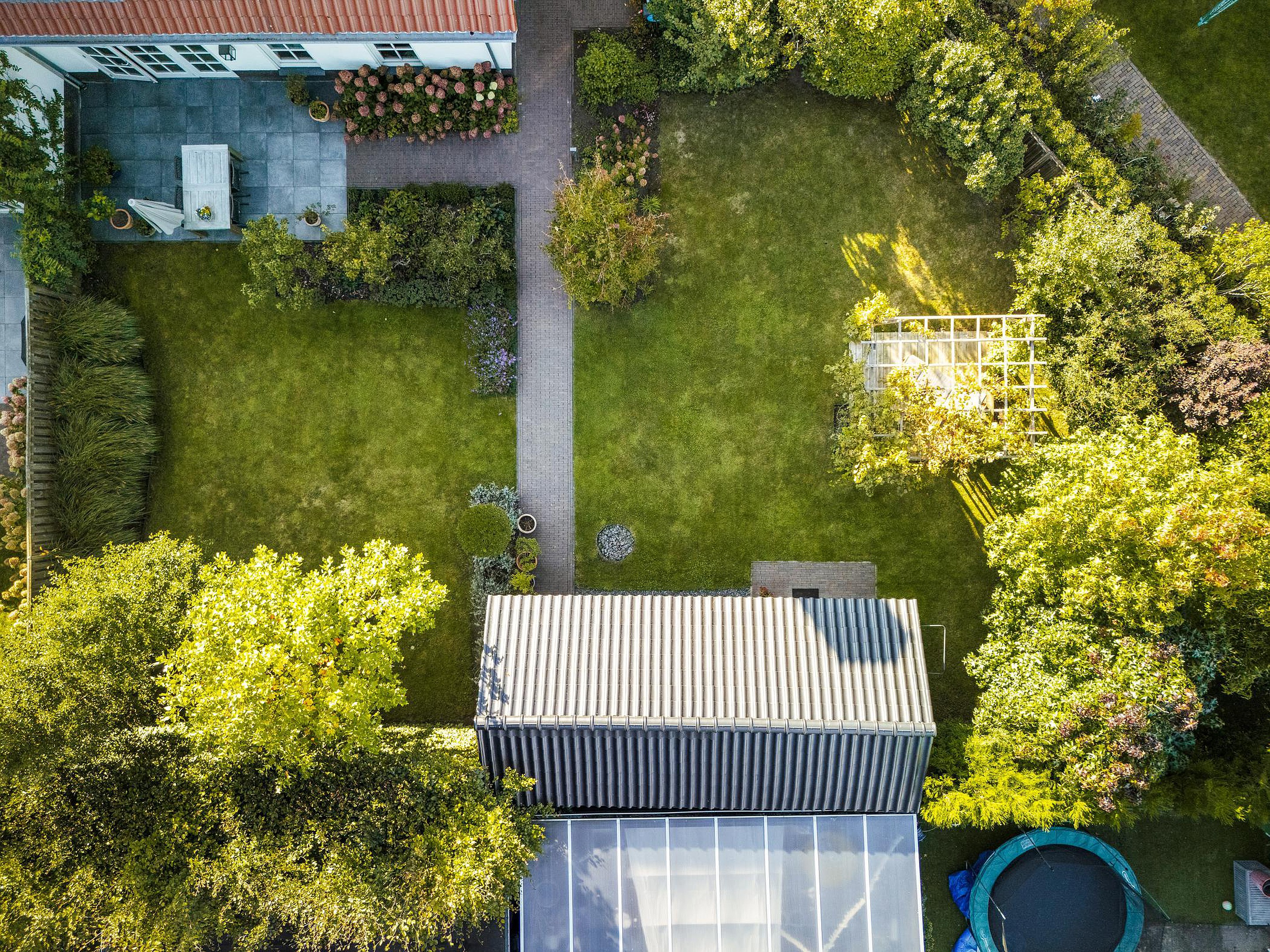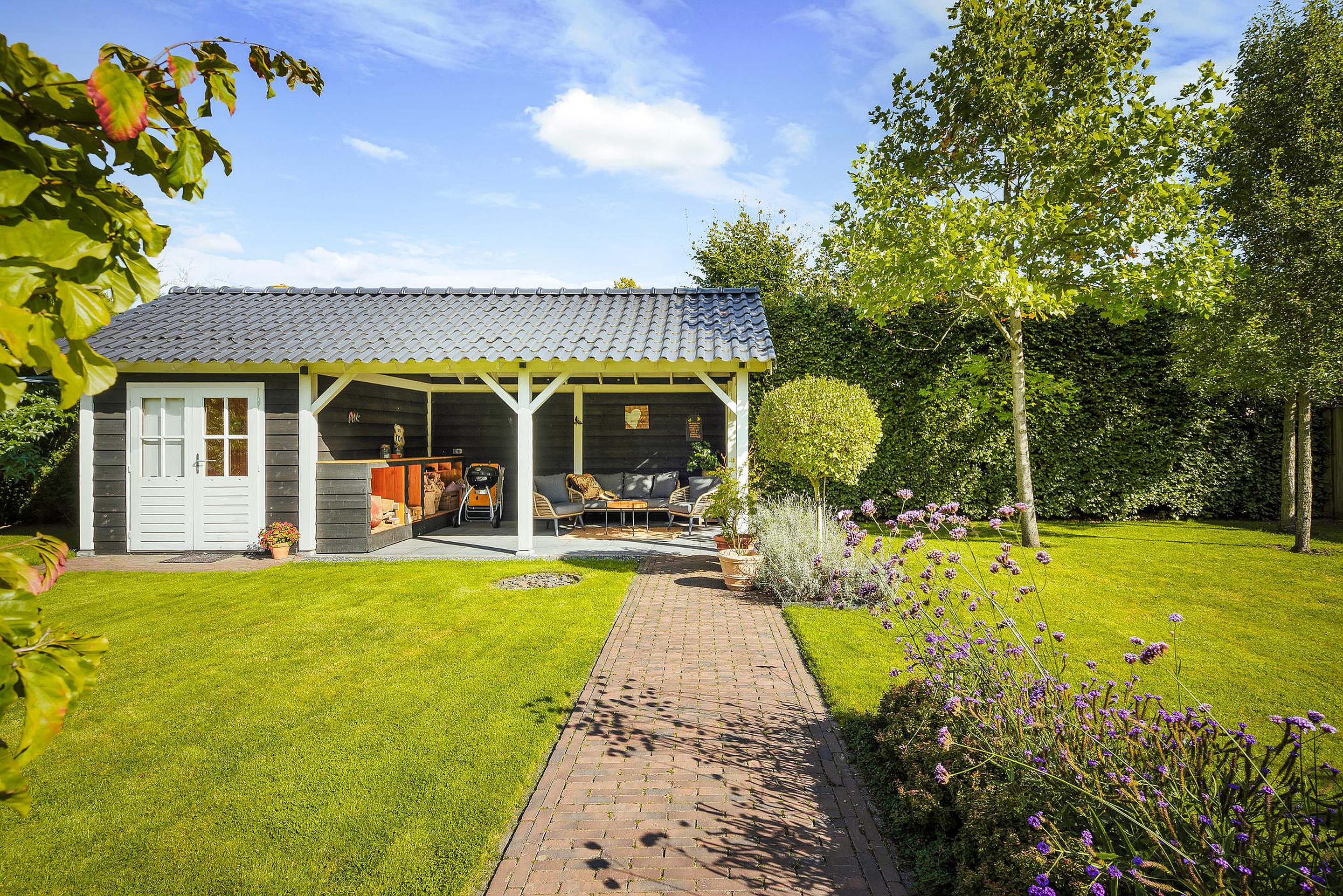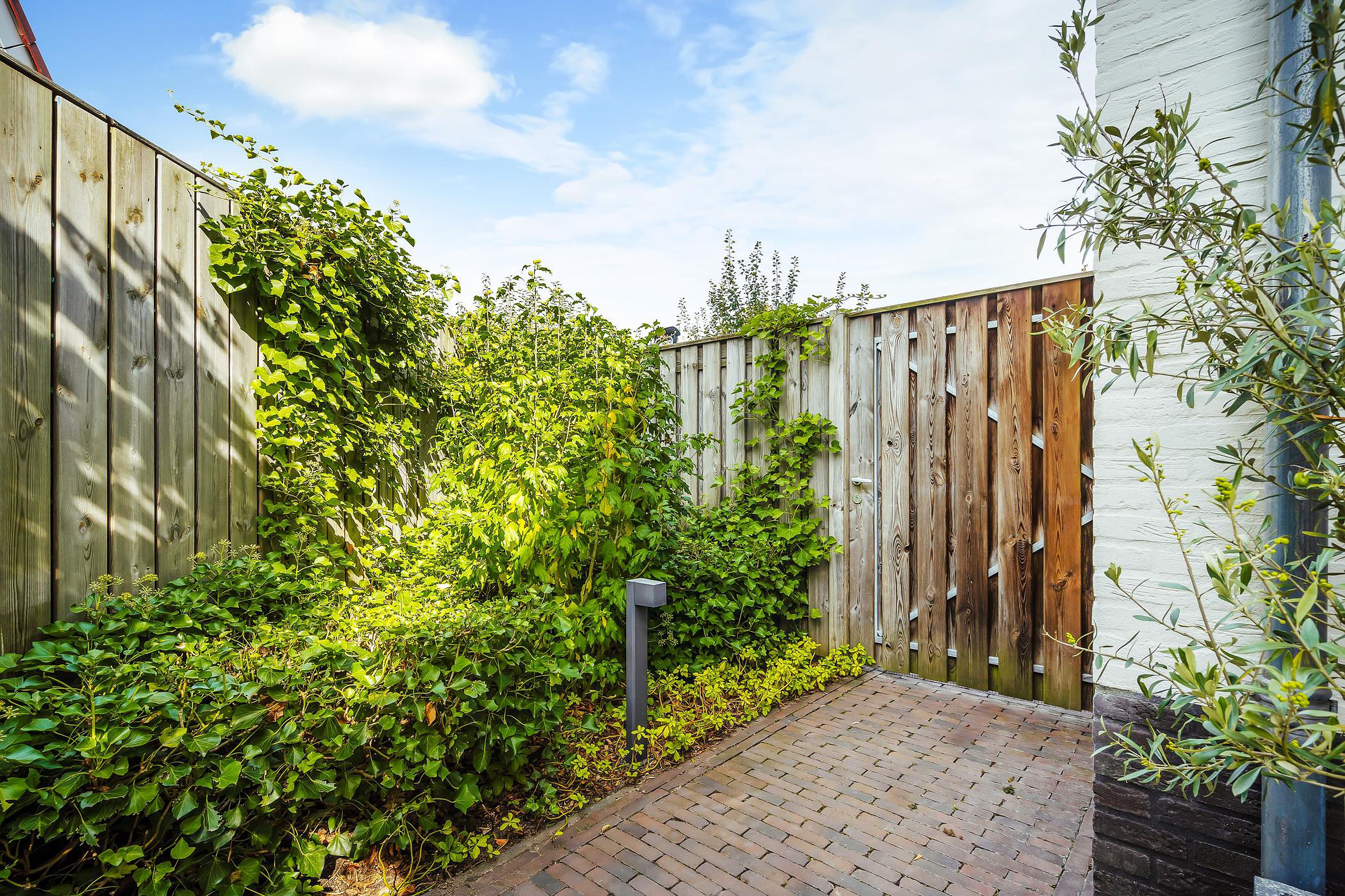 De tuin is geheel omheind met een poort naar de voorzijde van de woning. In de tuin is ook een houten tuinhuis geplaatst met voldoende ruimte voor de stalling van fietsen. In dit tuinhuis bevindt zich ook de unit van de beregeningsinstallatie